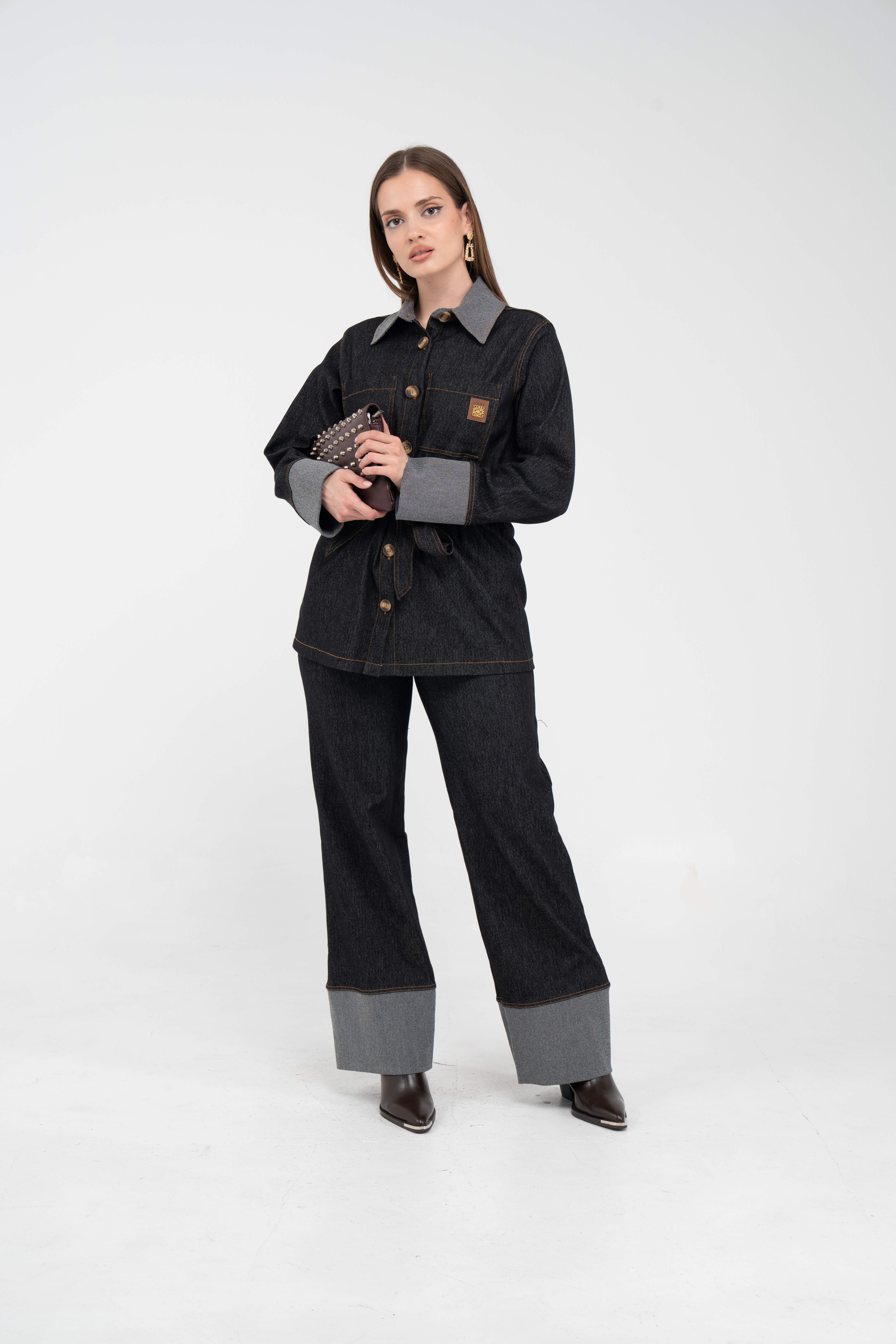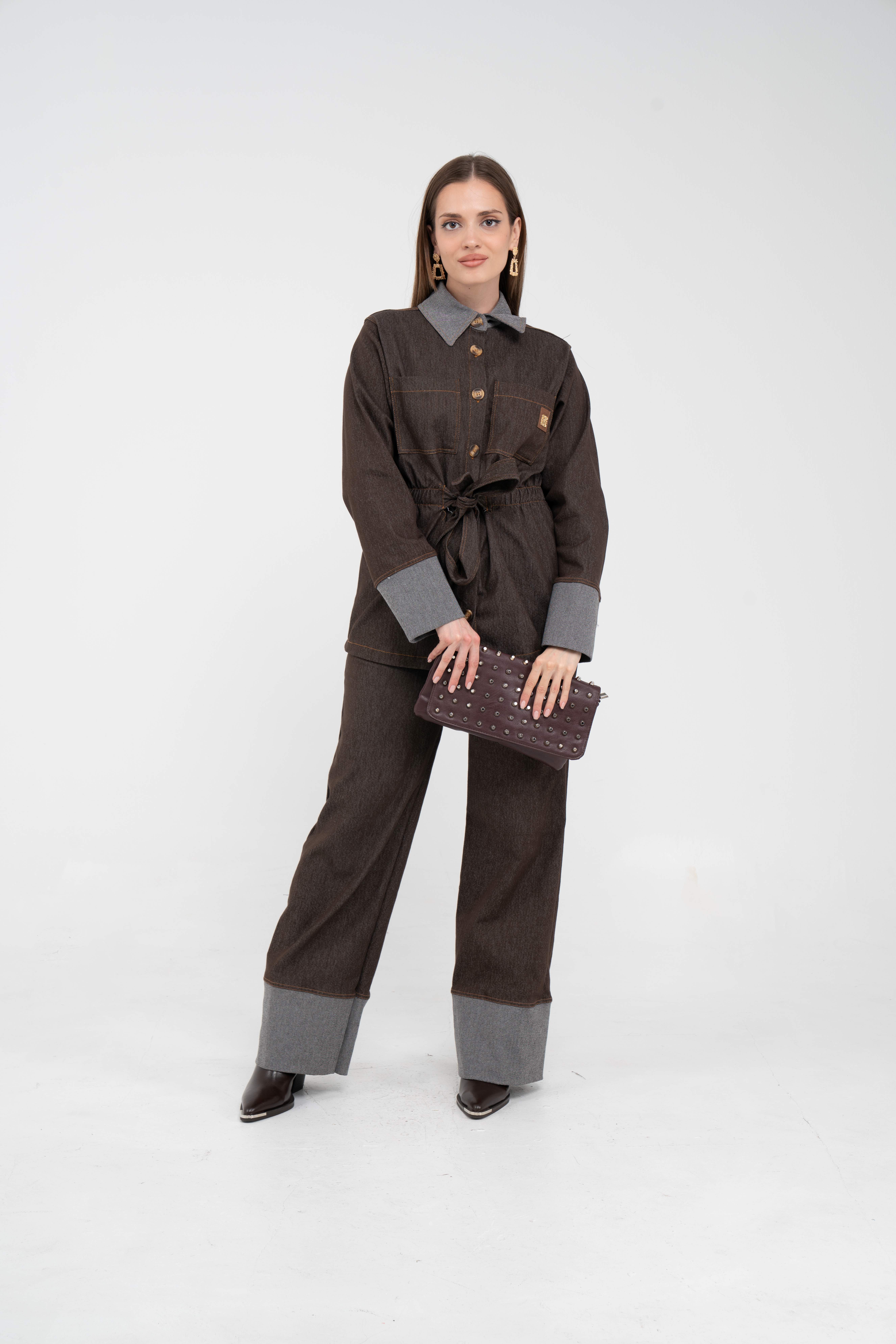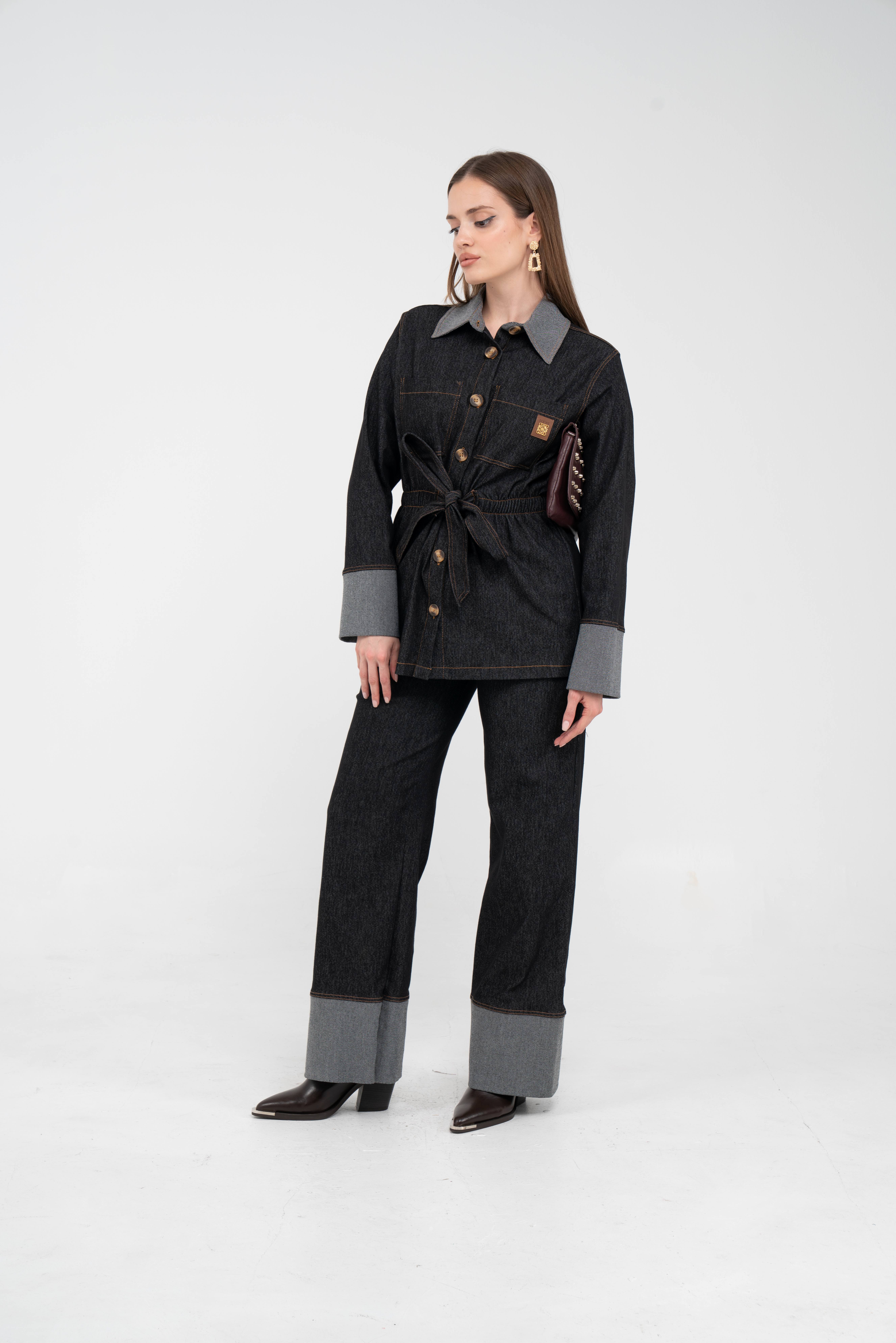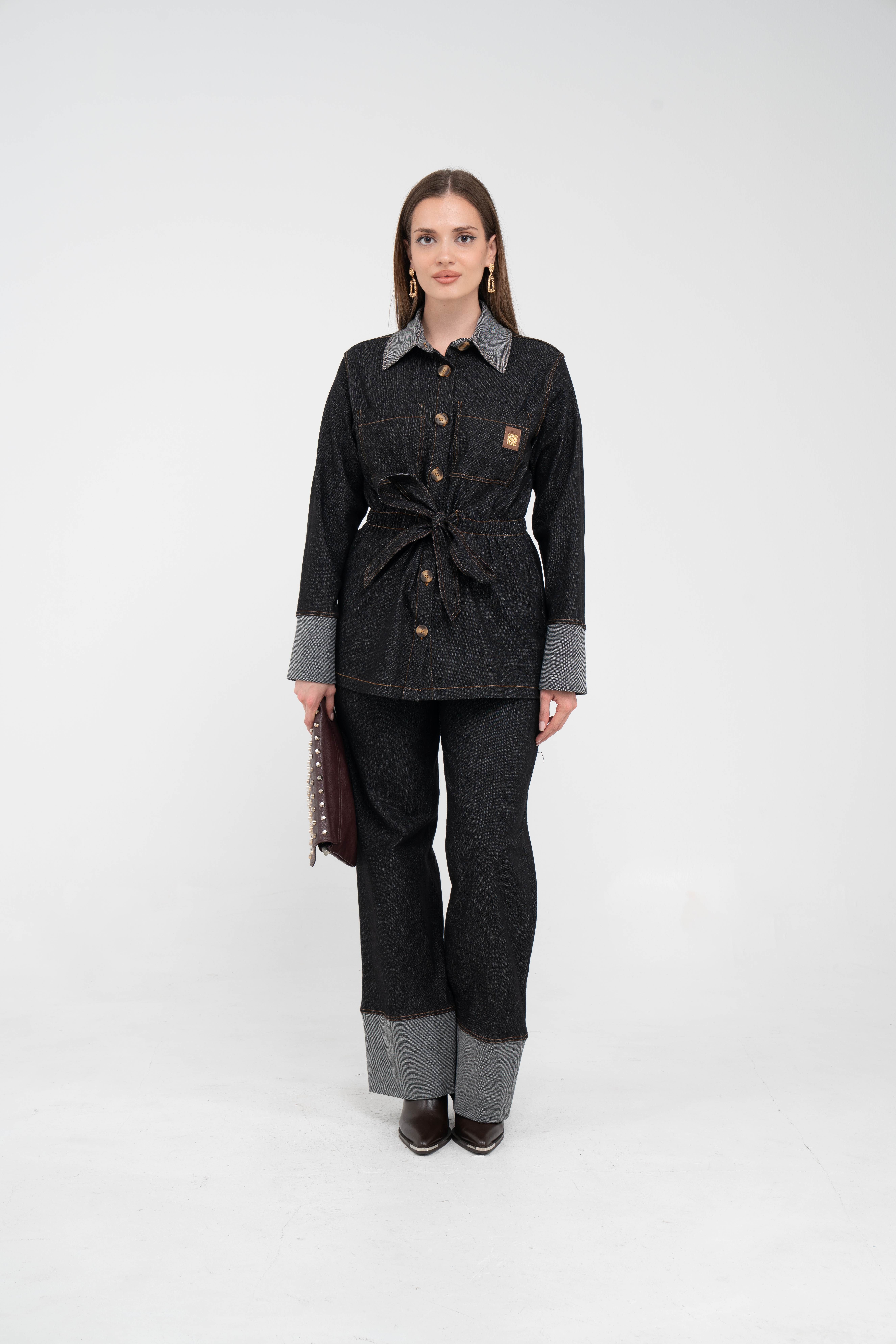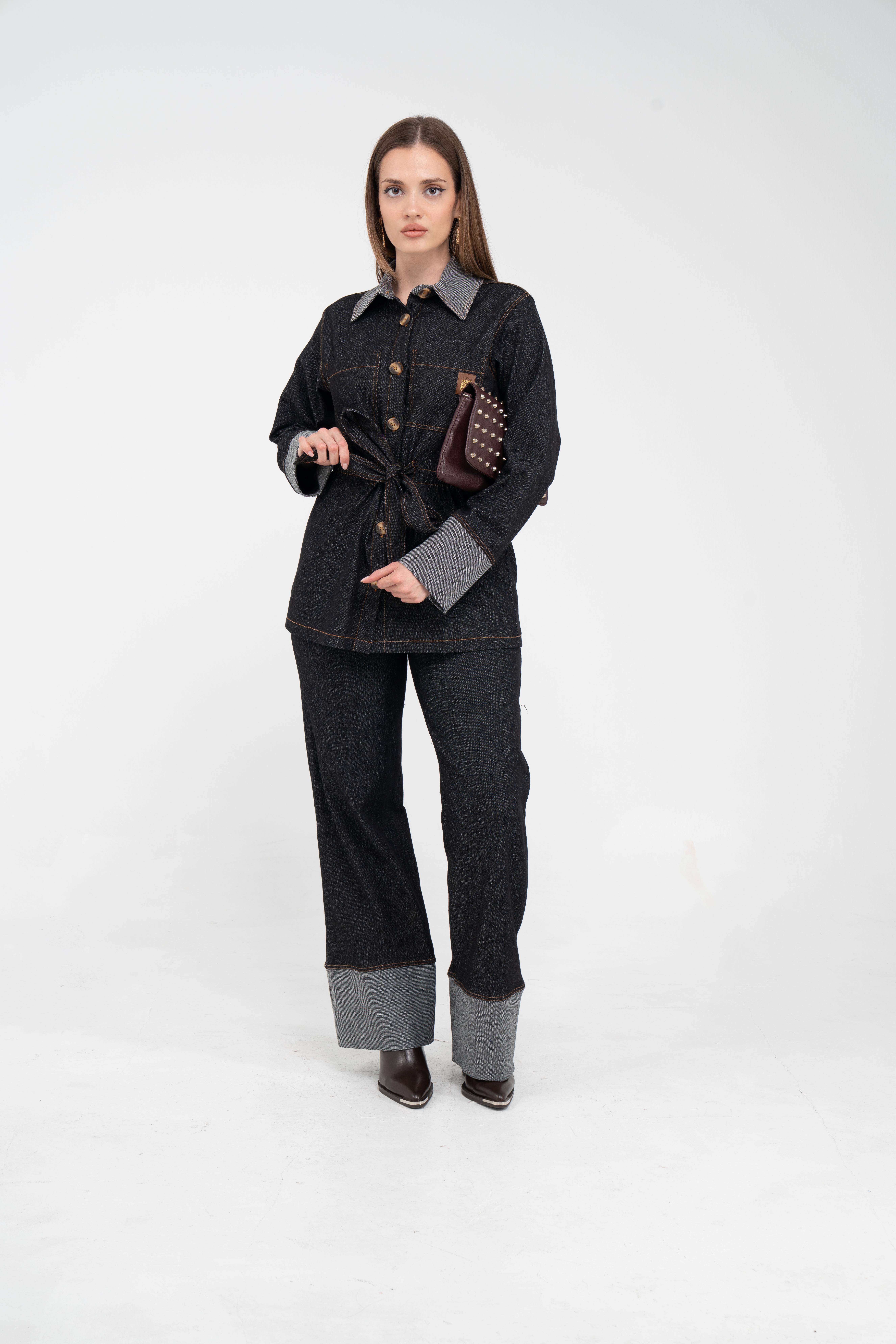Gelince Haber VerModern şehir stilini yansıtan bu çift kumaş detaylı takım, hem şık hem de güçlü bir görünüm sunar. Üst kısmı gömlek formunda olup, manşet ve yaka kısmındaki kontrast kumaş detayları modele karakter katar. Bel kısmındaki bağlama kuşağı formu vurgulayarak daha derli toplu bir siluet oluşturur.