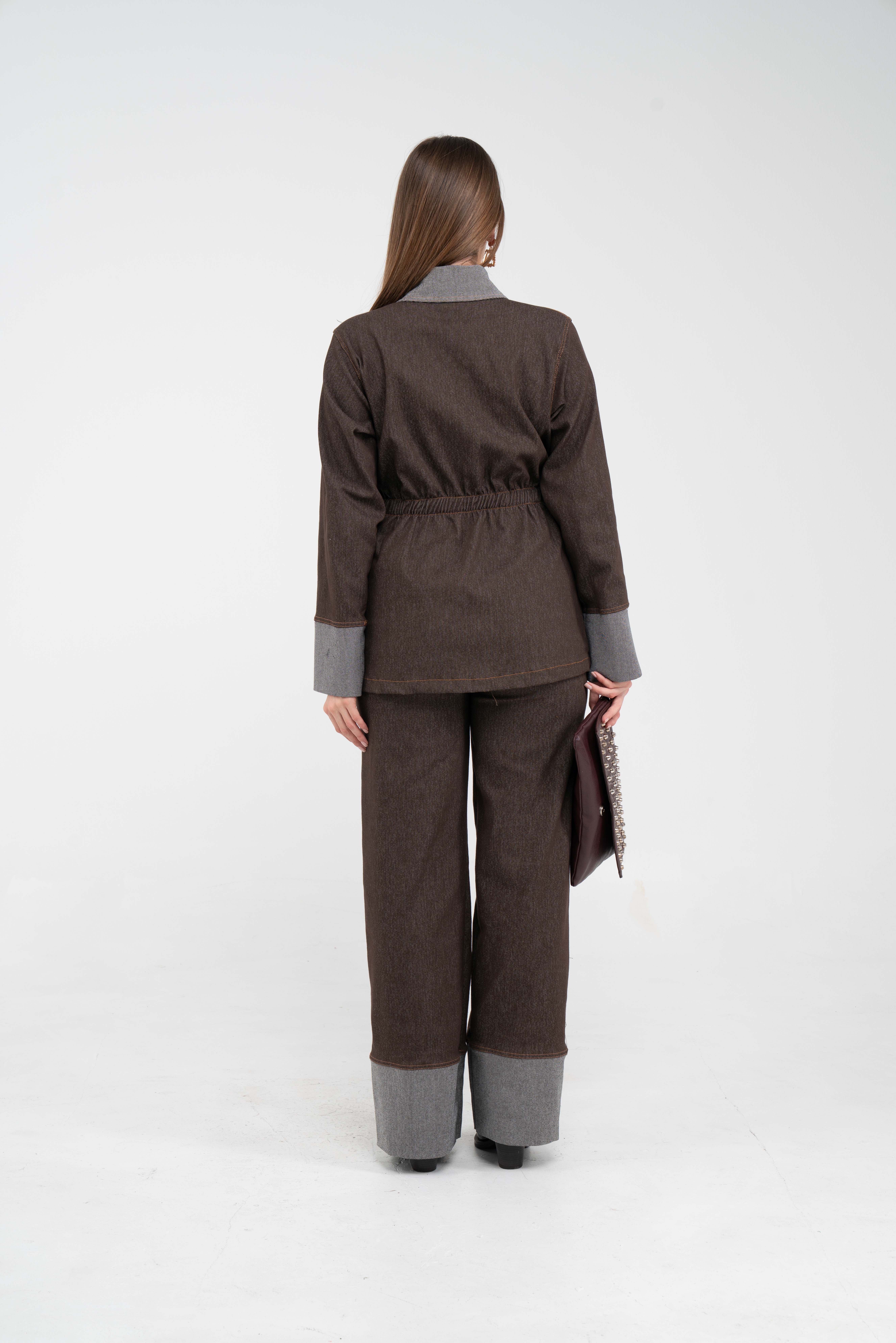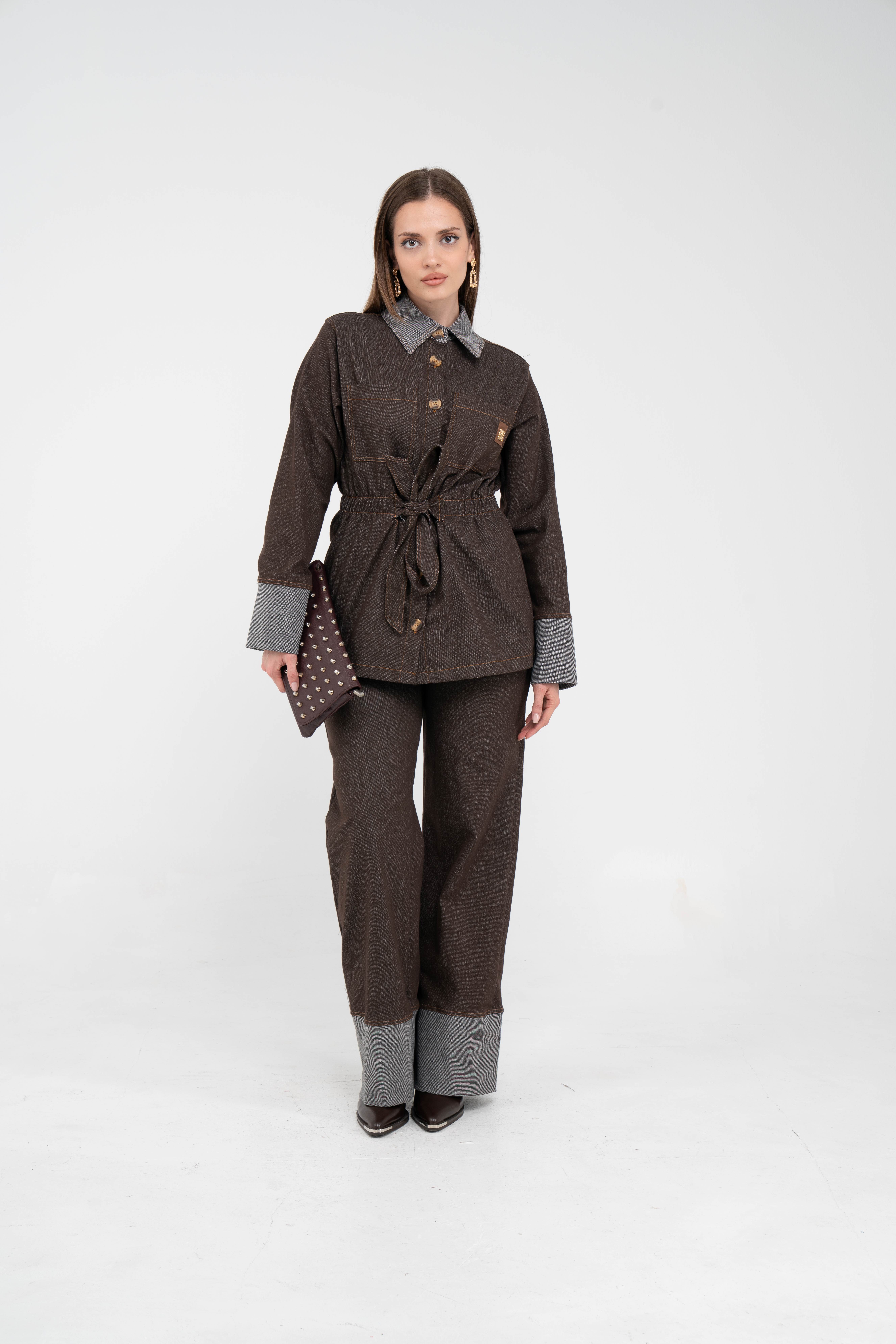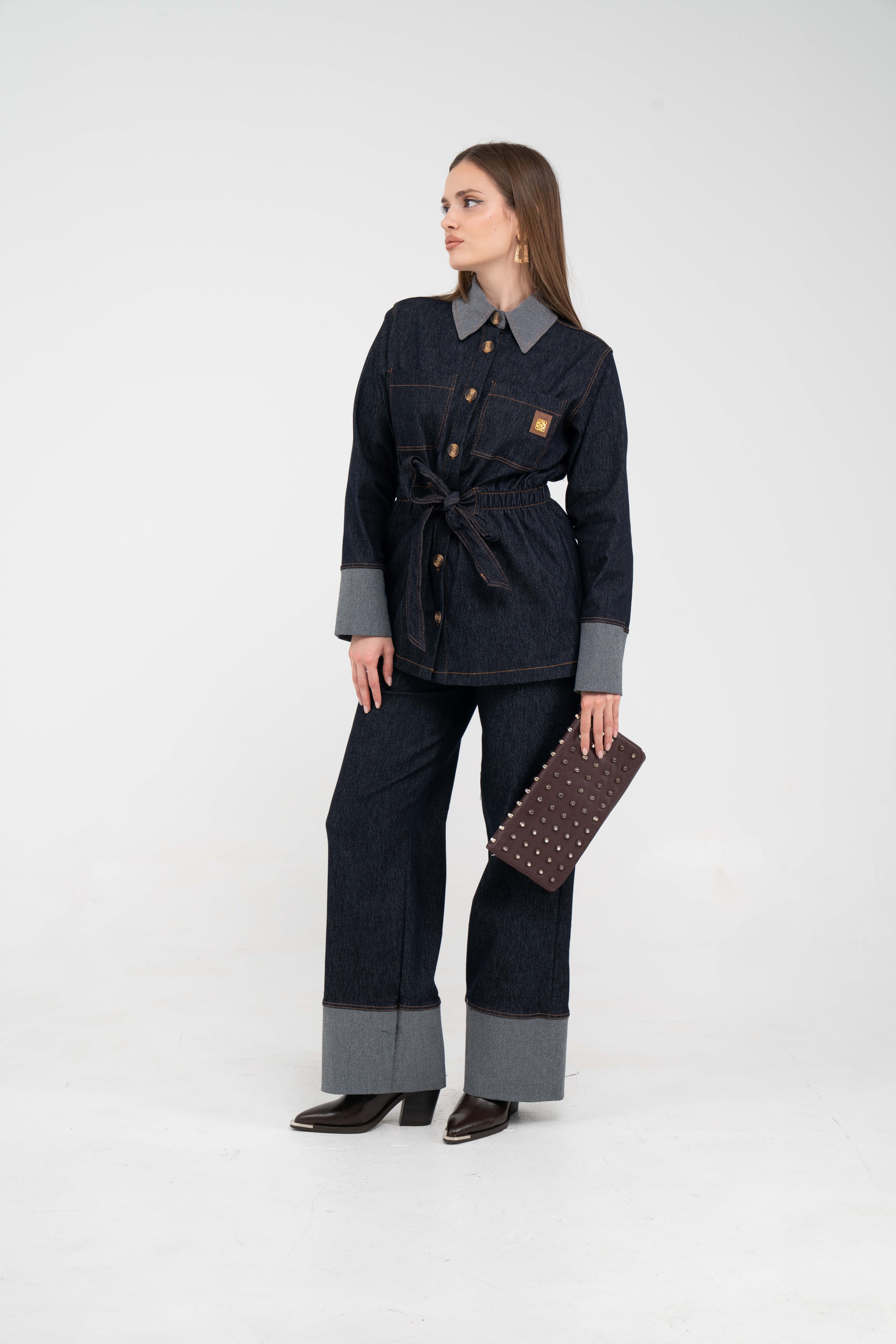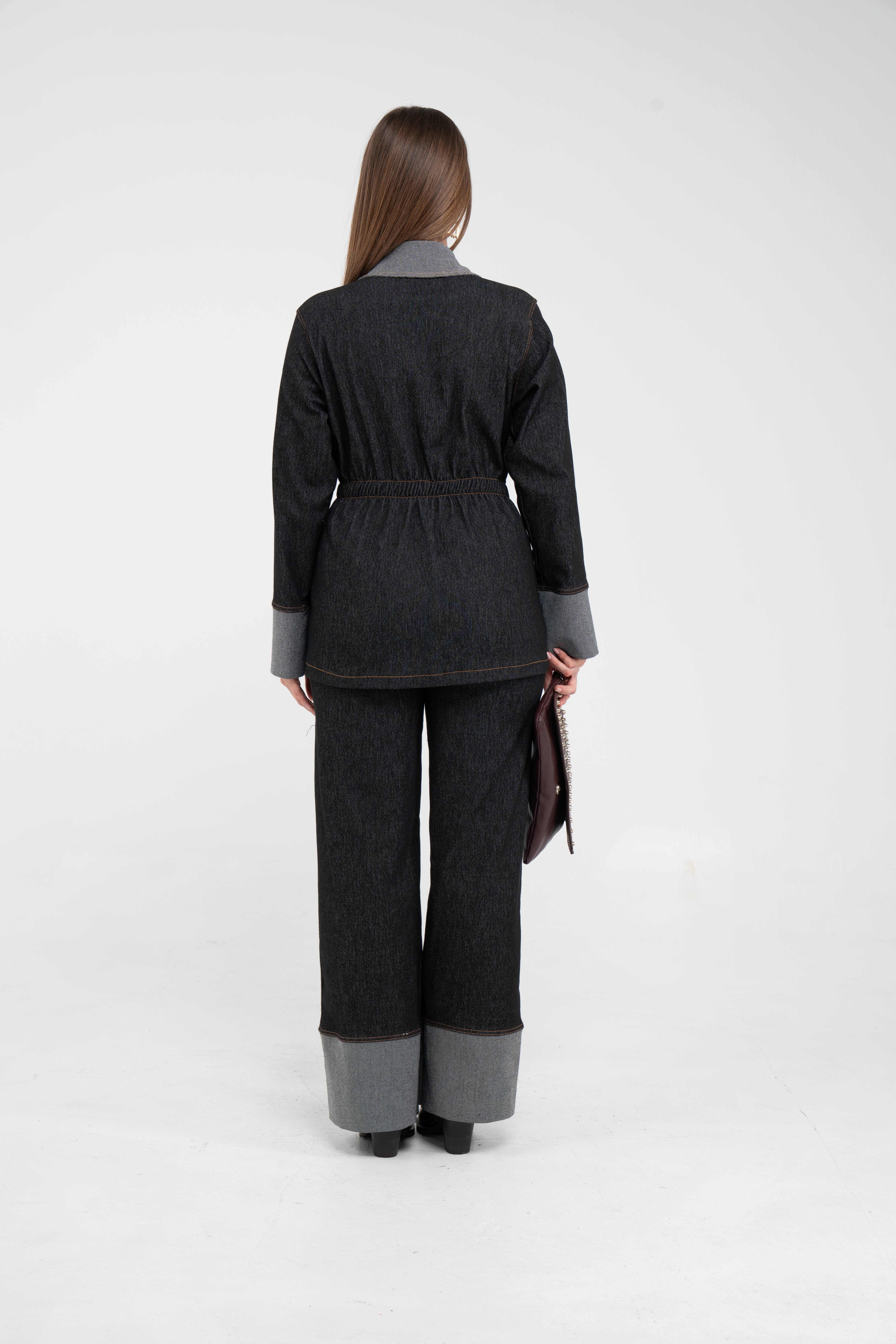 Gelince Haber VerModern şehir stilini yansıtan bu çift kumaş detaylı takım, hem şık hem de güçlü bir görünüm sunar. Üst kısmı gömlek formunda olup, manşet ve yaka kısmındaki kontrast kumaş detayları modele karakter katar. Bel kısmındaki bağlama kuşağı formu vurgulayarak daha derli toplu bir siluet oluşturur.