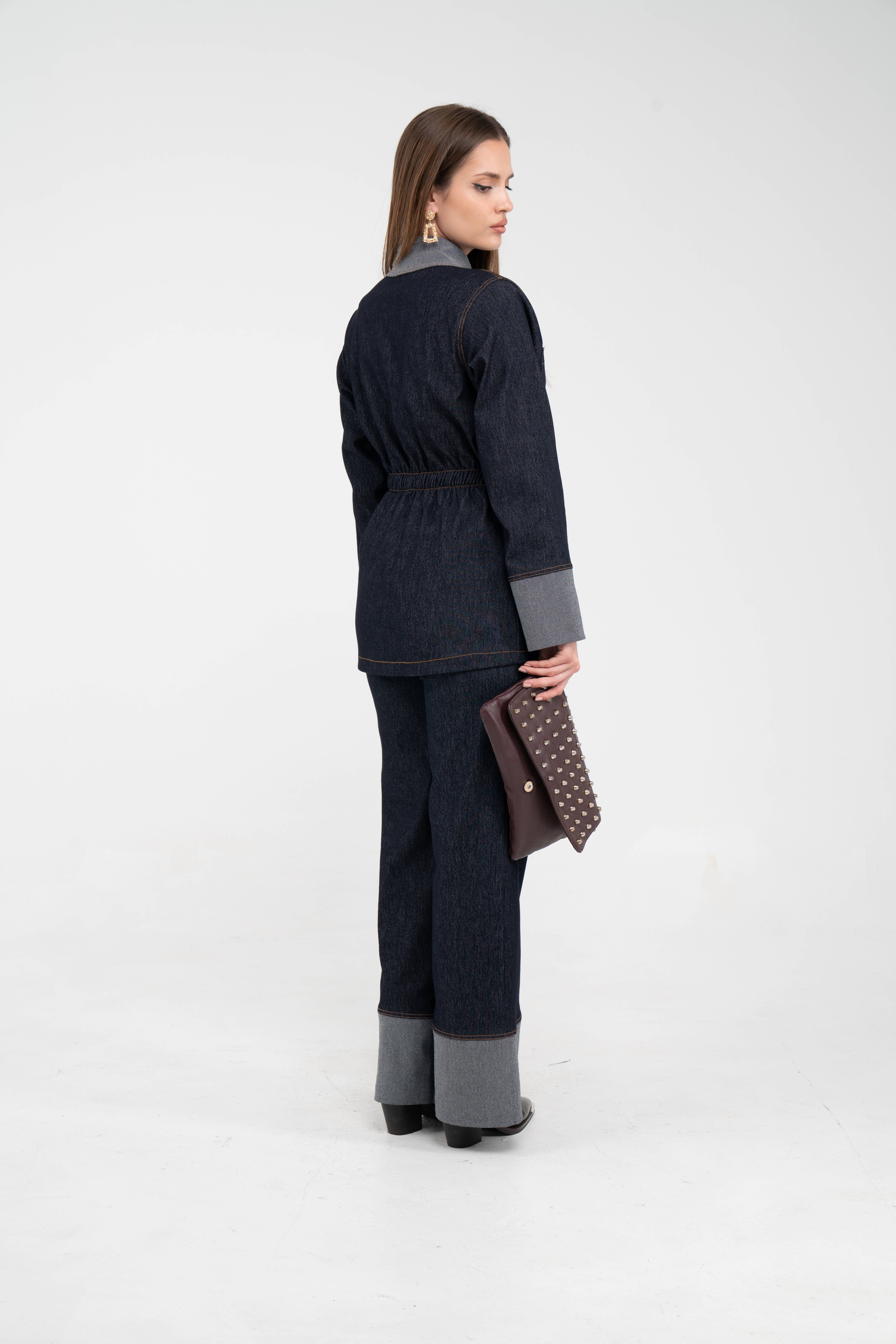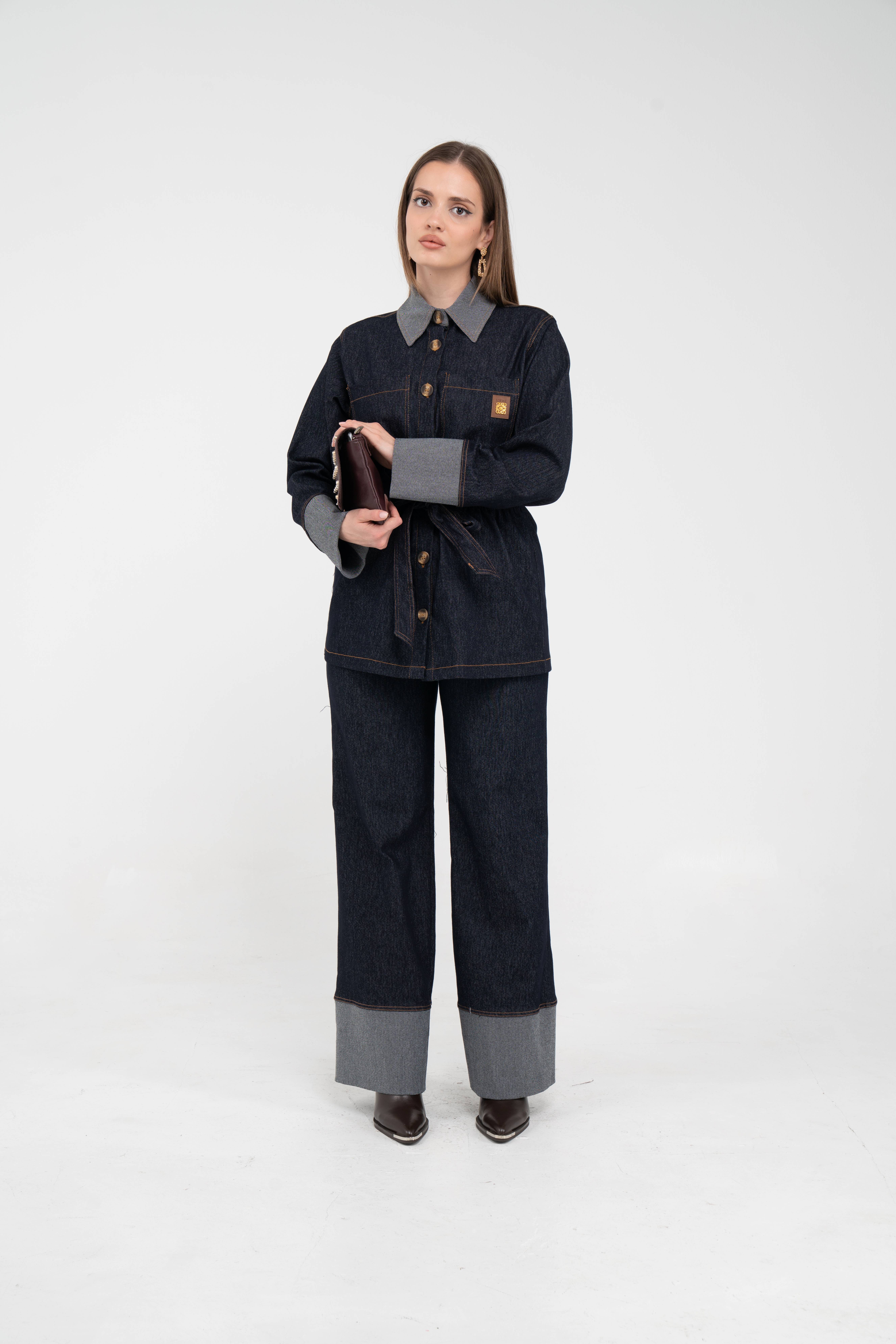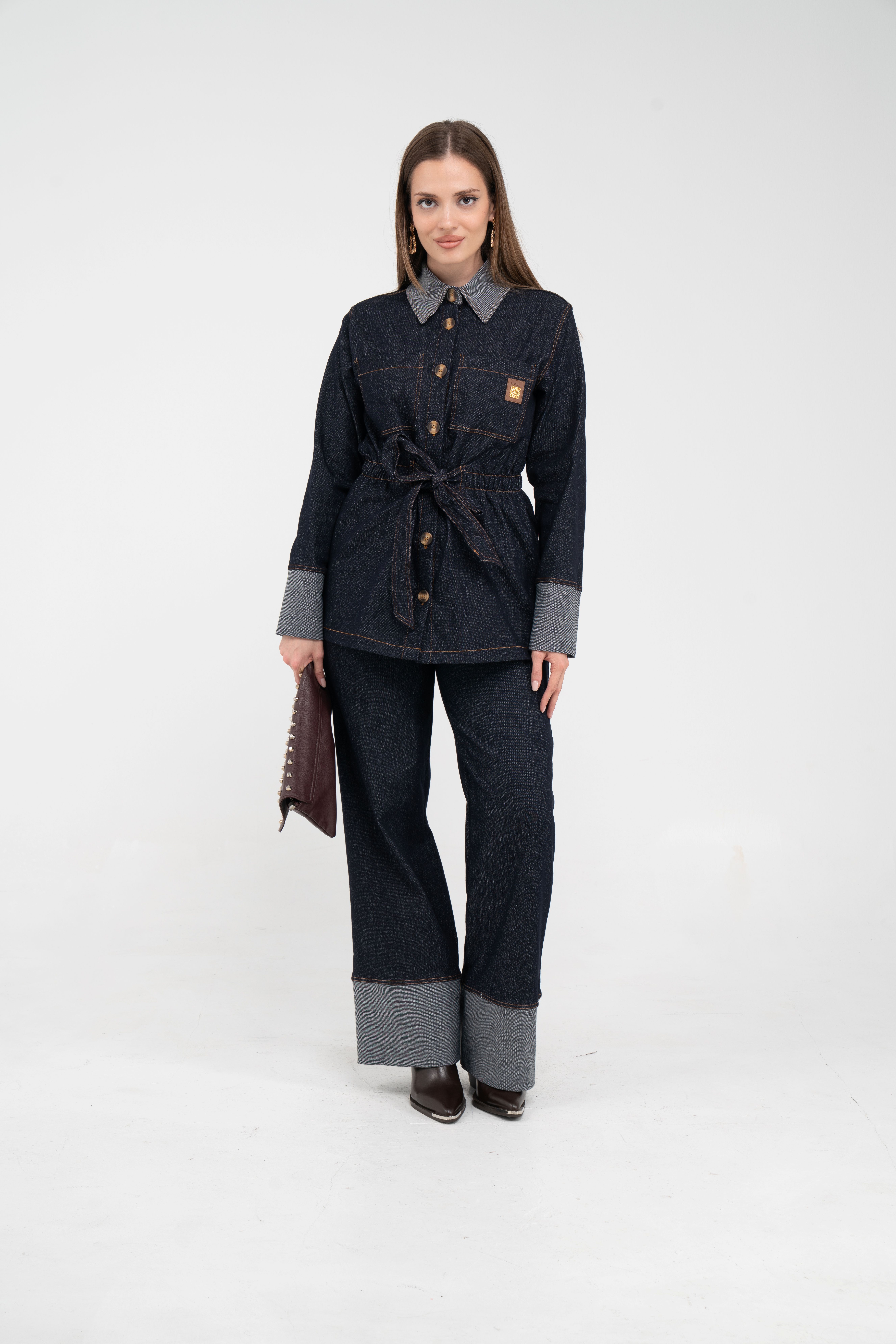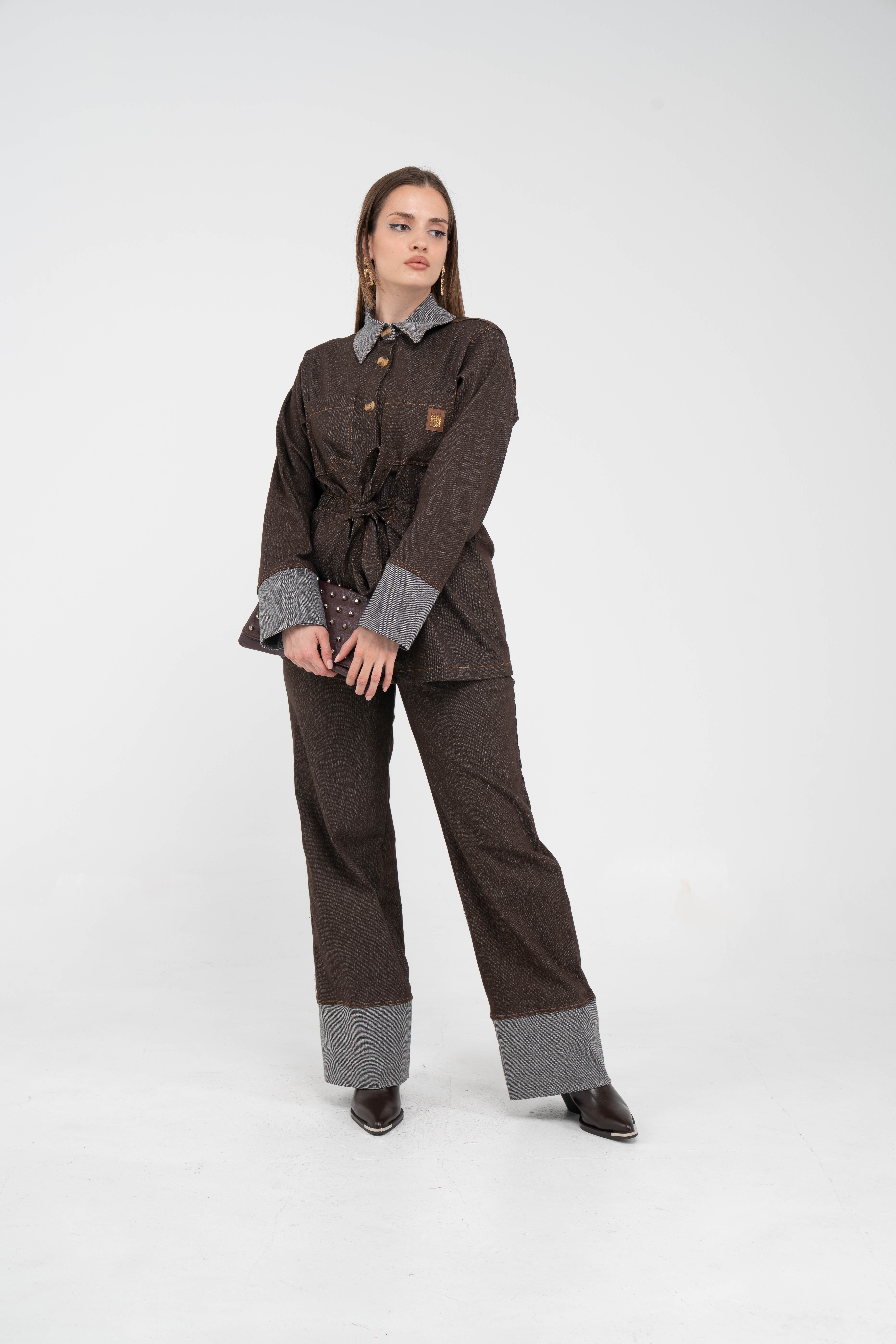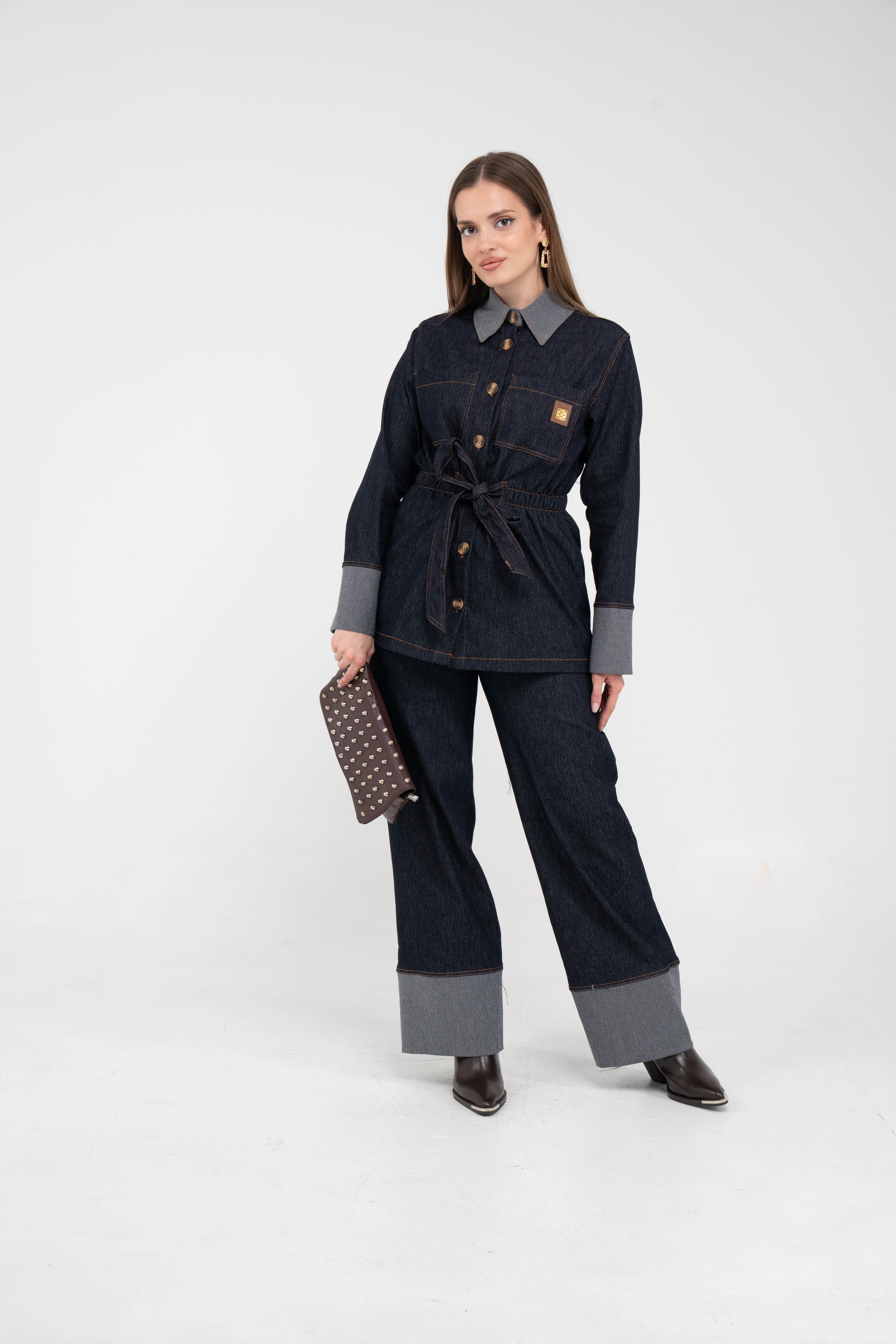 Gelince Haber VerModern şehir stilini yansıtan bu çift kumaş detaylı takım, hem şık hem de güçlü bir görünüm sunar. Üst kısmı gömlek formunda olup, manşet ve yaka kısmındaki kontrast kumaş detayları modele karakter katar. Bel kısmındaki bağlama kuşağı formu vurgulayarak daha derli toplu bir siluet oluşturur.