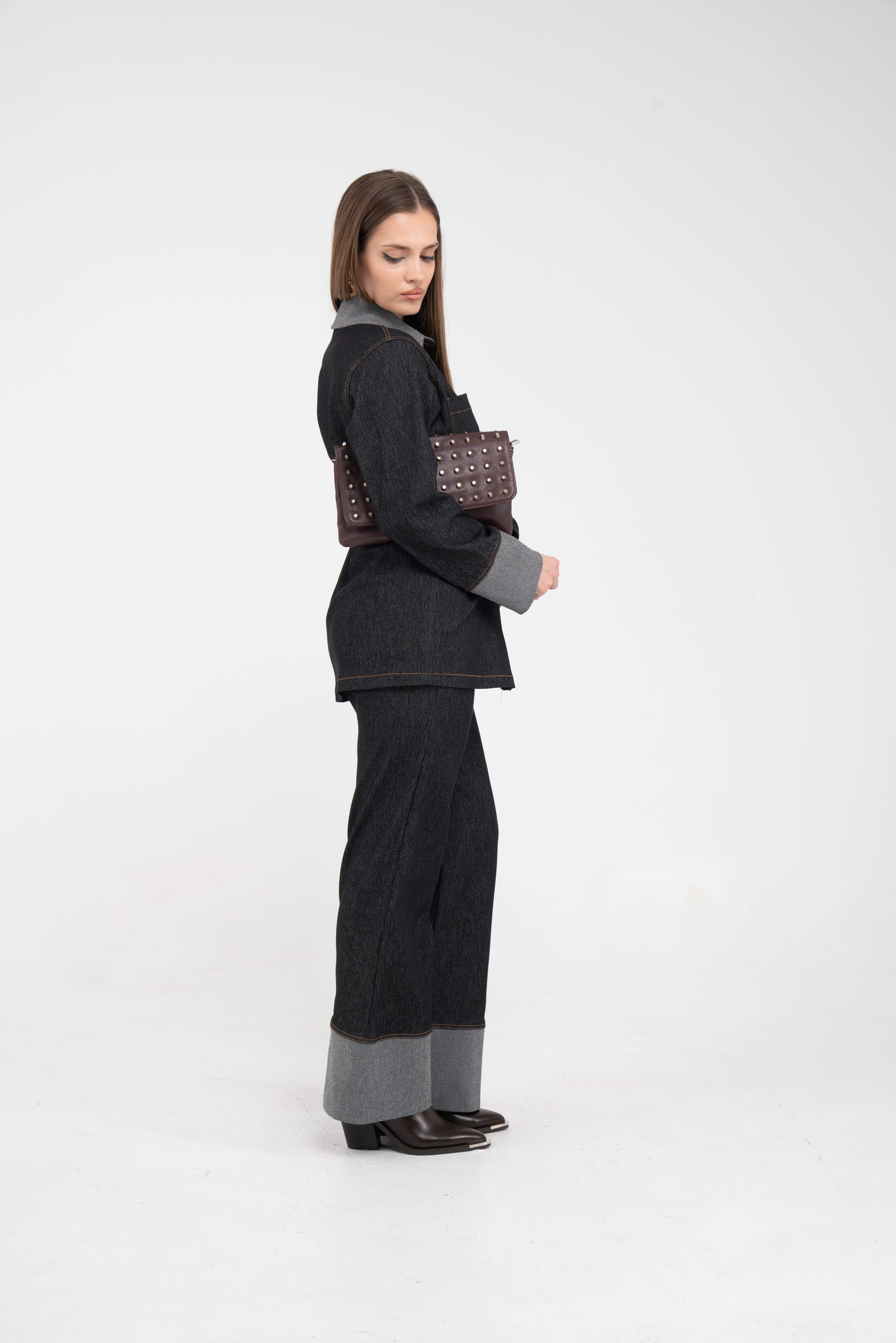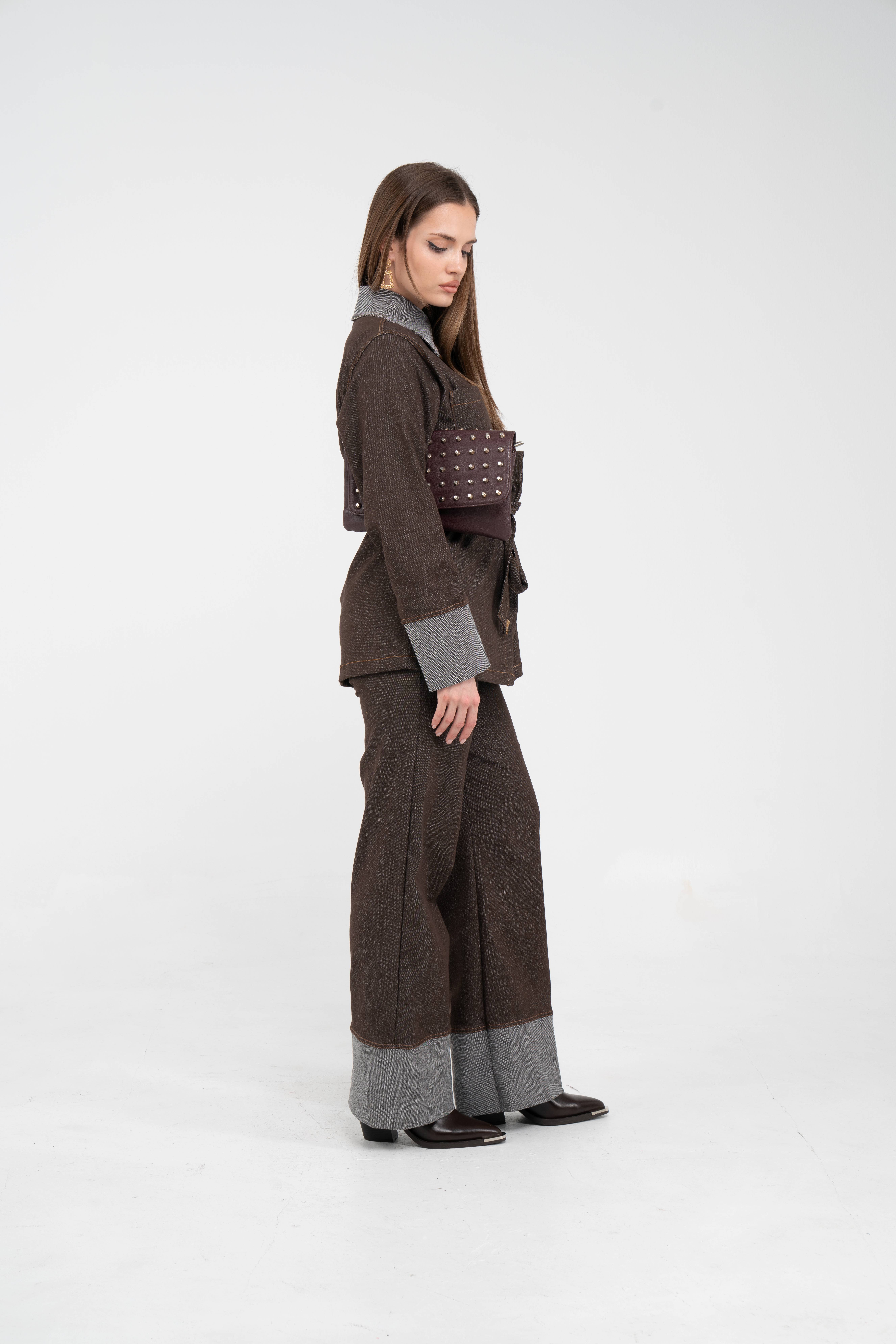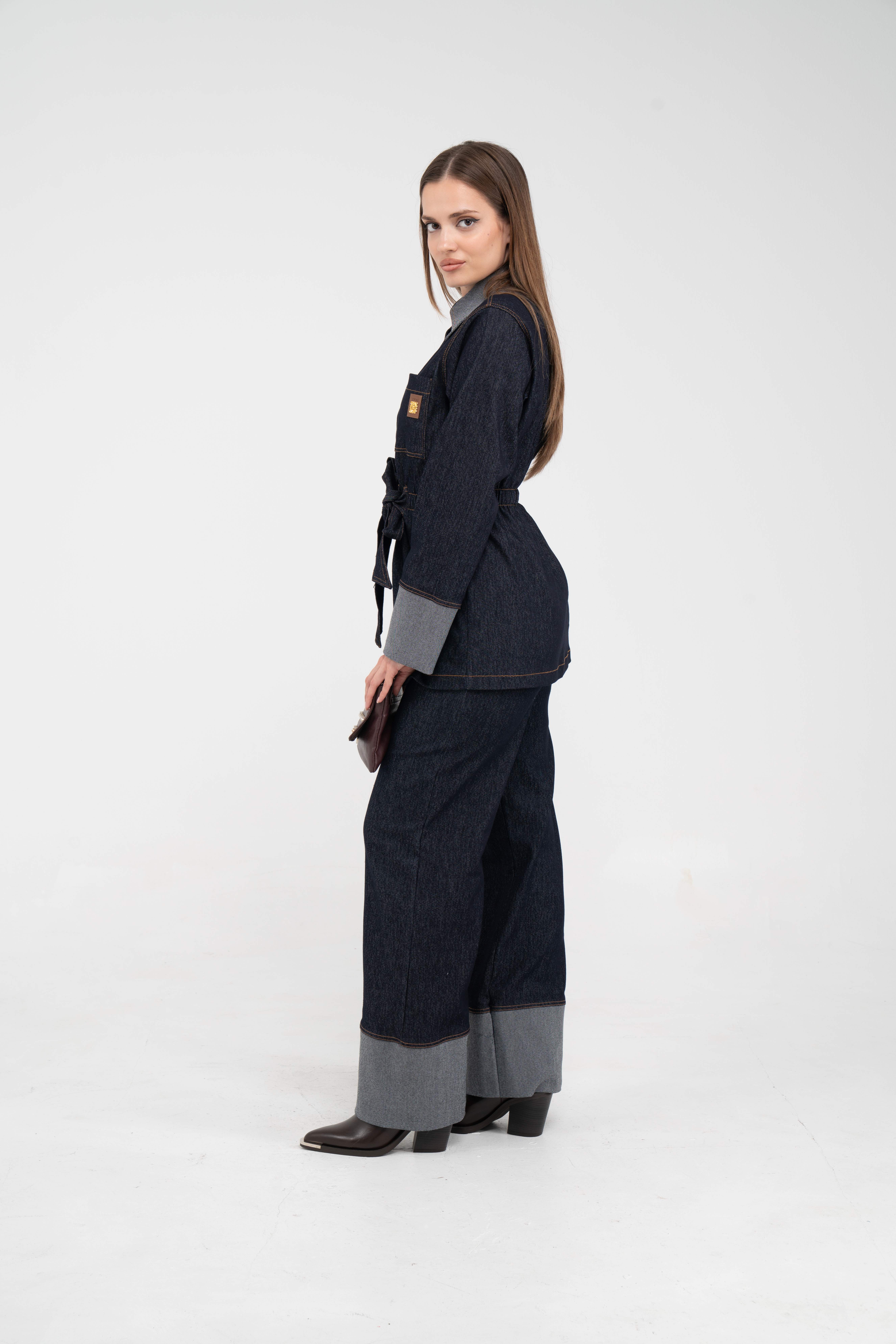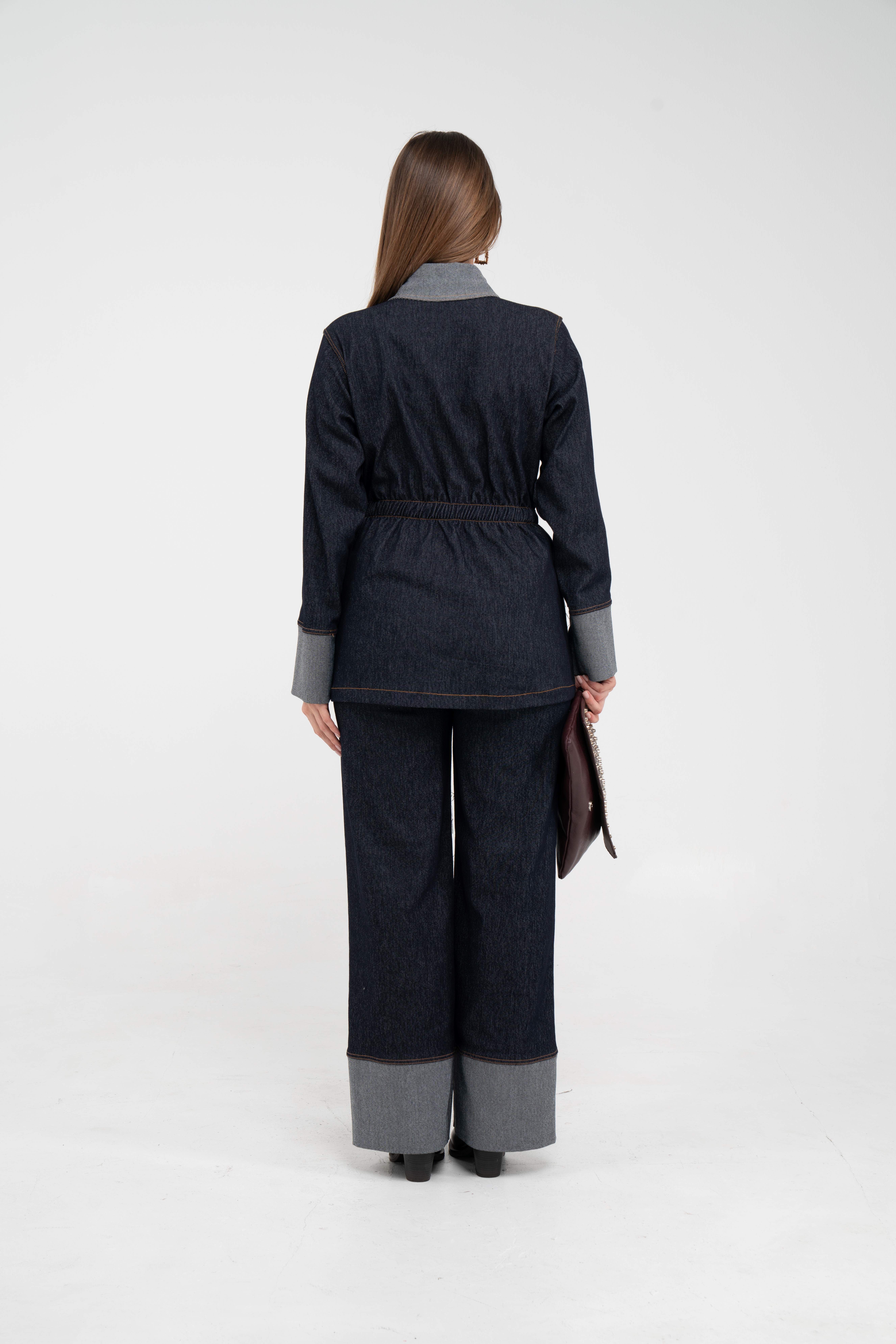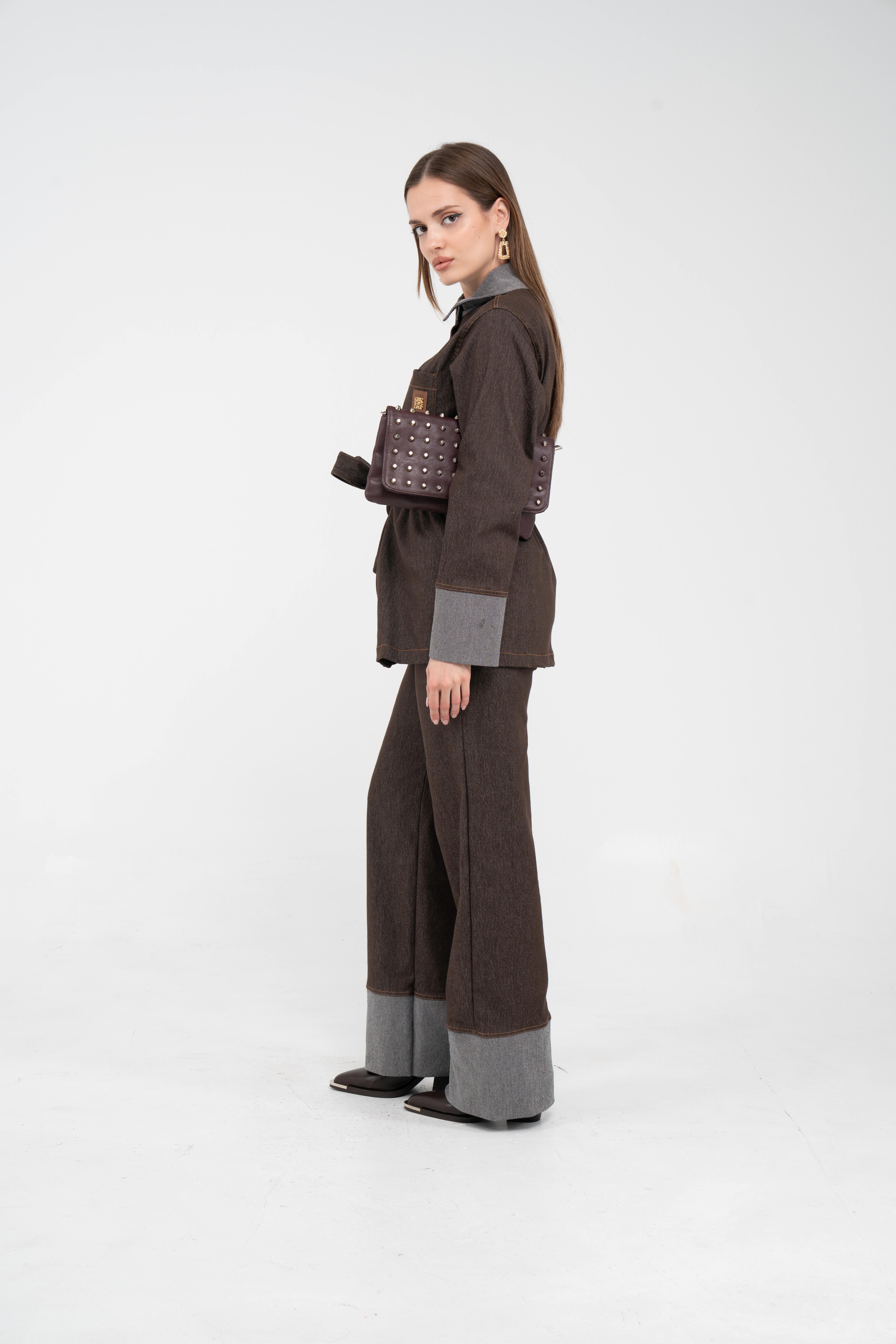 Gelince Haber VerModern şehir stilini yansıtan bu çift kumaş detaylı takım, hem şık hem de güçlü bir görünüm sunar. Üst kısmı gömlek formunda olup, manşet ve yaka kısmındaki kontrast kumaş detayları modele karakter katar. Bel kısmındaki bağlama kuşağı formu vurgulayarak daha derli toplu bir siluet oluşturur.
