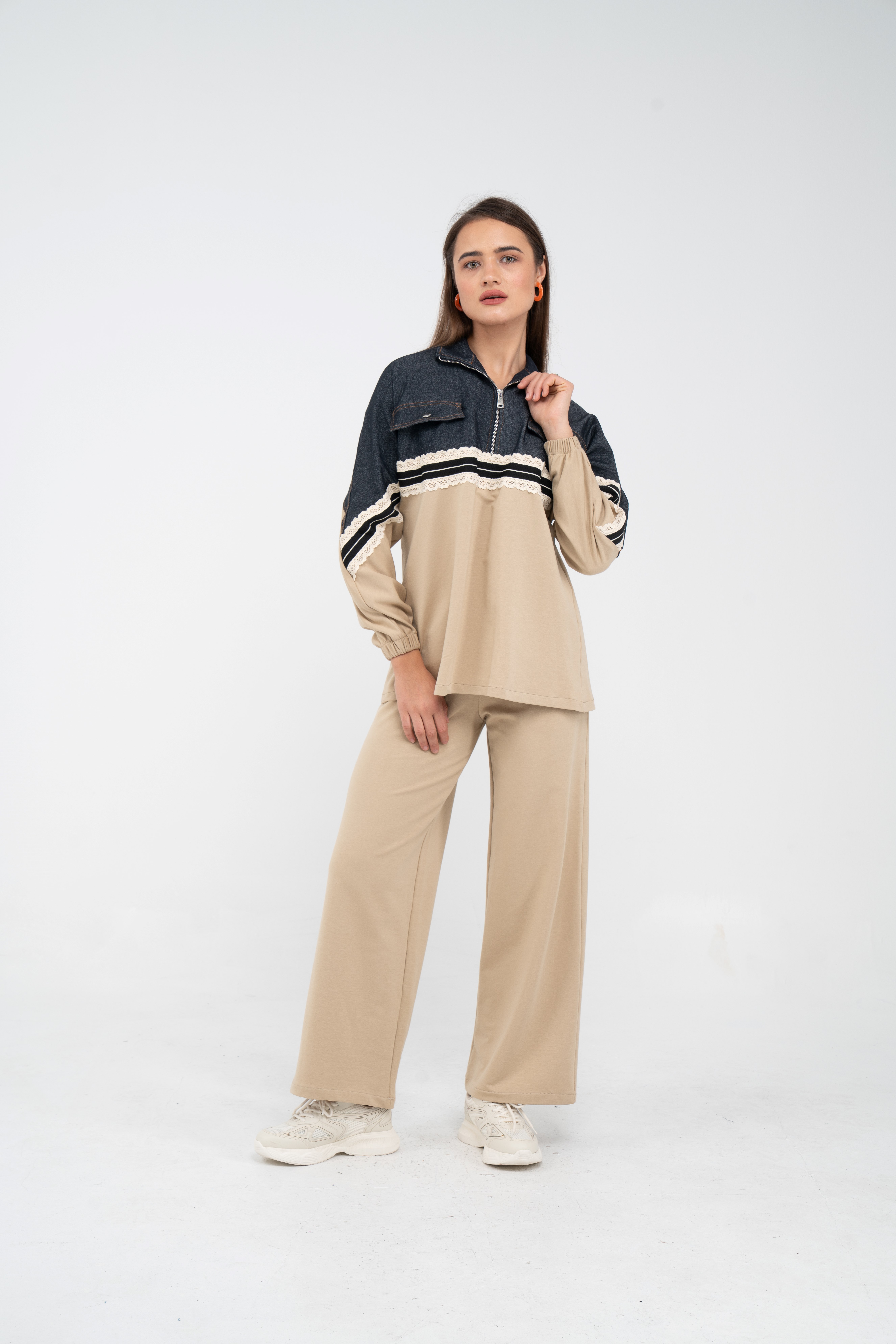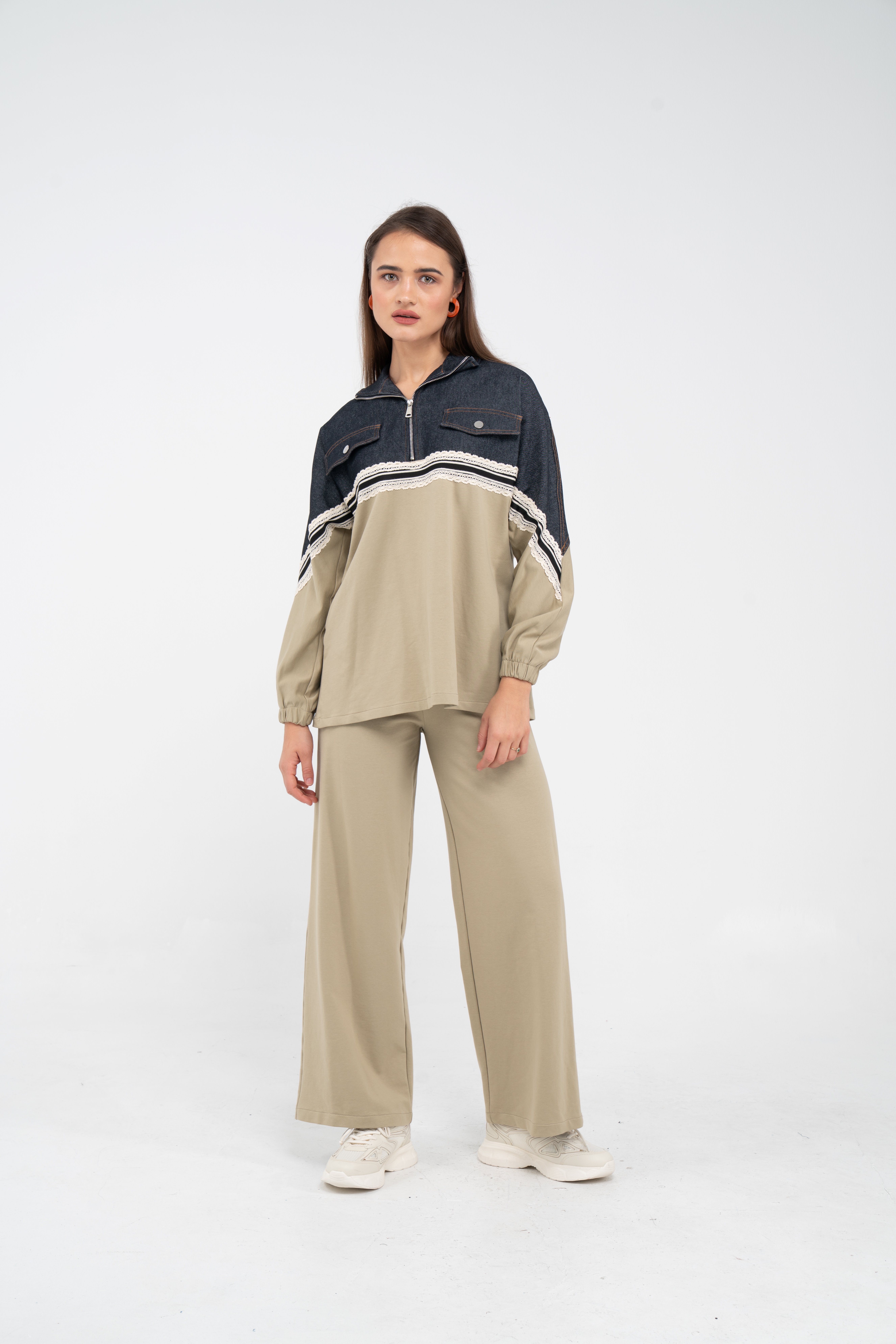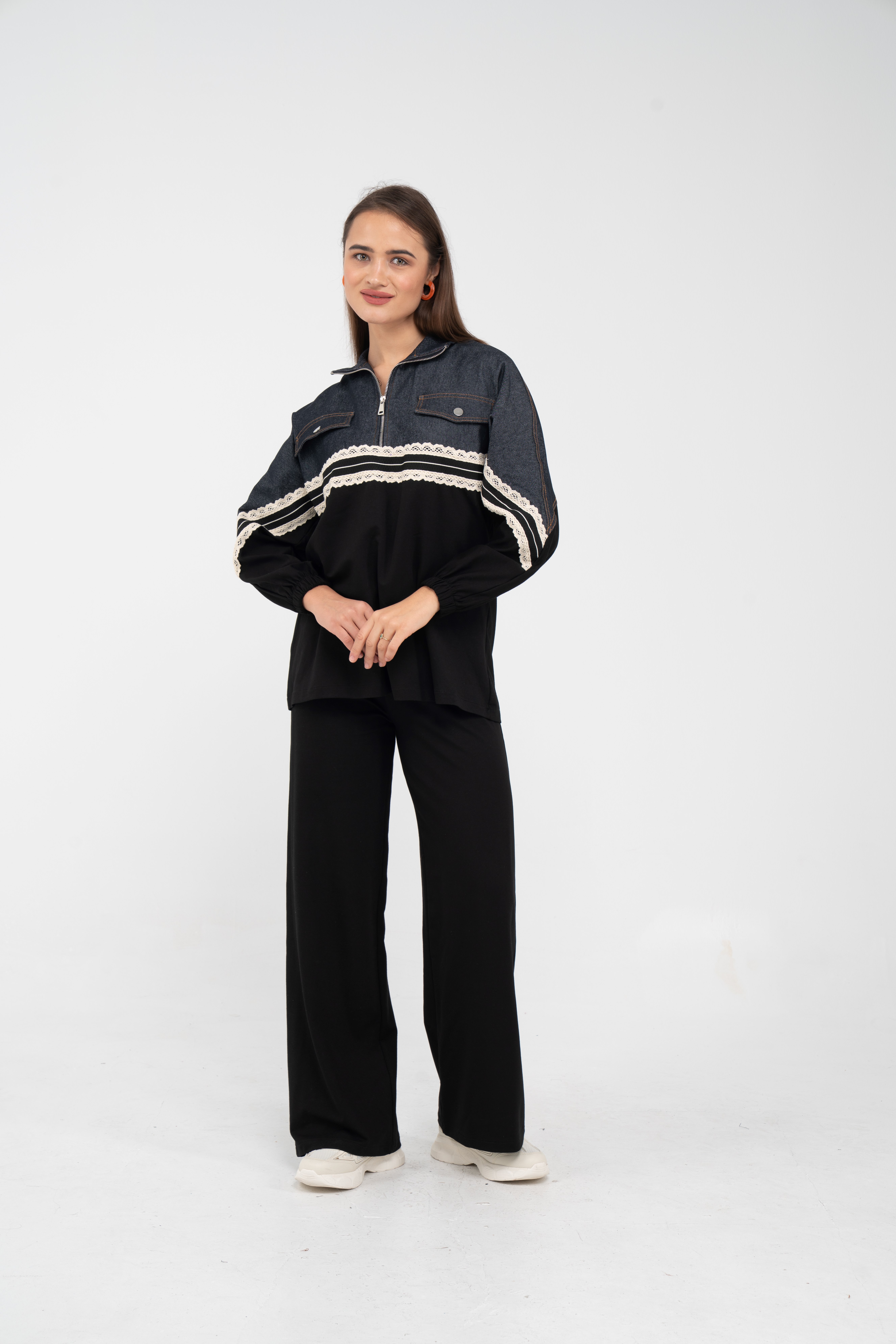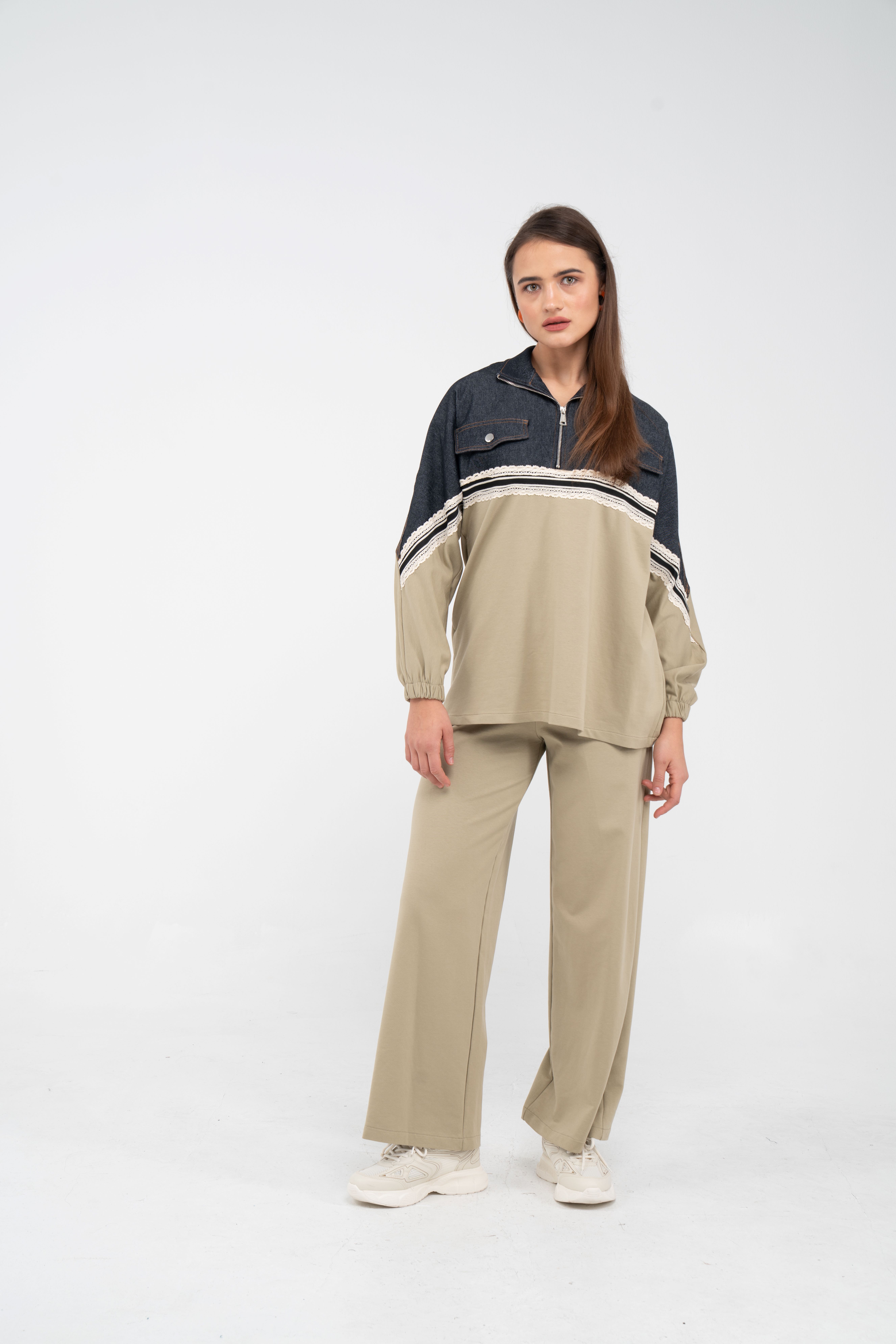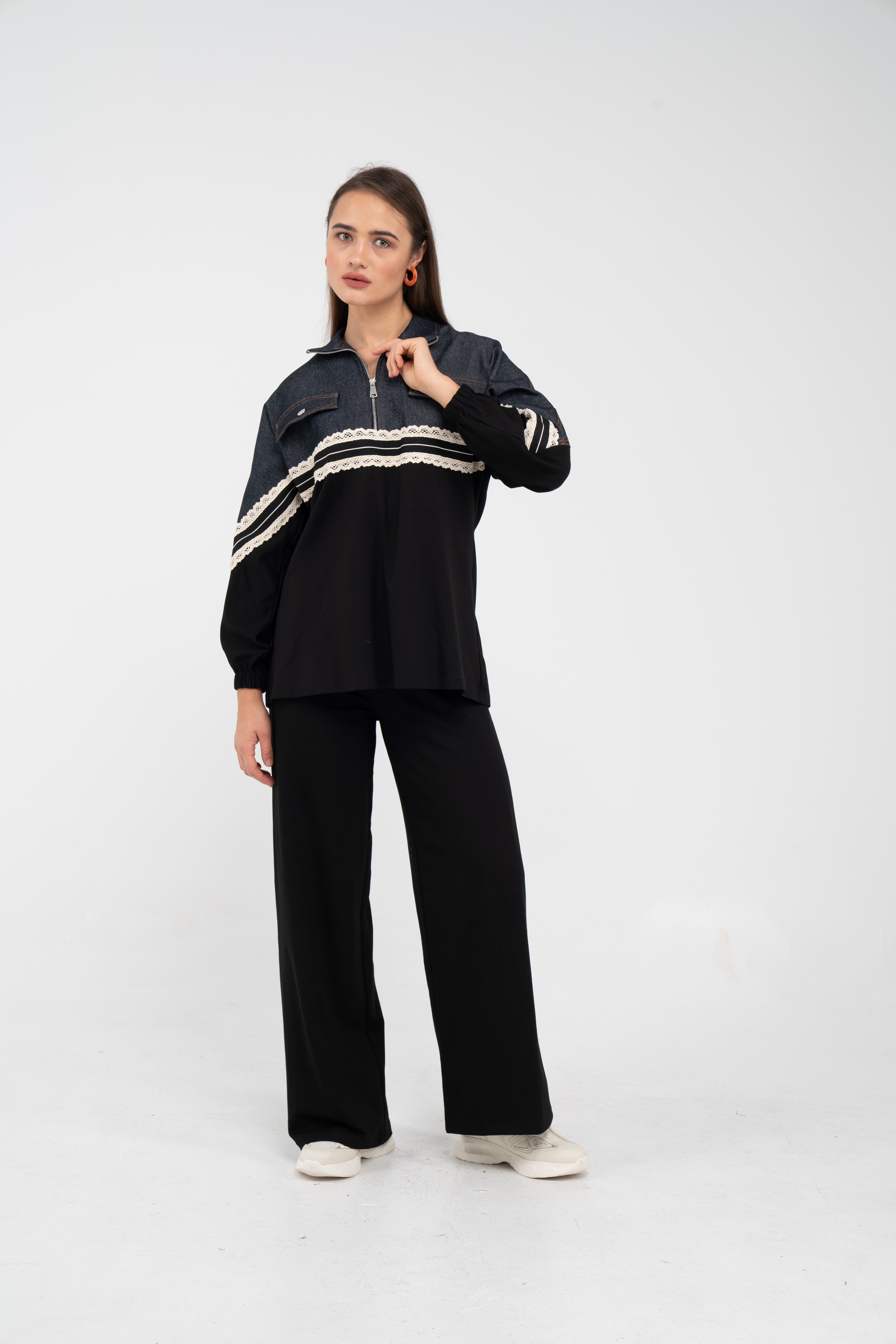 Yarım fermuarlı oversize üst, modern bir duruş sağlarken; bol paça pantolon gün boyu rahat hareket etmeni sağlar.
