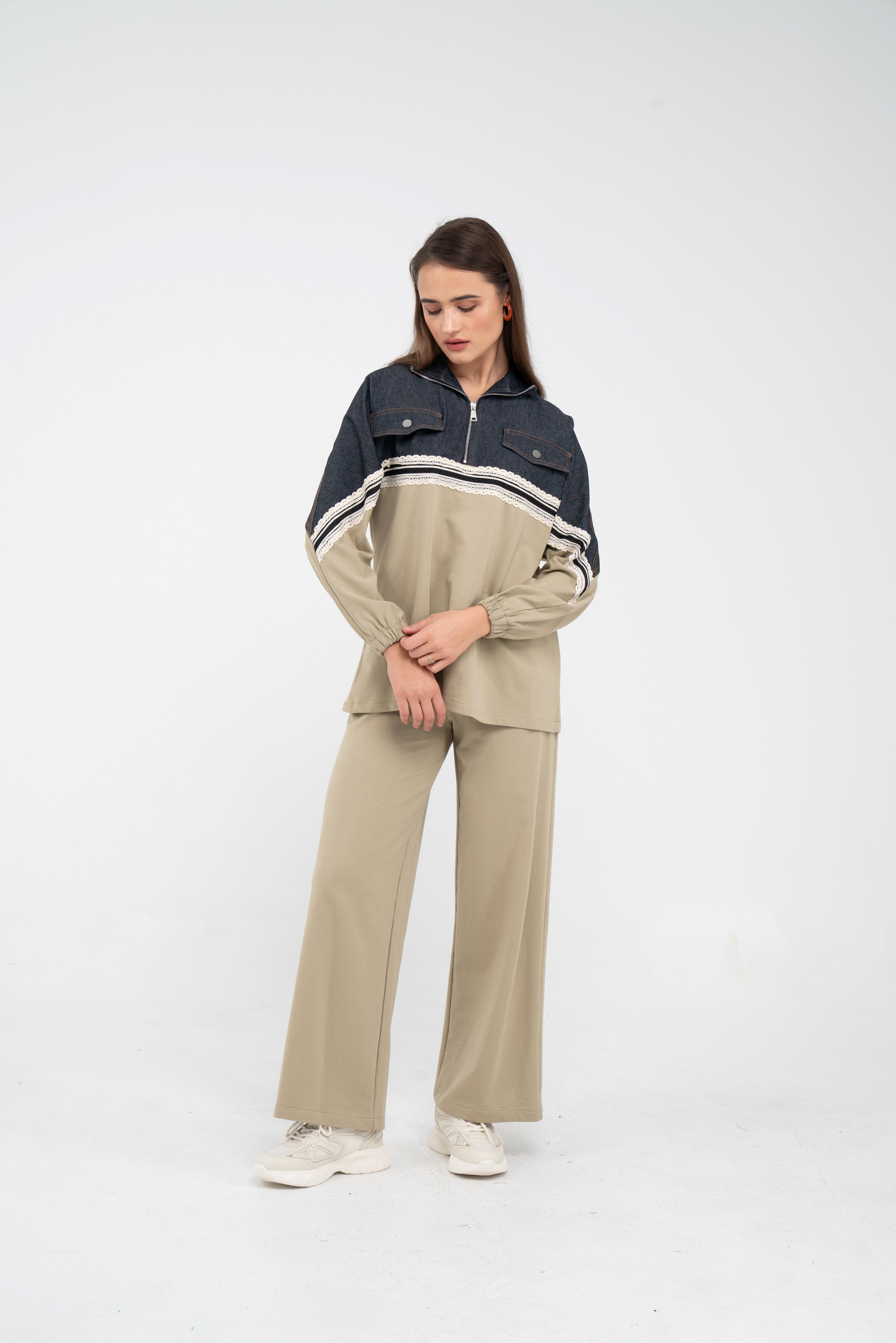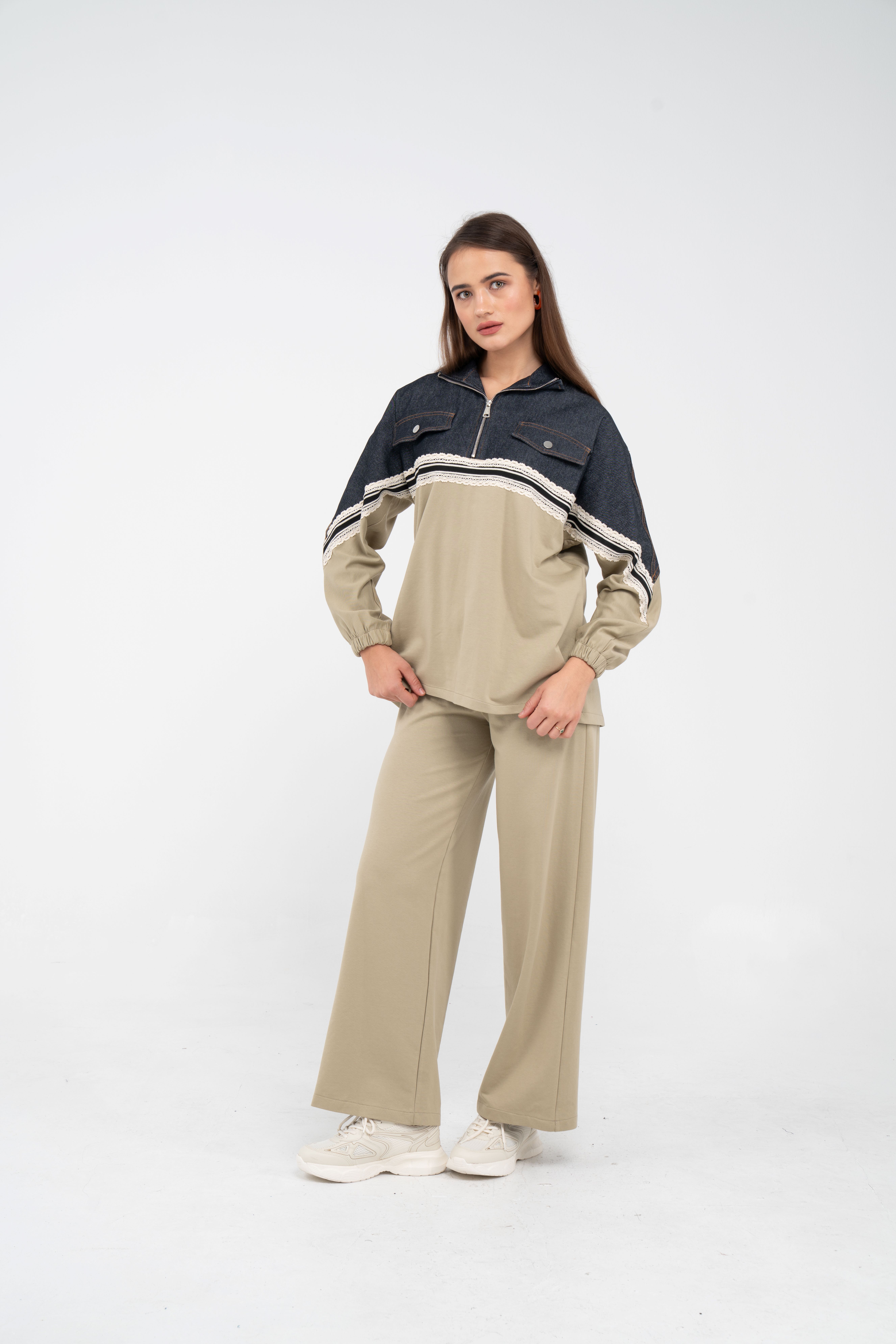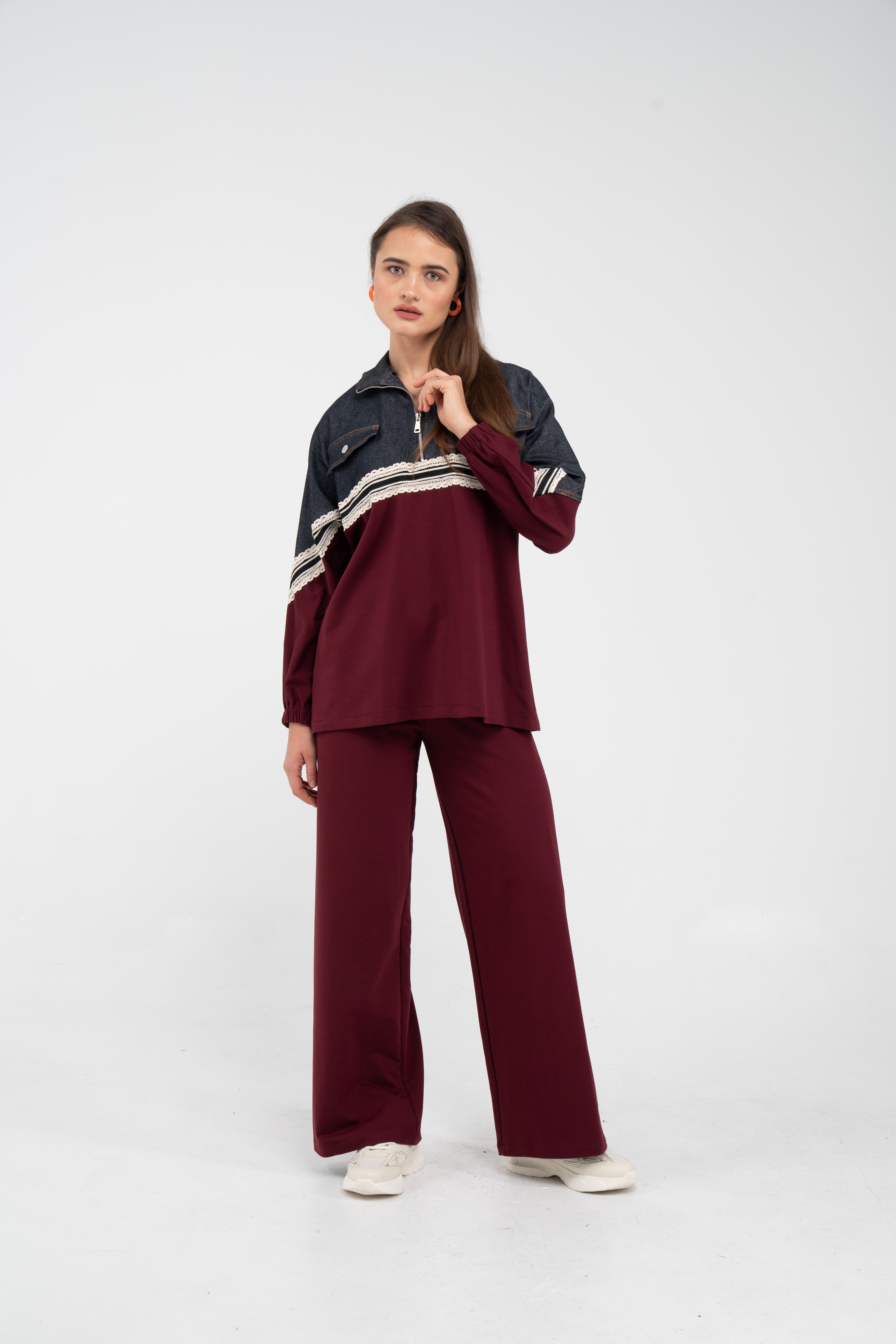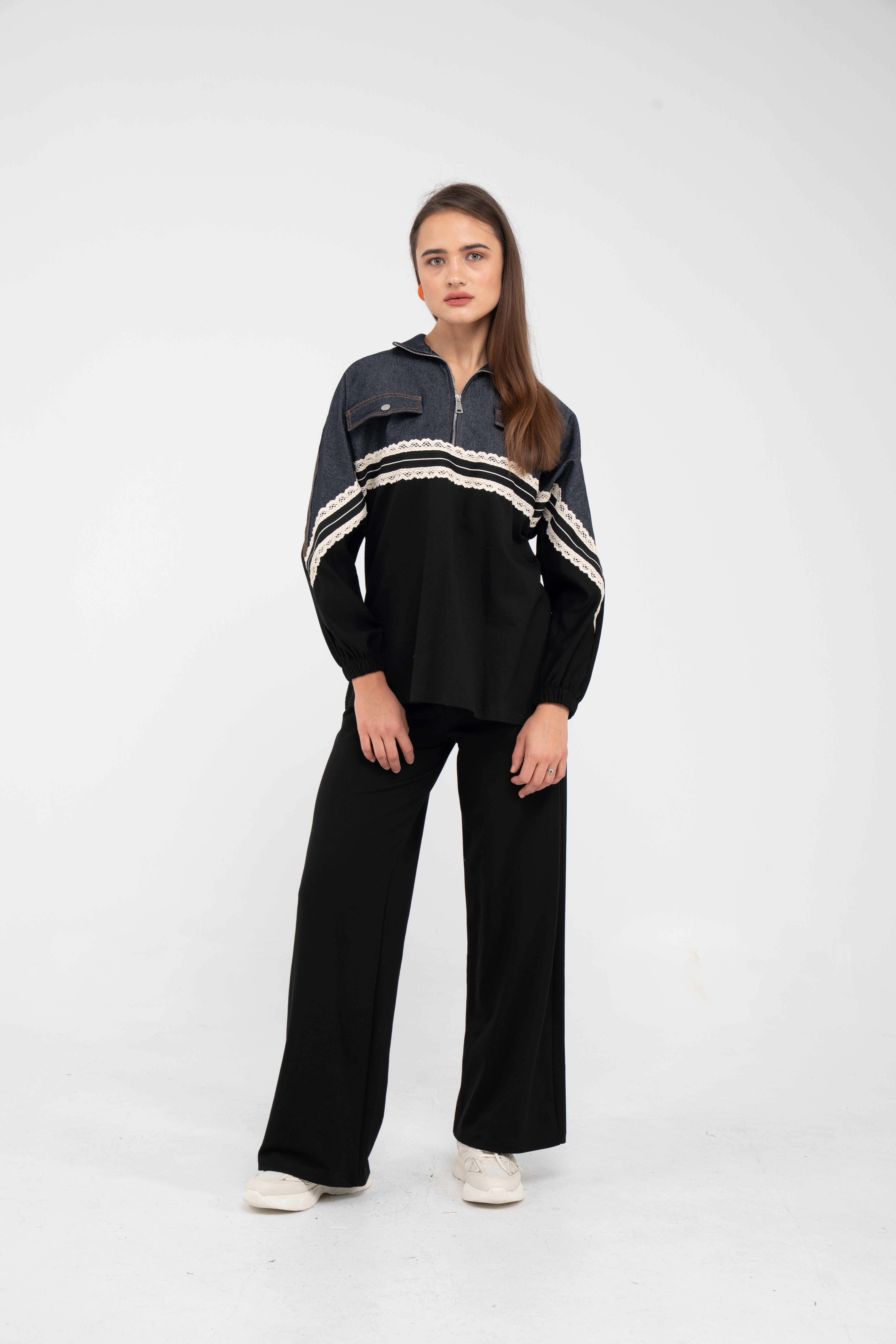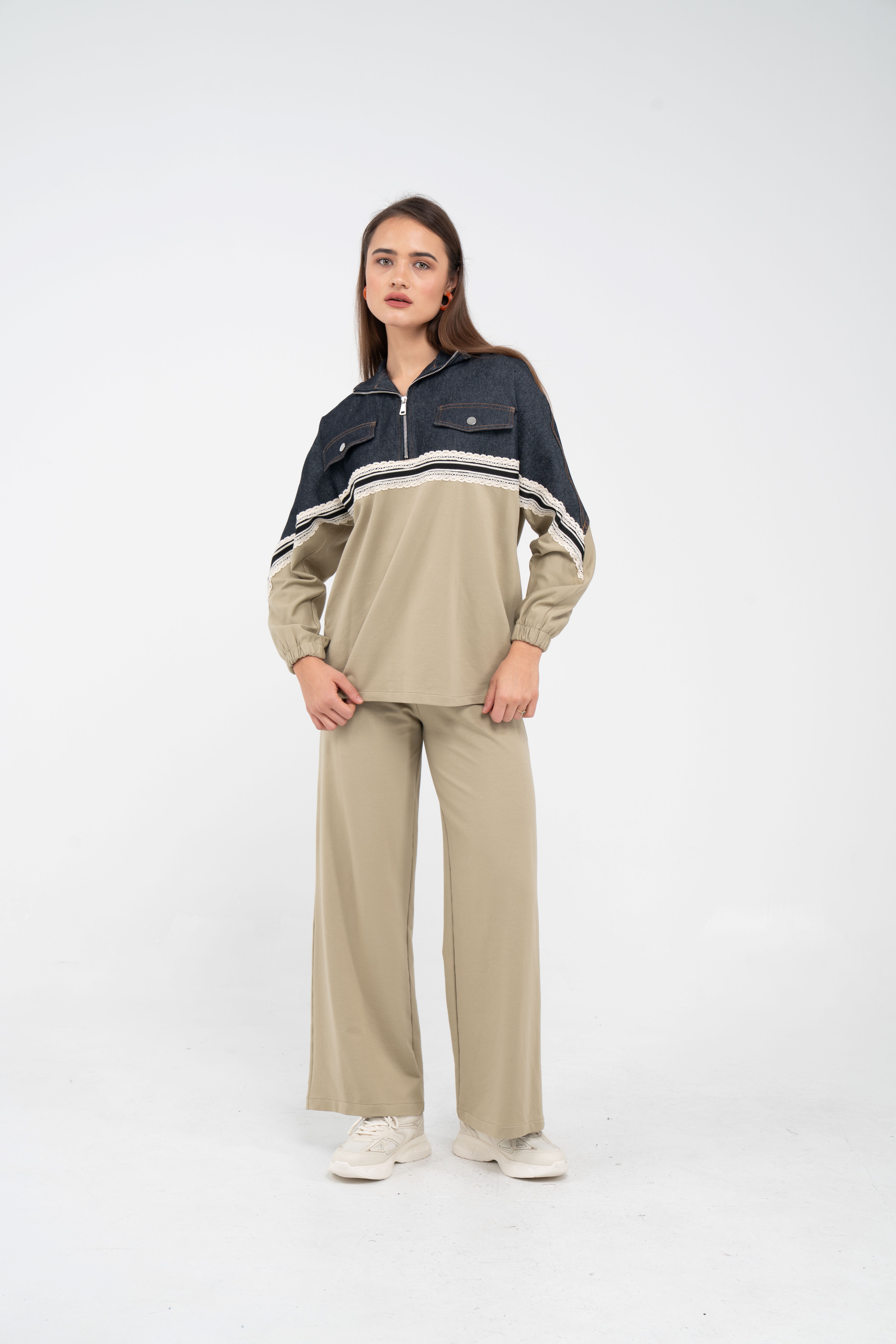Yarım fermuarlı oversize üst, modern bir duruş sağlarken; bol paça pantolon gün boyu rahat hareket etmeni sağlar.