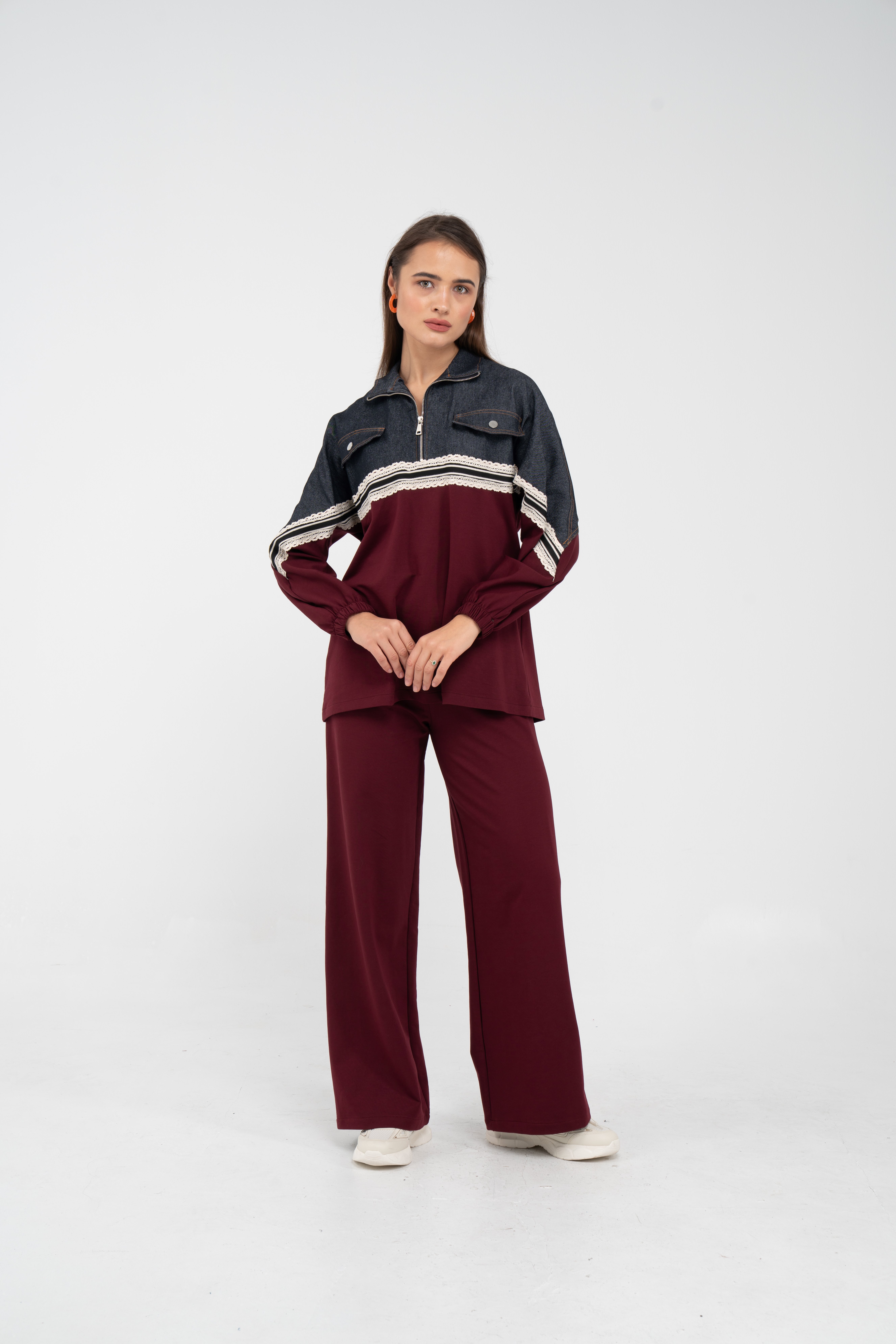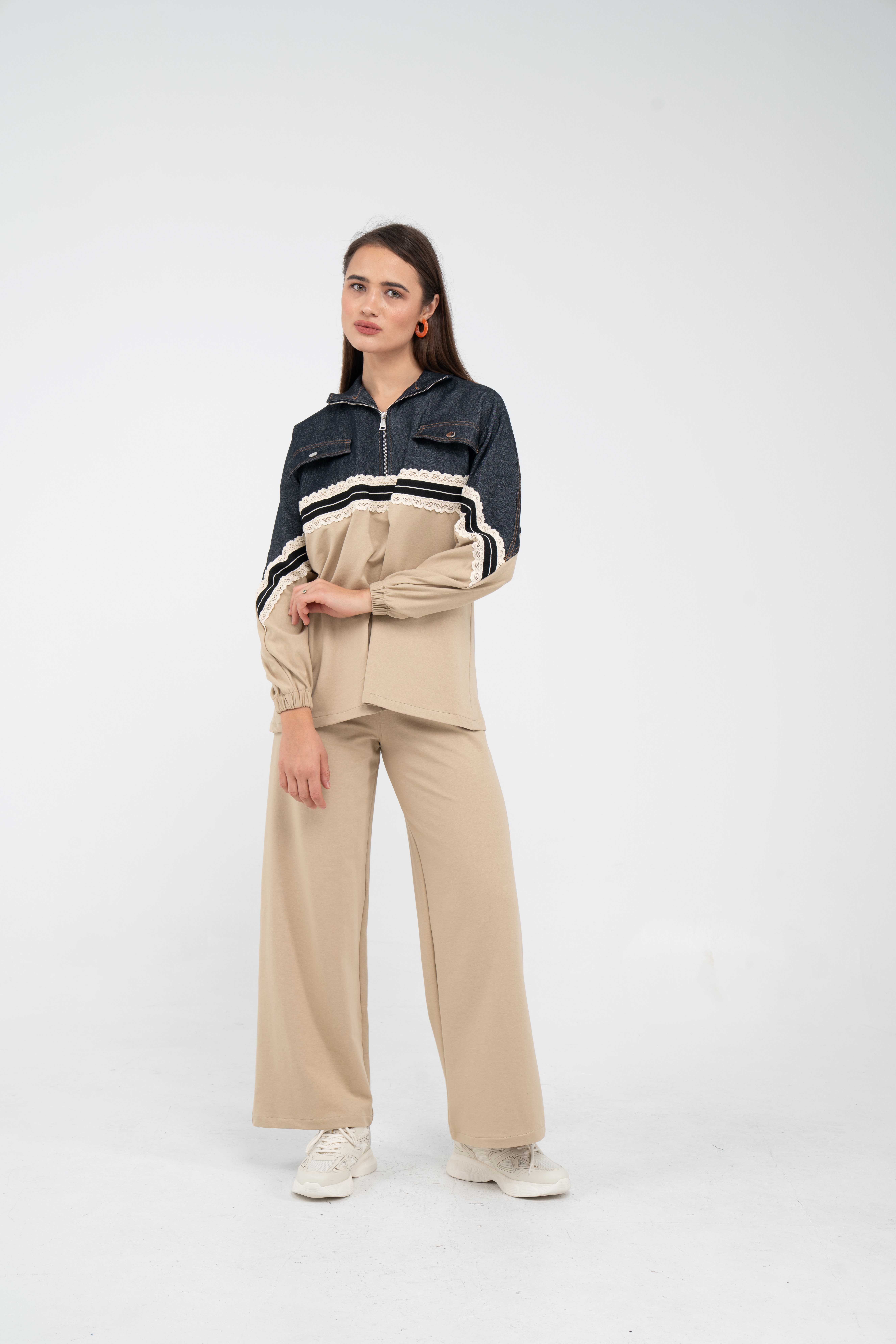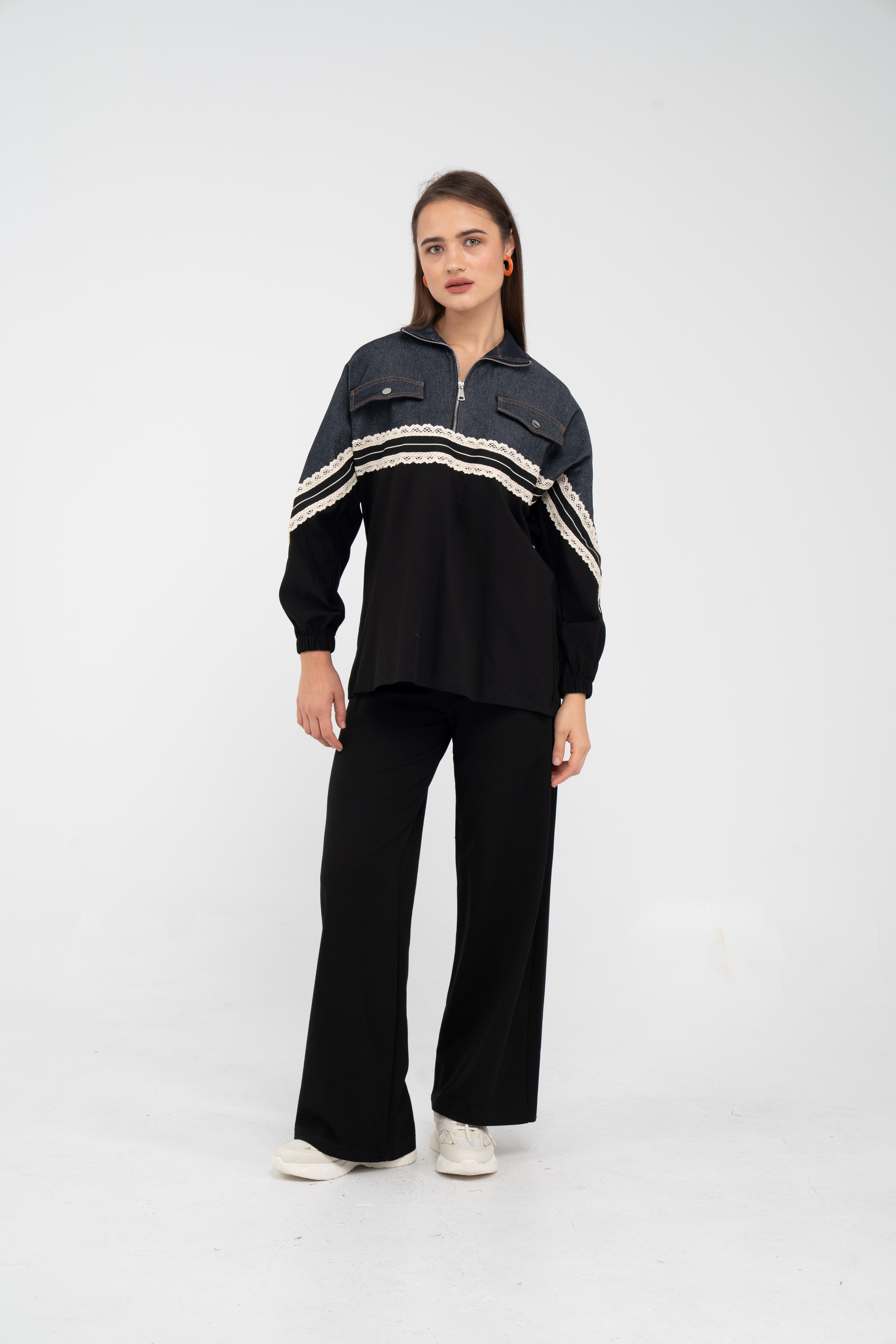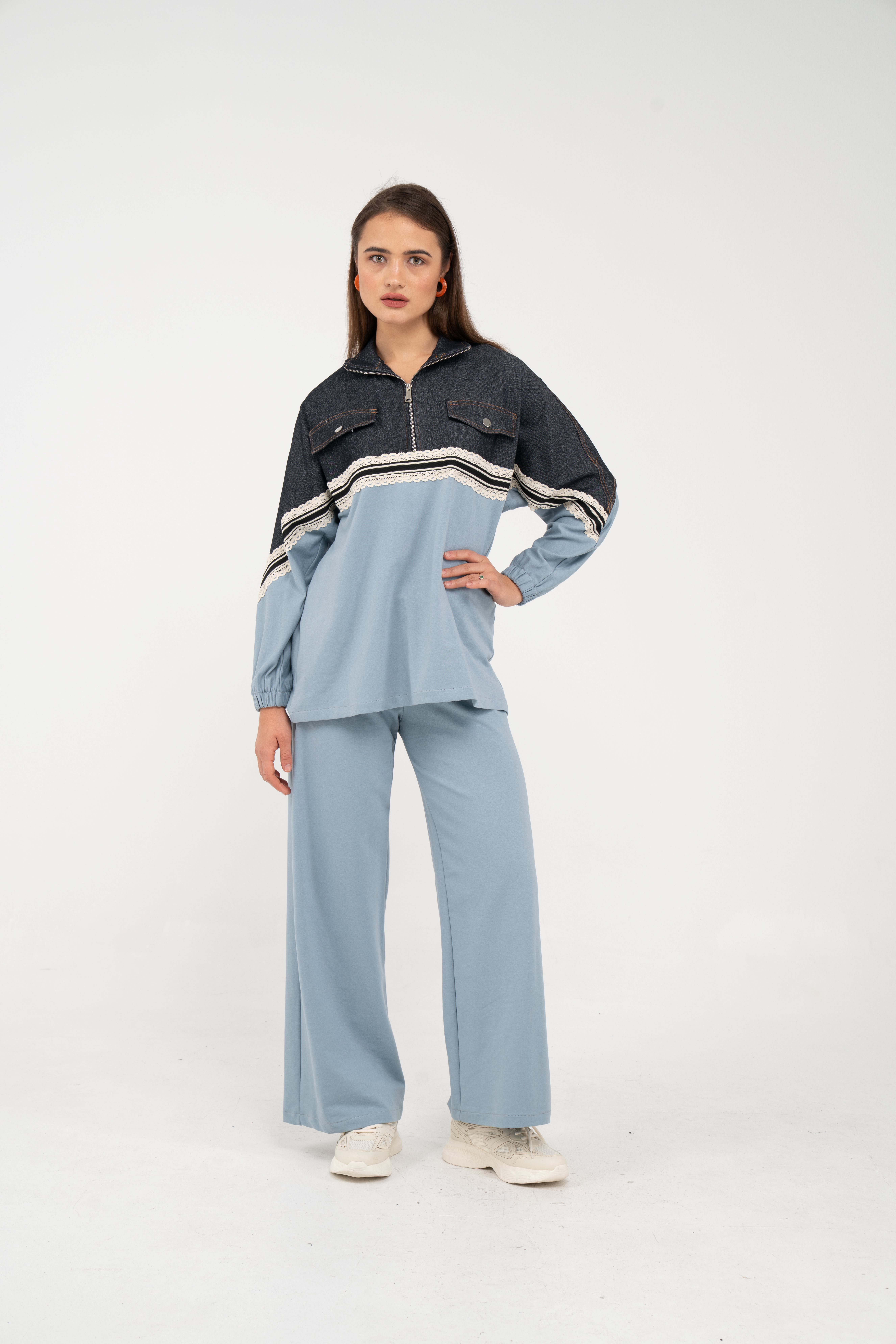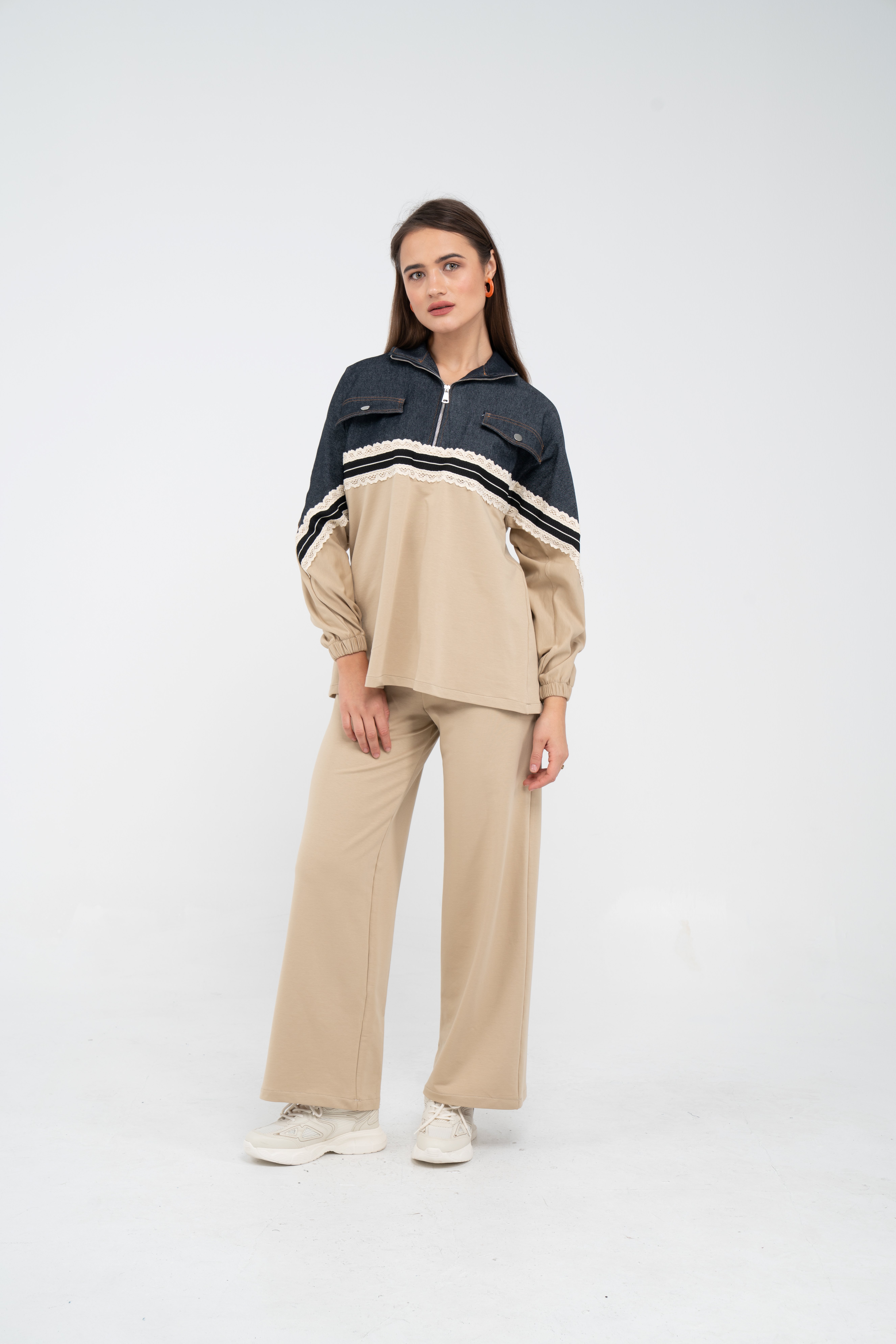 Yarım fermuarlı oversize üst, modern bir duruş sağlarken; bol paça pantolon gün boyu rahat hareket etmeni sağlar.