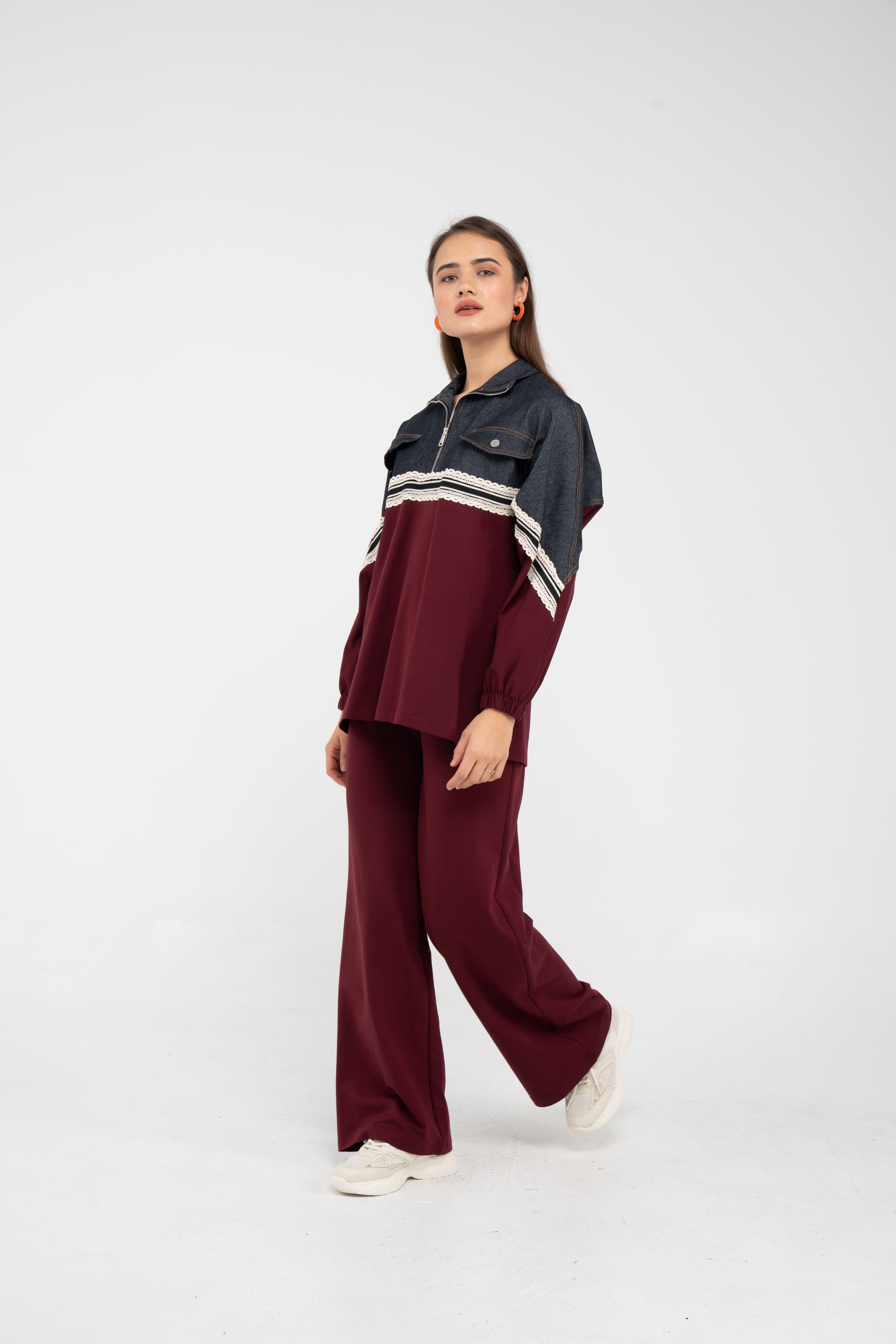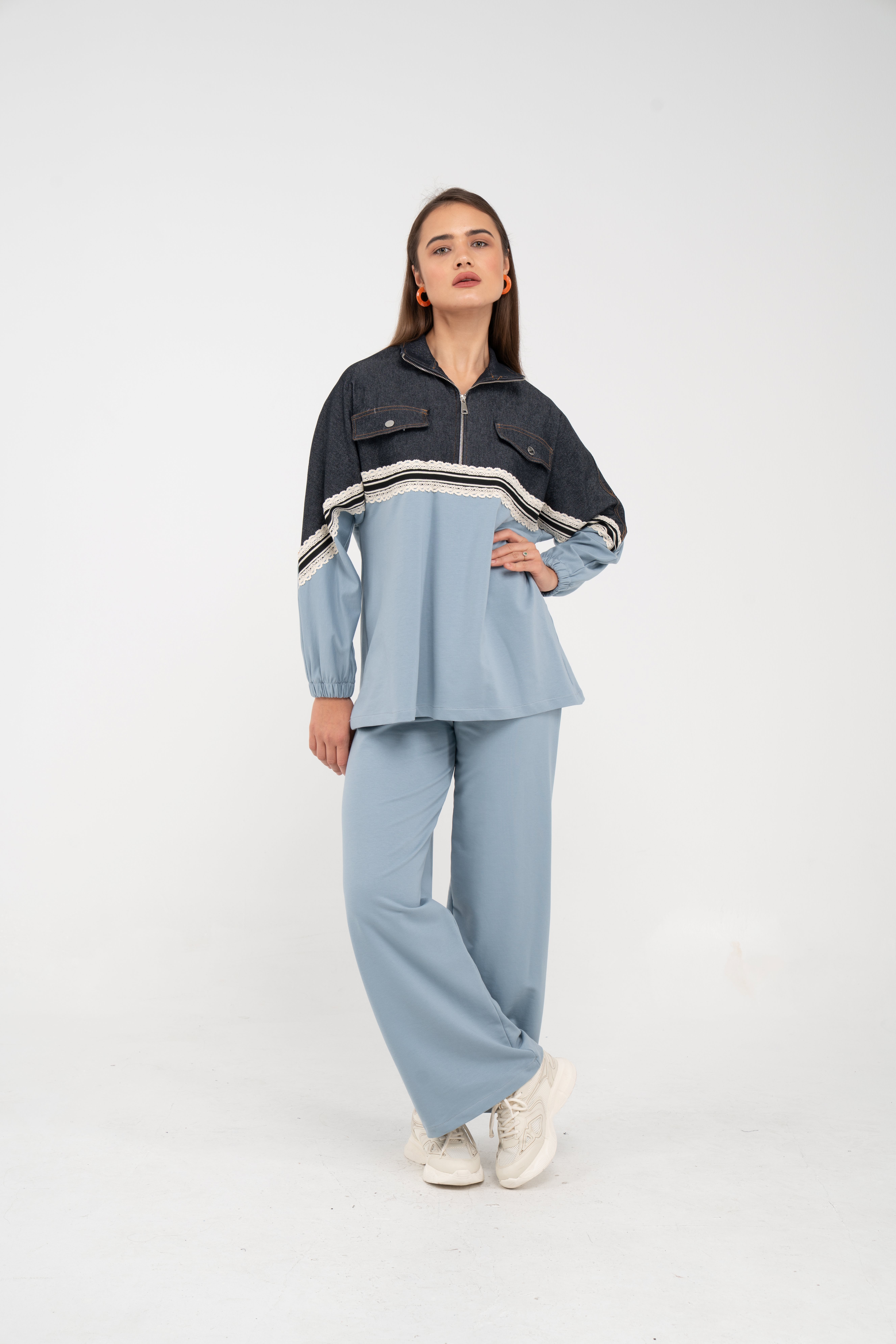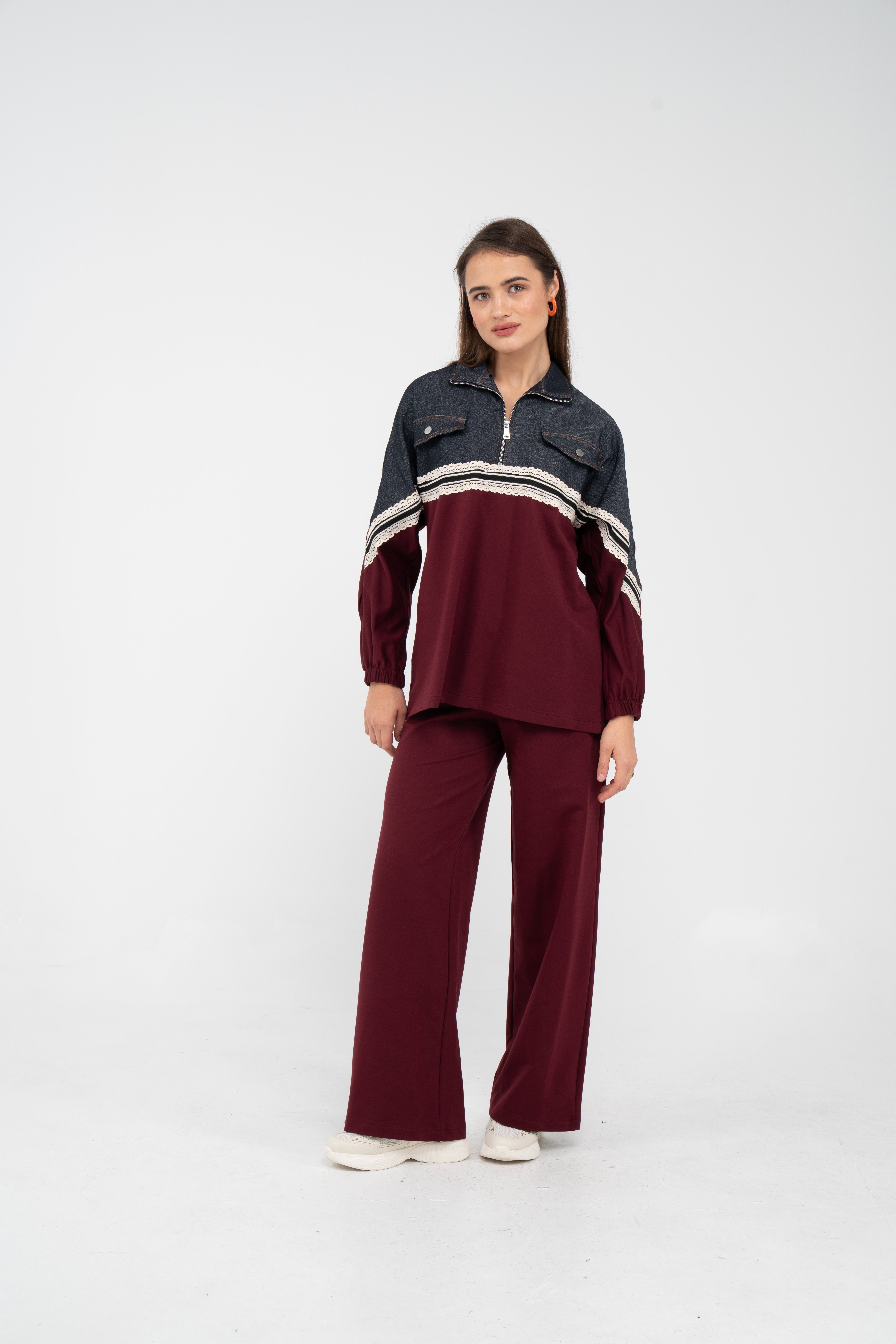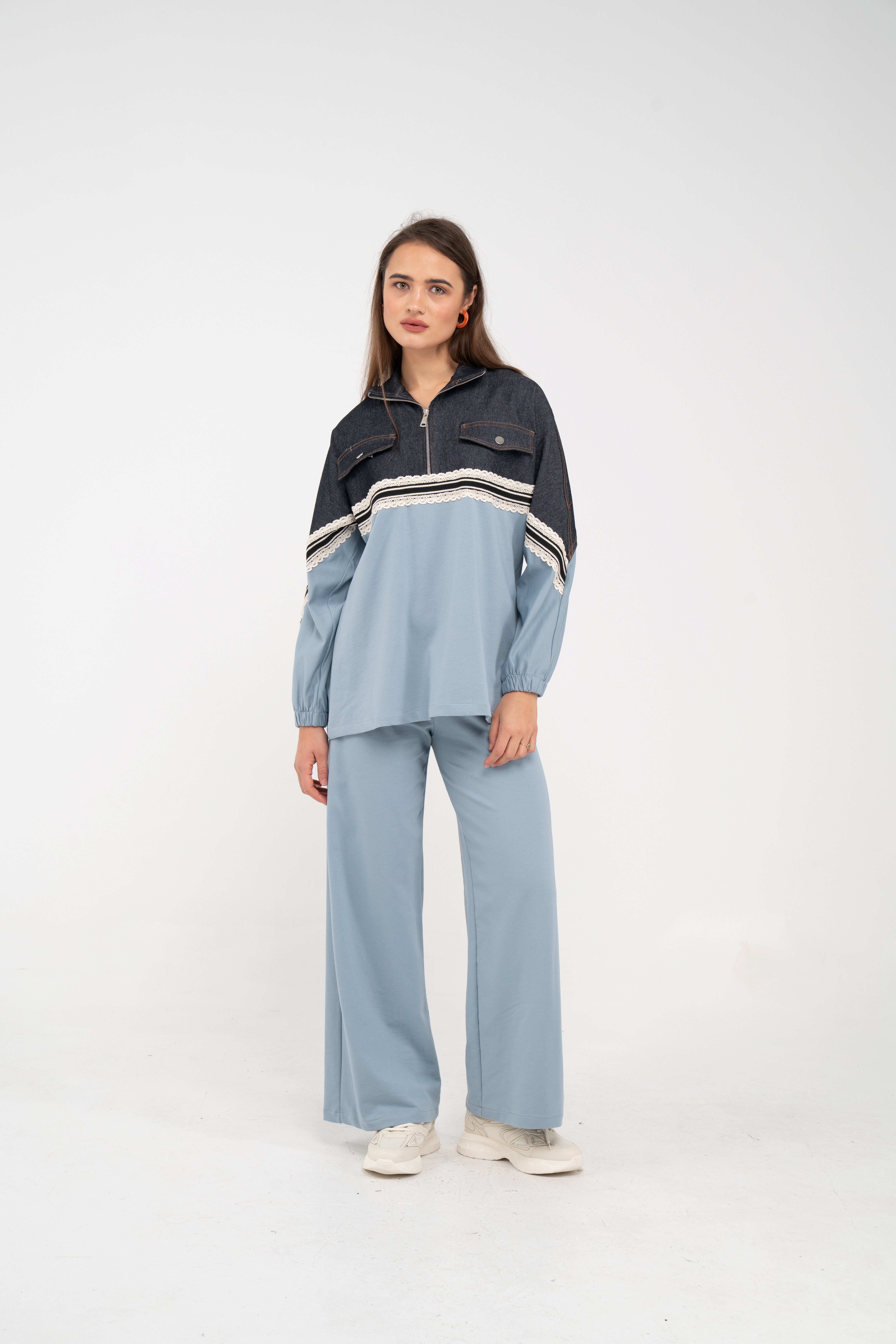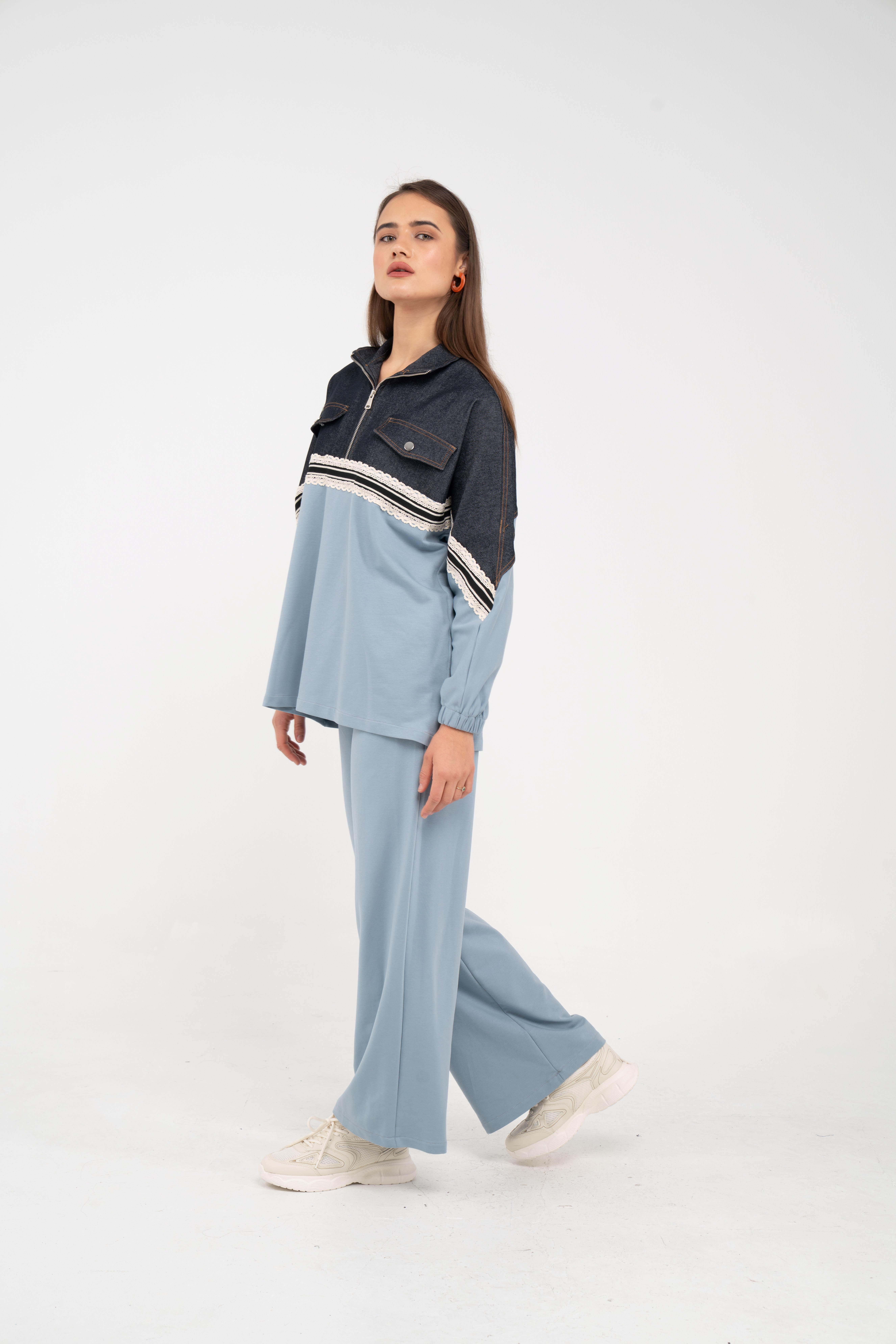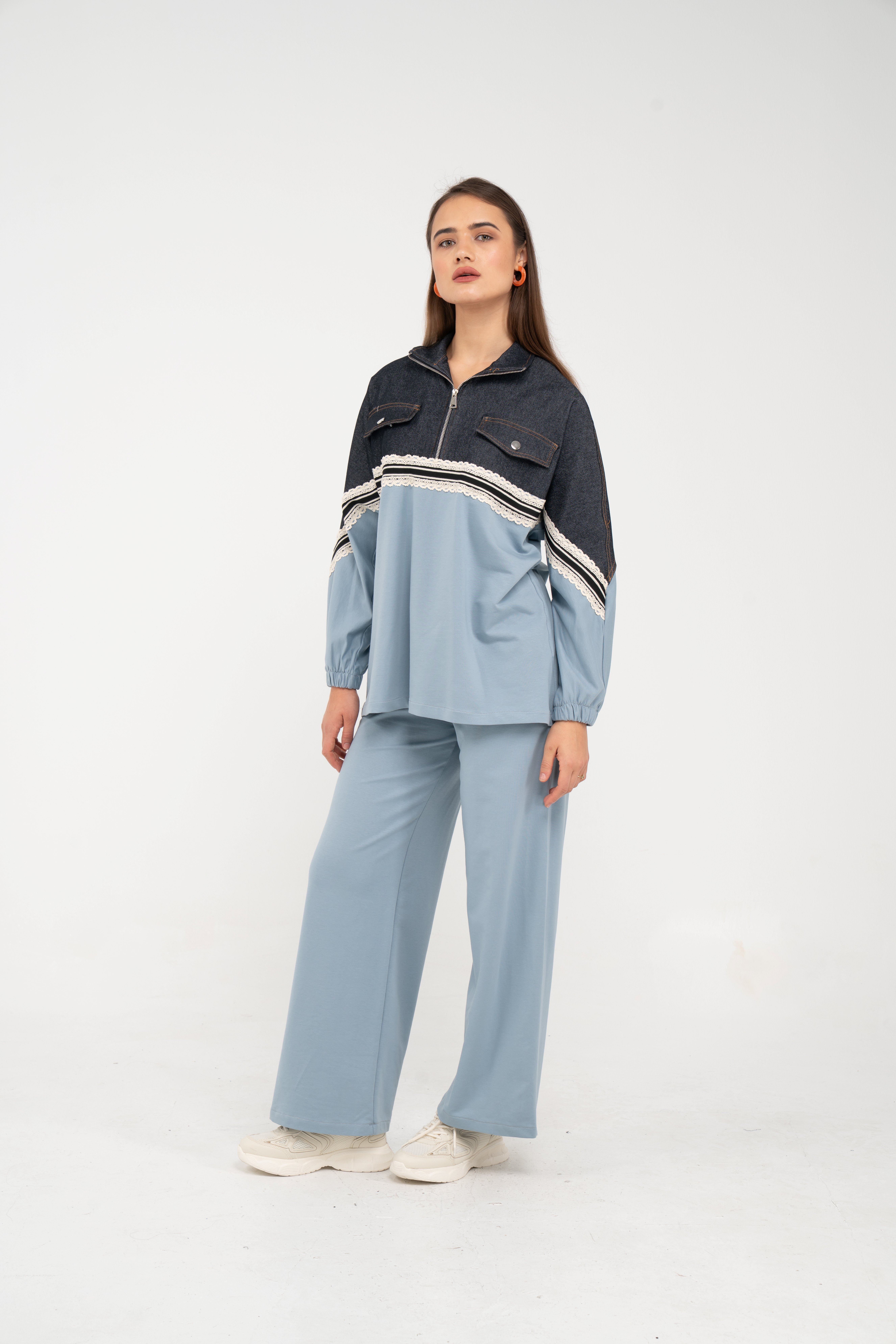Yarım fermuarlı oversize üst, modern bir duruş sağlarken; bol paça pantolon gün boyu rahat hareket etmeni sağlar.