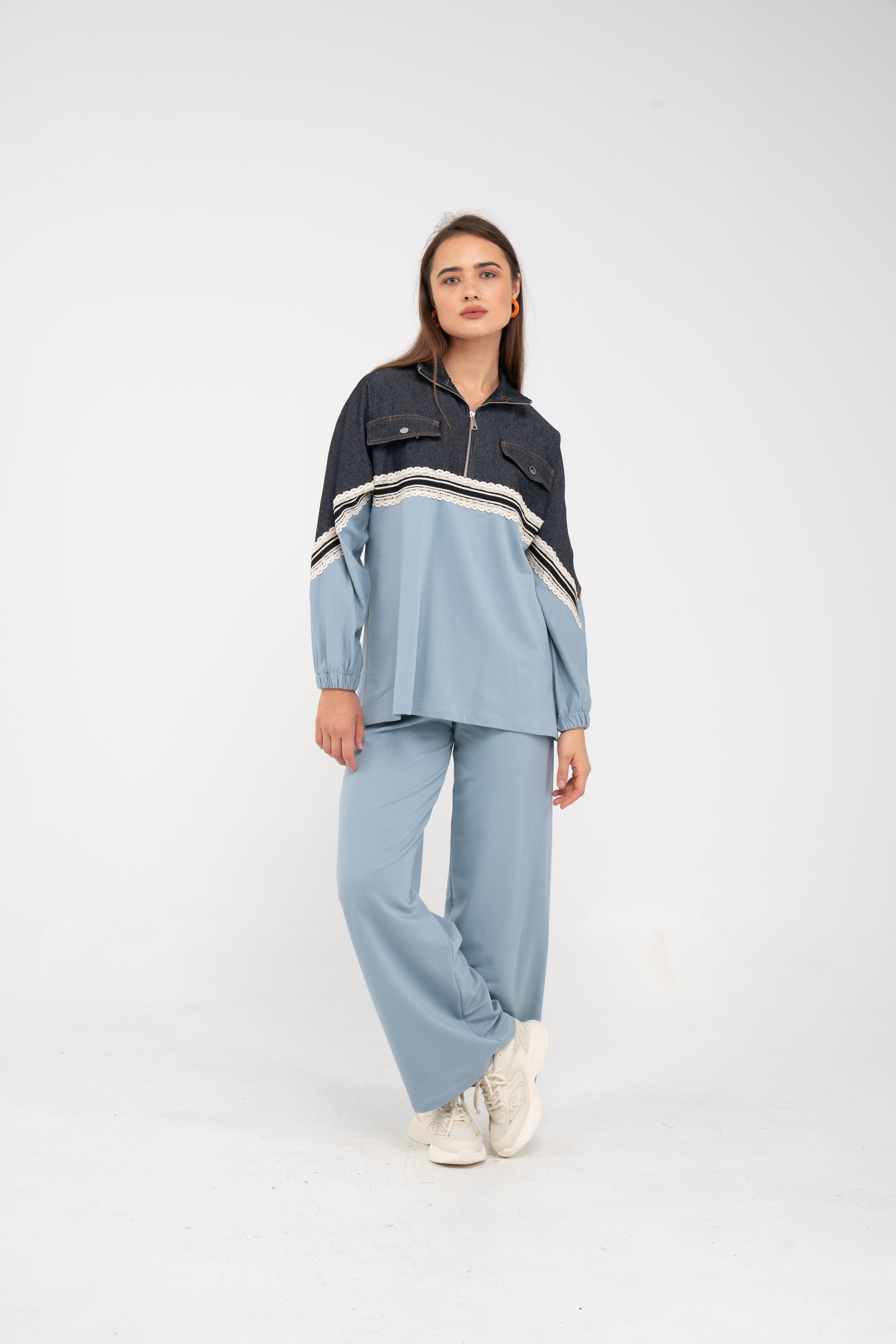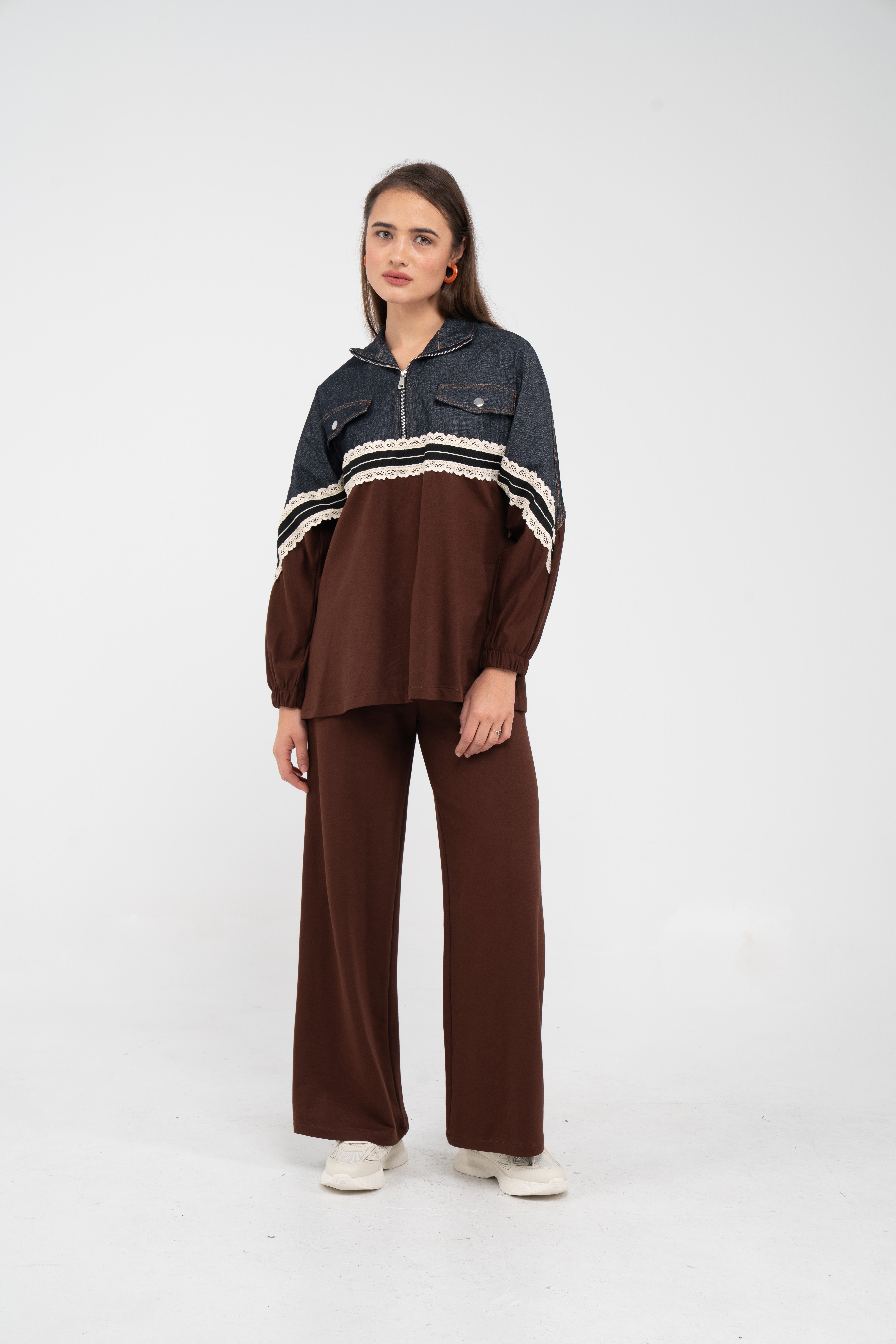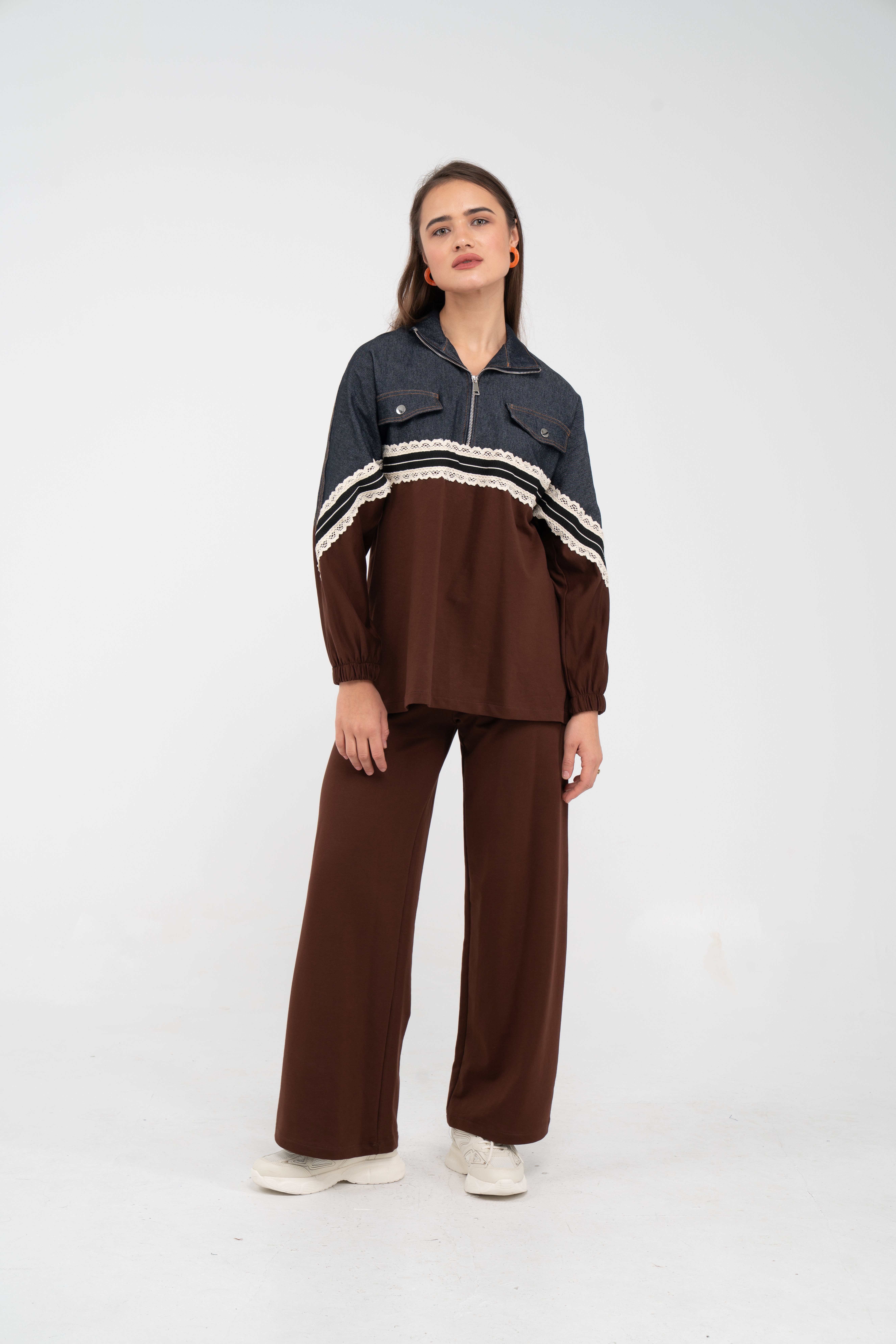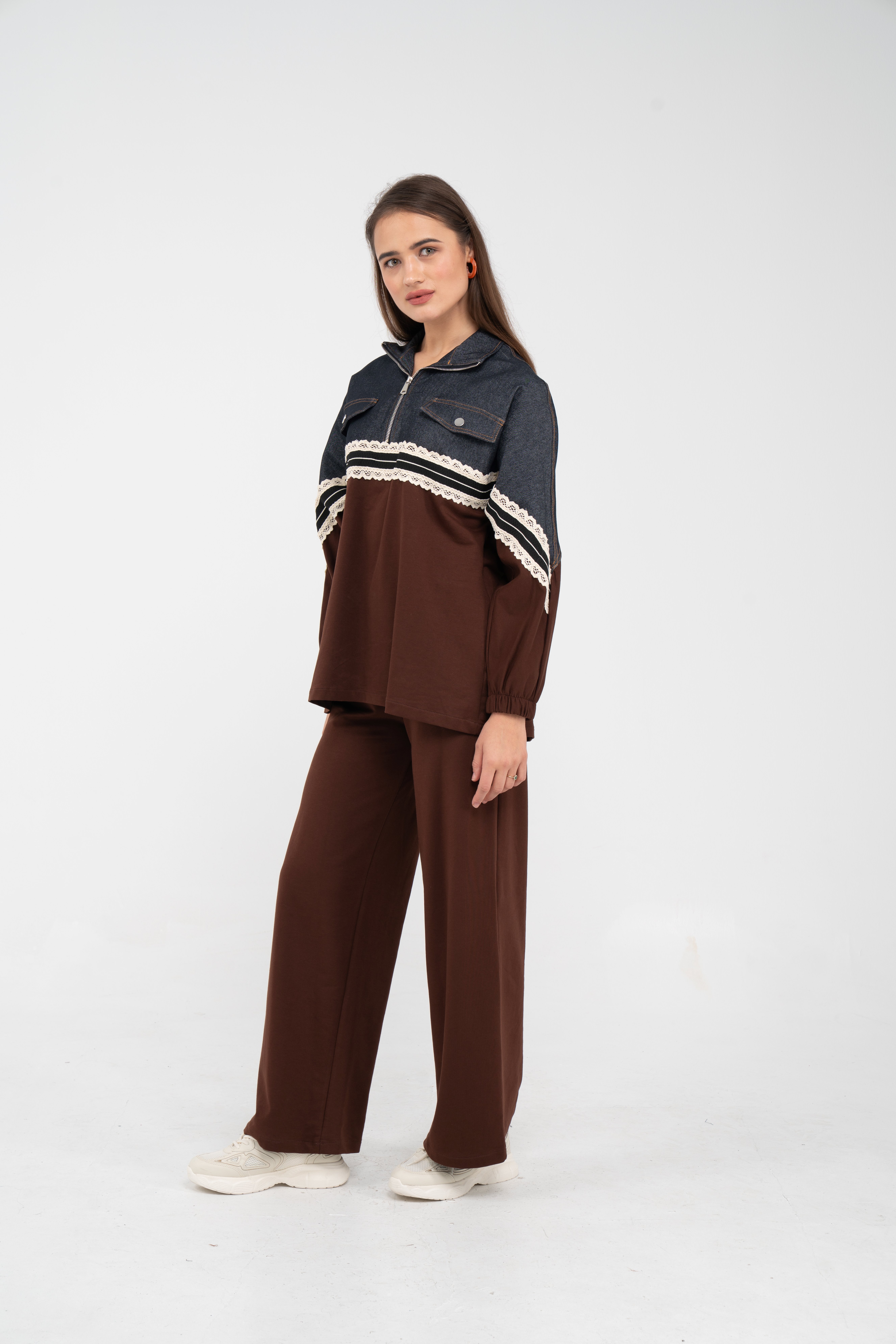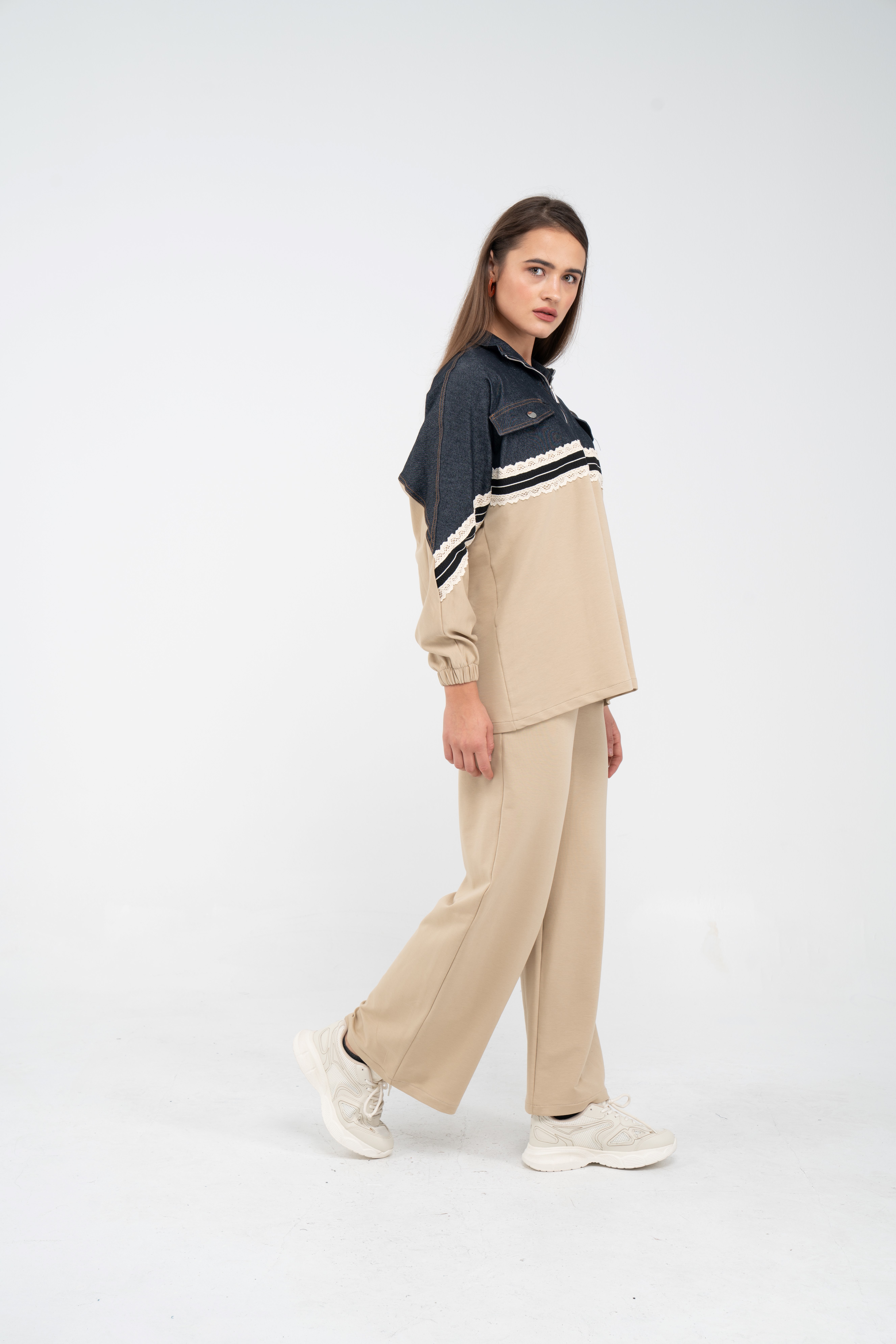Yarım fermuarlı oversize üst, modern bir duruş sağlarken; bol paça pantolon gün boyu rahat hareket etmeni sağlar.