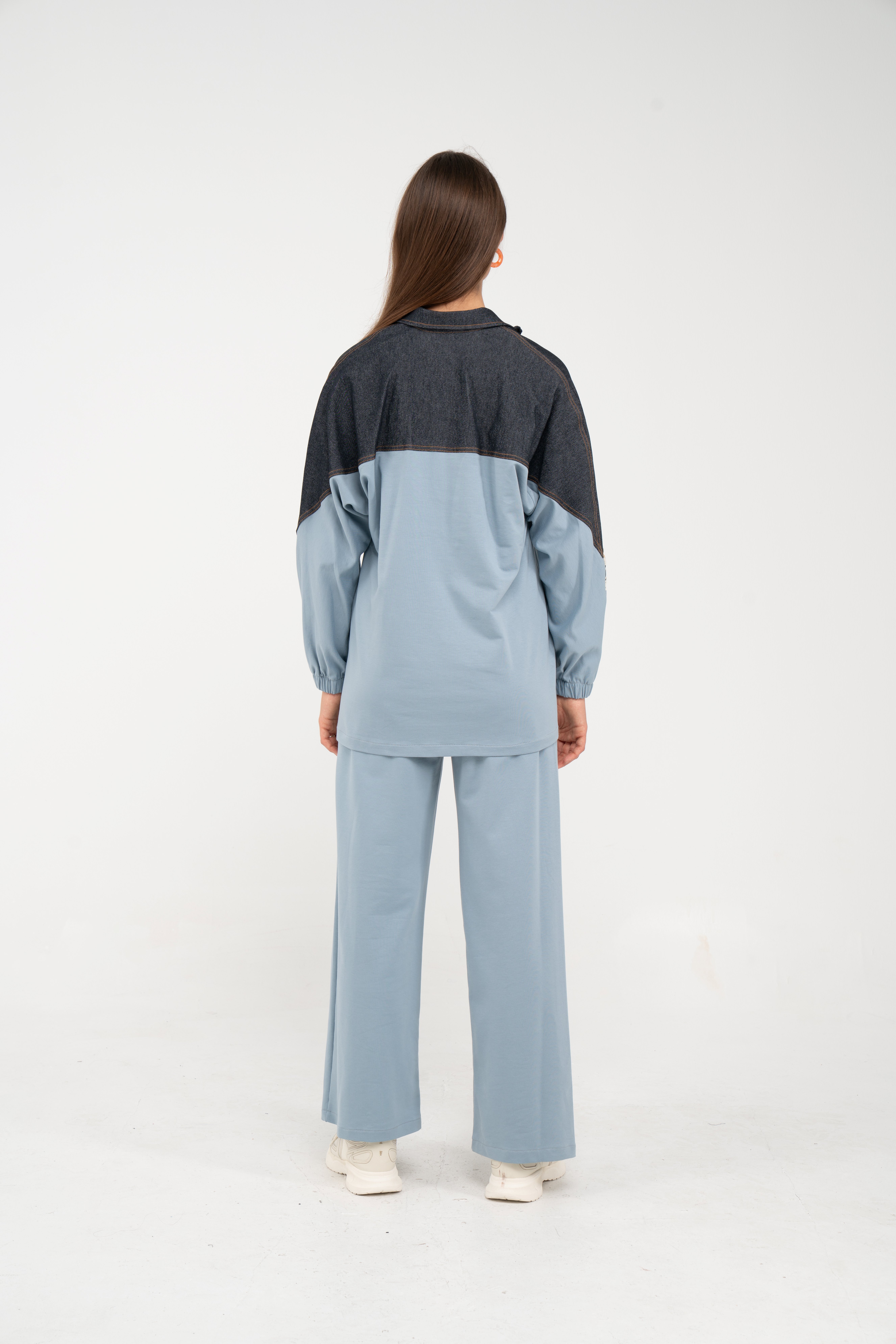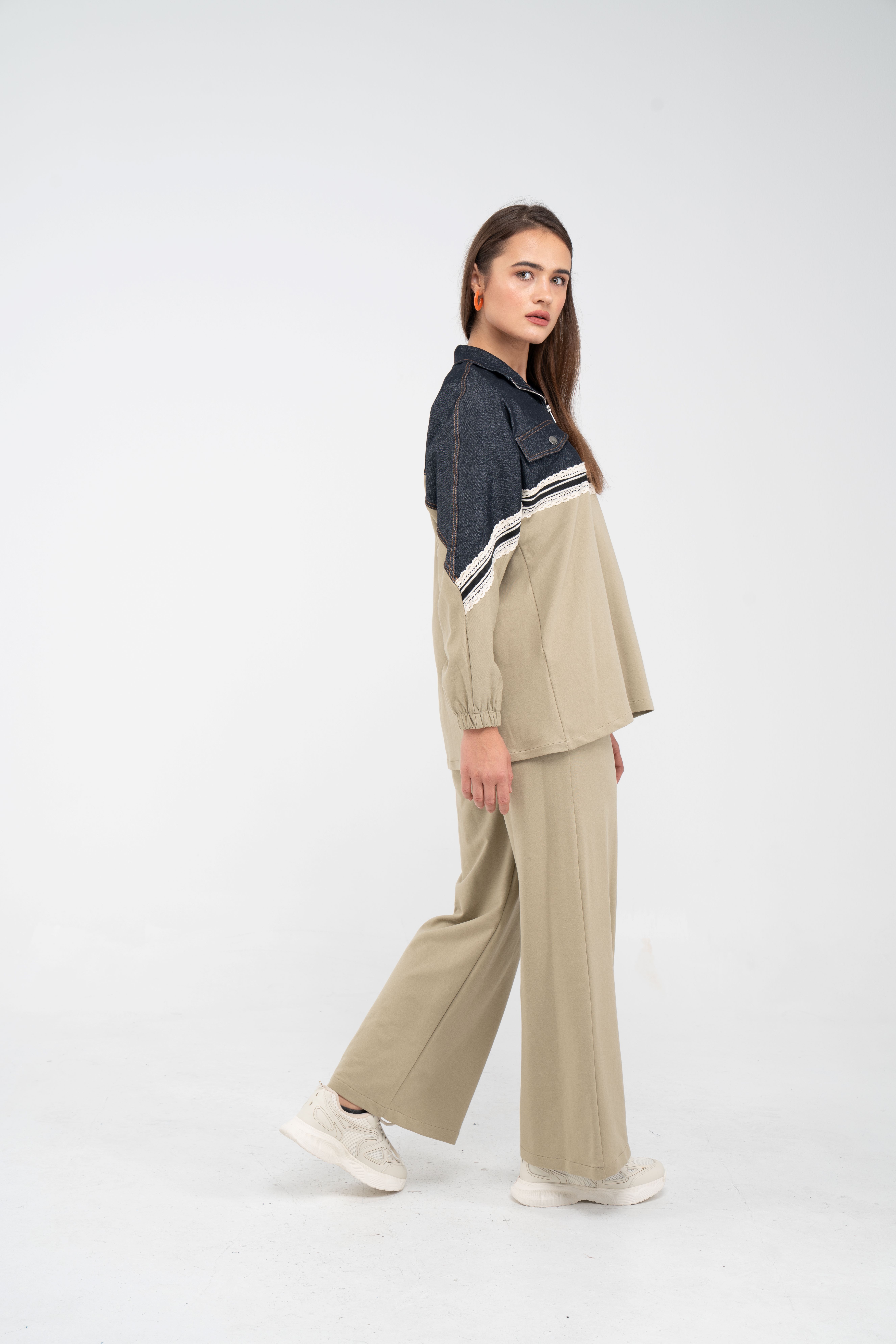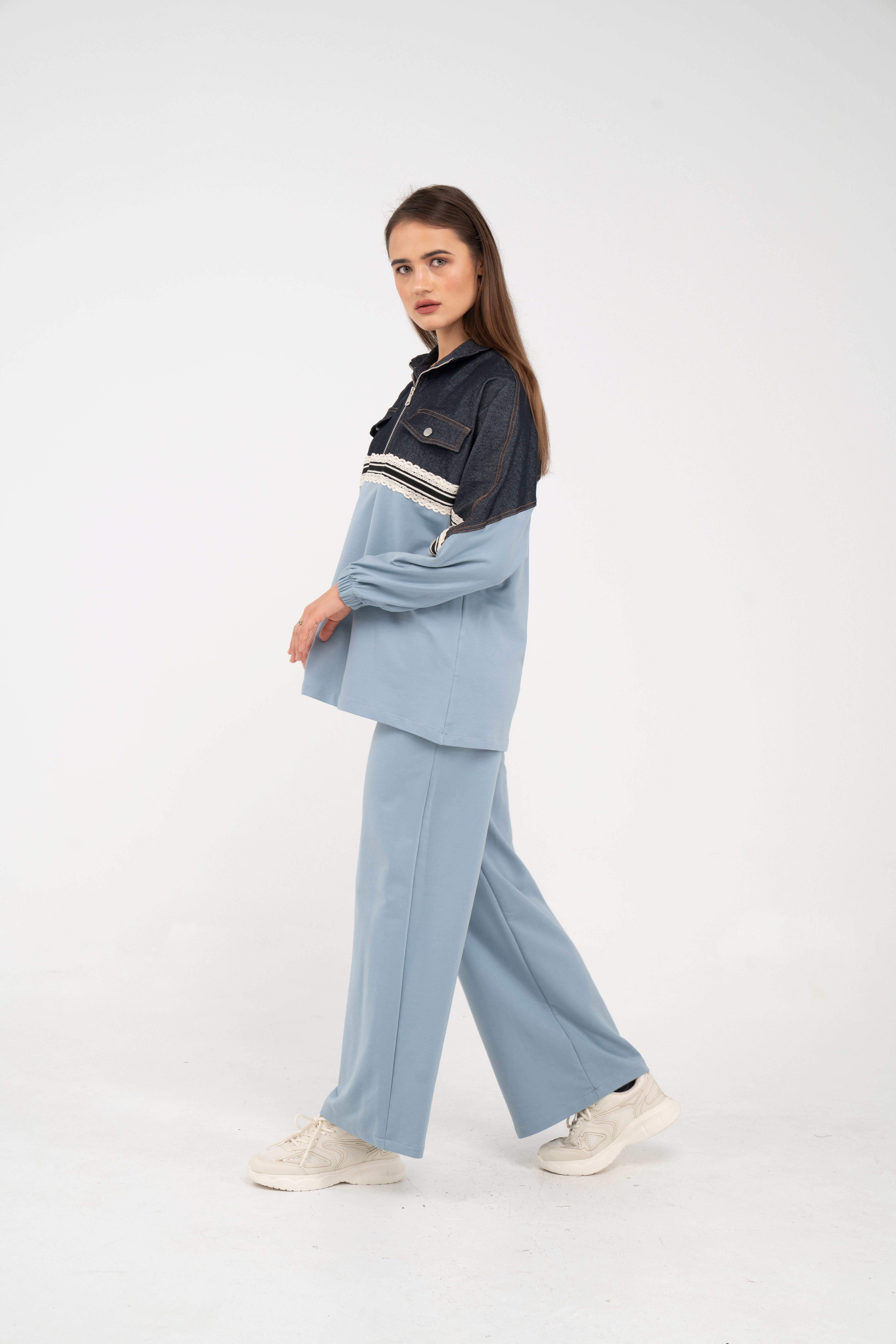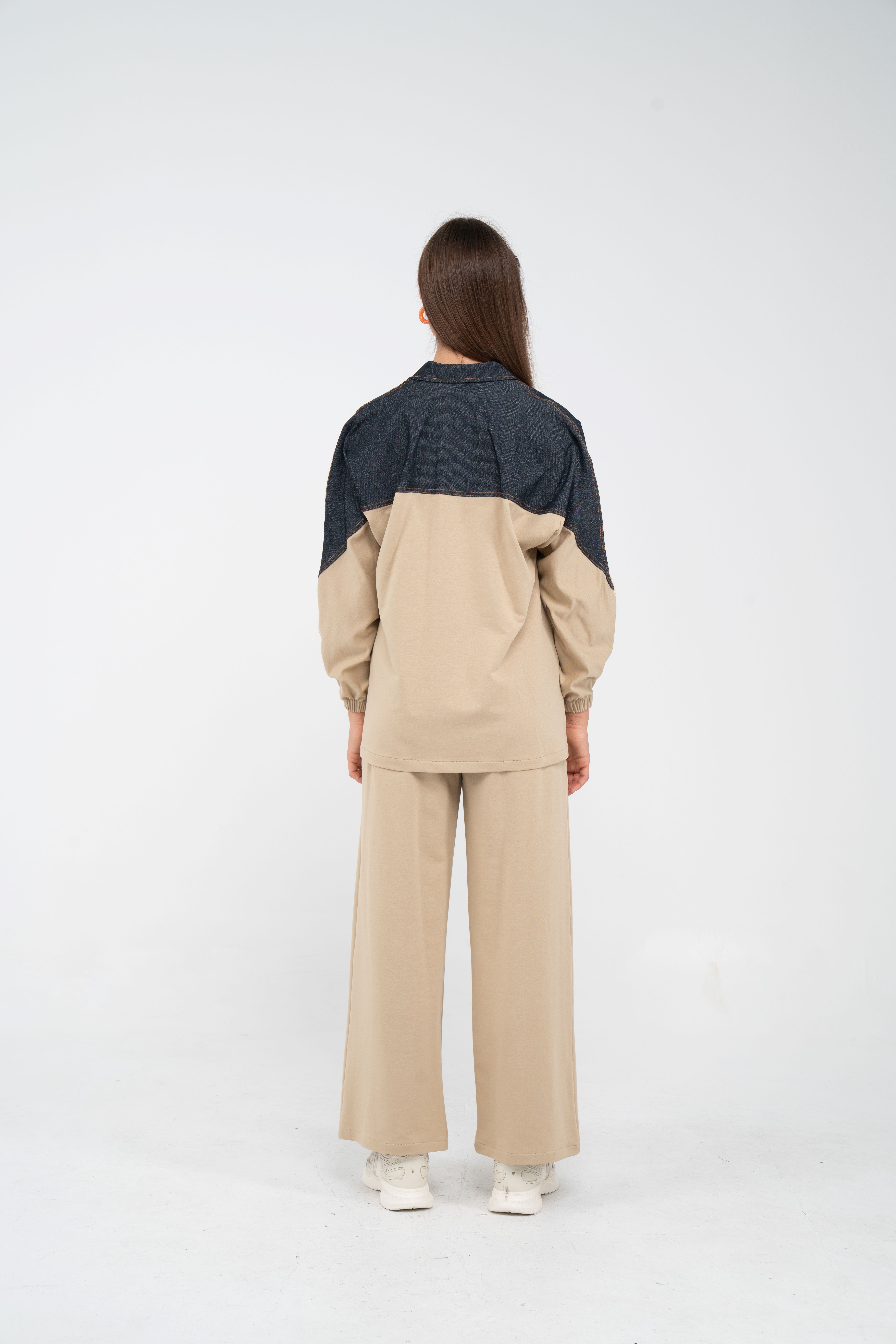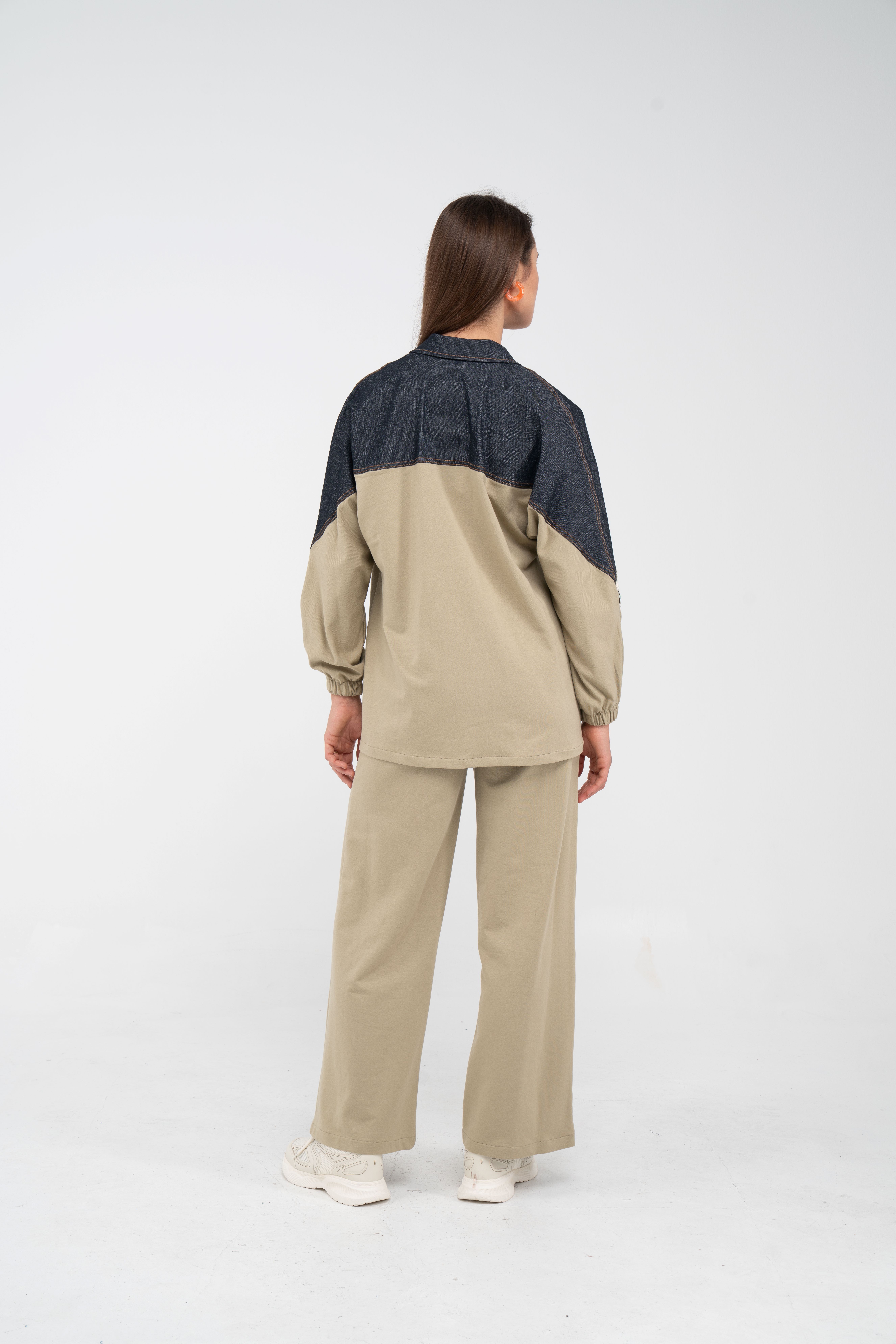 Yarım fermuarlı oversize üst, modern bir duruş sağlarken; bol paça pantolon gün boyu rahat hareket etmeni sağlar.