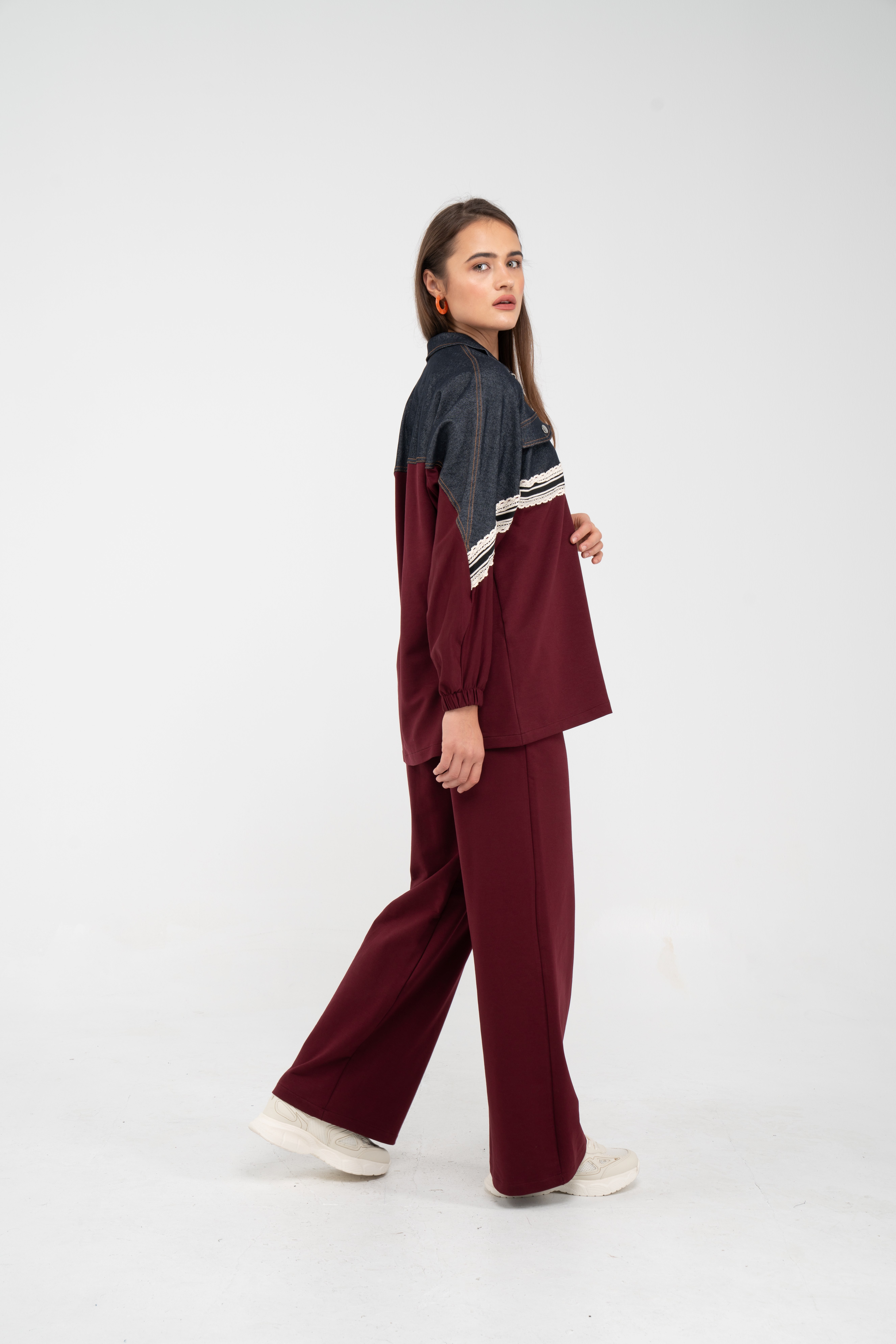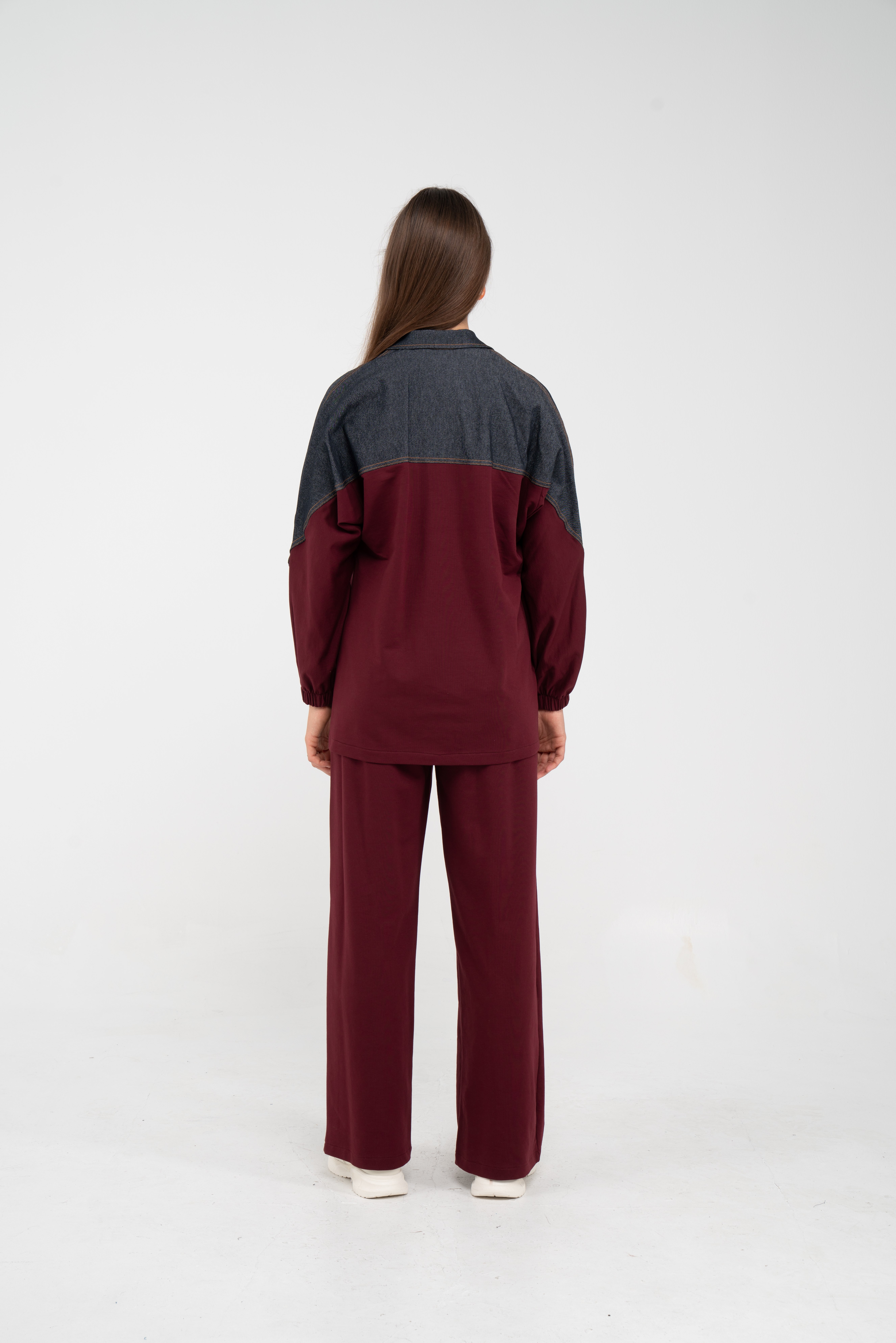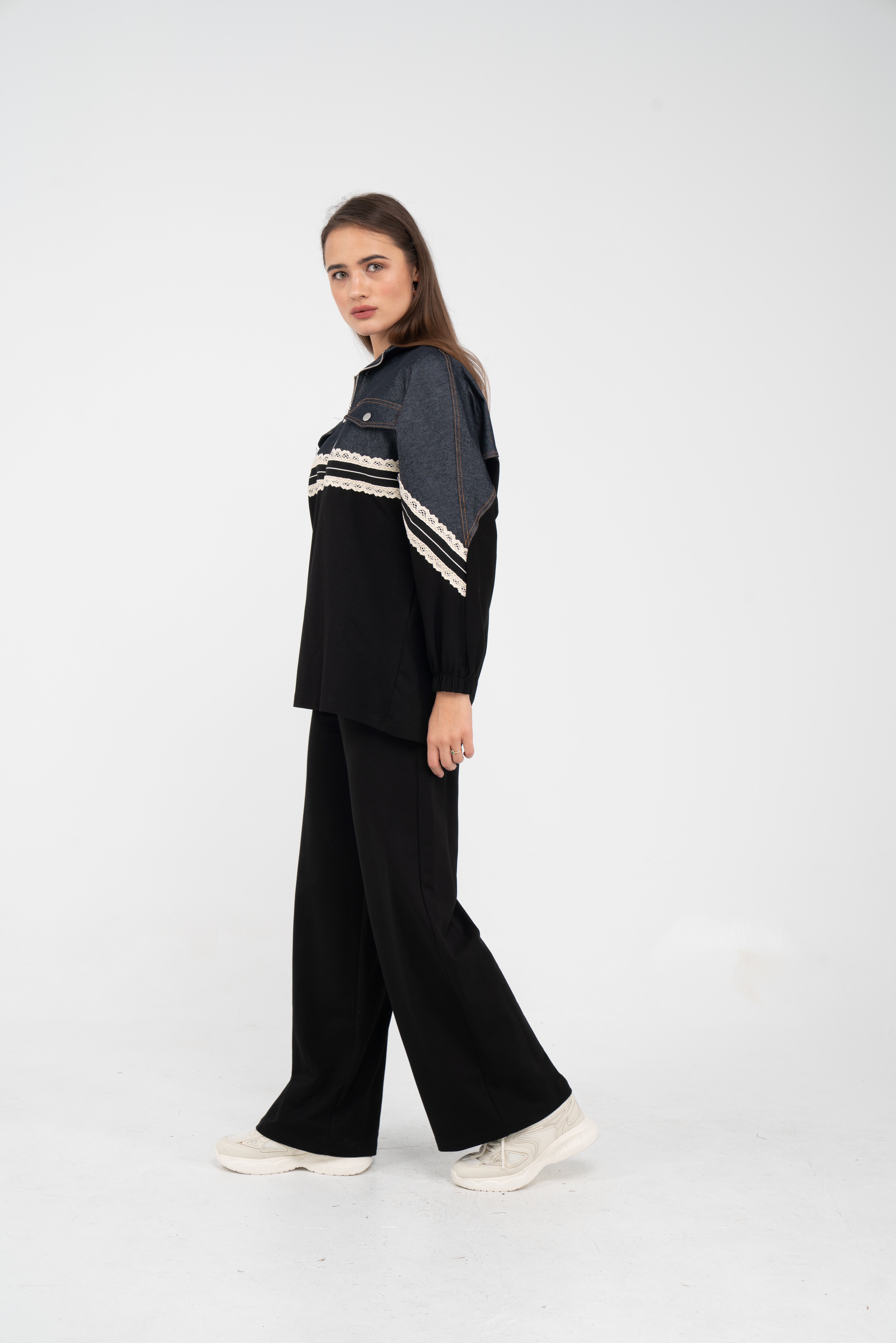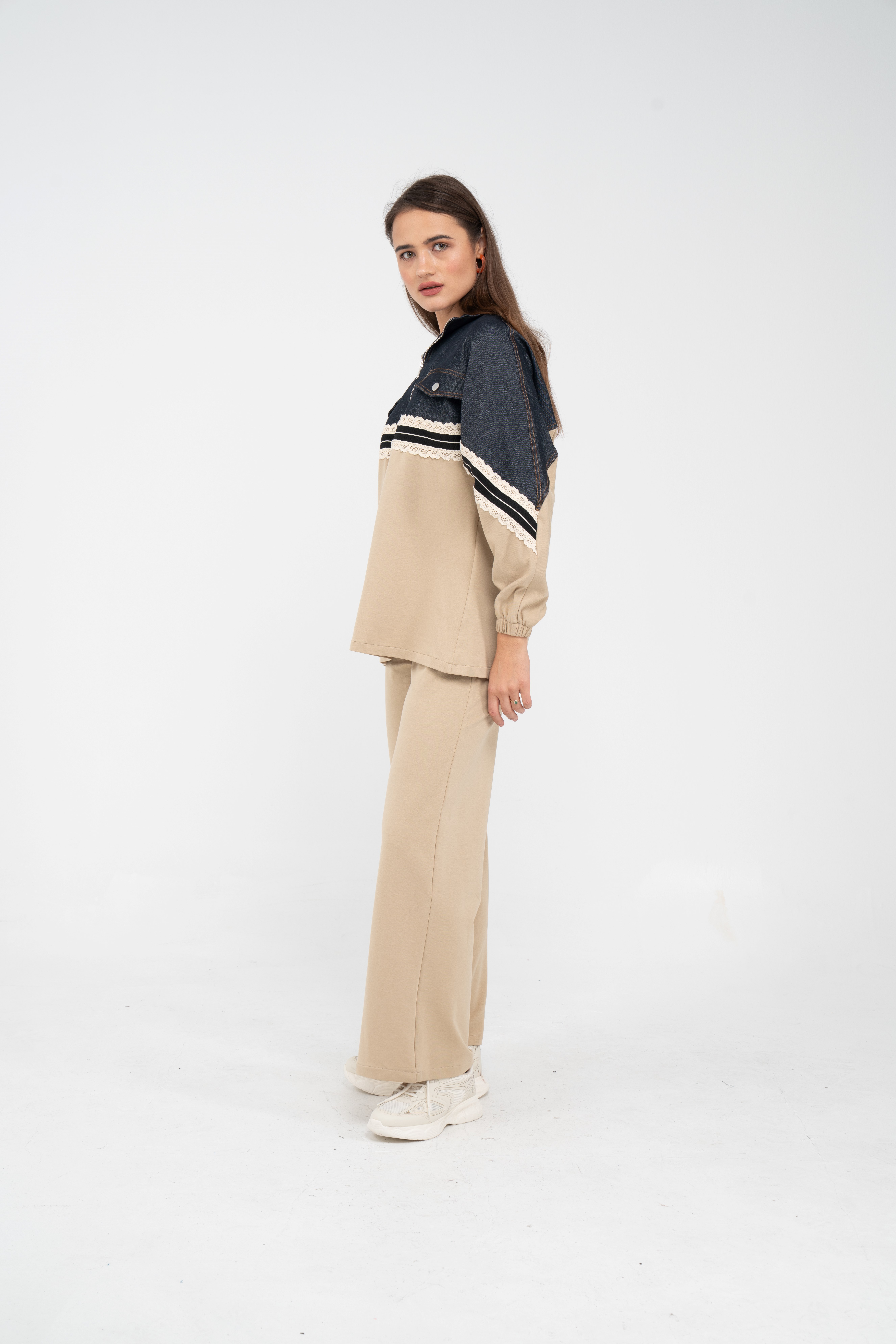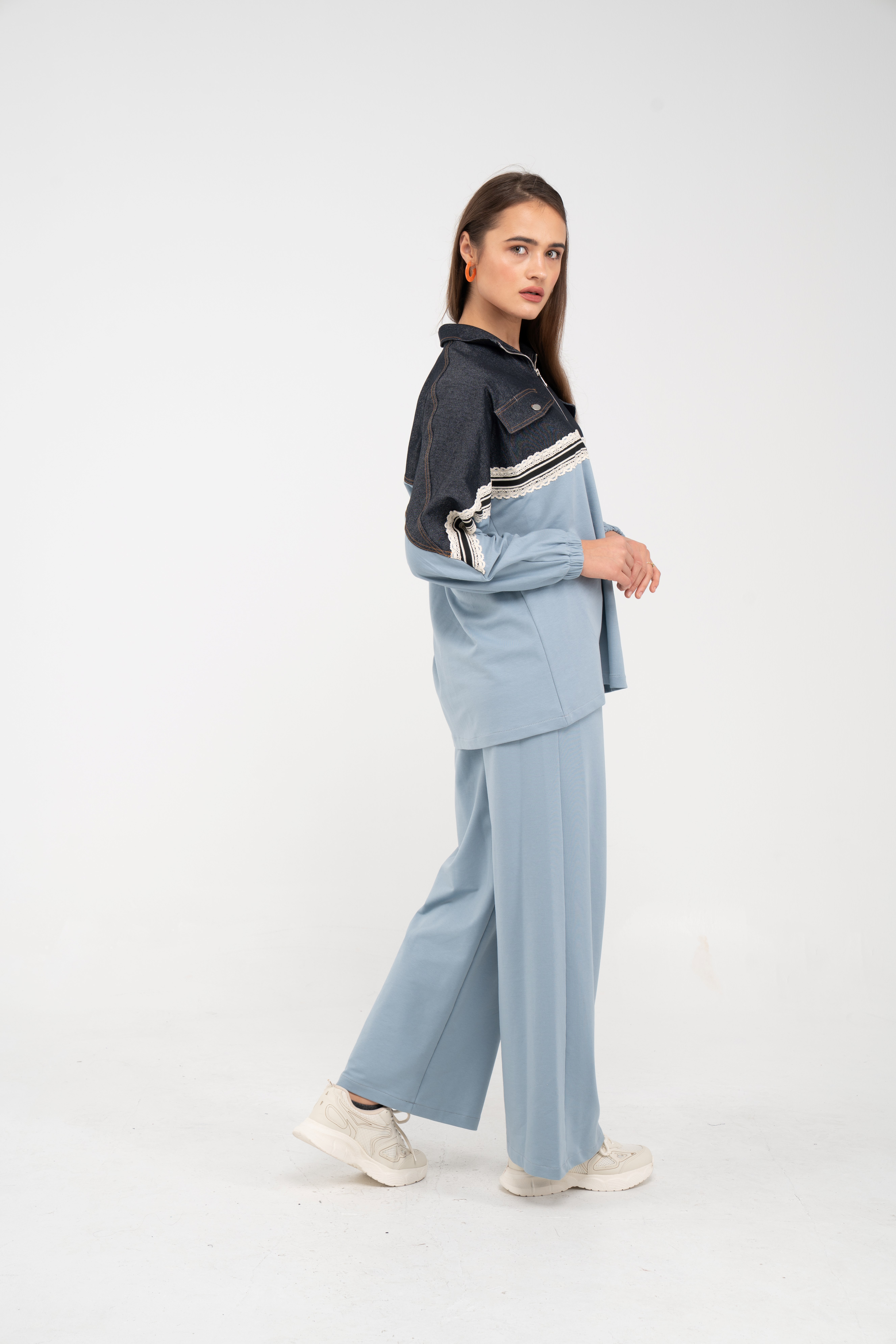 Yarım fermuarlı oversize üst, modern bir duruş sağlarken; bol paça pantolon gün boyu rahat hareket etmeni sağlar.