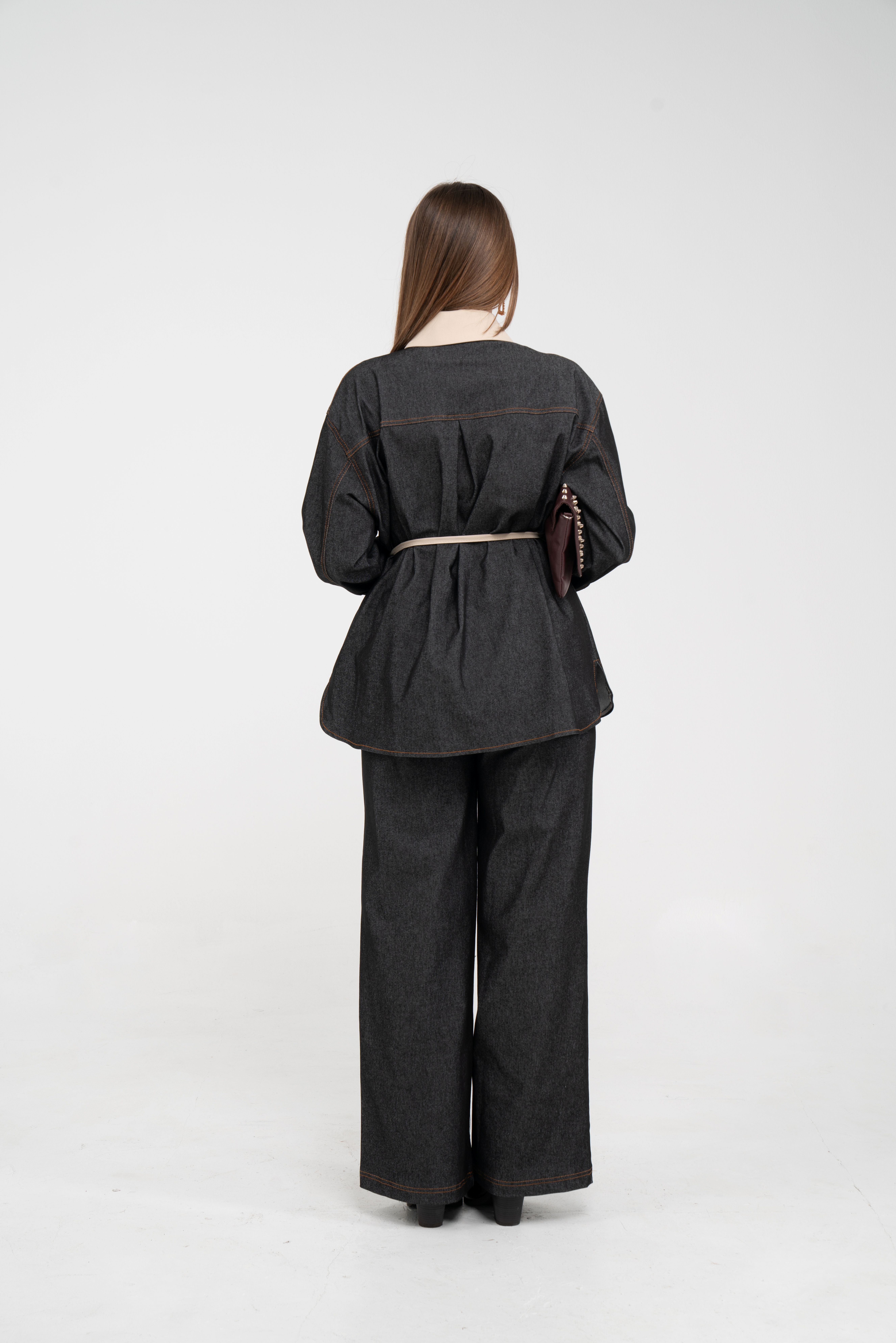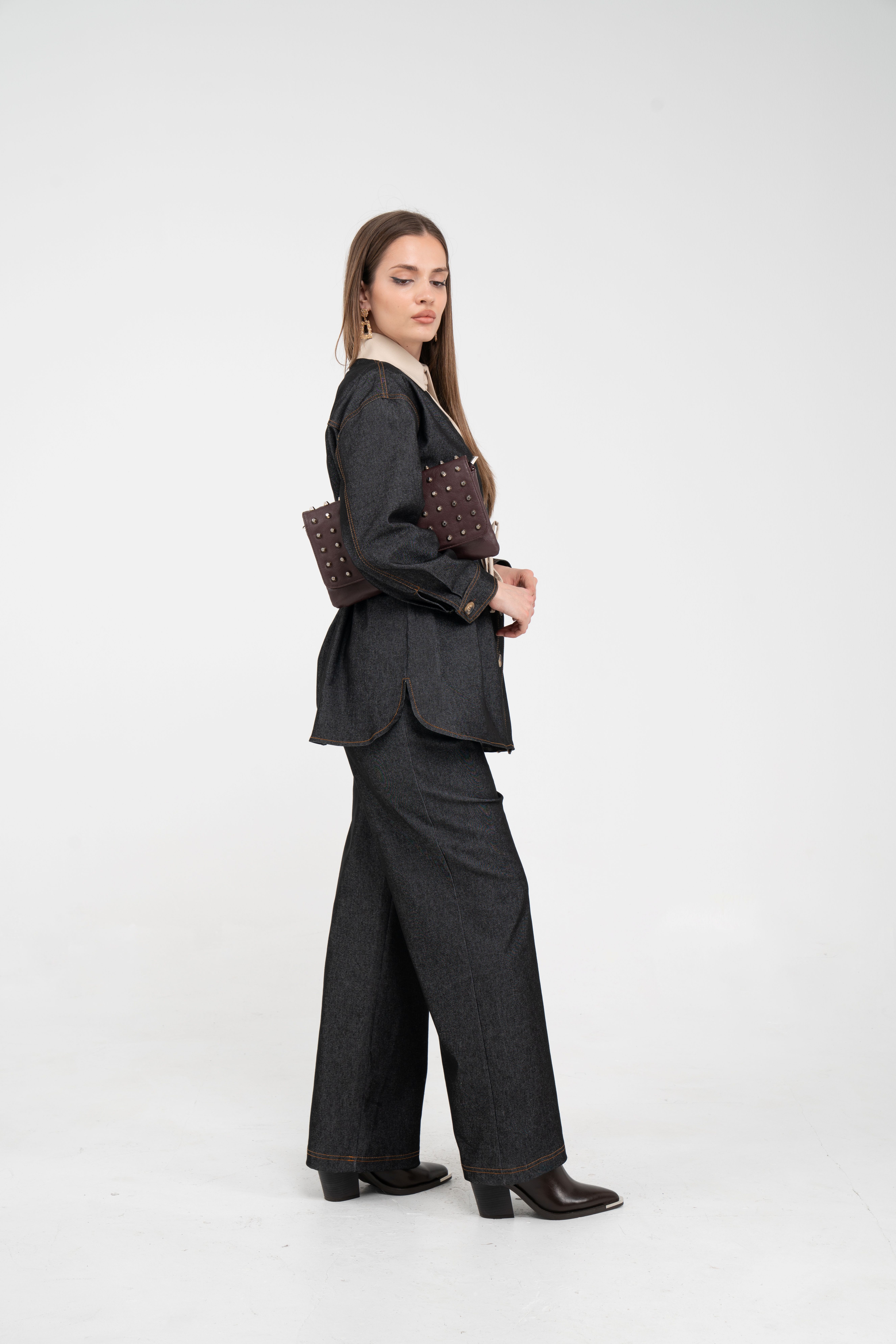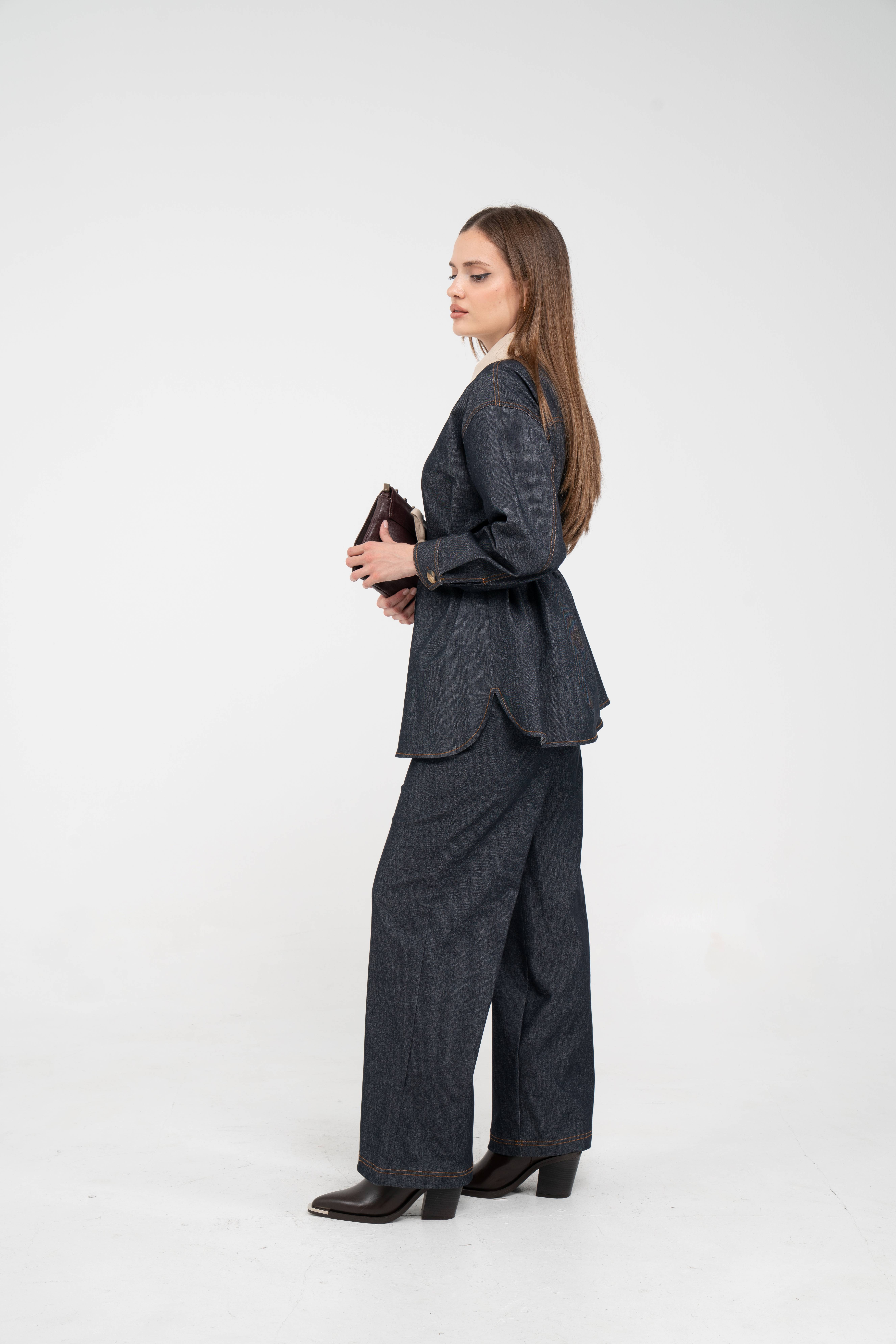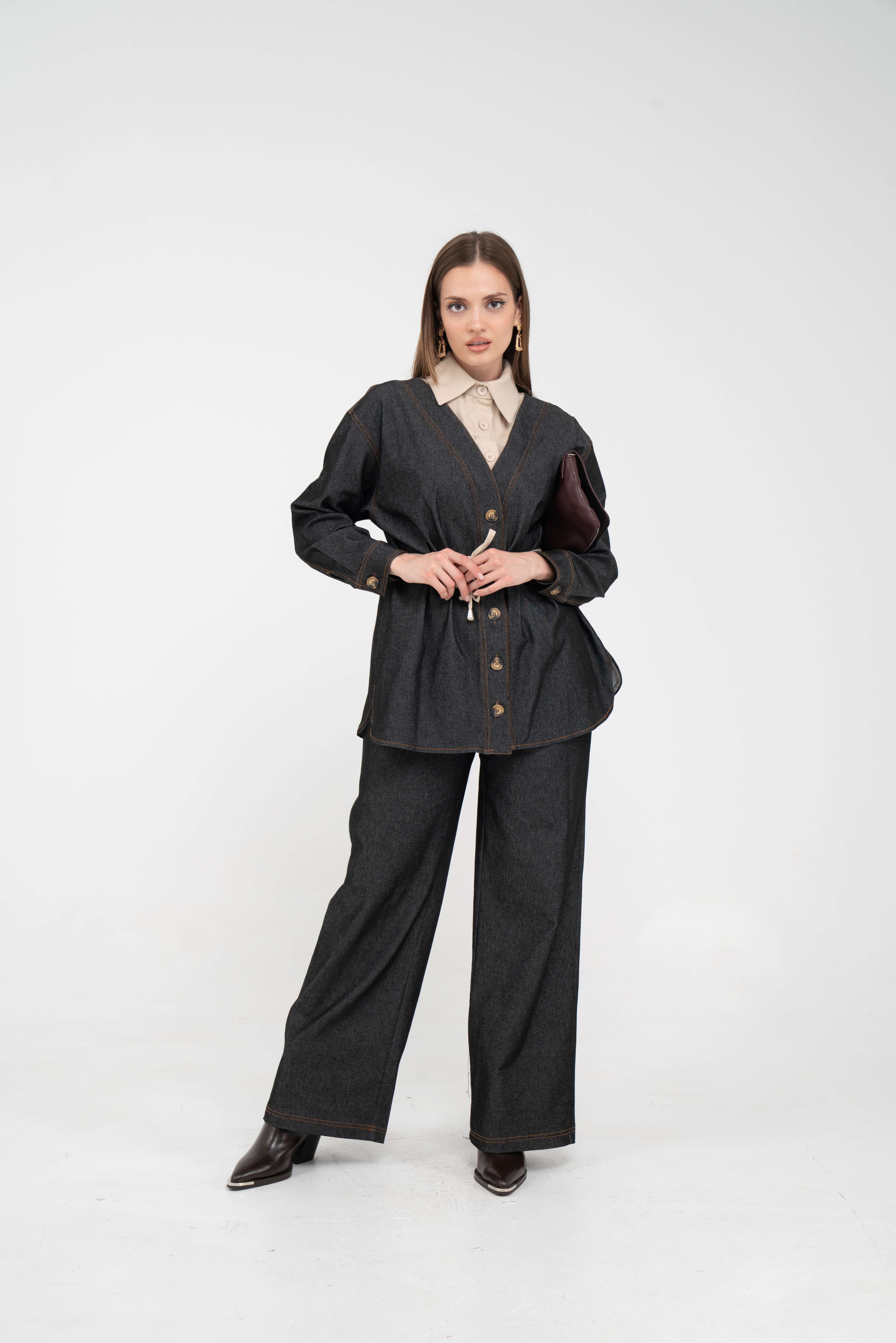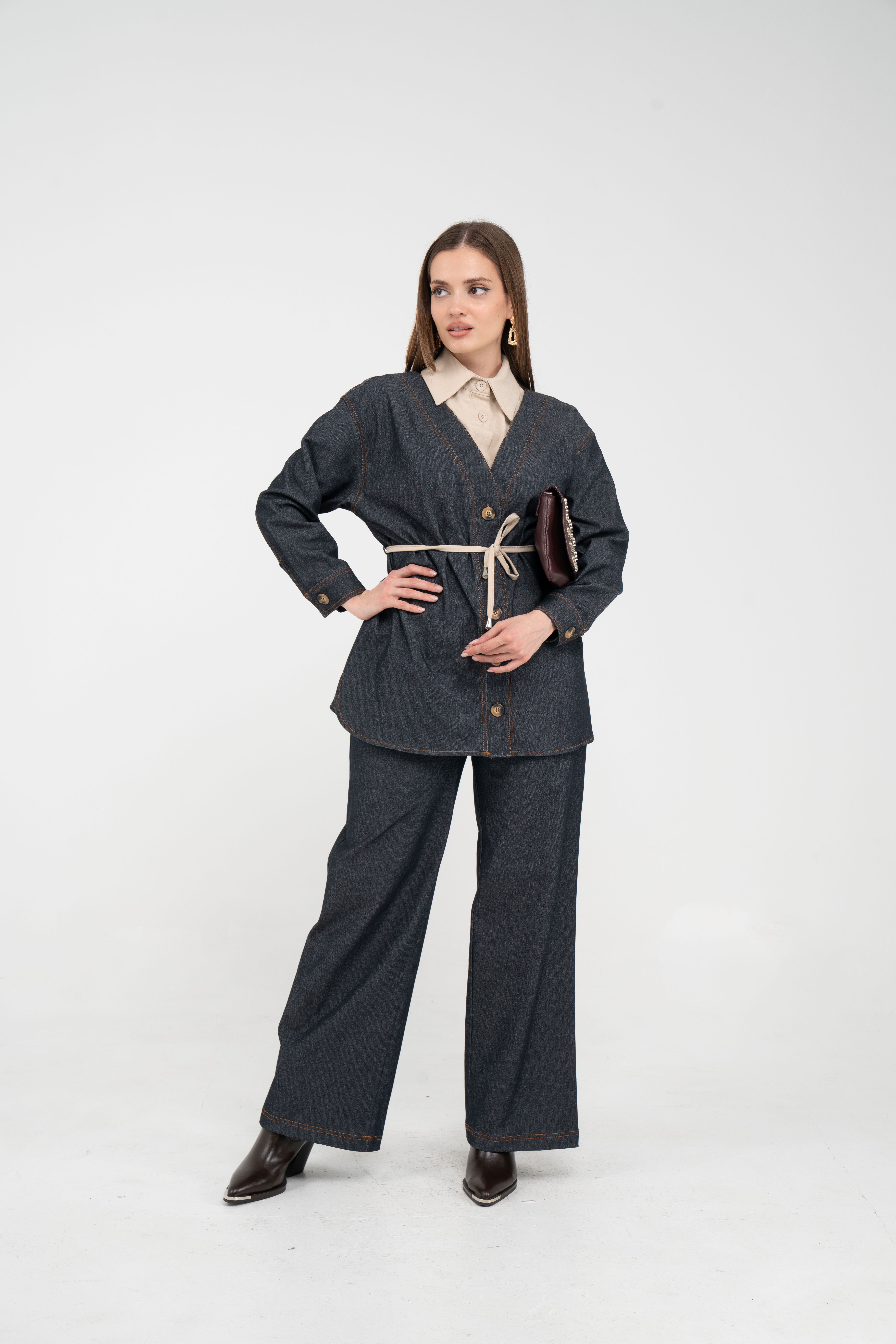 Alt parça geniş paça pantolonu sayesinde hem konforlu hem de modern bir stil sunar. Topuklu botlar, minimal çantalar ve sade aksesuarlarla kombinlendiğinde güçlü ve sofistike bir görünüm elde edilir.