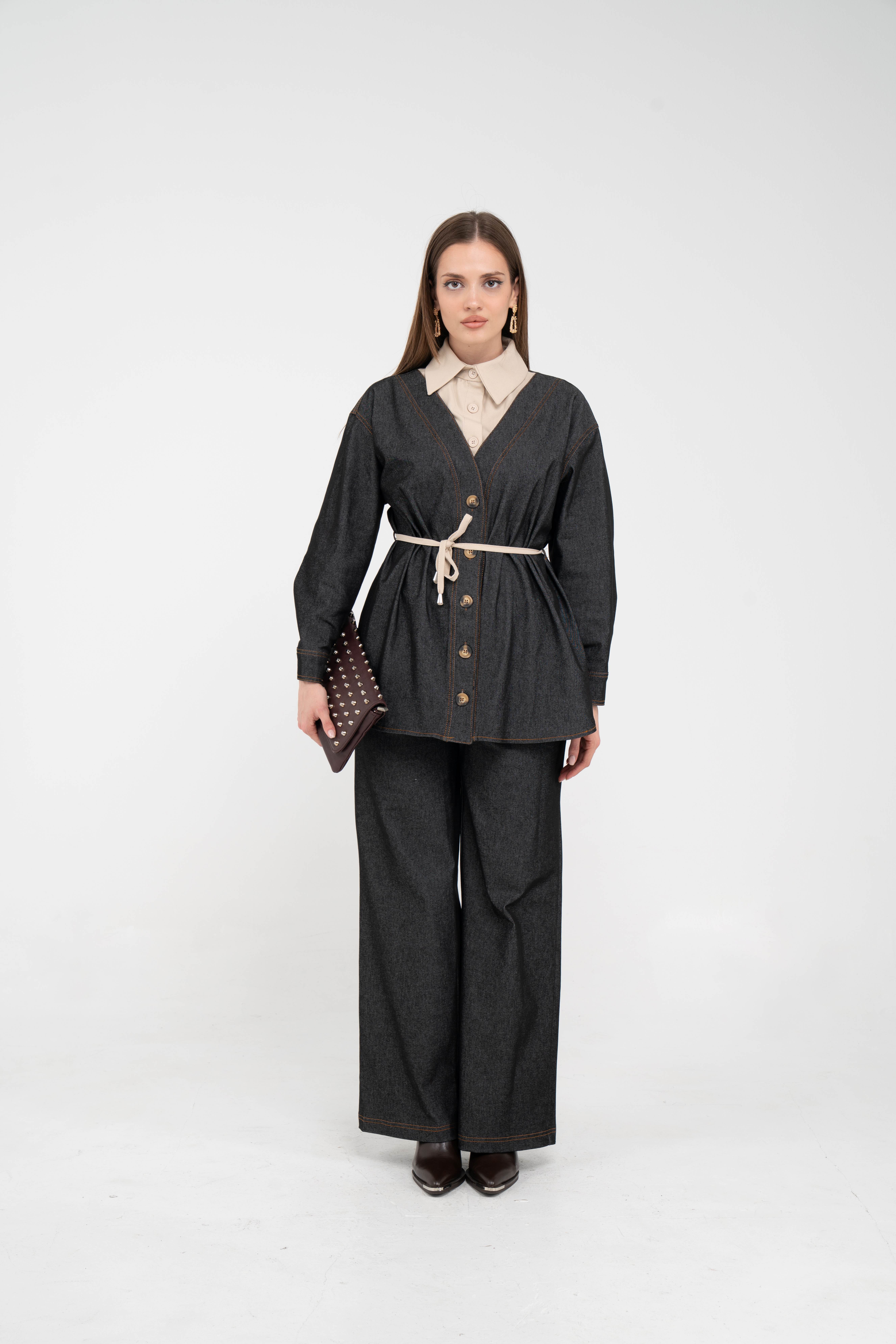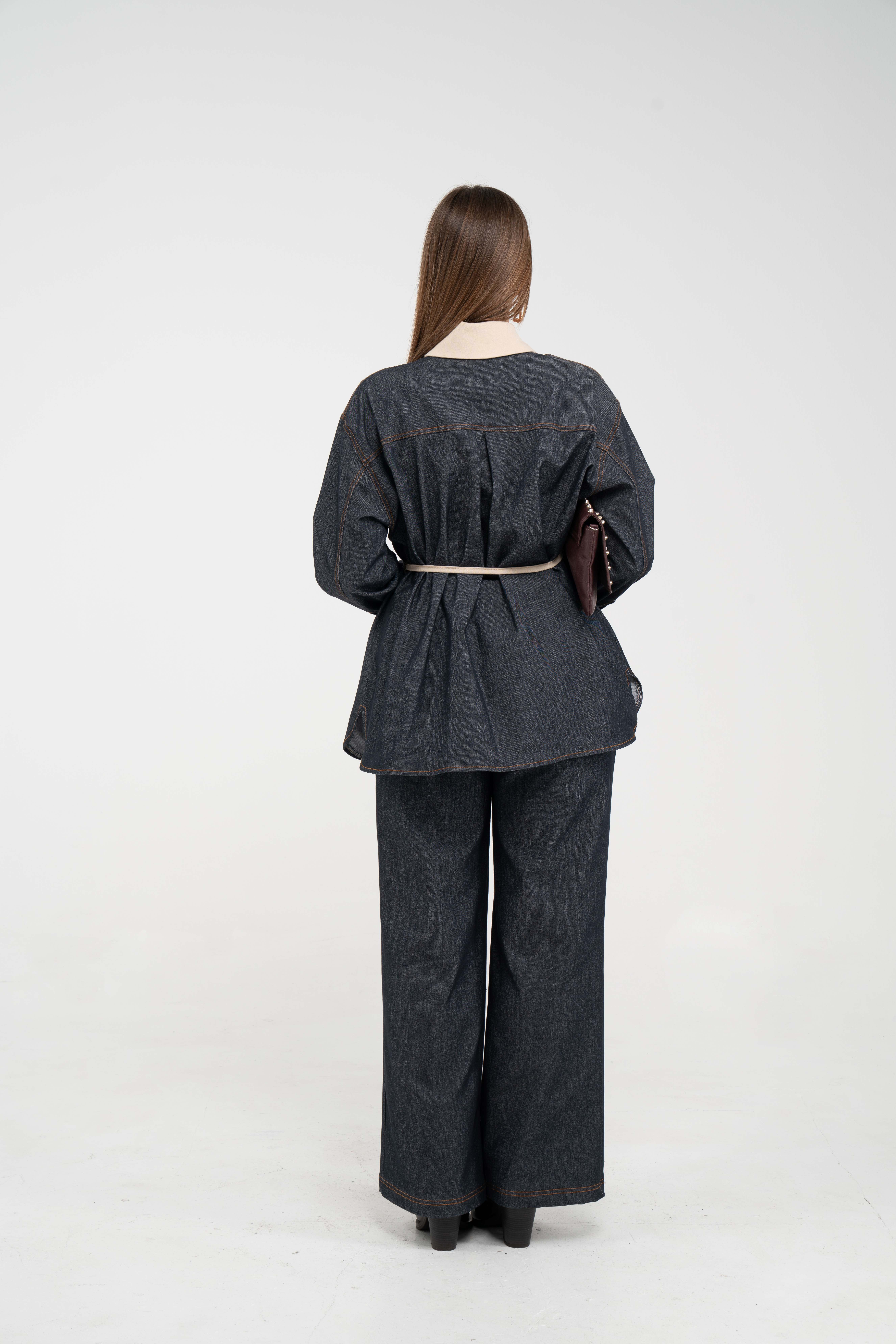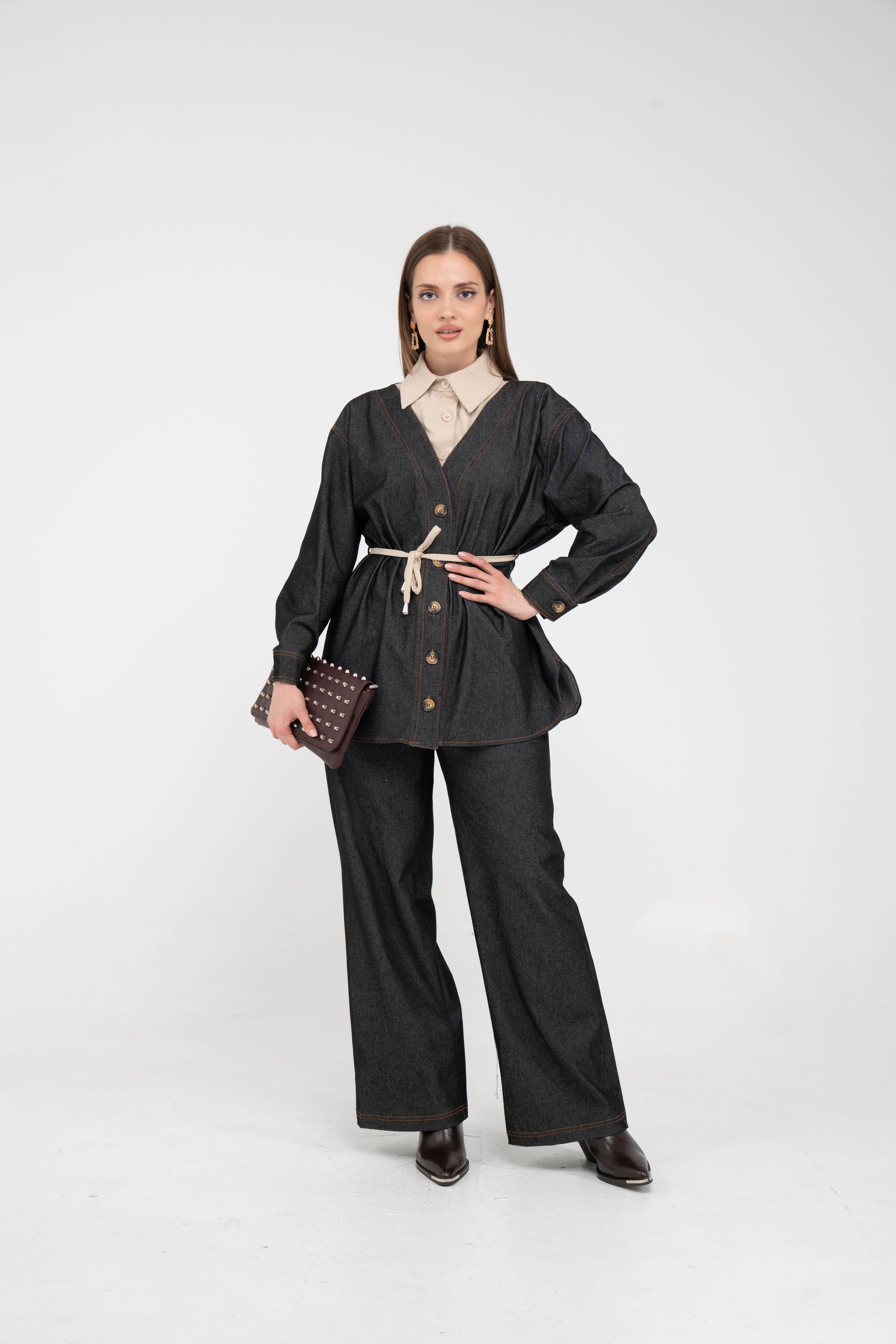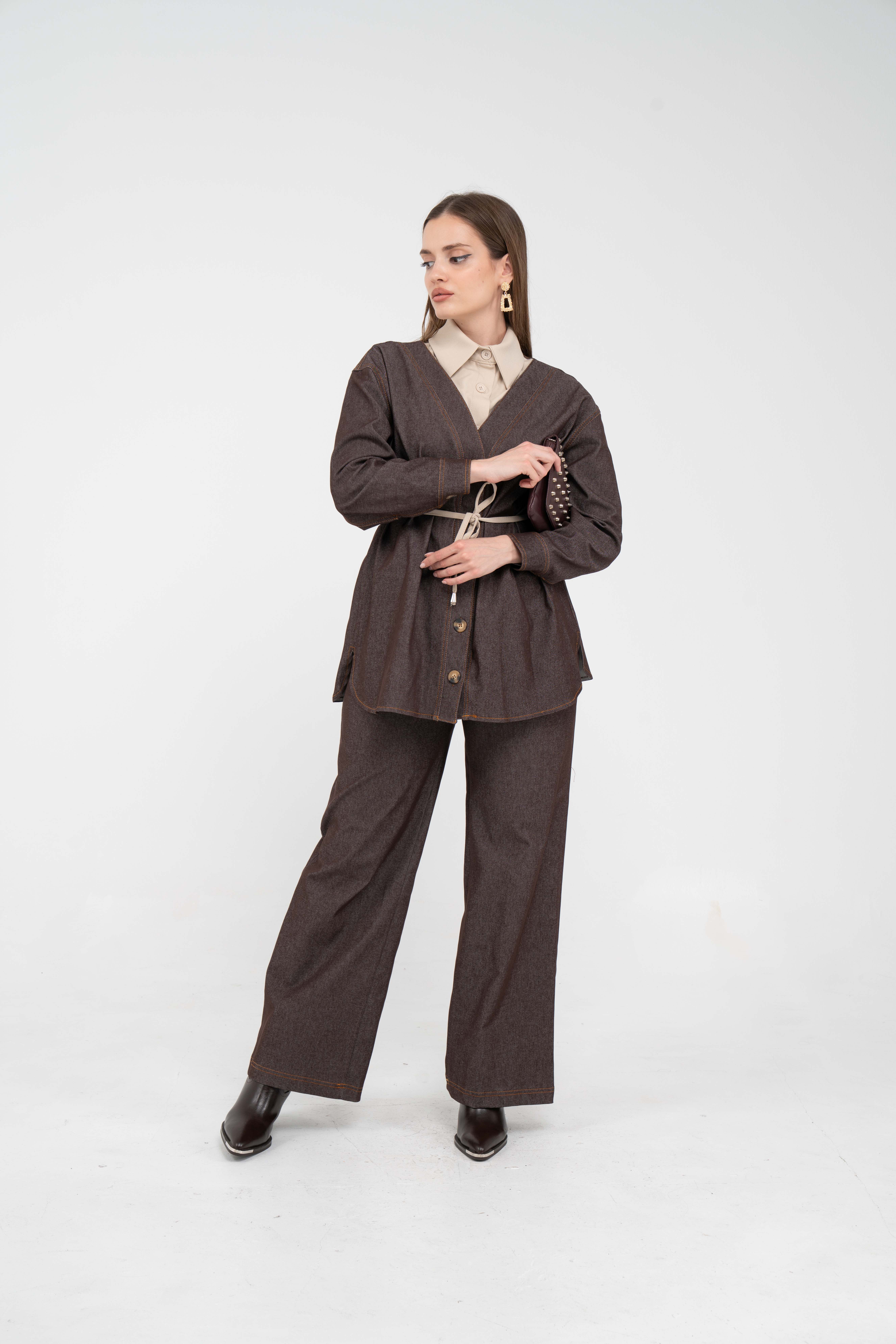 Alt parça geniş paça pantolonu sayesinde hem konforlu hem de modern bir stil sunar. Topuklu botlar, minimal çantalar ve sade aksesuarlarla kombinlendiğinde güçlü ve sofistike bir görünüm elde edilir.