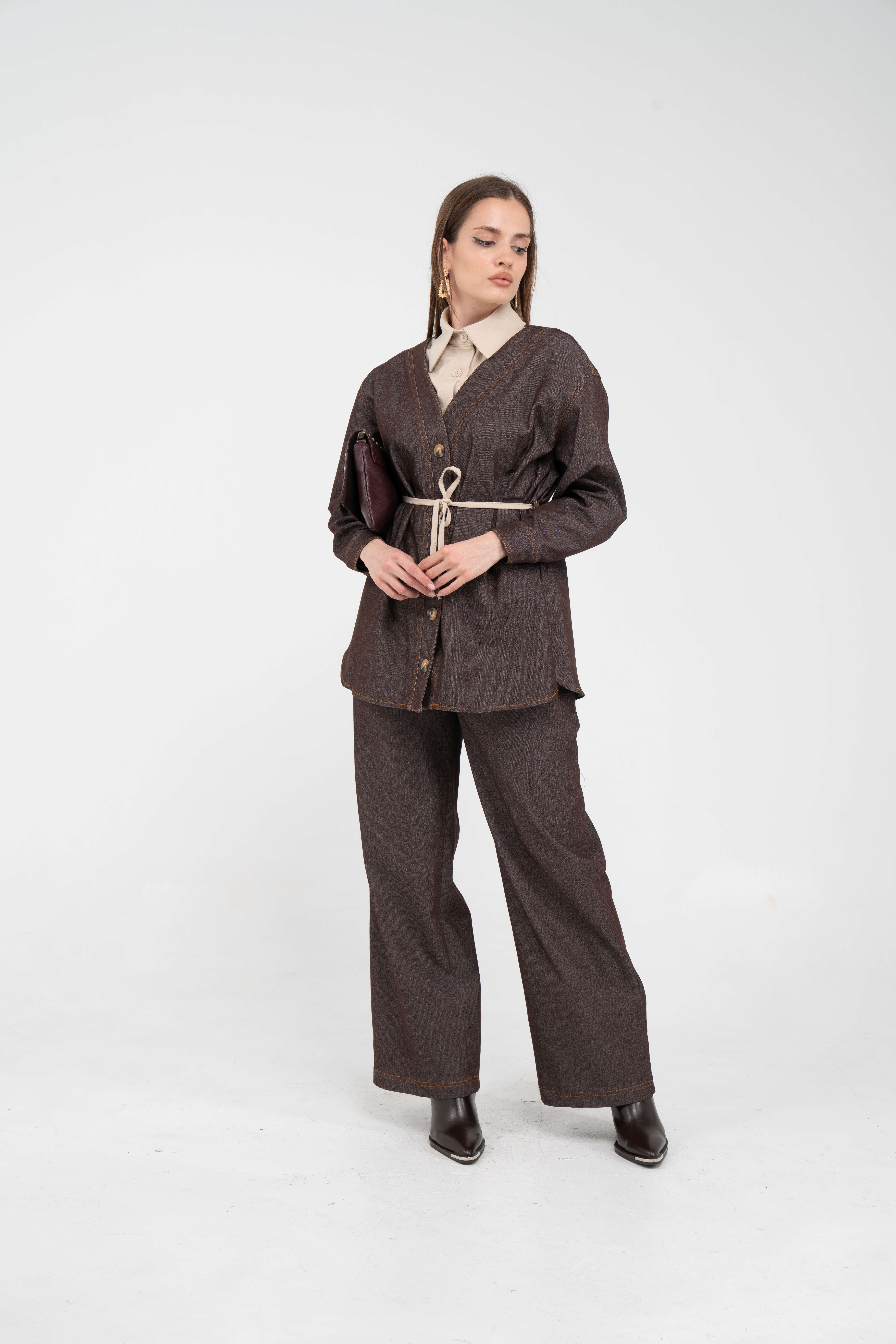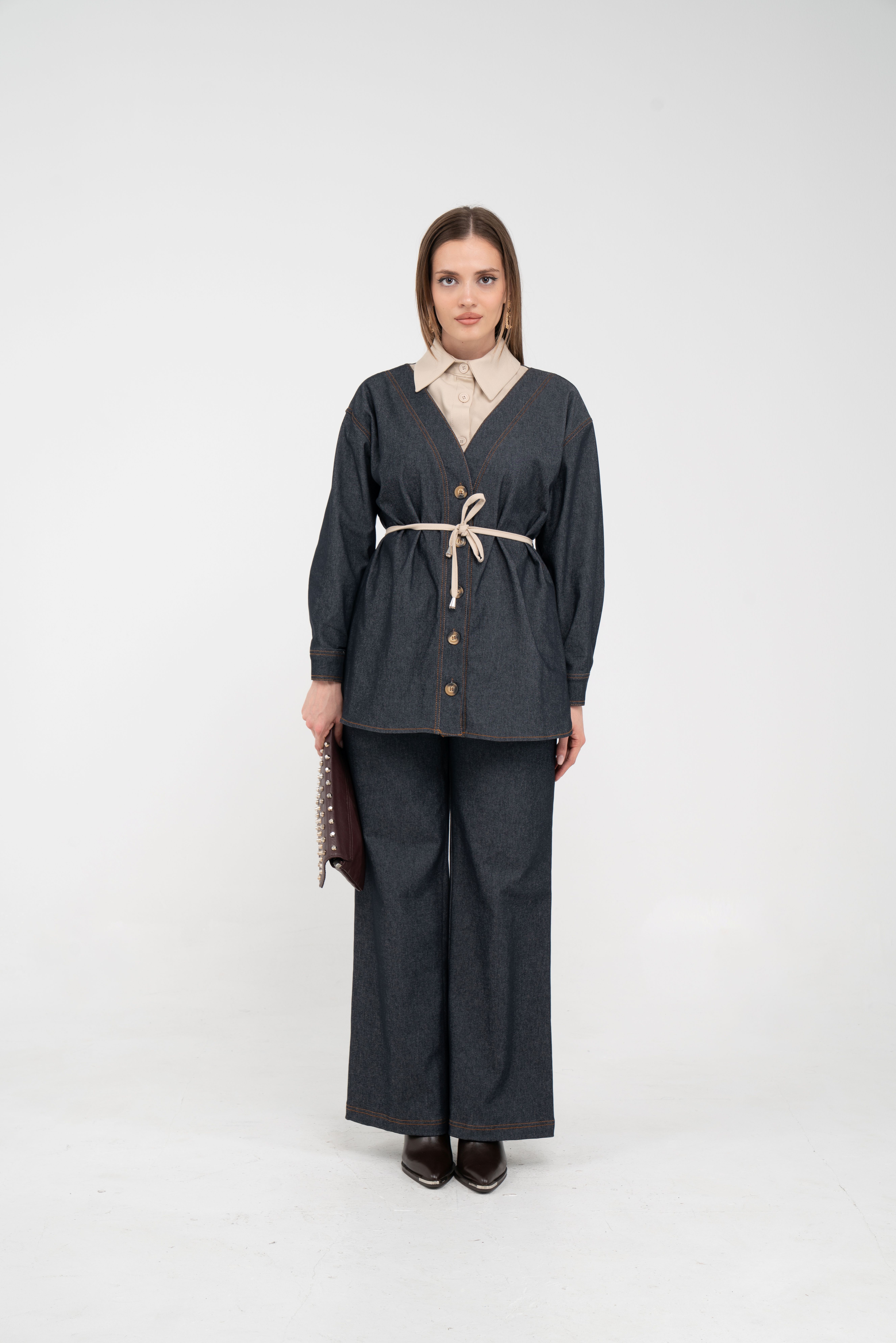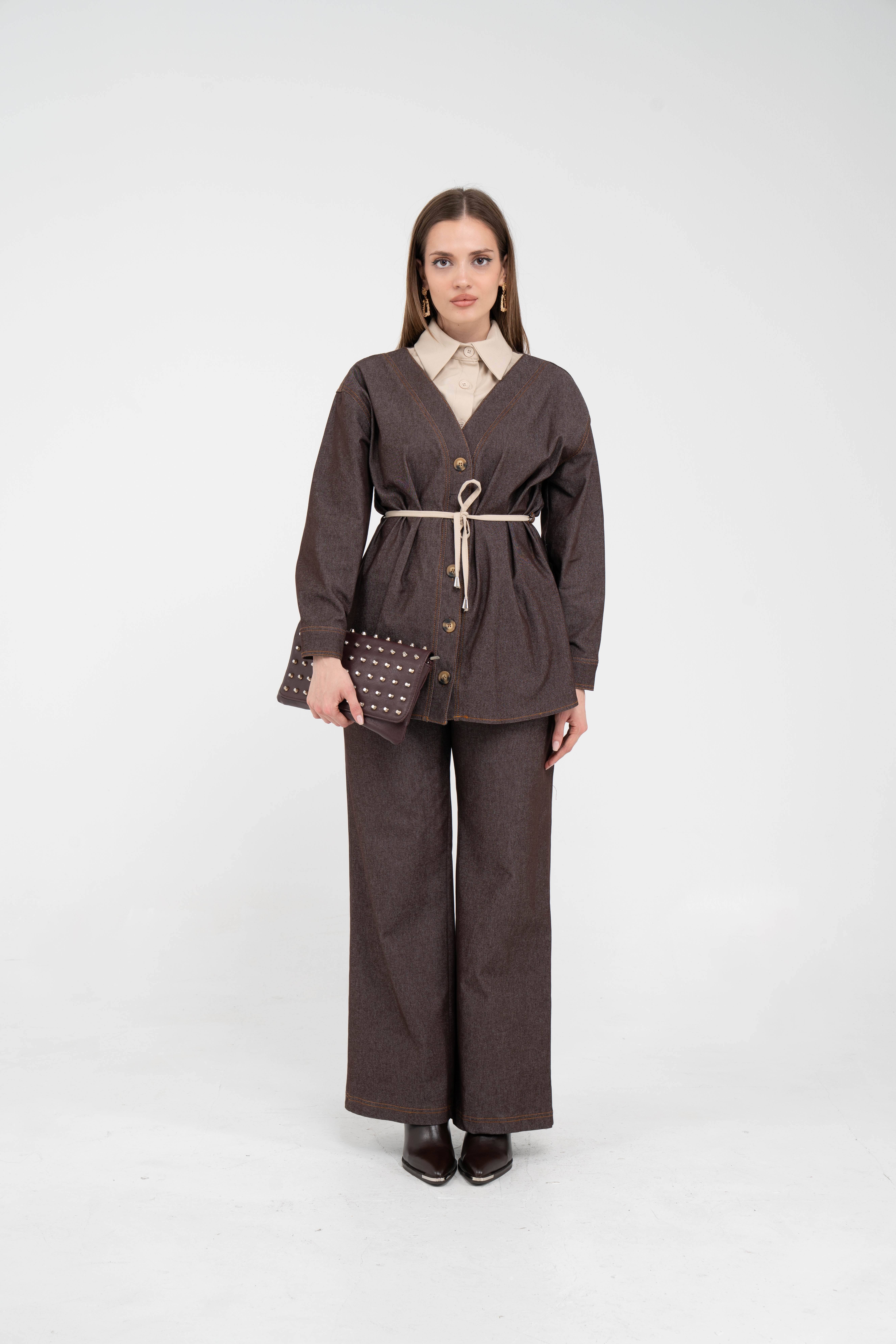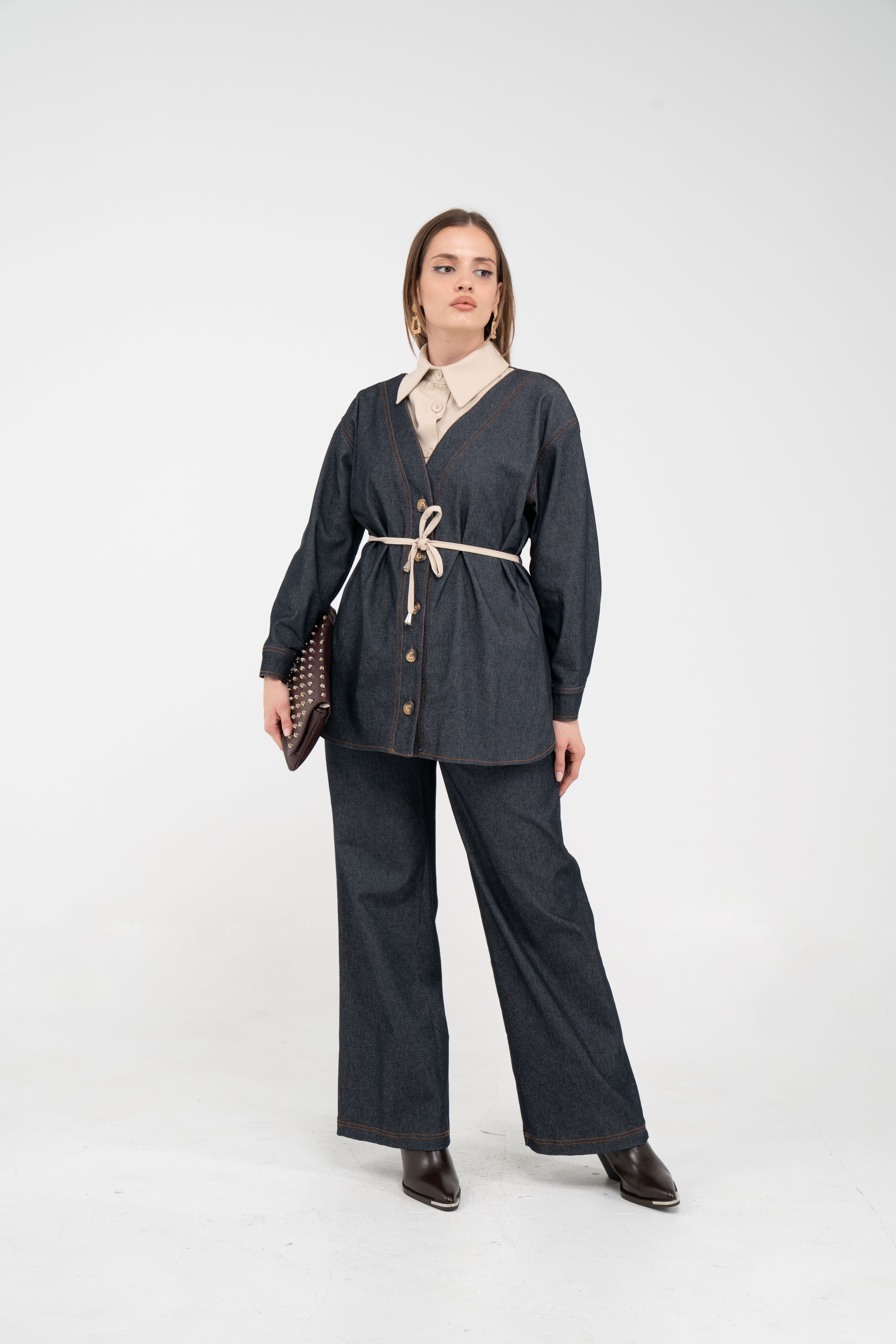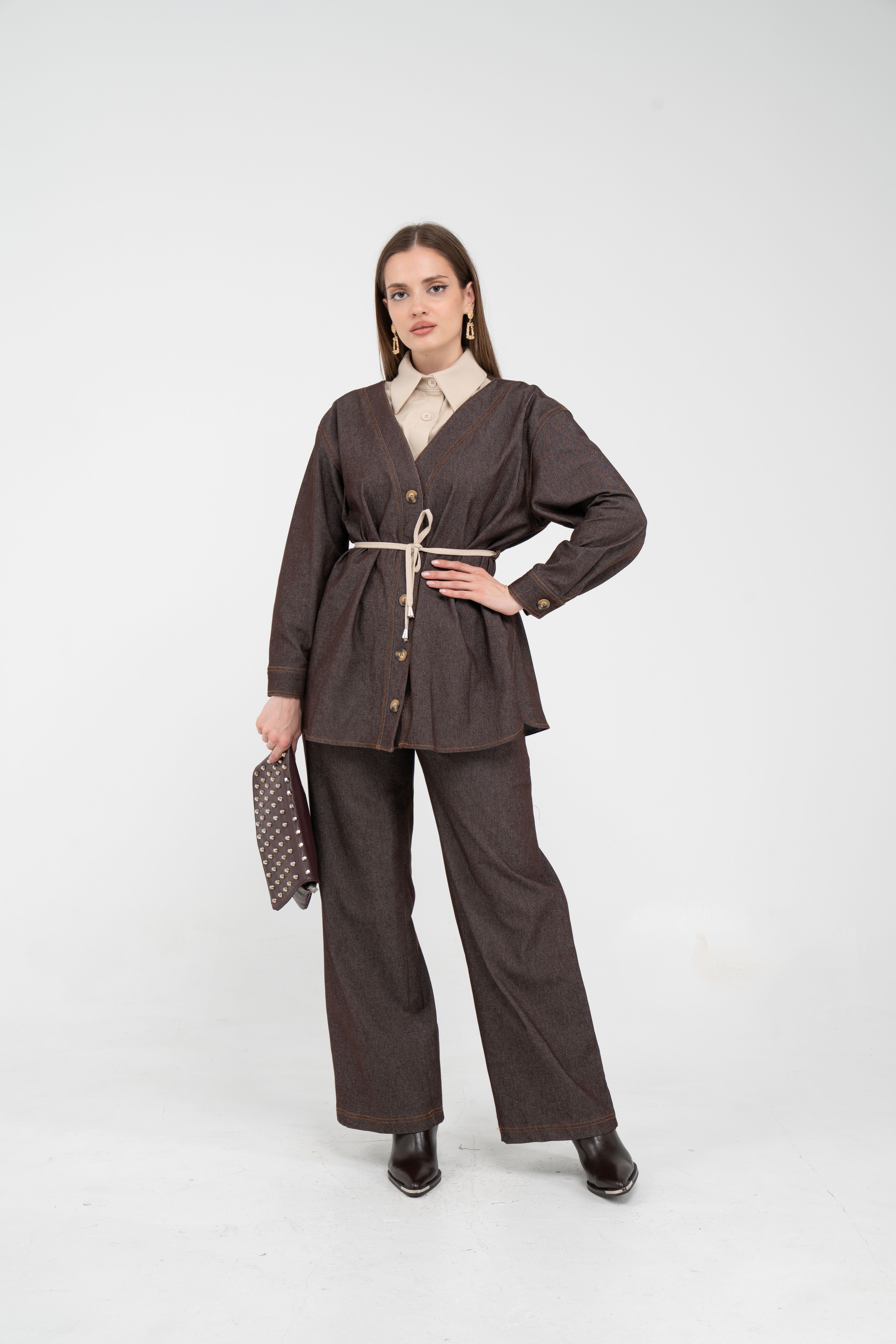 Alt parça geniş paça pantolonu sayesinde hem konforlu hem de modern bir stil sunar. Topuklu botlar, minimal çantalar ve sade aksesuarlarla kombinlendiğinde güçlü ve sofistike bir görünüm elde edilir.