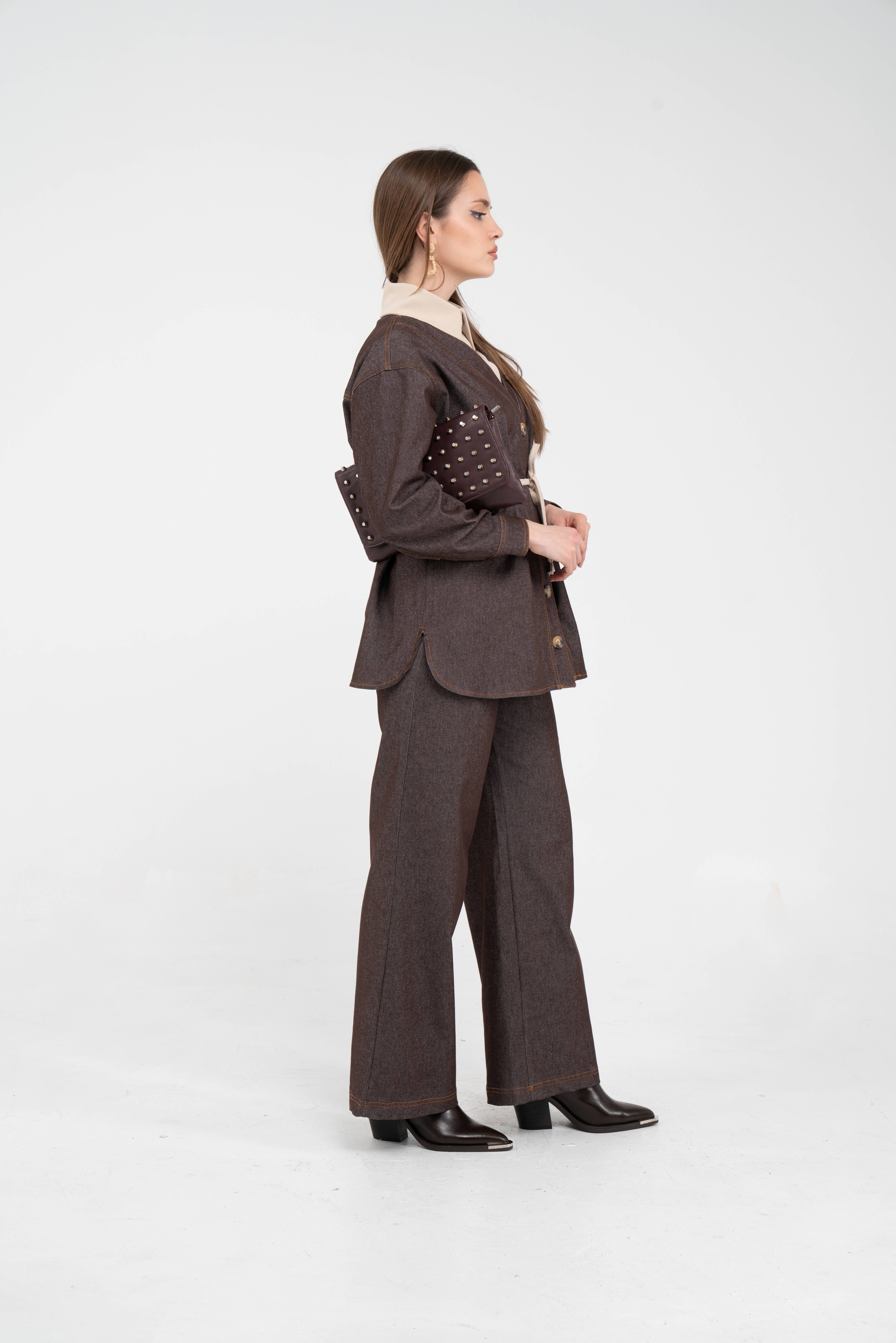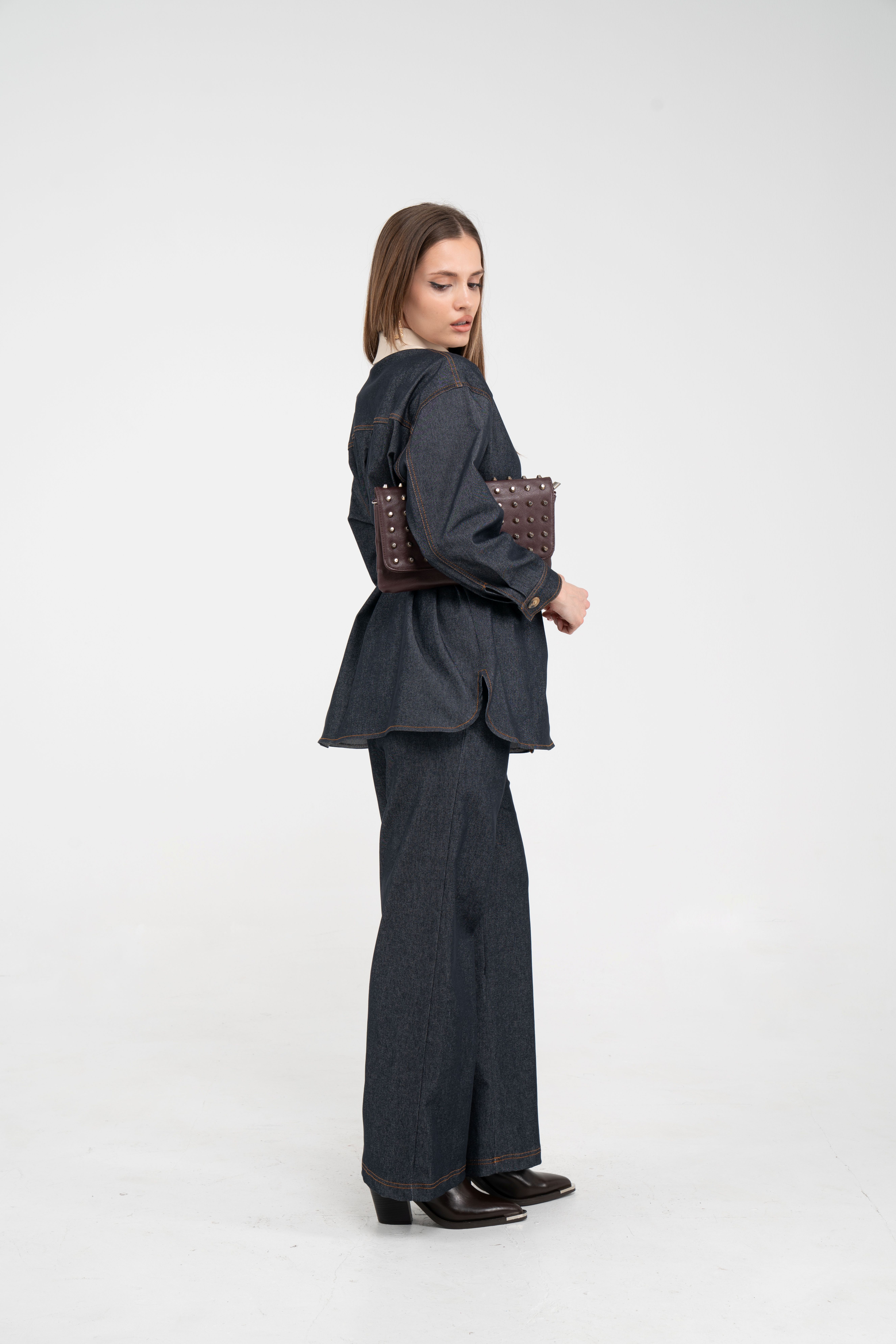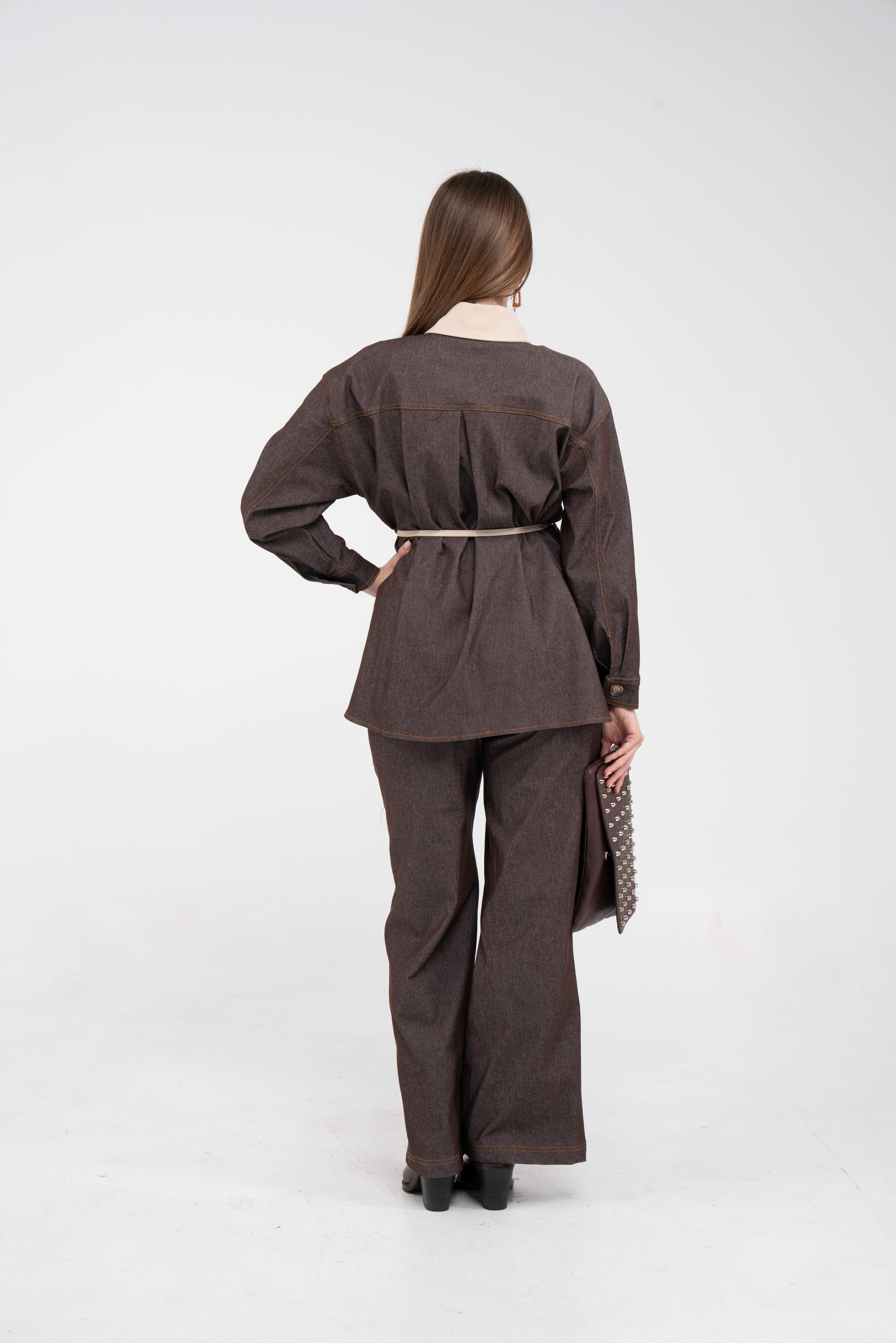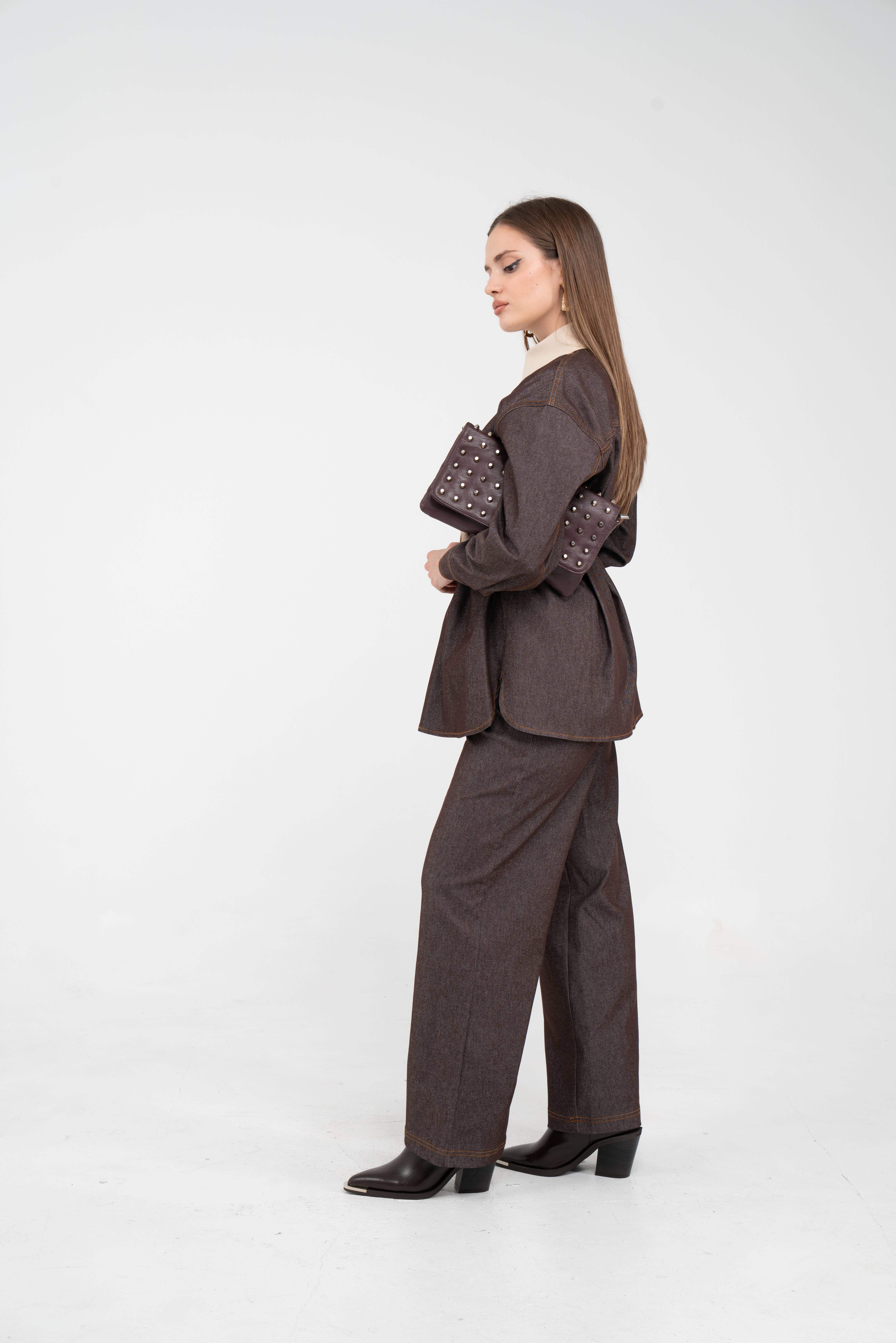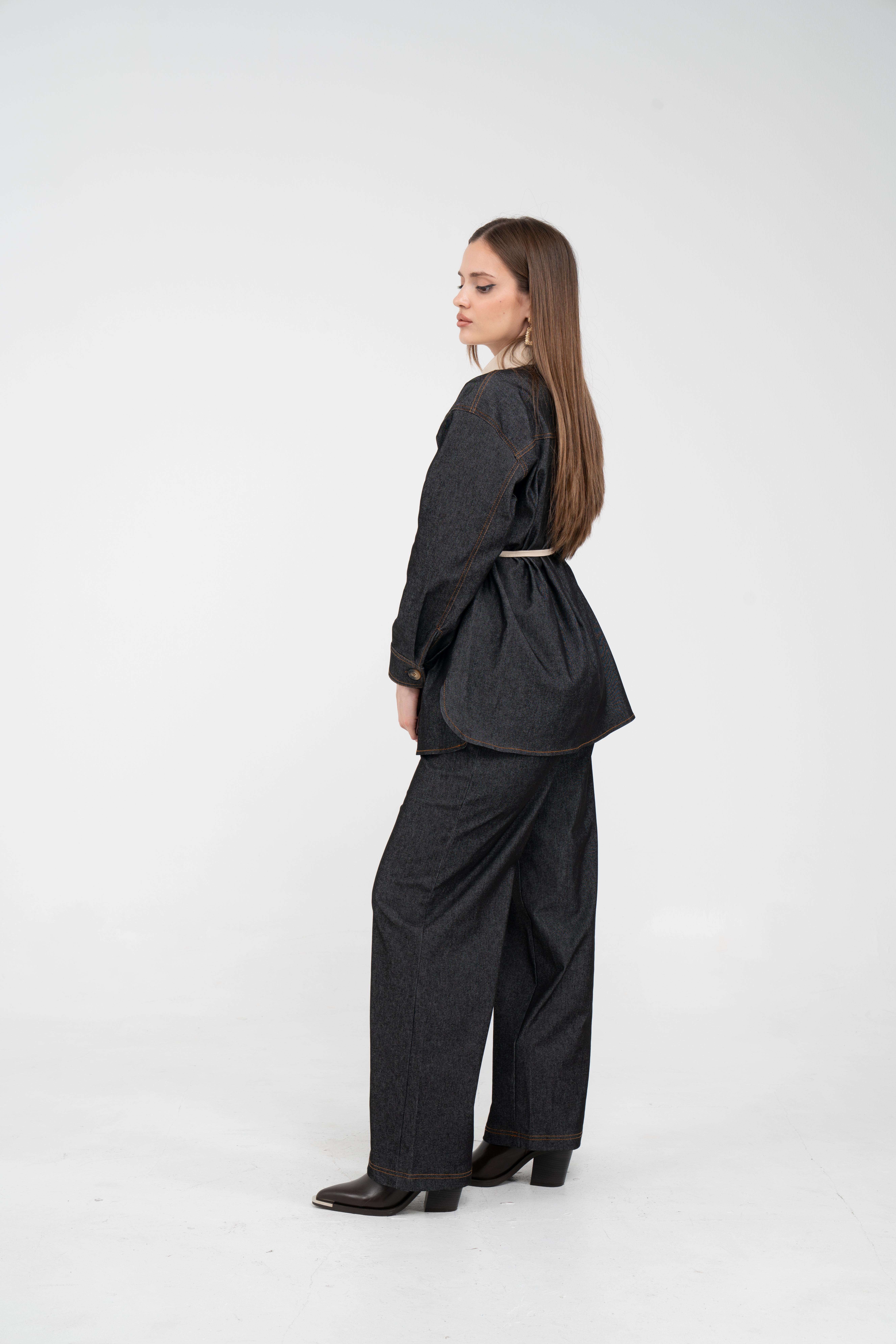 Alt parça geniş paça pantolonu sayesinde hem konforlu hem de modern bir stil sunar. Topuklu botlar, minimal çantalar ve sade aksesuarlarla kombinlendiğinde güçlü ve sofistike bir görünüm elde edilir.