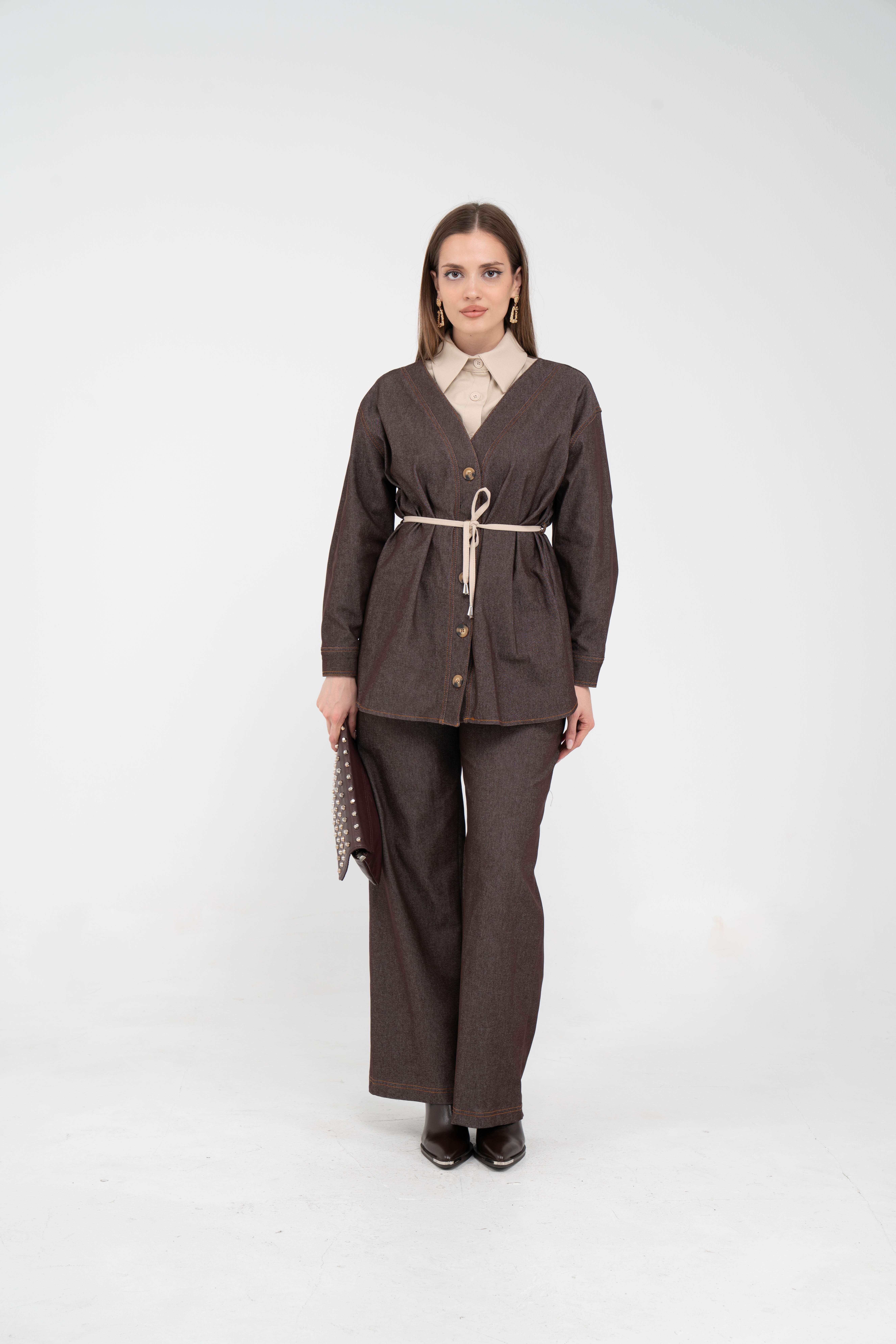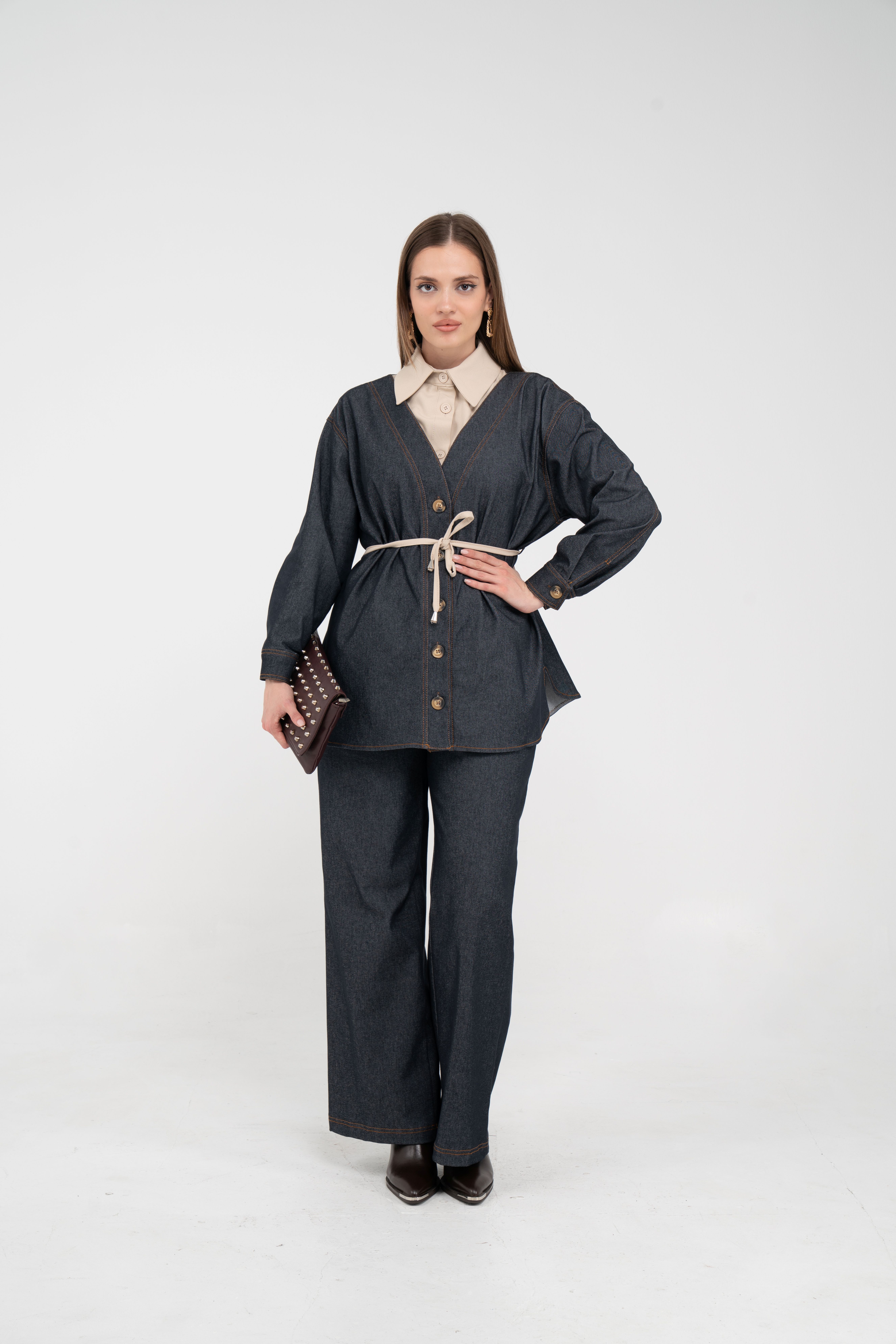 Gelince Haber VerŞık ve modern görünümüyle dikkat çeken bu kadın takım, dikiş detayları ve rahat kalıbıyla günlük şıklıktan ofis stiline kadar geniş bir kullanım alanı sunar. Üst parça, gömlek yaka görünümü ve önden düğmeli tasarımıyla klasik bir duruş kazanırken bel kısmındaki ince kuşak modeli daha derli toplu bir siluet oluşturur.