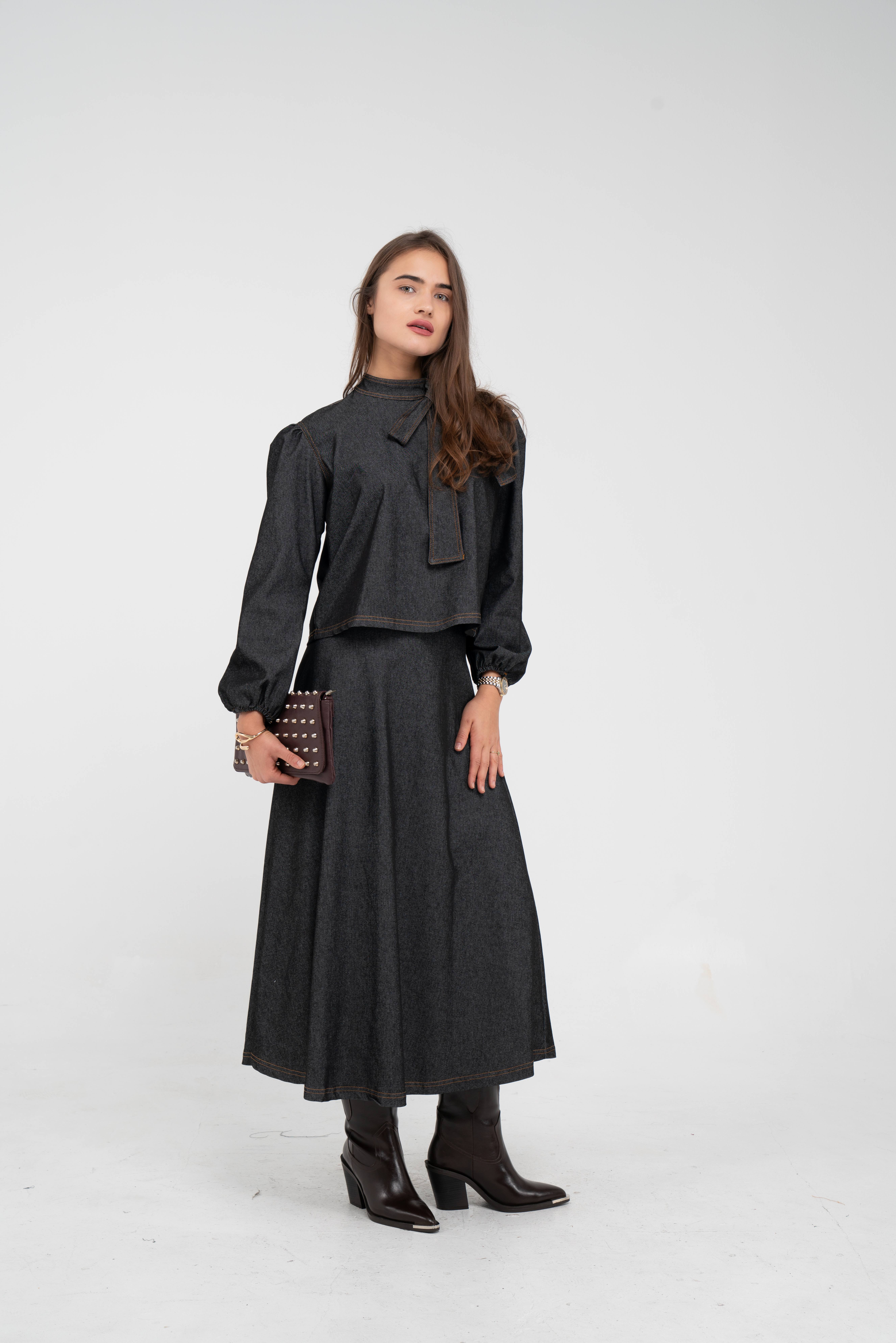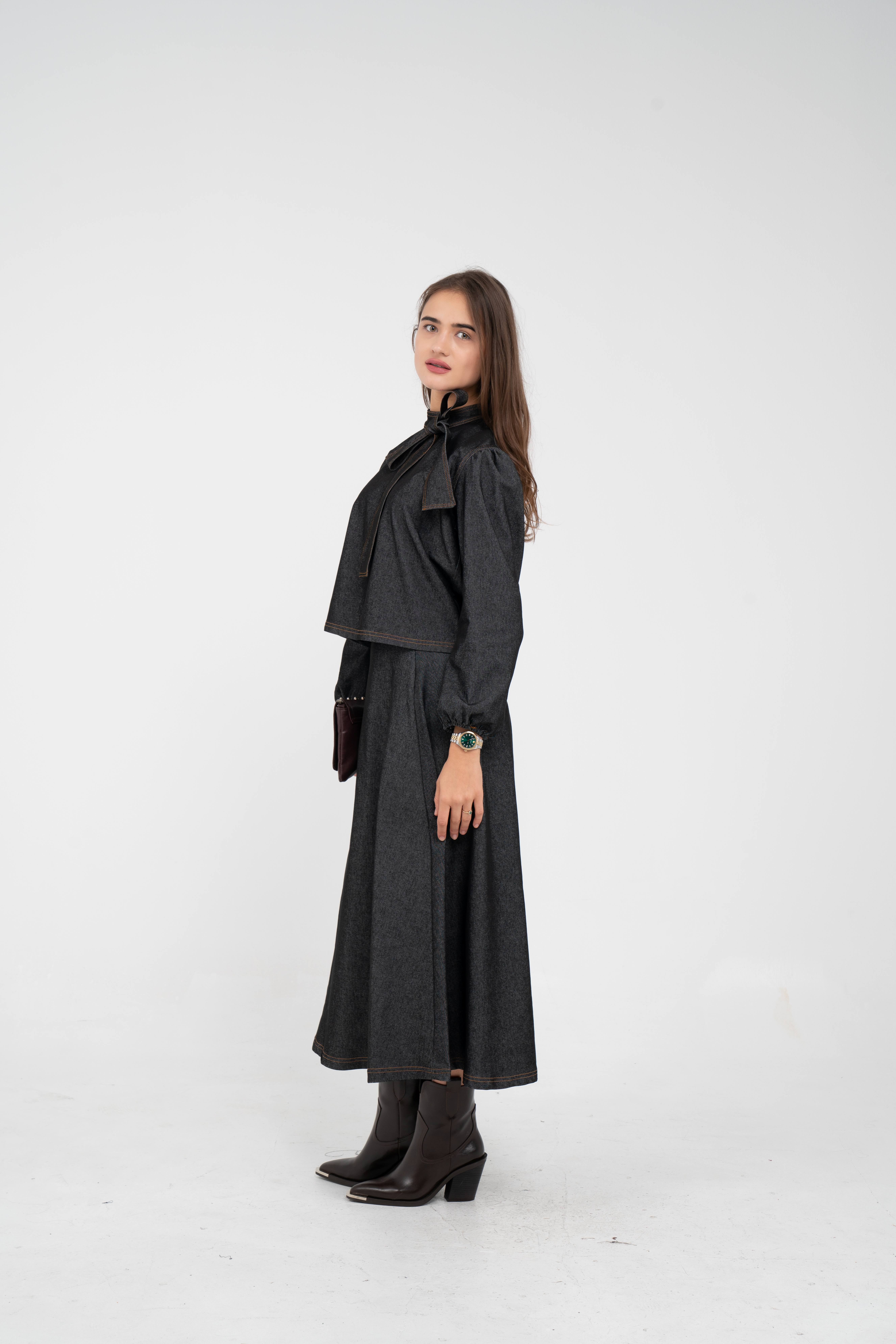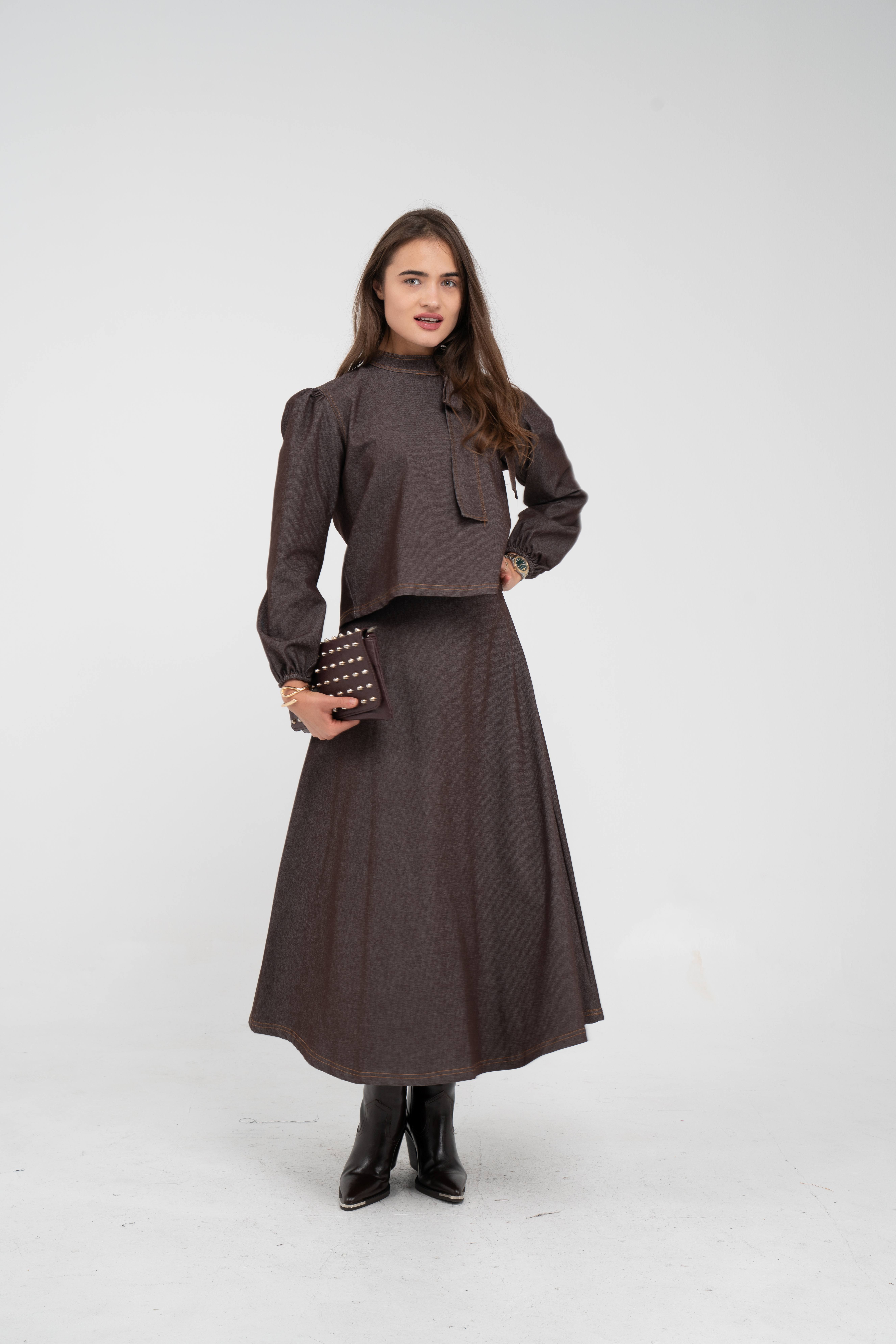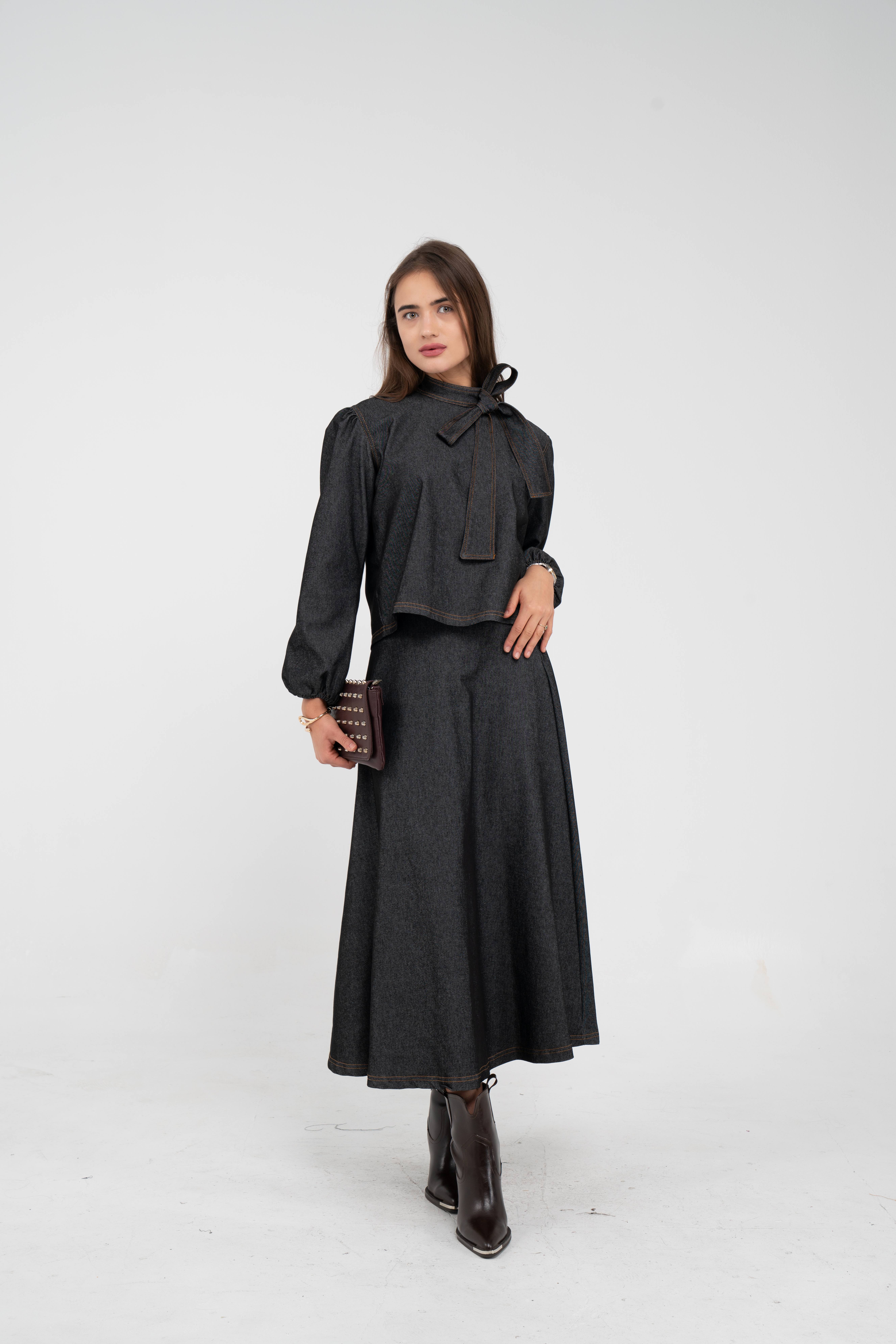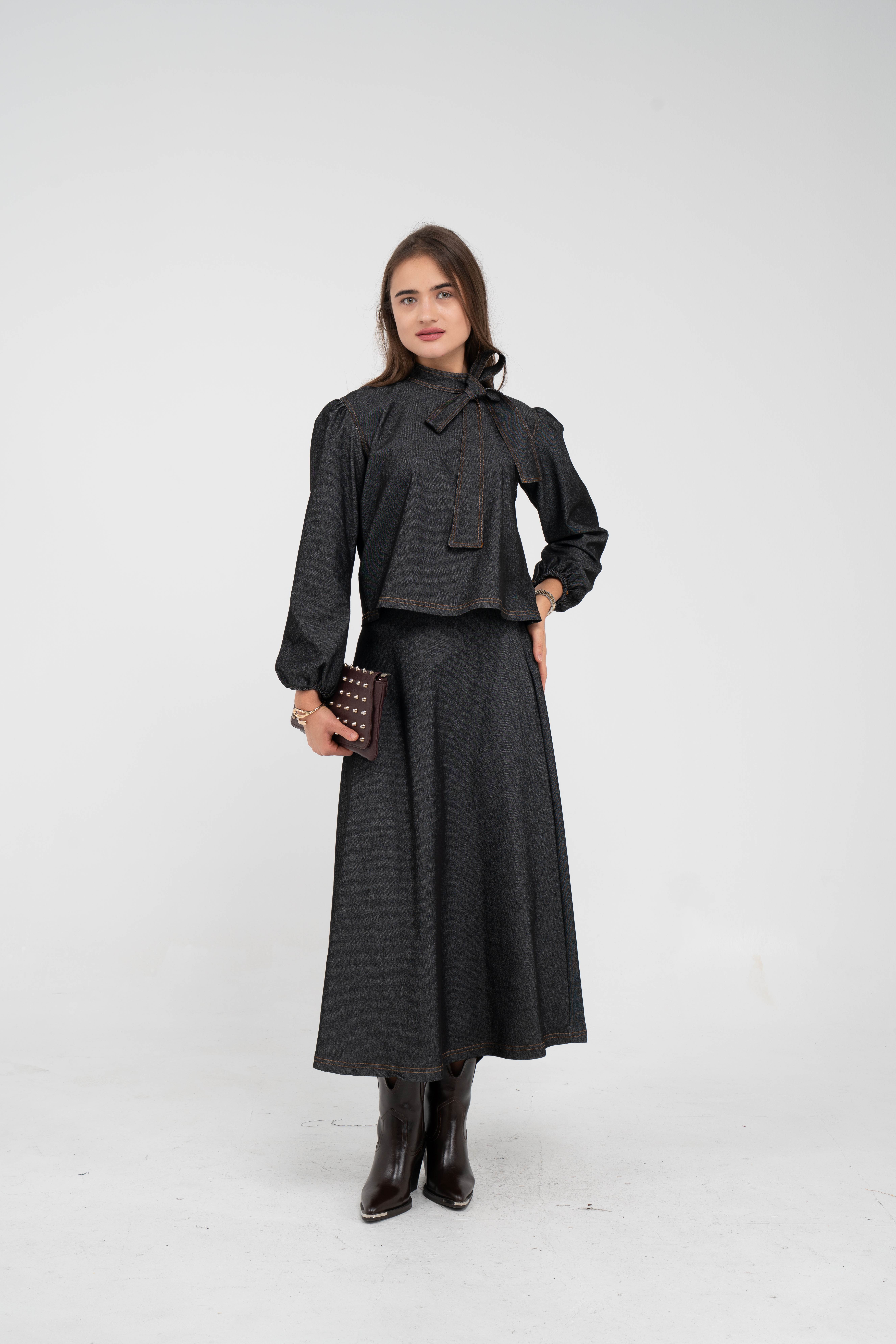 Gelince Haber VerZarif ve modern tasarımıyla öne çıkan bu kadın takım, fiyonk yaka detaylı üst parçası ve akıcı uzun etek formuyla şıklığı en sade haliyle sunuyor. Üst parçada yer alan balon kol yapısı, hafif vatkalı omuz hattı ve romantik fiyonk detayı modele sofistike bir hava katarken; etek kısmının geniş kesimi rahat hareket alanı sağlar.