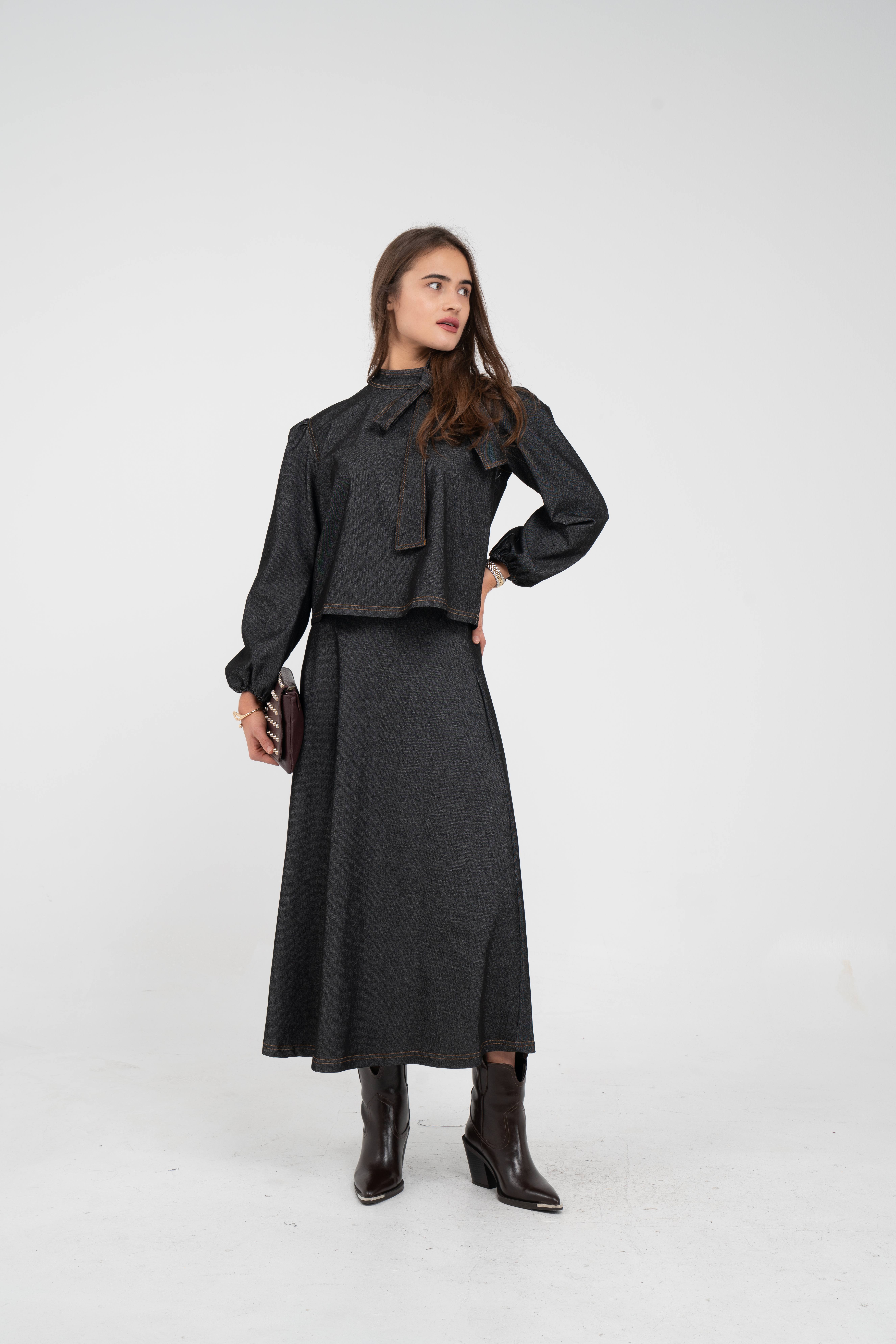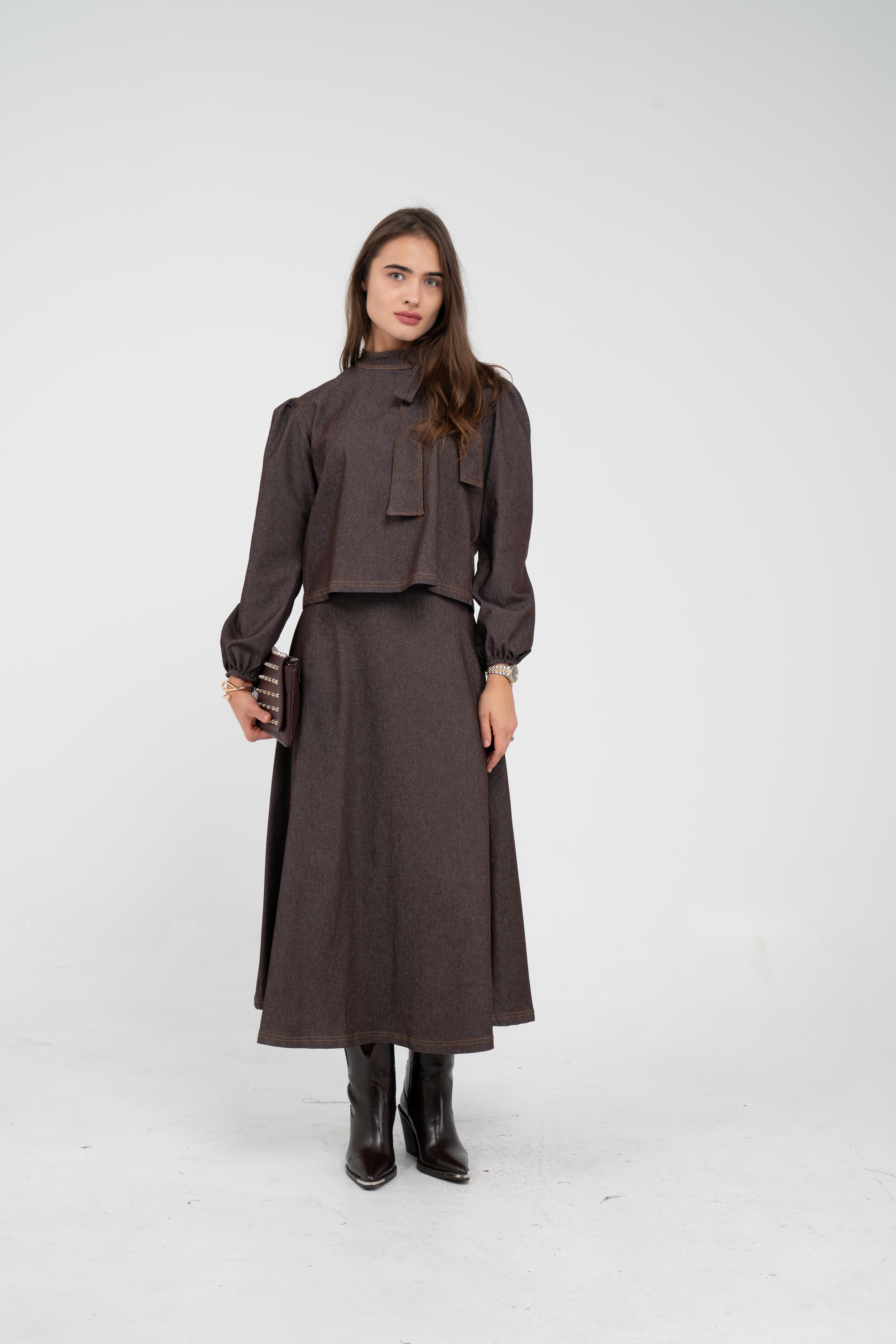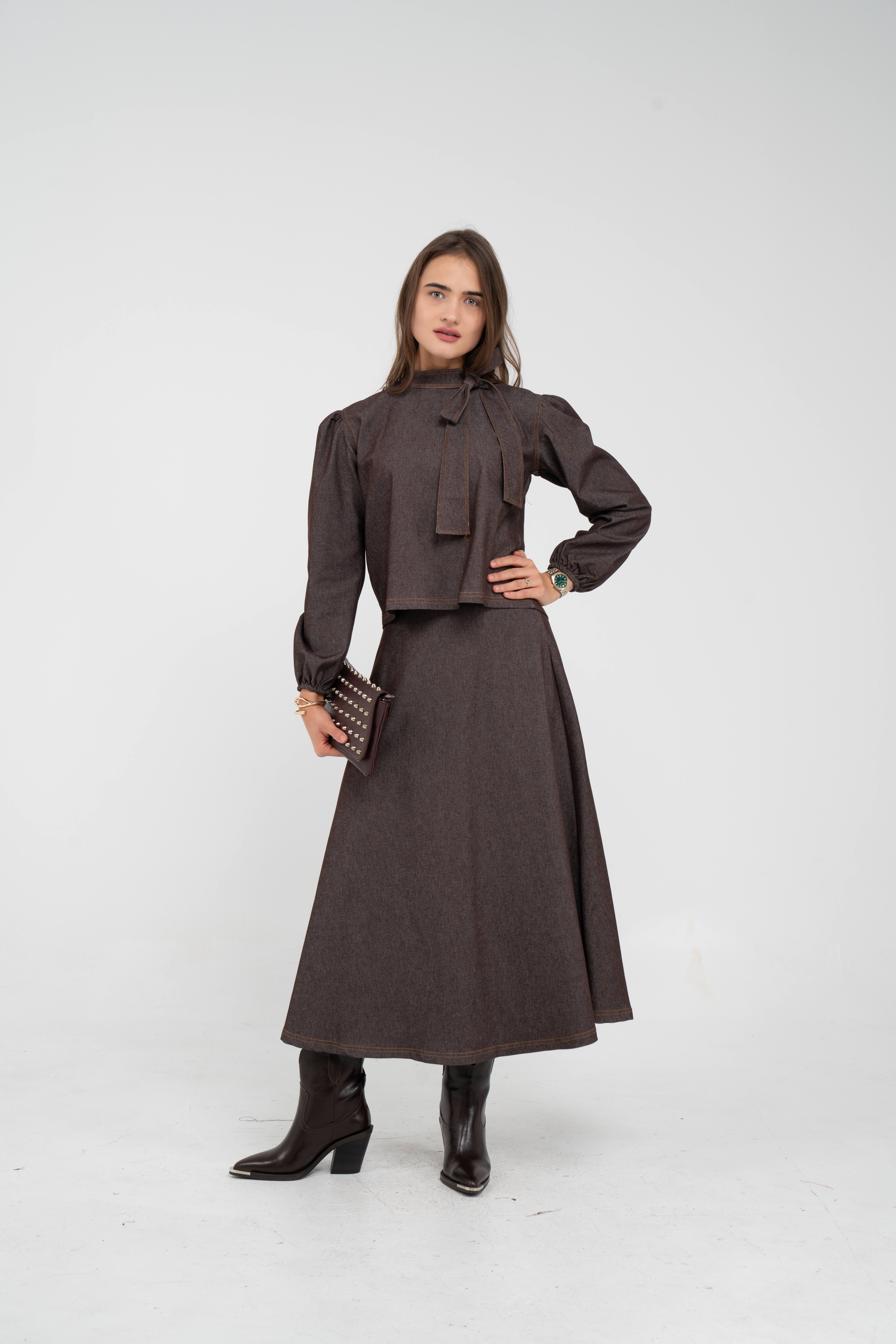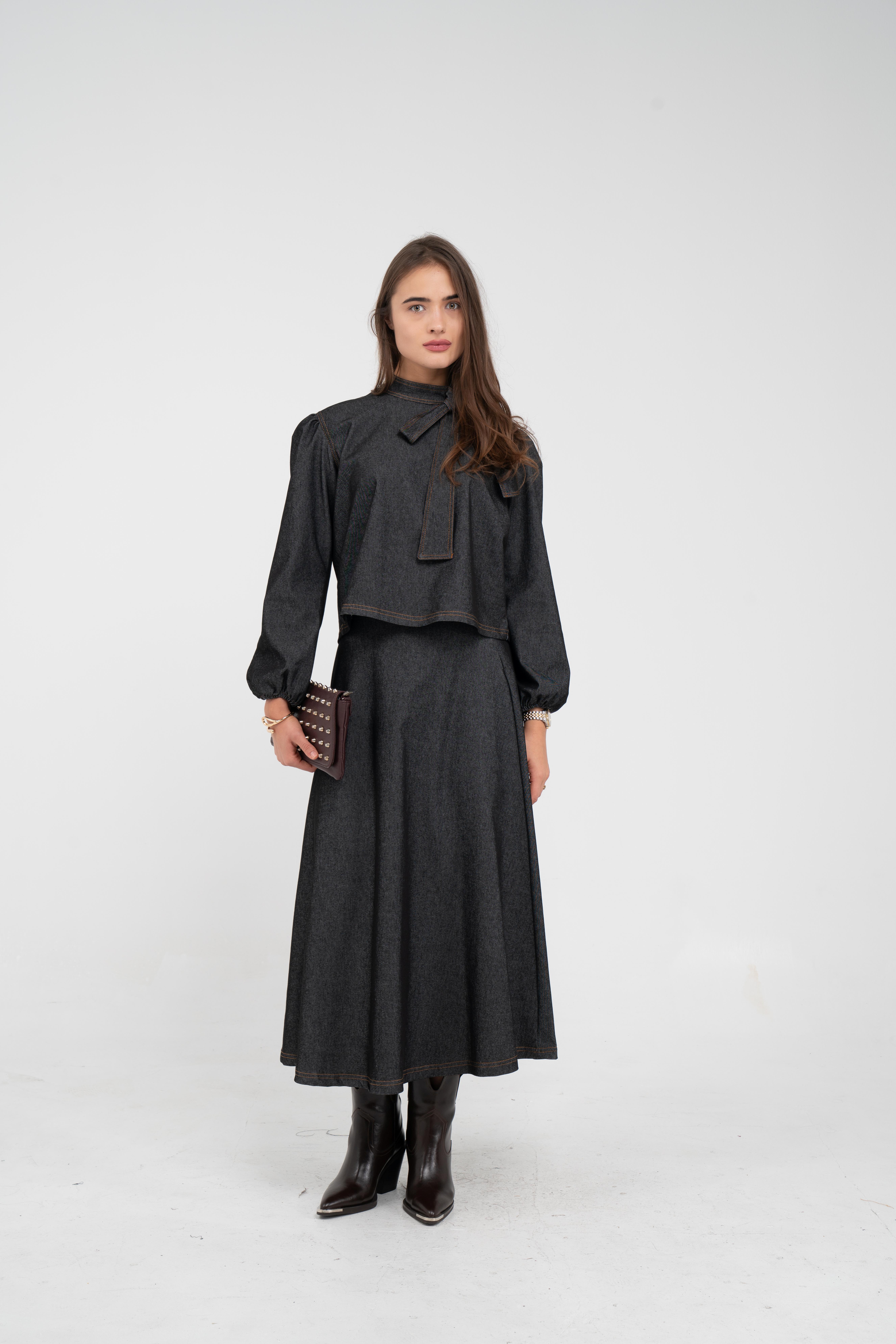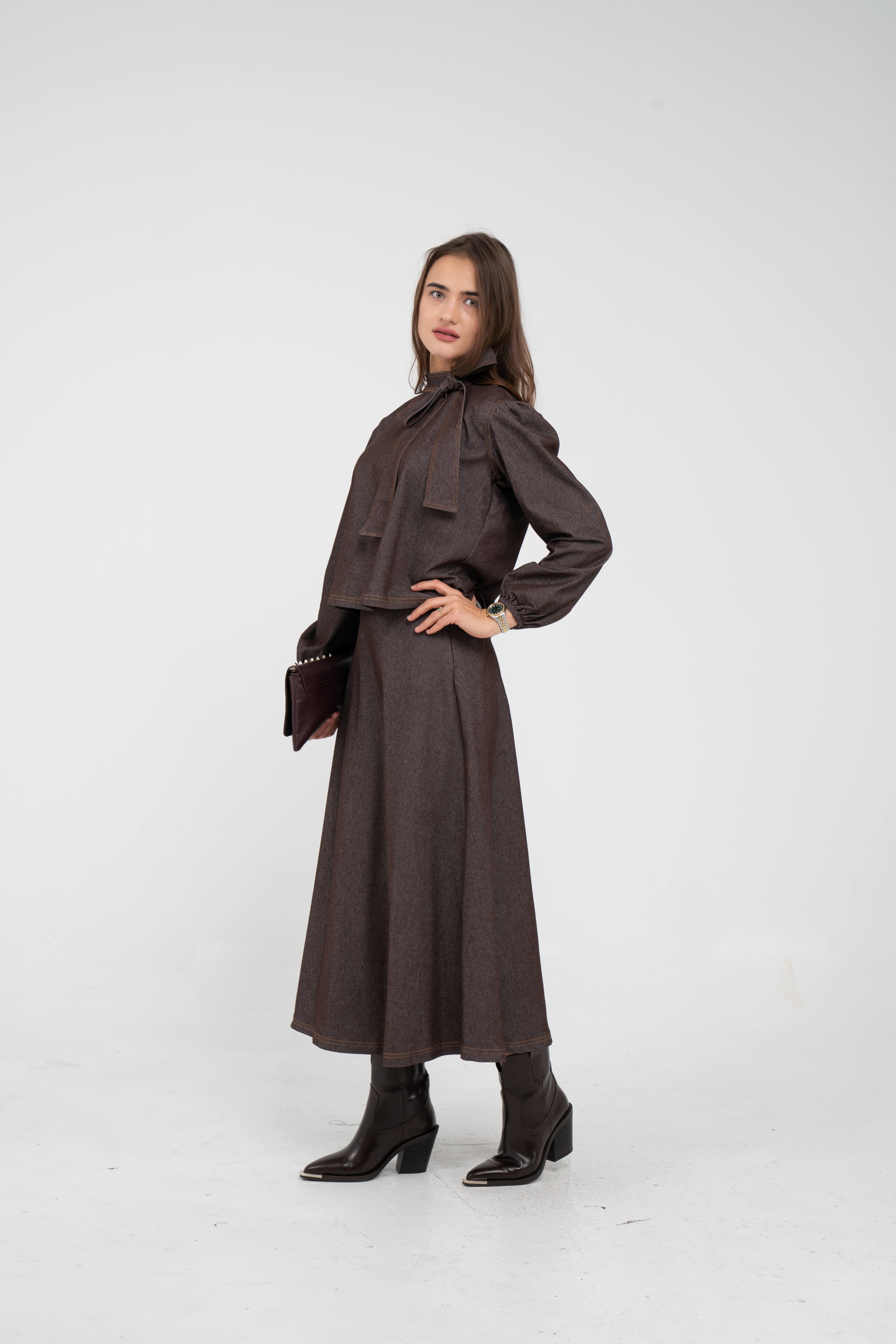 Gelince Haber VerZarif ve modern tasarımıyla öne çıkan bu kadın takım, fiyonk yaka detaylı üst parçası ve akıcı uzun etek formuyla şıklığı en sade haliyle sunuyor. Üst parçada yer alan balon kol yapısı, hafif vatkalı omuz hattı ve romantik fiyonk detayı modele sofistike bir hava katarken; etek kısmının geniş kesimi rahat hareket alanı sağlar.