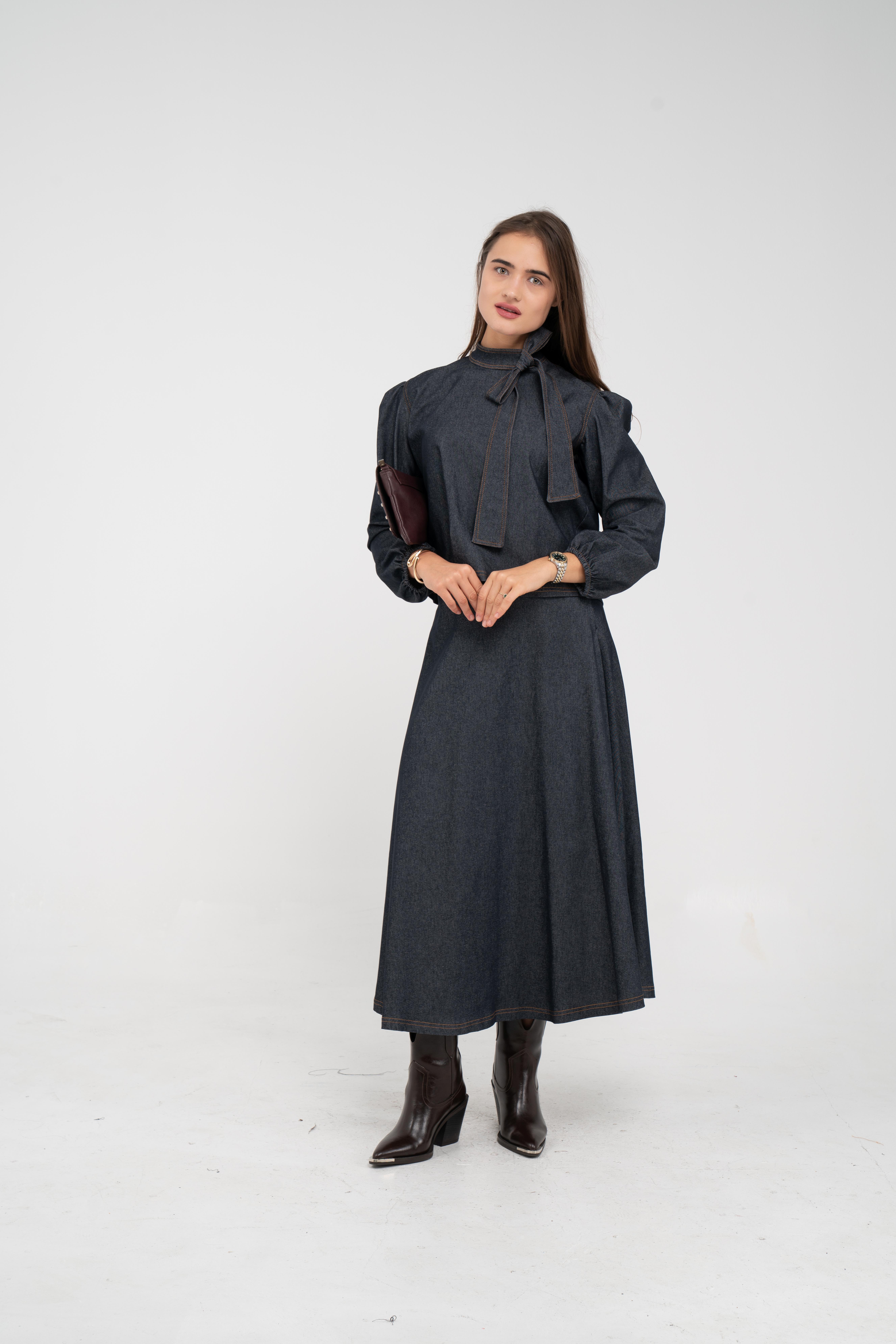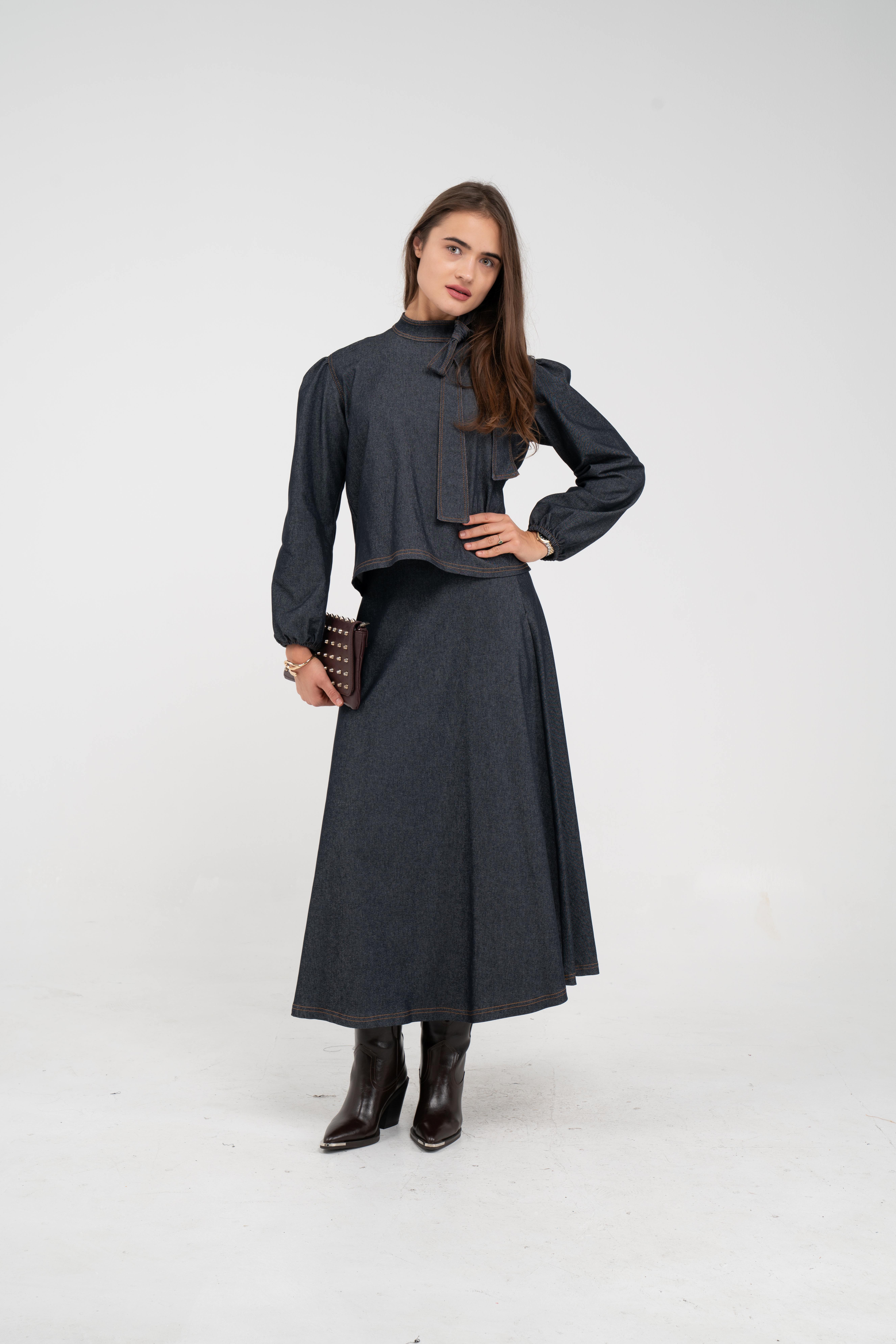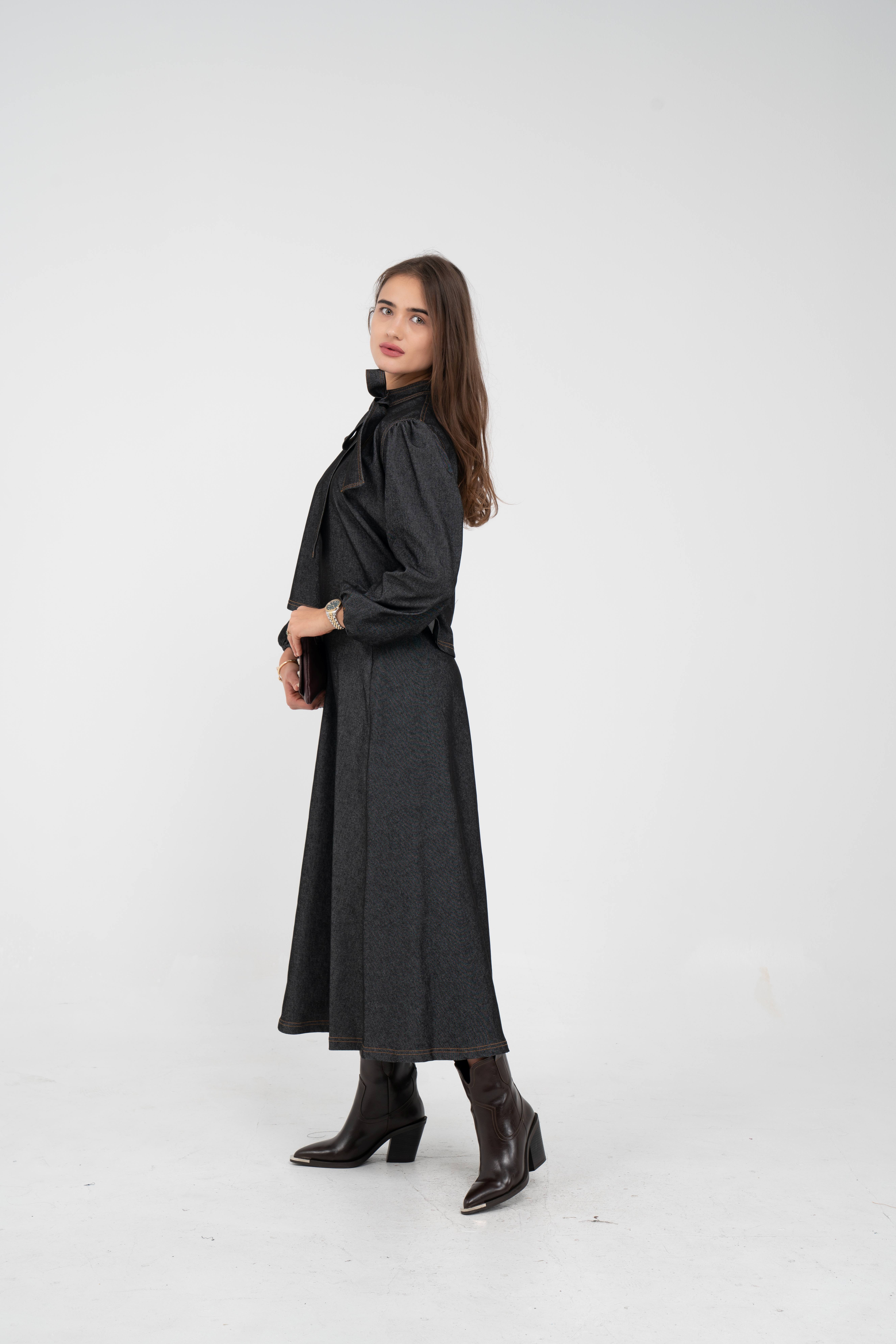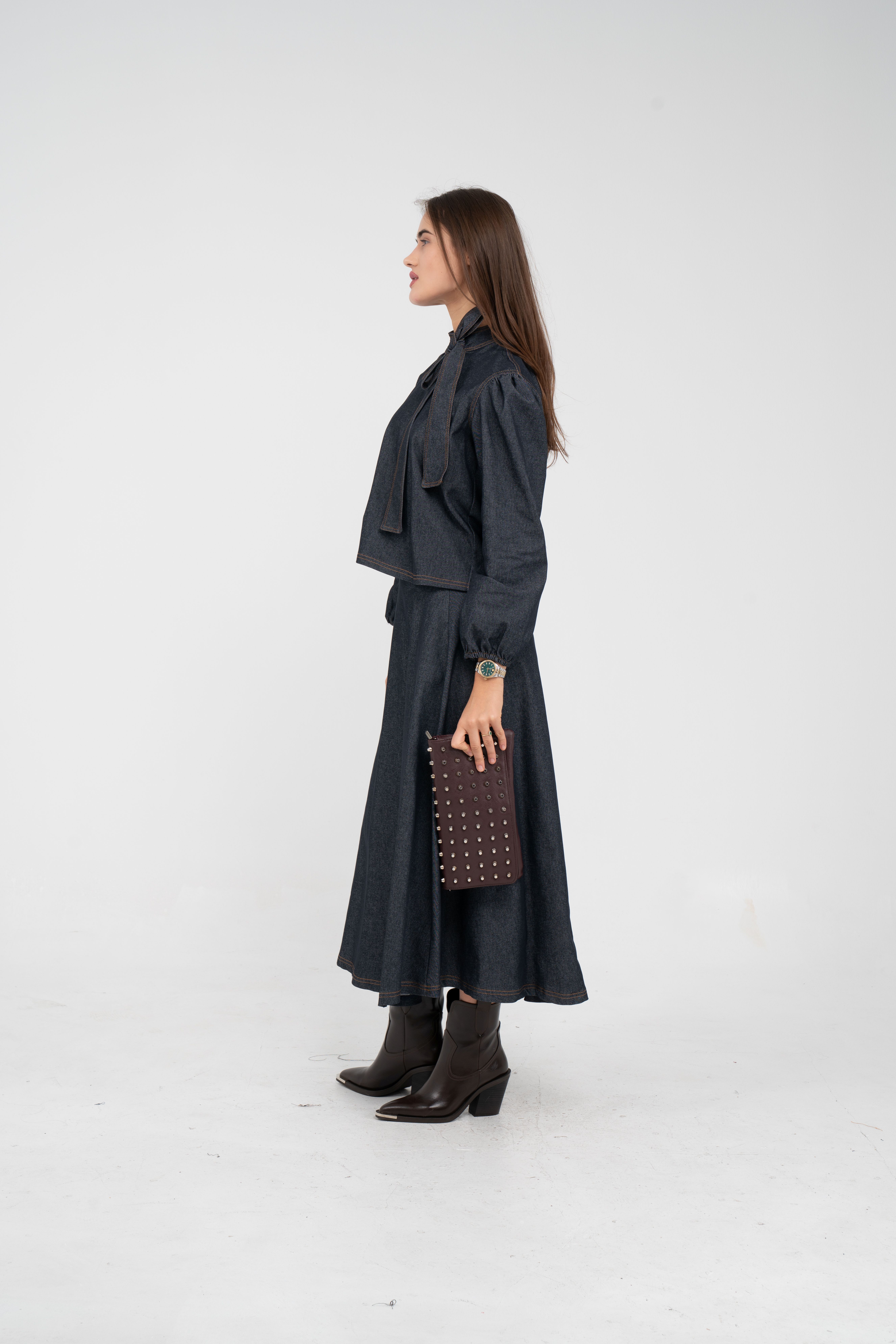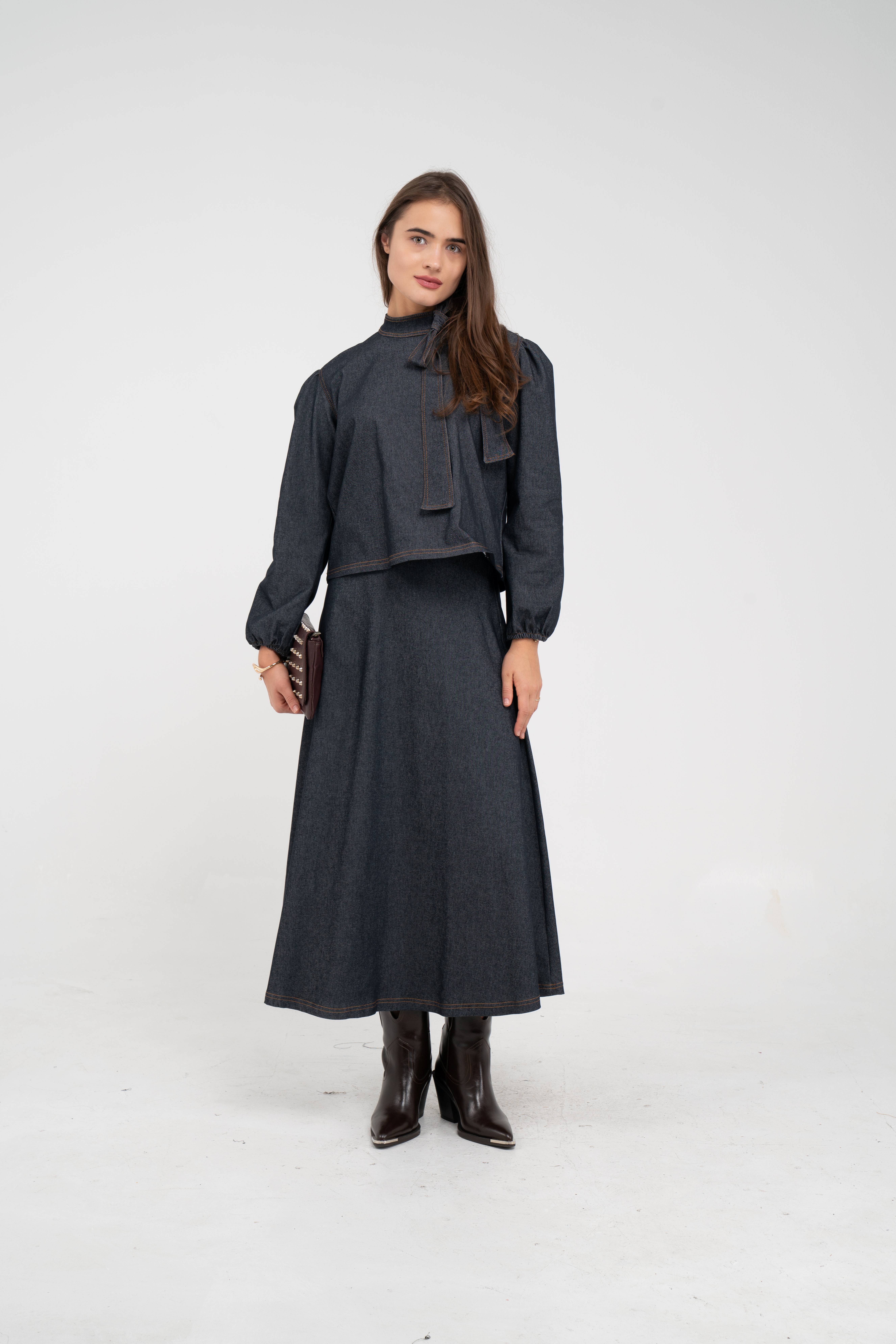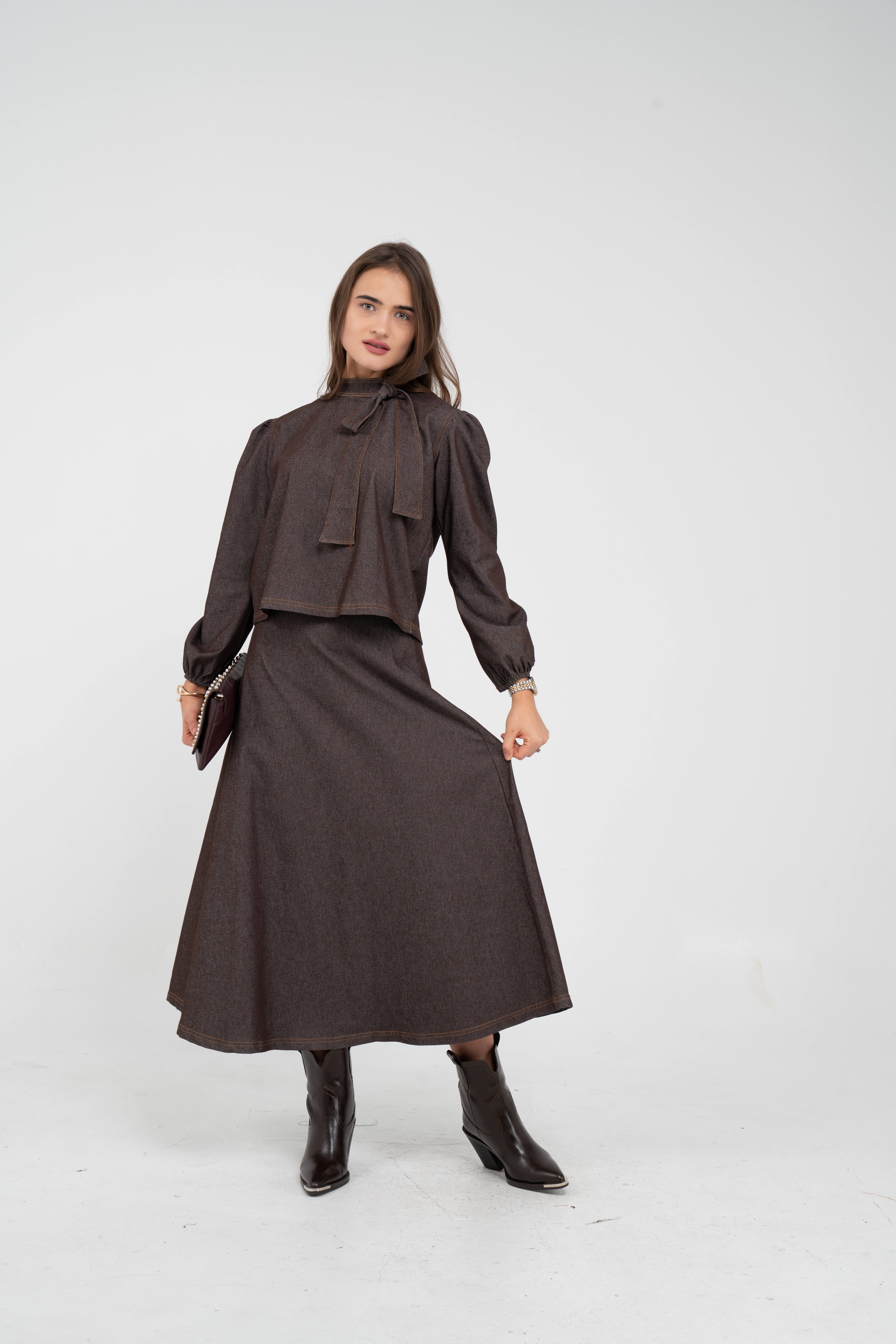 Gelince Haber VerZarif ve modern tasarımıyla öne çıkan bu kadın takım, fiyonk yaka detaylı üst parçası ve akıcı uzun etek formuyla şıklığı en sade haliyle sunuyor. Üst parçada yer alan balon kol yapısı, hafif vatkalı omuz hattı ve romantik fiyonk detayı modele sofistike bir hava katarken; etek kısmının geniş kesimi rahat hareket alanı sağlar.