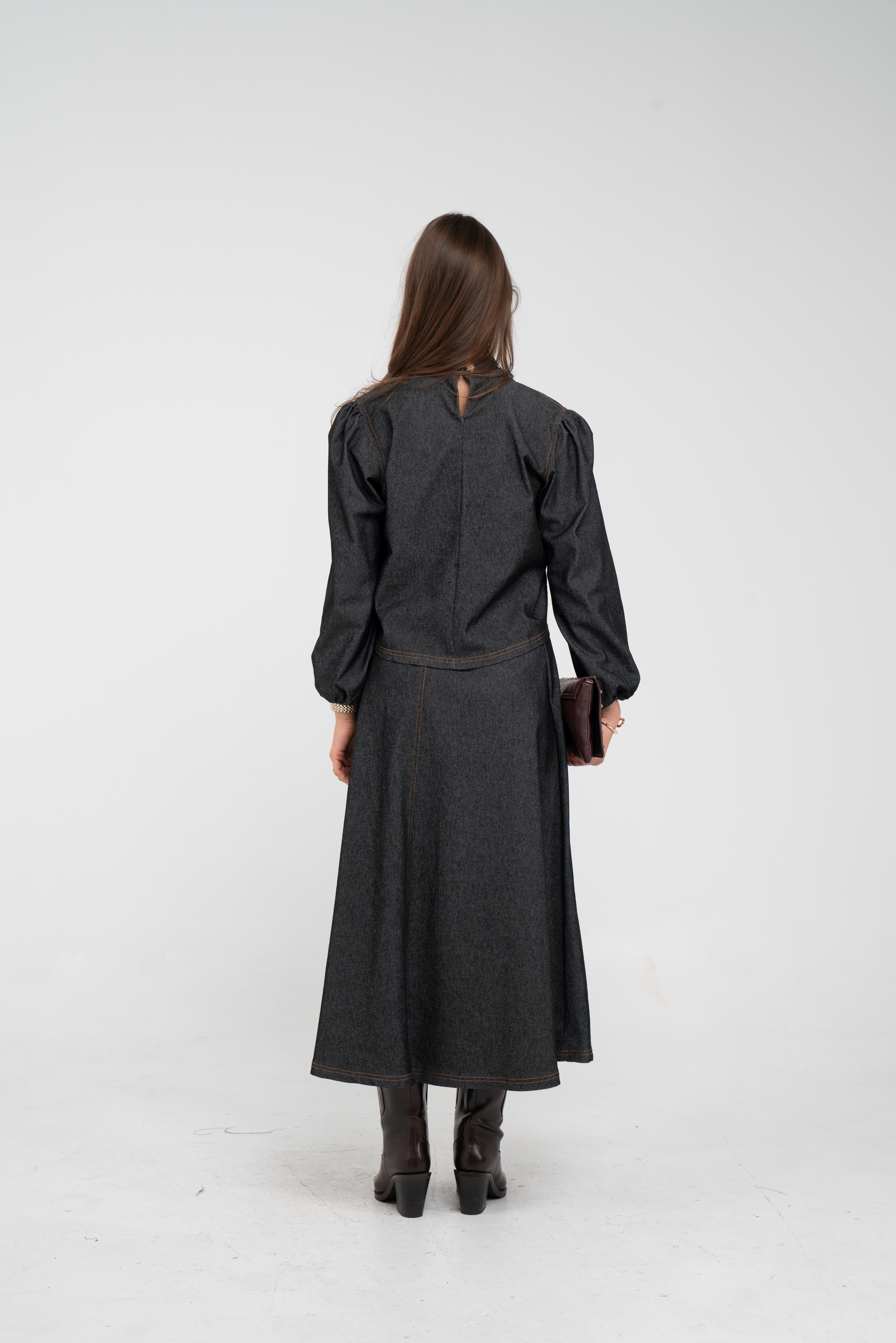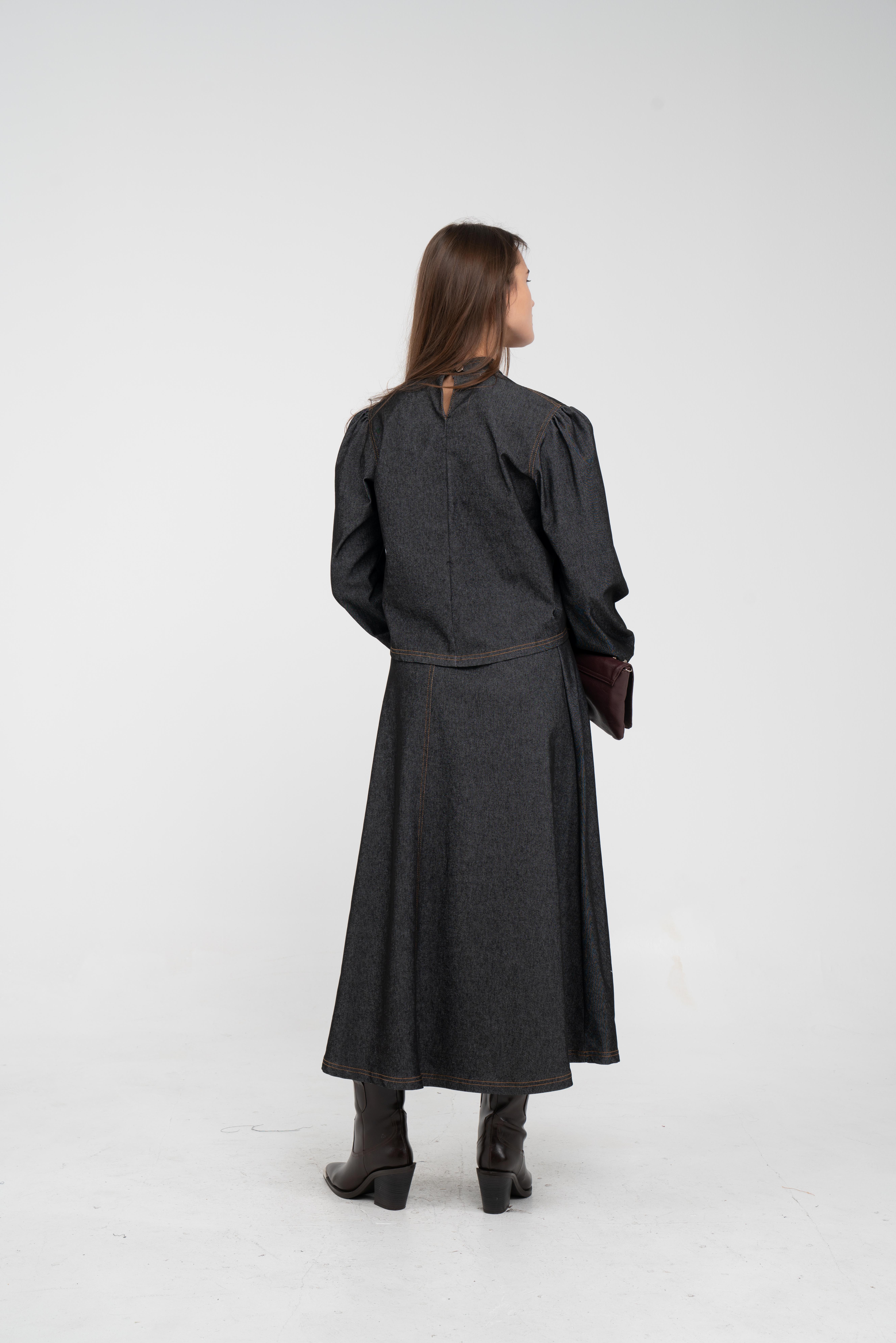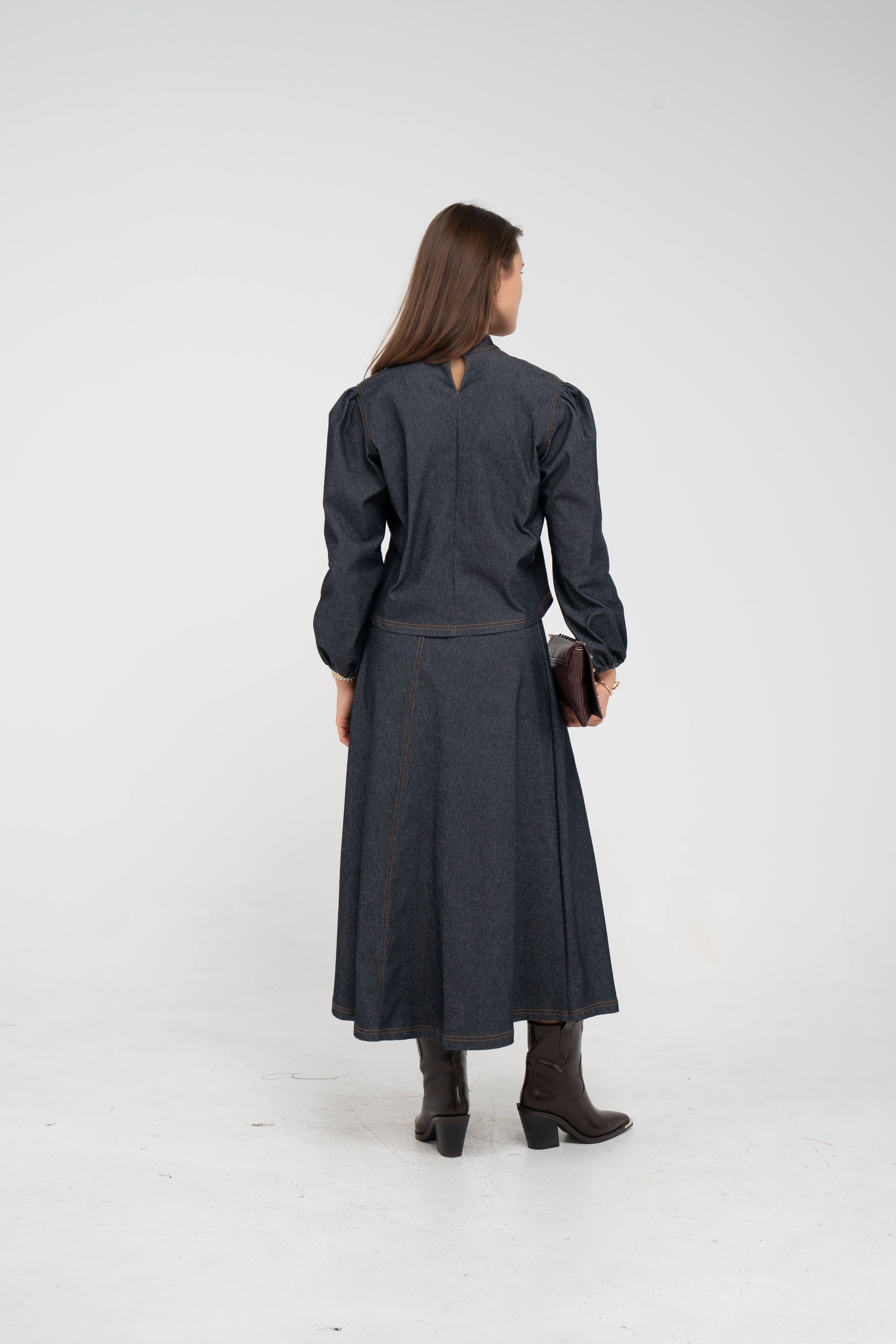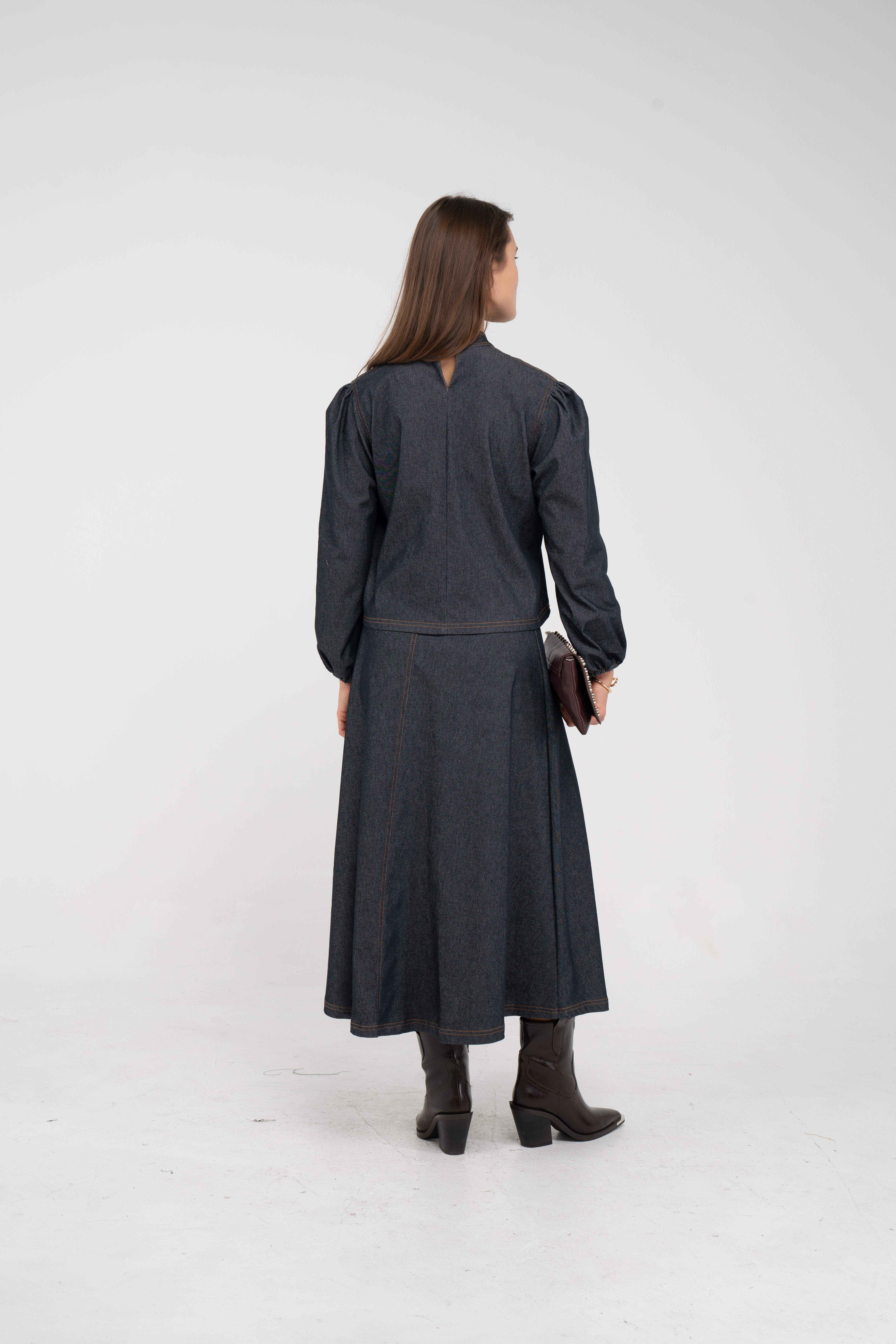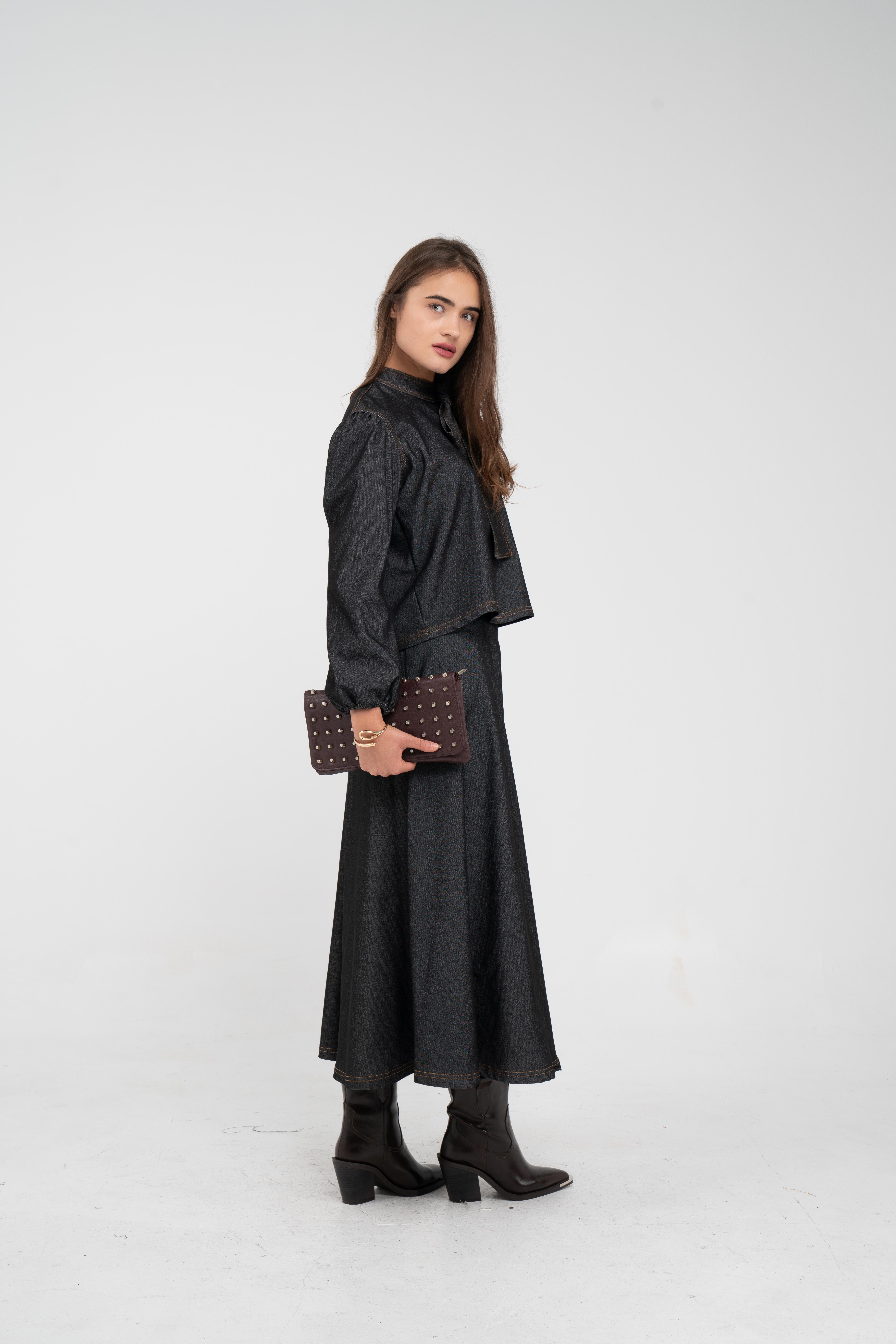Gelince Haber VerZarif ve modern tasarımıyla öne çıkan bu kadın takım, fiyonk yaka detaylı üst parçası ve akıcı uzun etek formuyla şıklığı en sade haliyle sunuyor. Üst parçada yer alan balon kol yapısı, hafif vatkalı omuz hattı ve romantik fiyonk detayı modele sofistike bir hava katarken; etek kısmının geniş kesimi rahat hareket alanı sağlar.