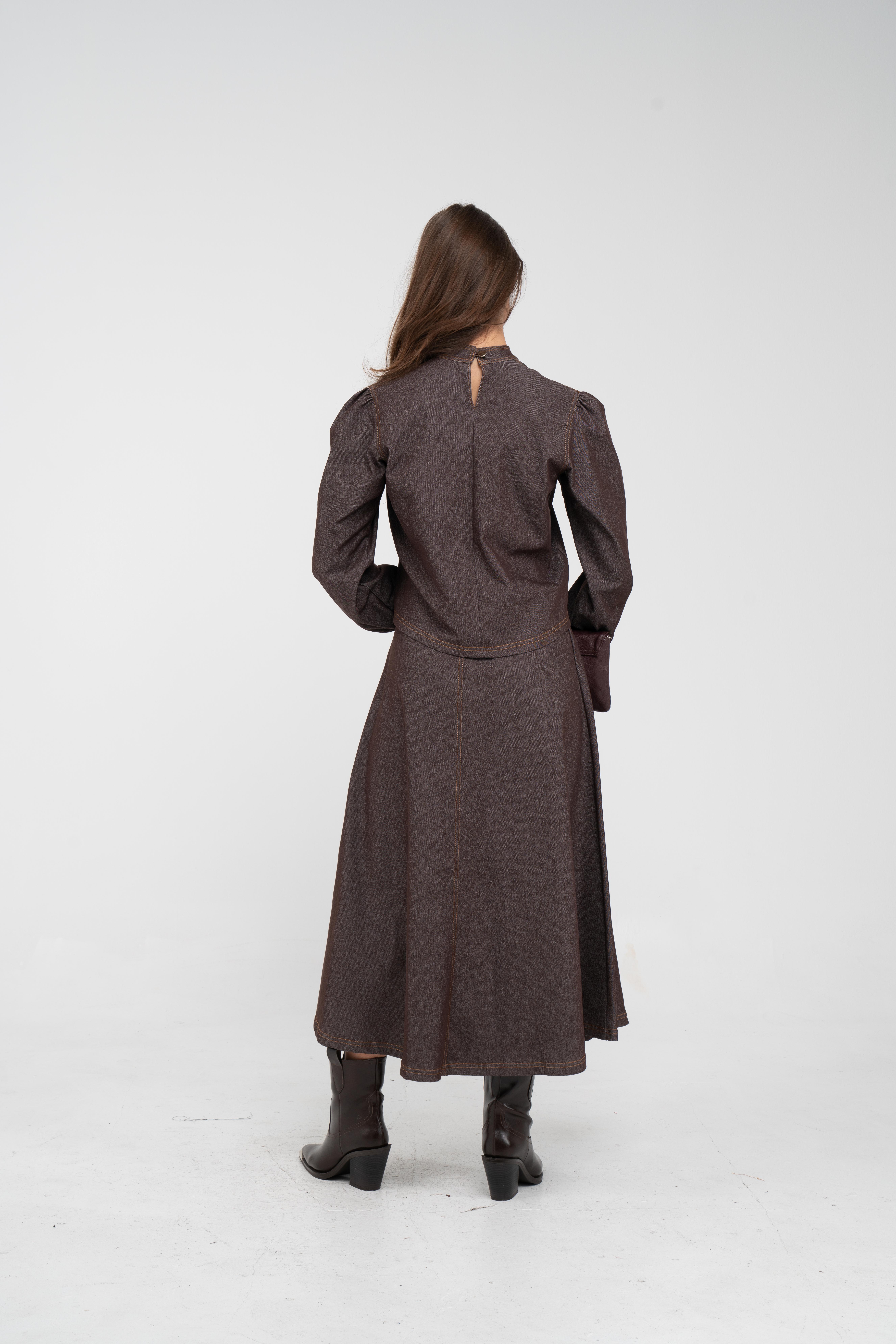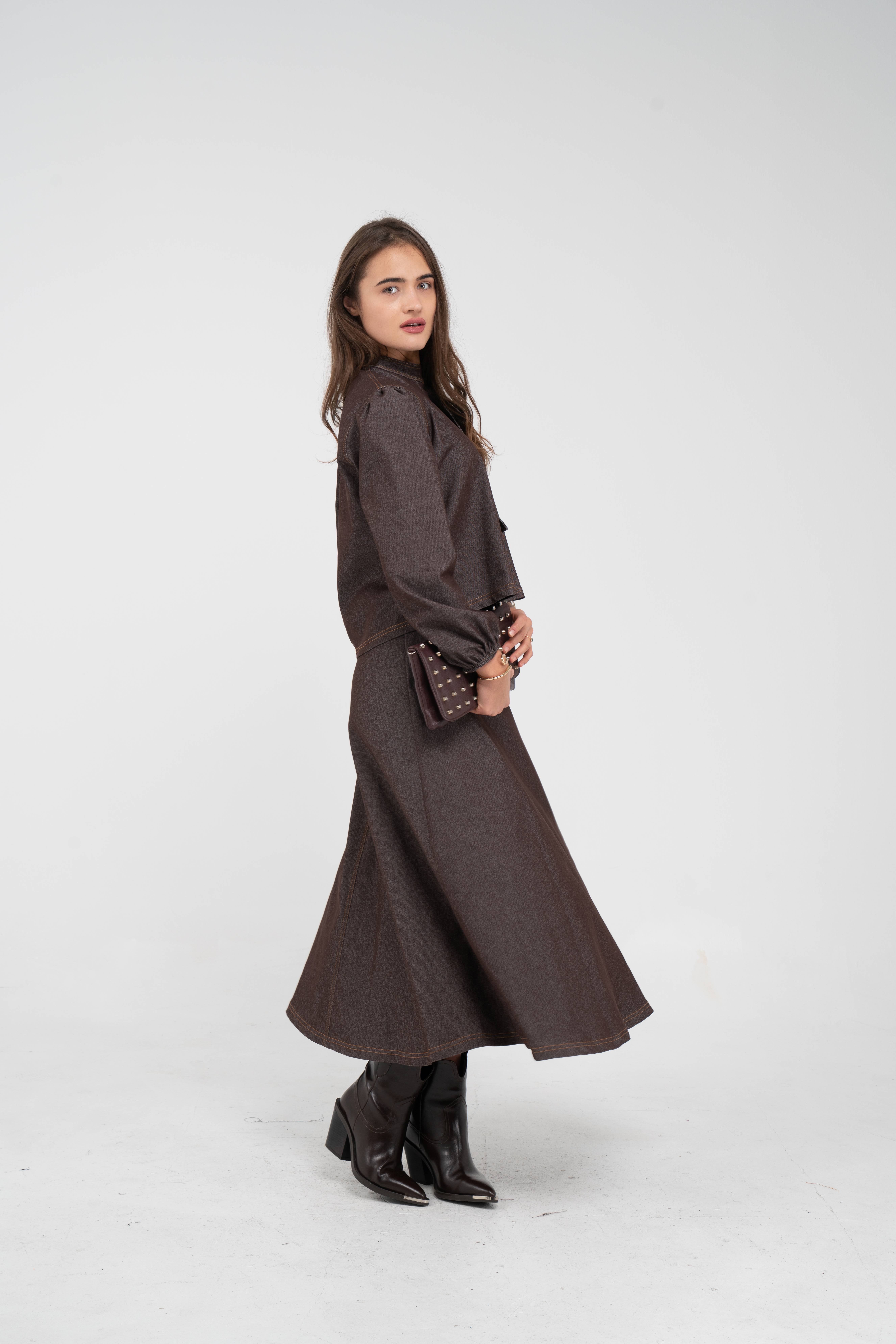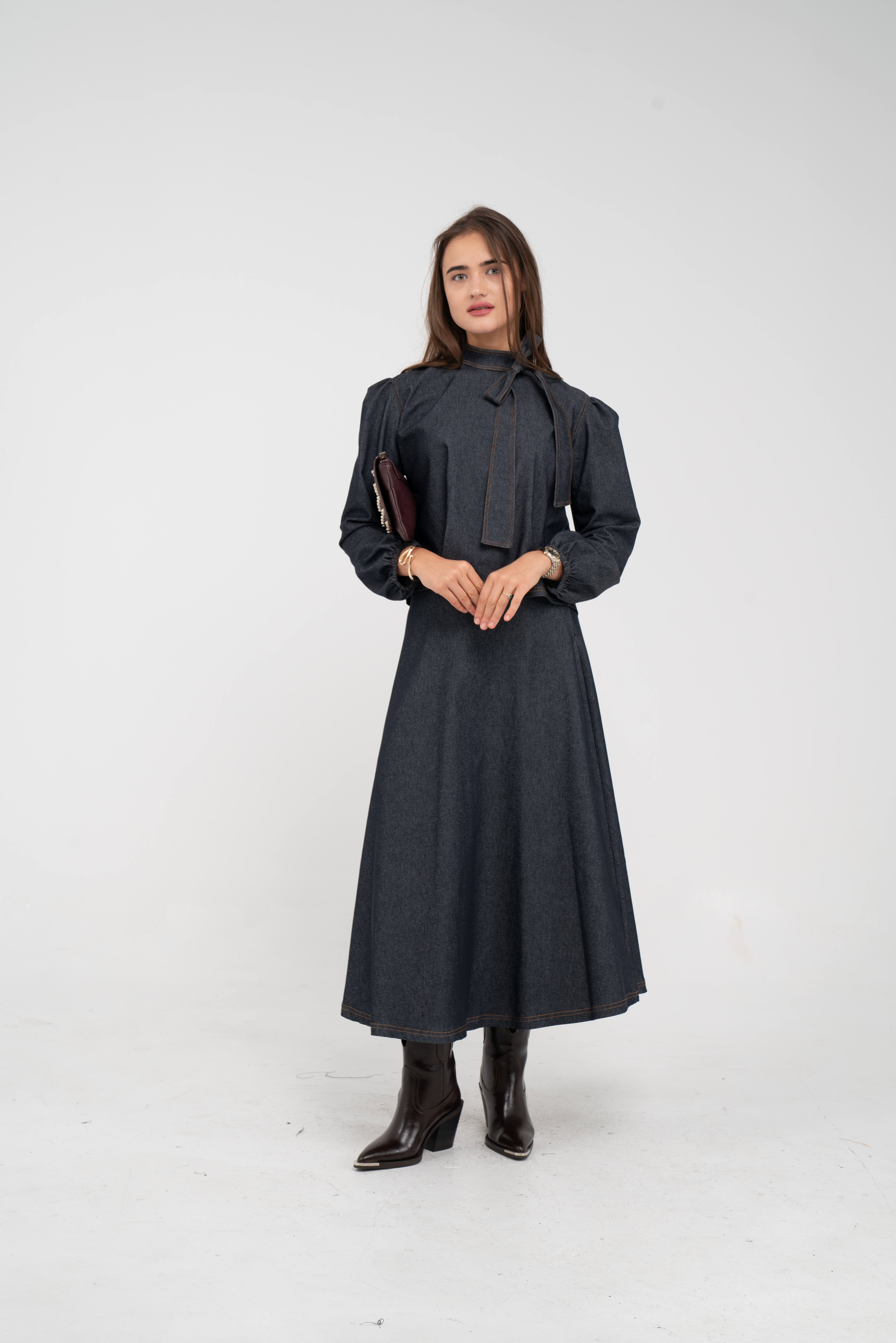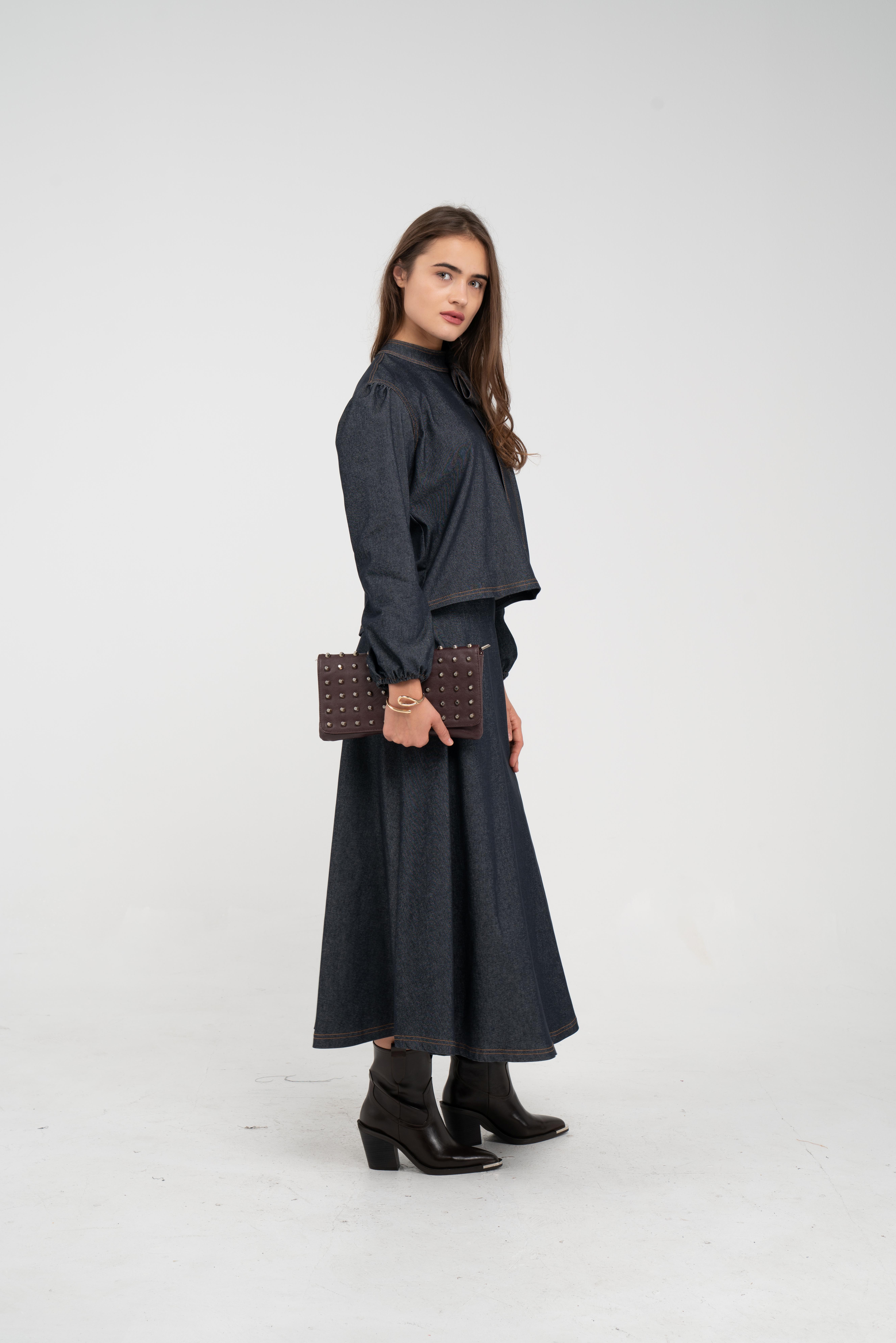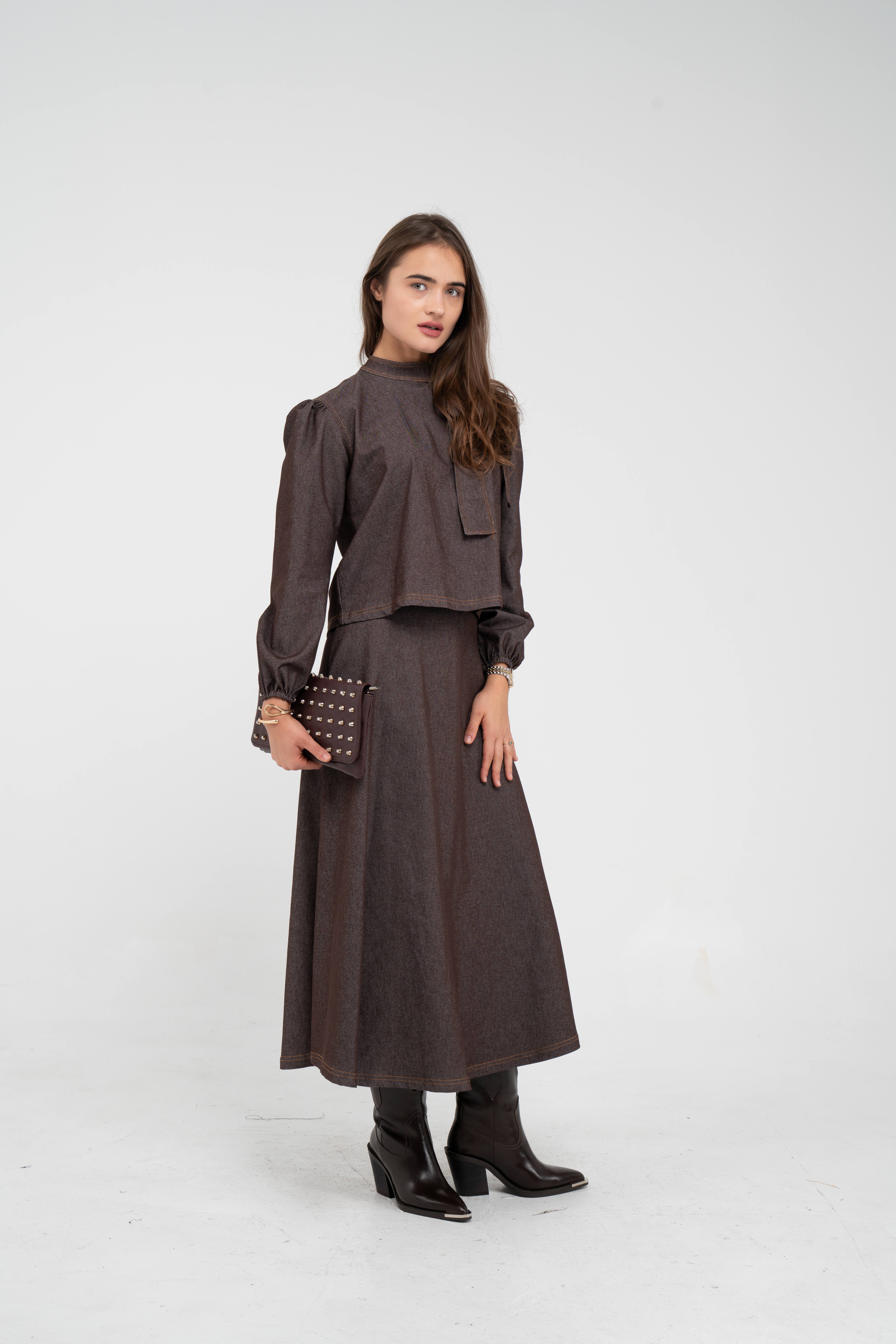 Gelince Haber VerZarif ve modern tasarımıyla öne çıkan bu kadın takım, fiyonk yaka detaylı üst parçası ve akıcı uzun etek formuyla şıklığı en sade haliyle sunuyor. Üst parçada yer alan balon kol yapısı, hafif vatkalı omuz hattı ve romantik fiyonk detayı modele sofistike bir hava katarken; etek kısmının geniş kesimi rahat hareket alanı sağlar.
