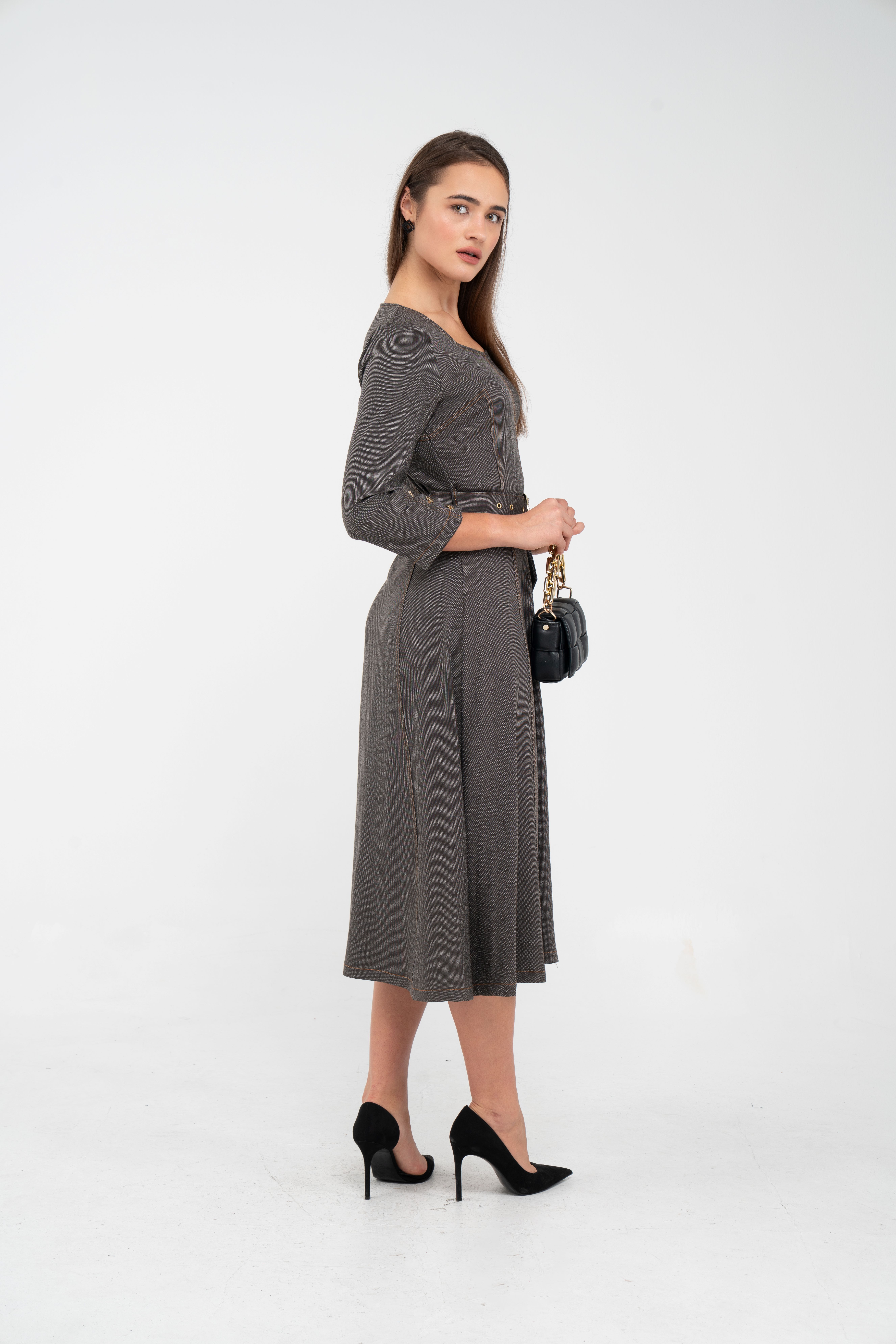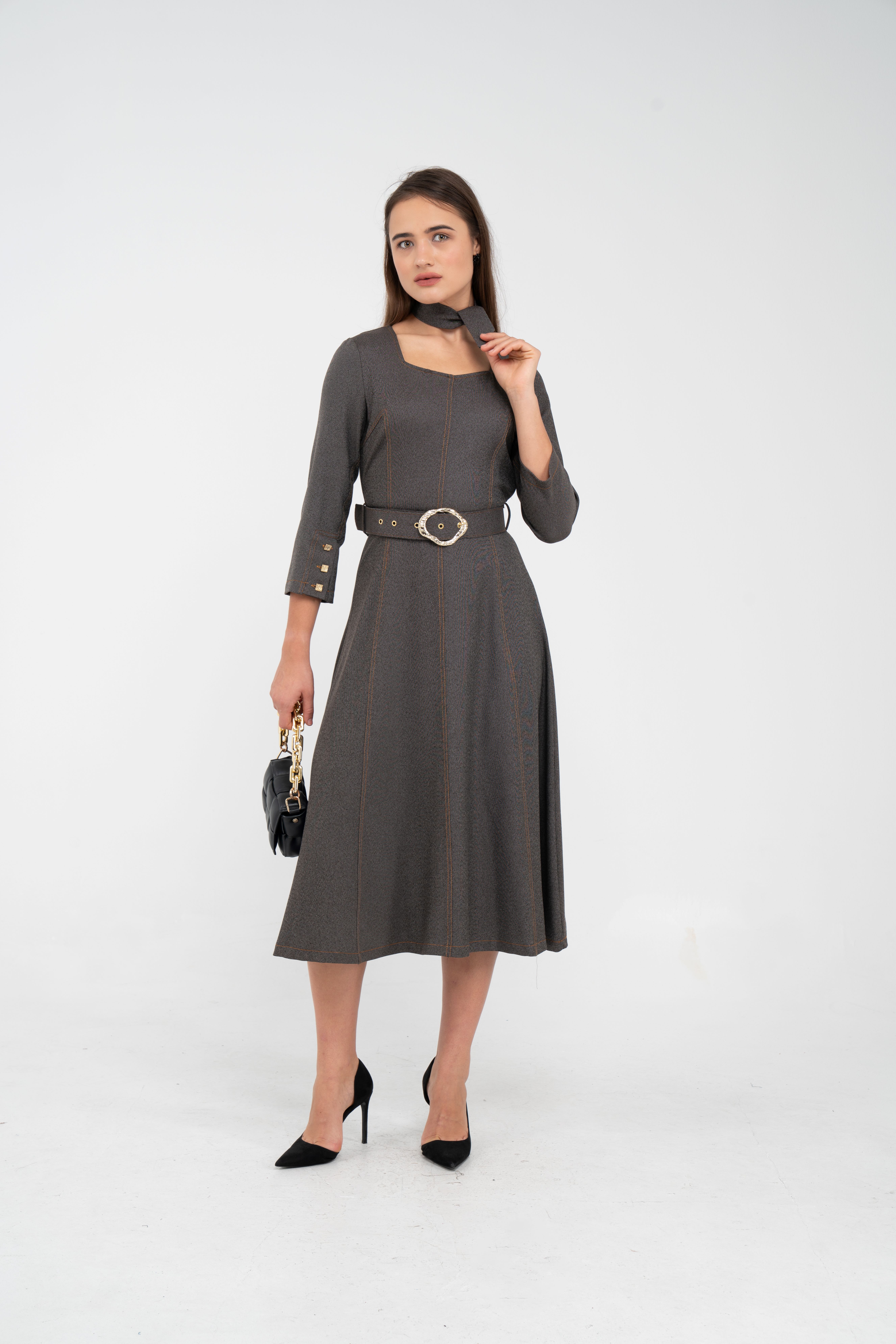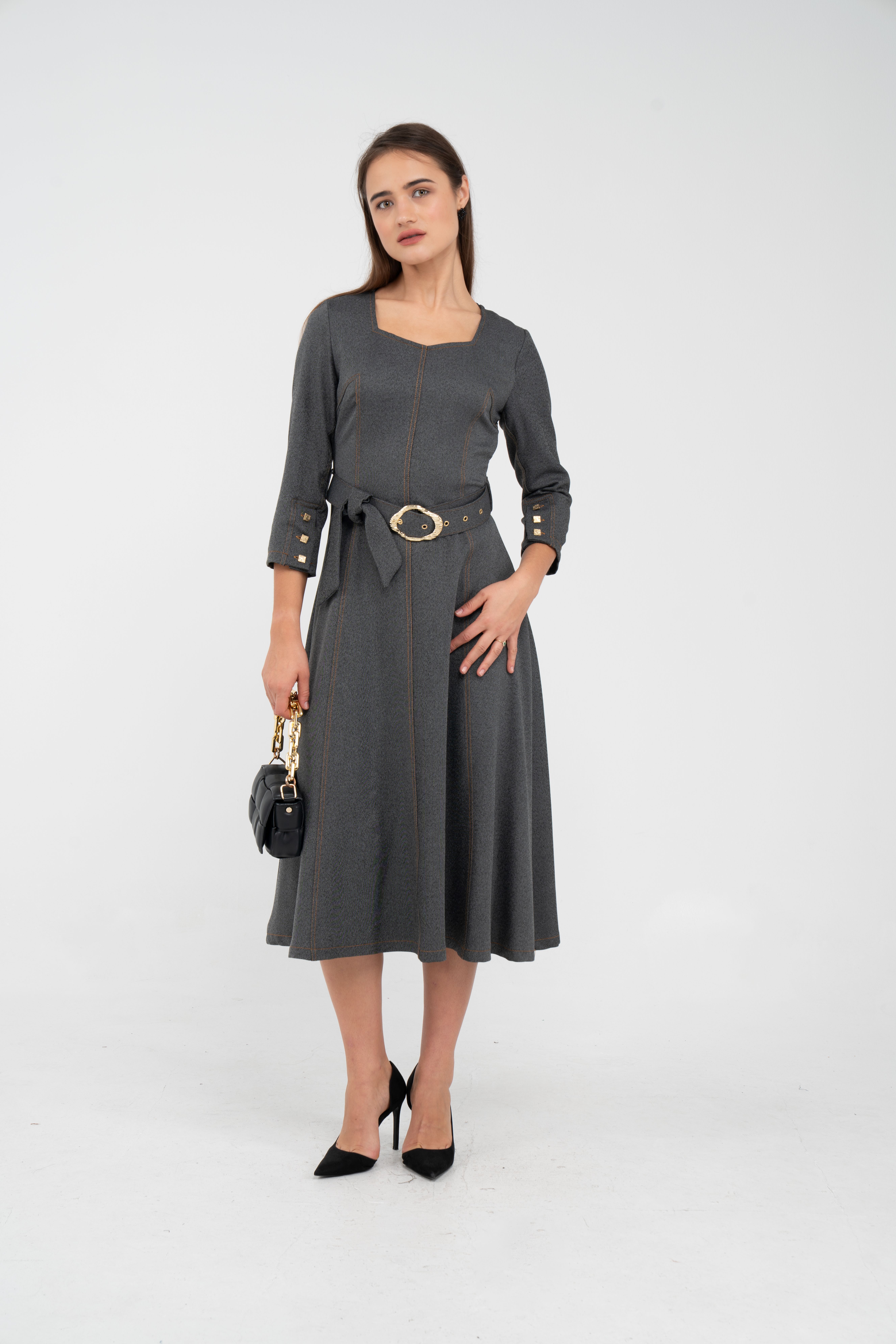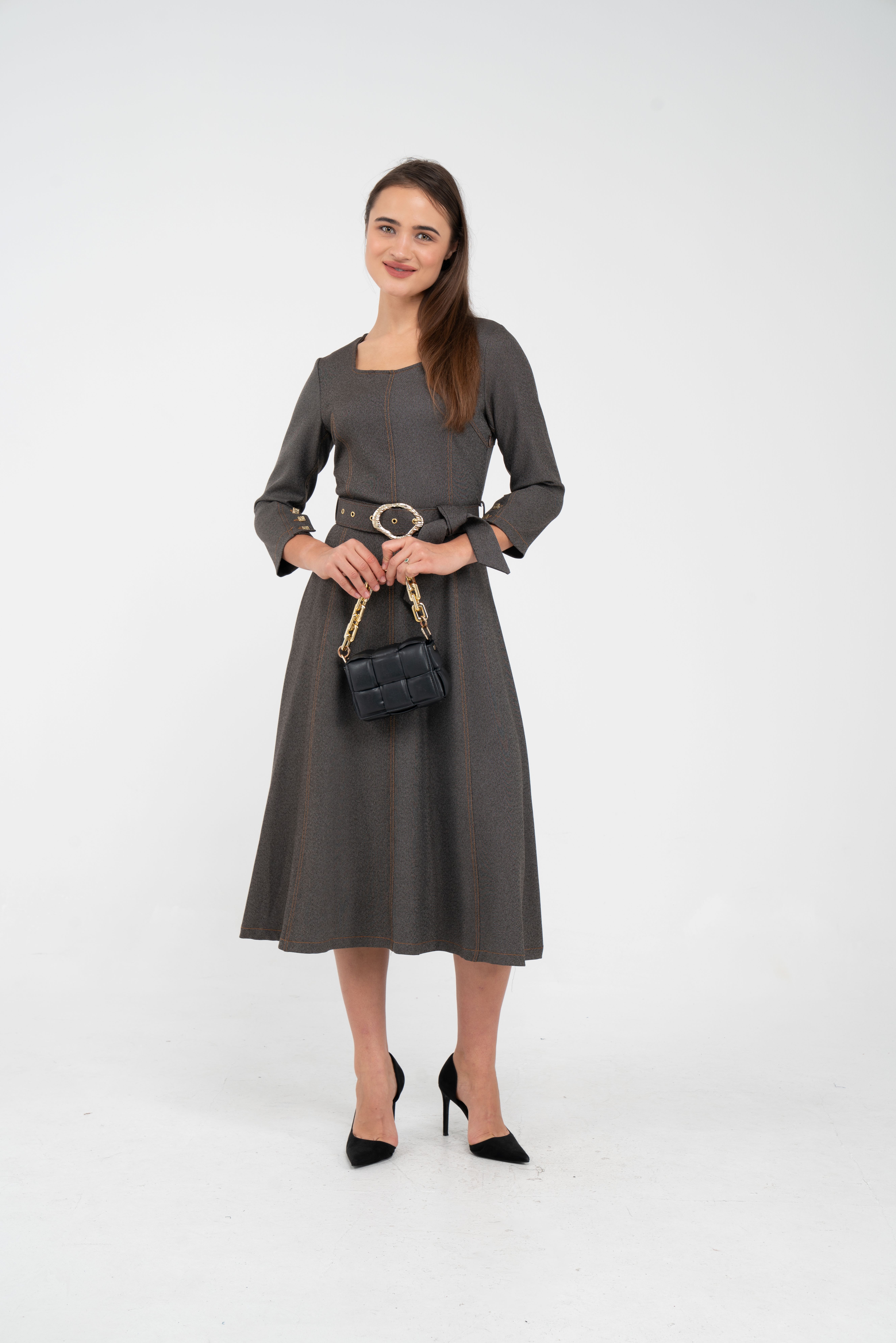 Bel kısmındaki altın tokalı kemer detayı vücut hatlarını zarifçe vurgularken, kalın kumaş dokusu sayesinde hem bahar hem de sonbahar mevsimlerinde rahatlıkla kullanılabilir.