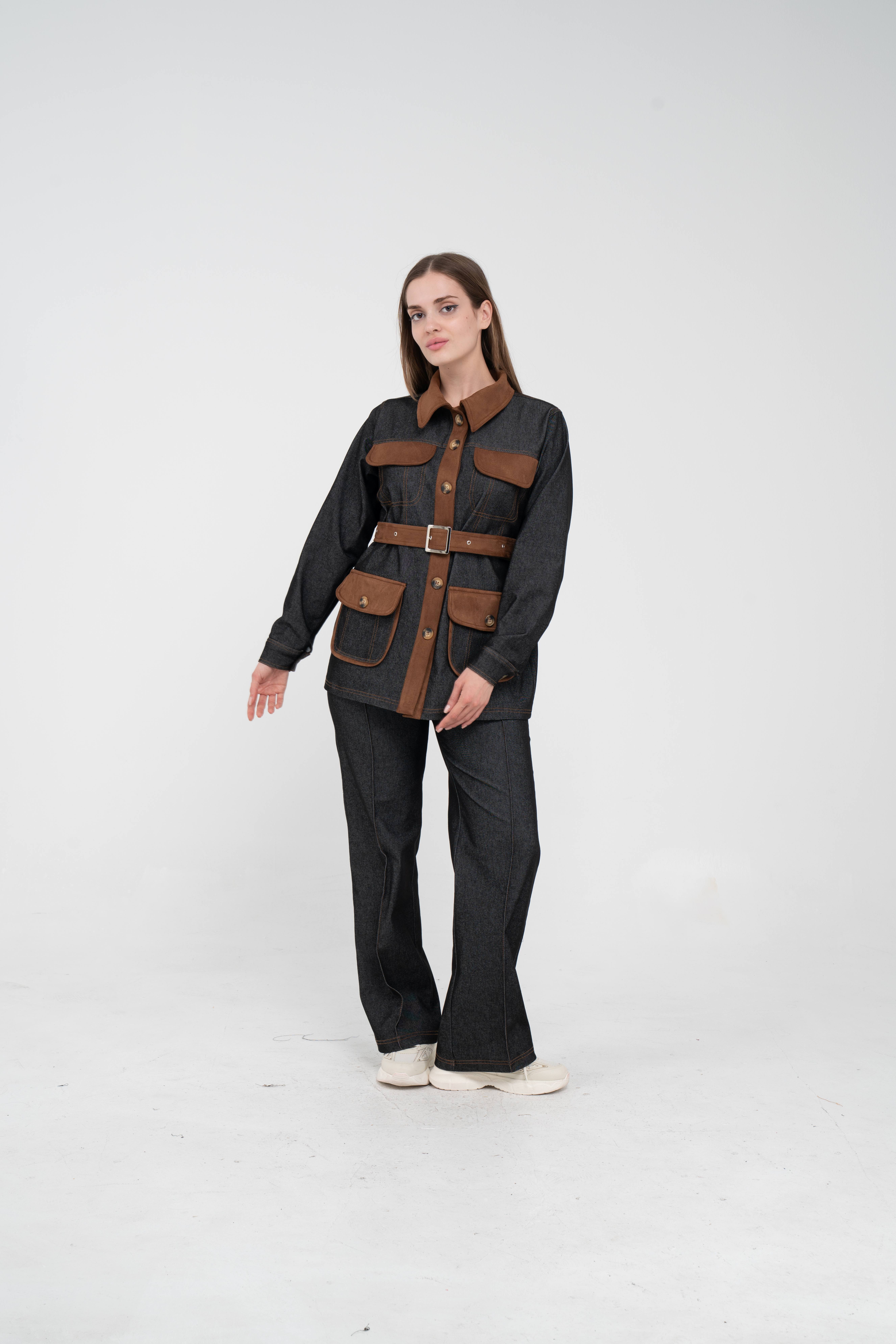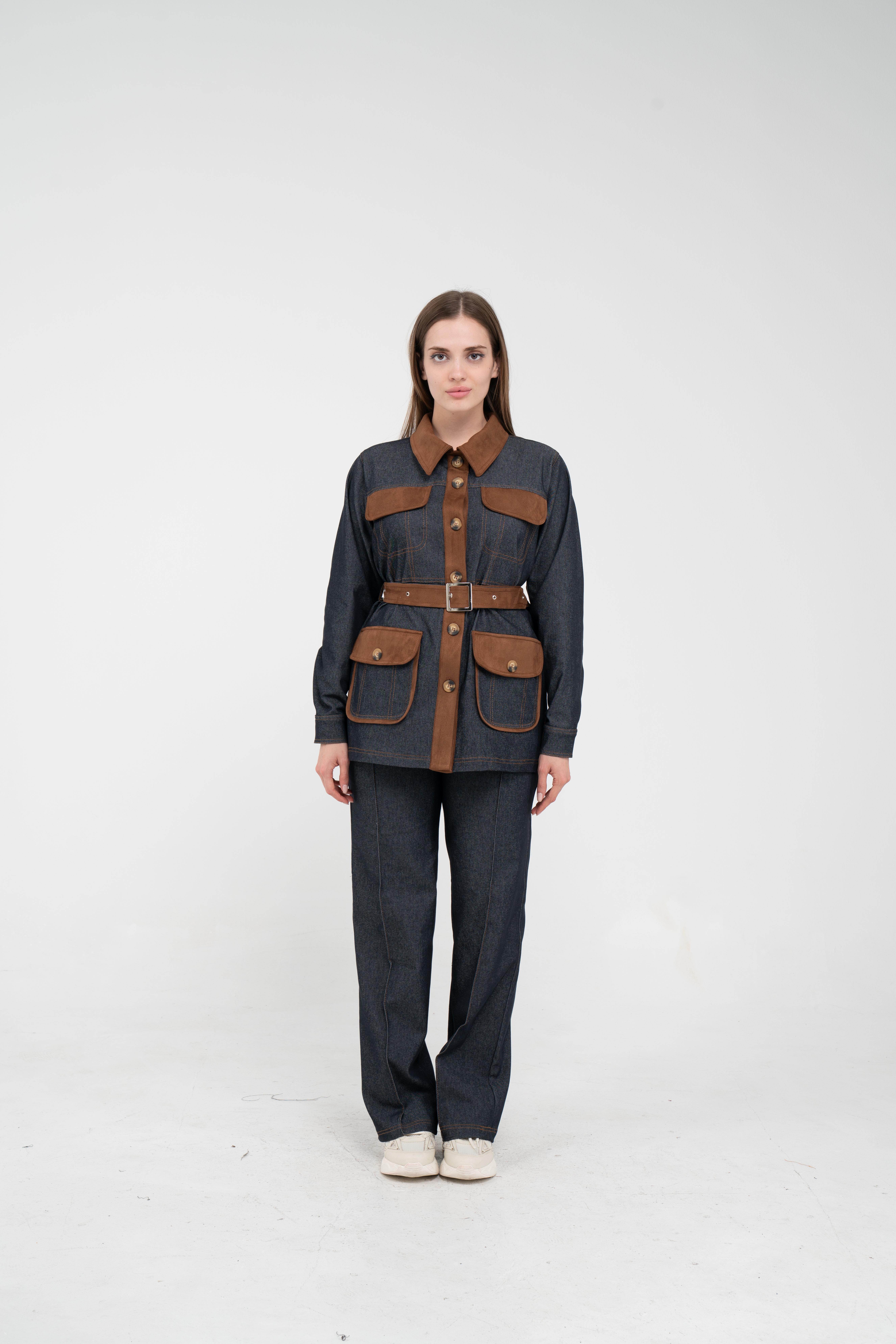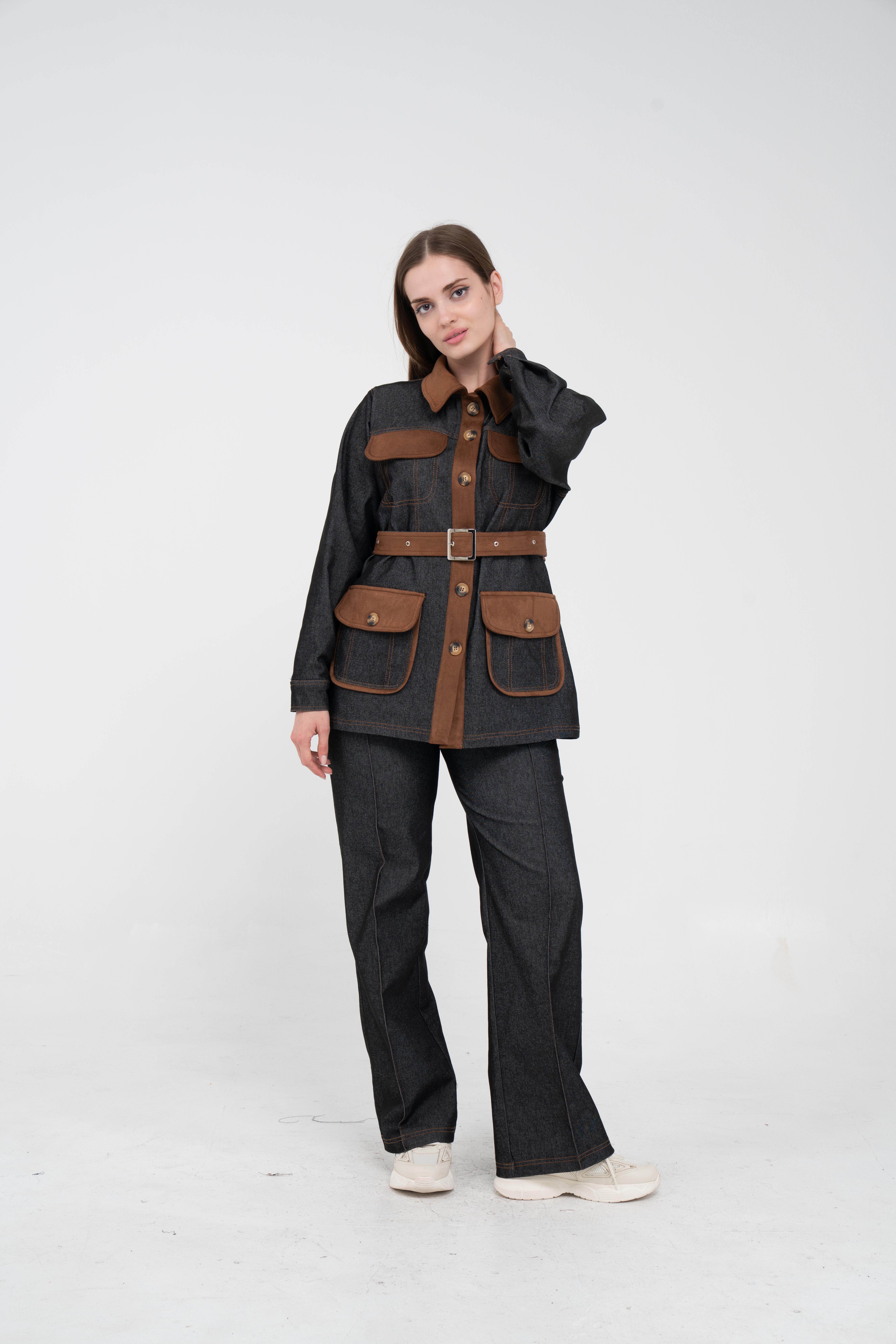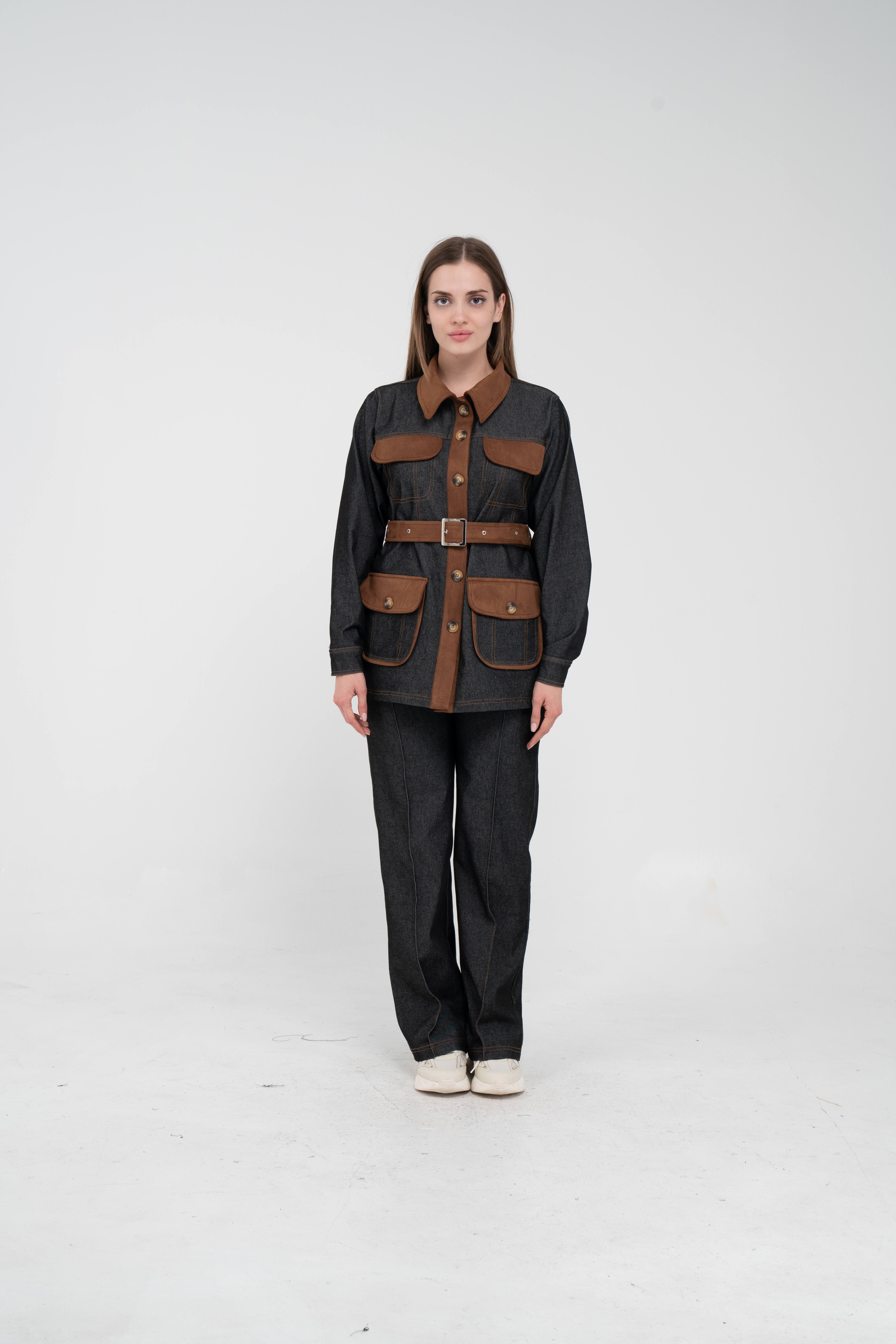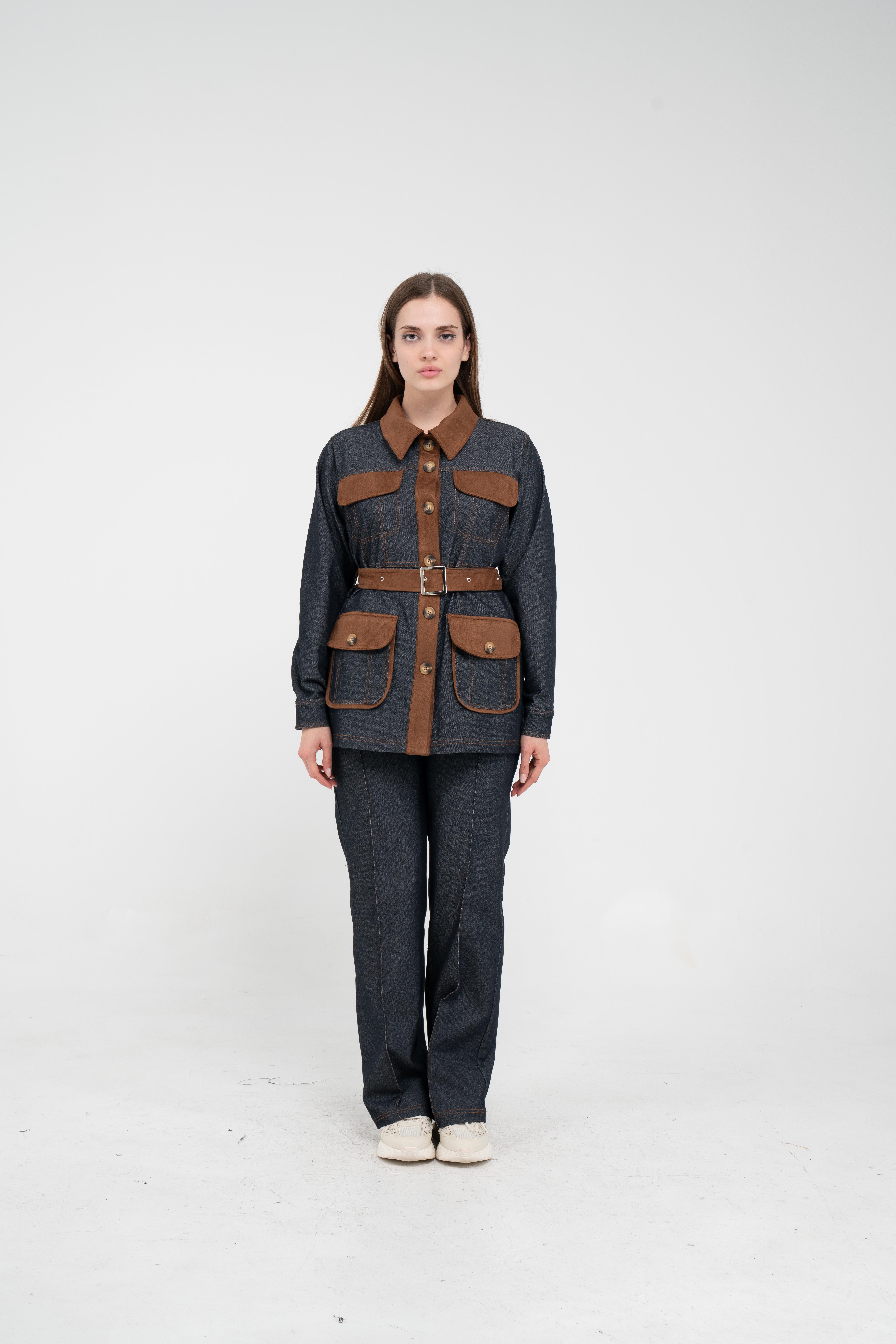 Gelince Haber VerÜst parça, kontrast cepler, düğme detayları ve tokalı kuşak tasarımıyla dikkat çekerken düzenli formu sayesinde vücudu daha derli toplu gösterir.