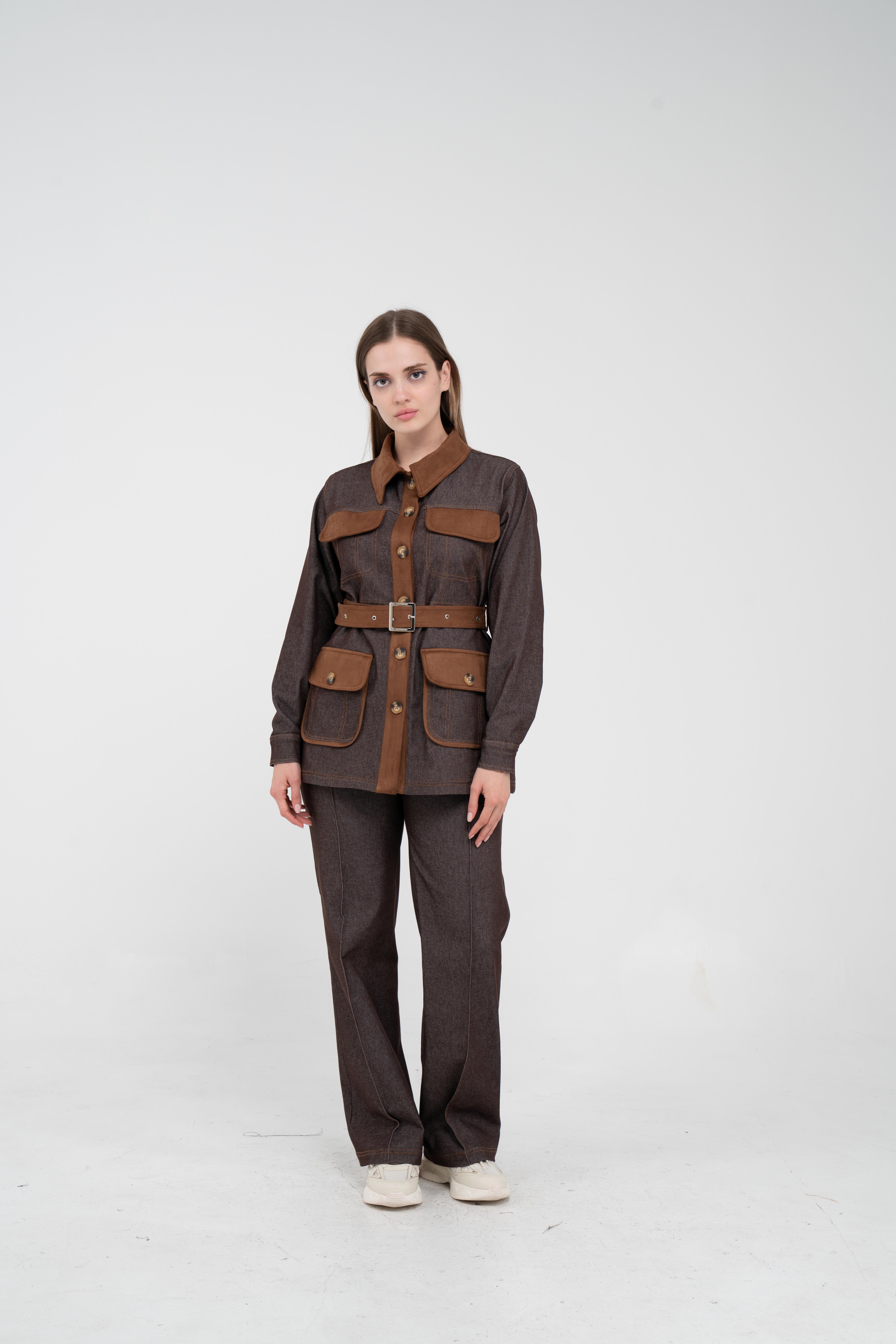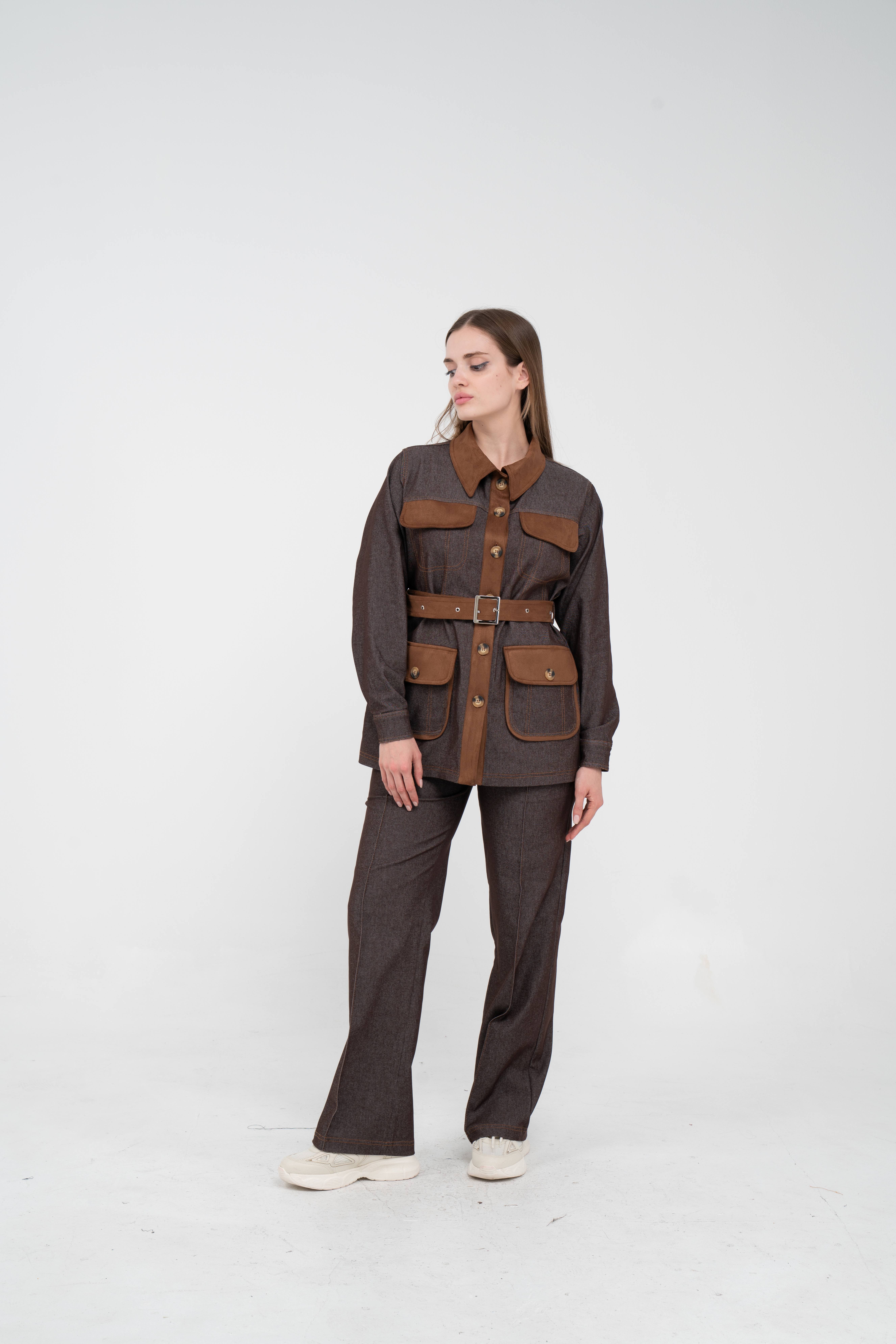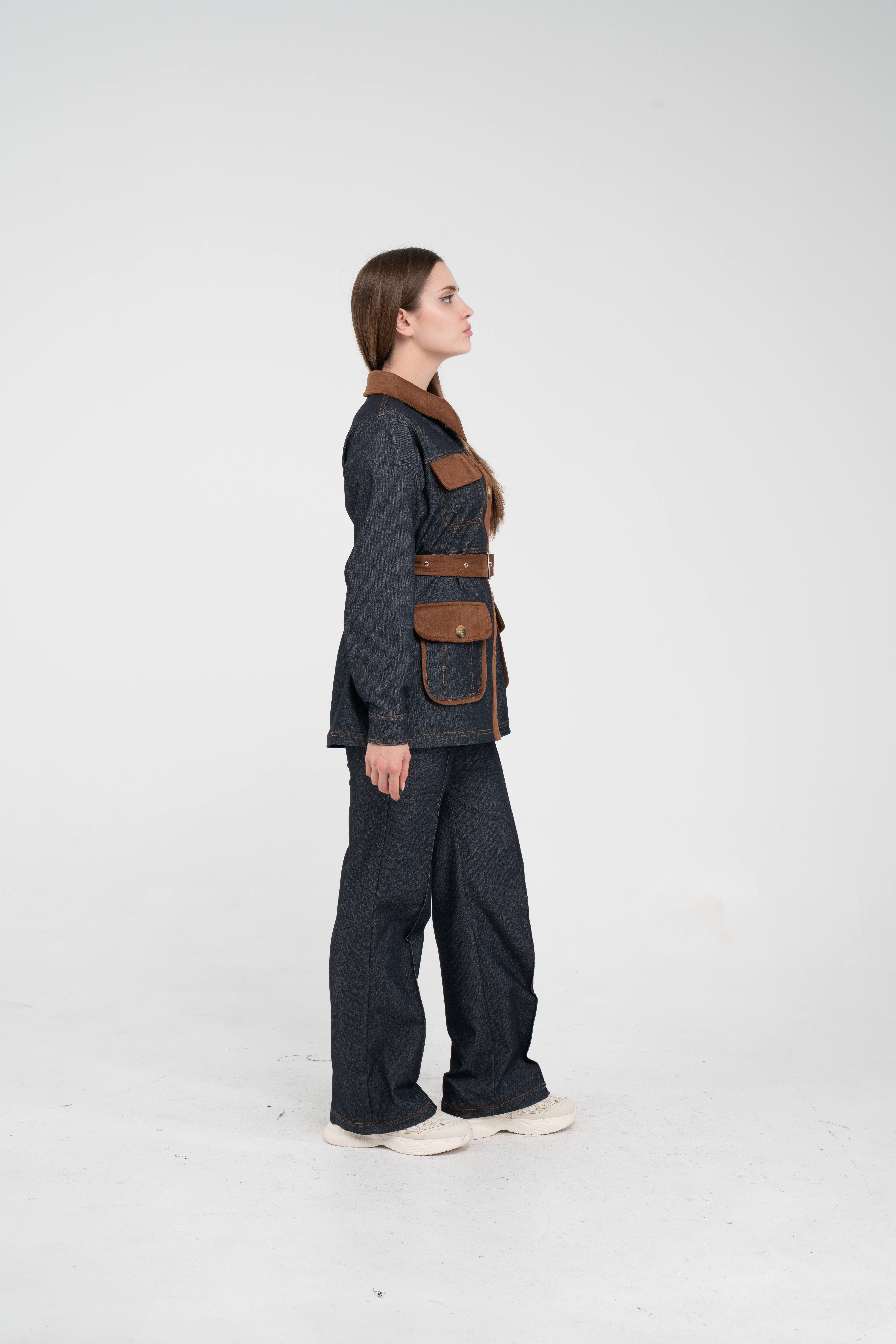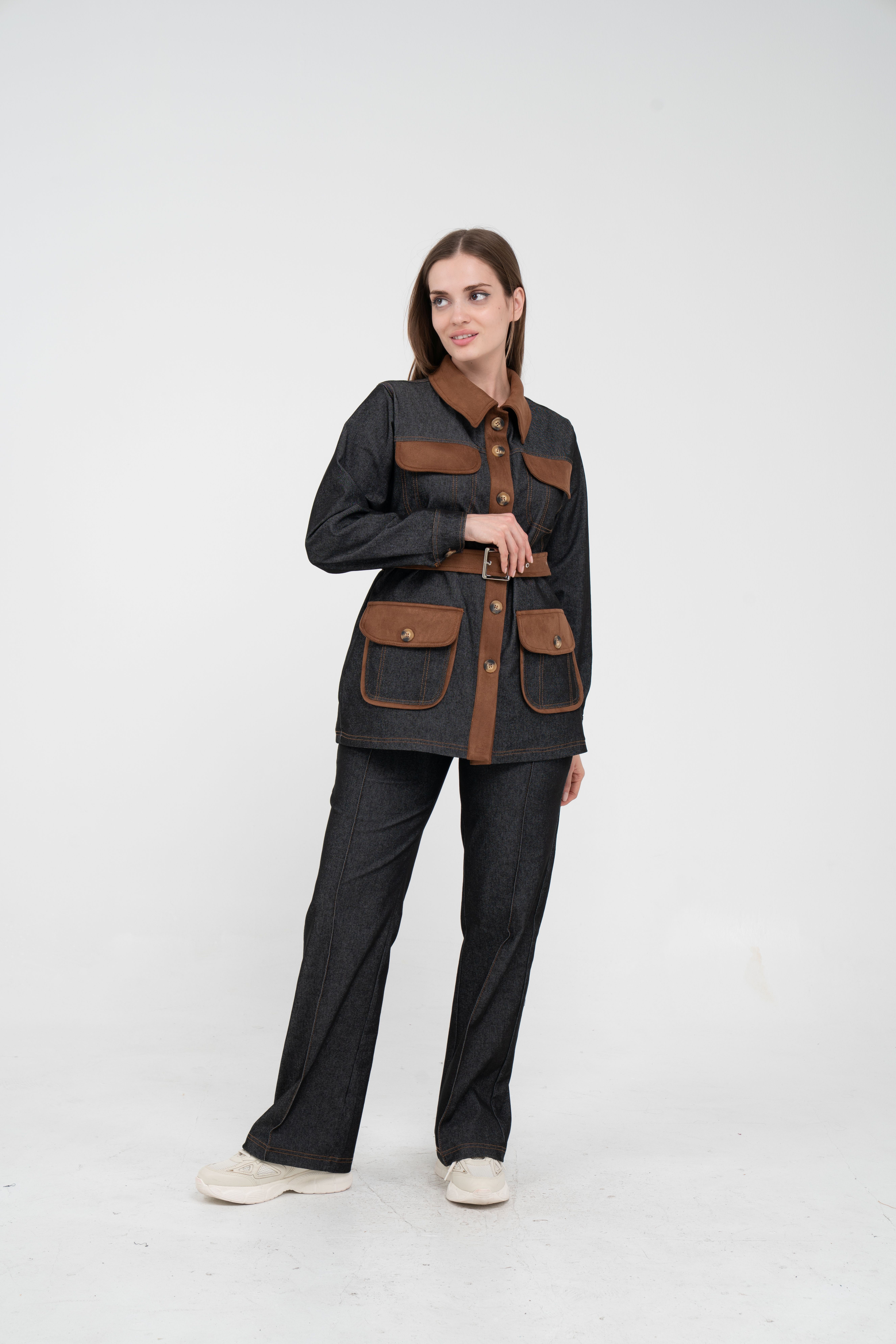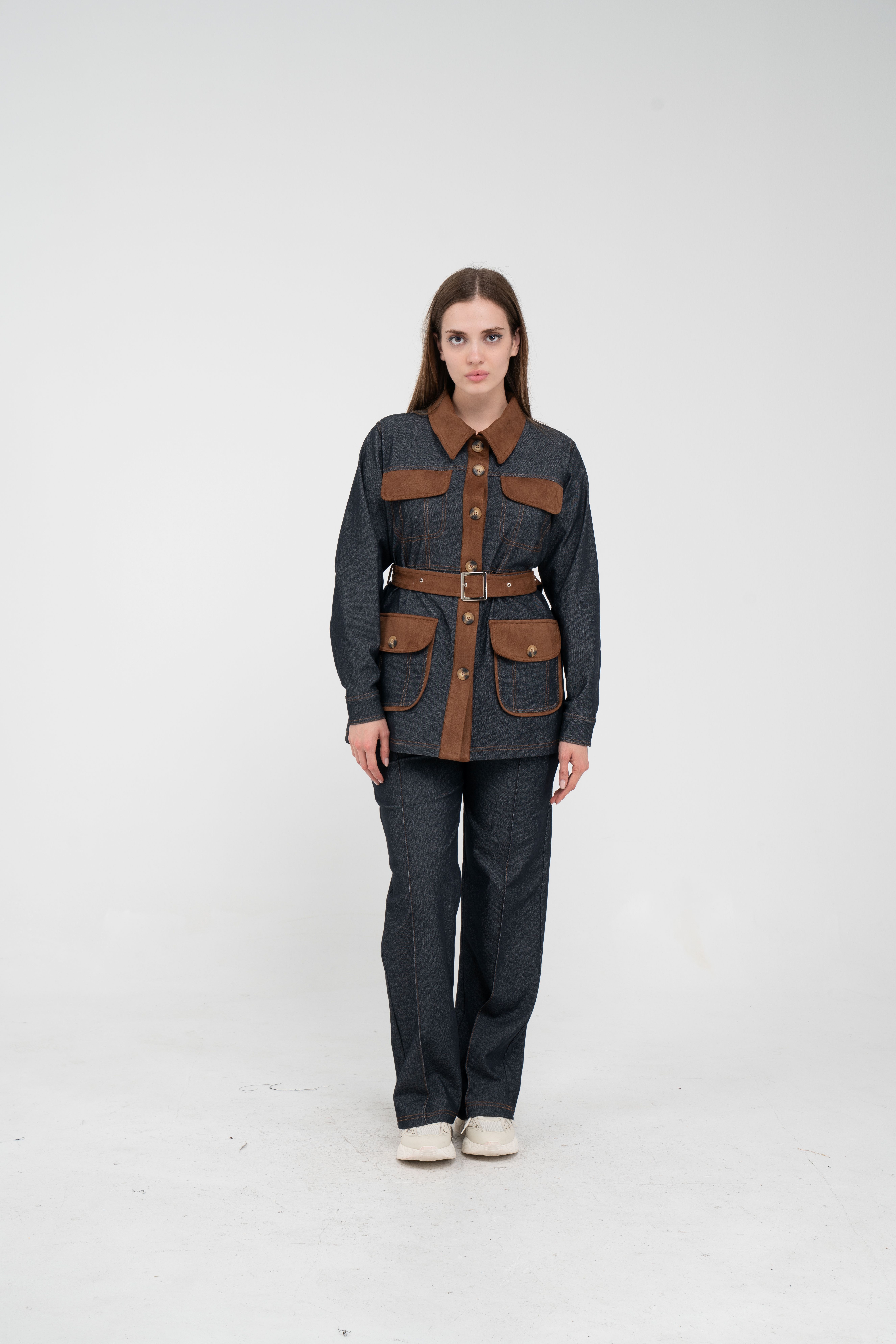 Gelince Haber VerÜst parça, kontrast cepler, düğme detayları ve tokalı kuşak tasarımıyla dikkat çekerken düzenli formu sayesinde vücudu daha derli toplu gösterir.