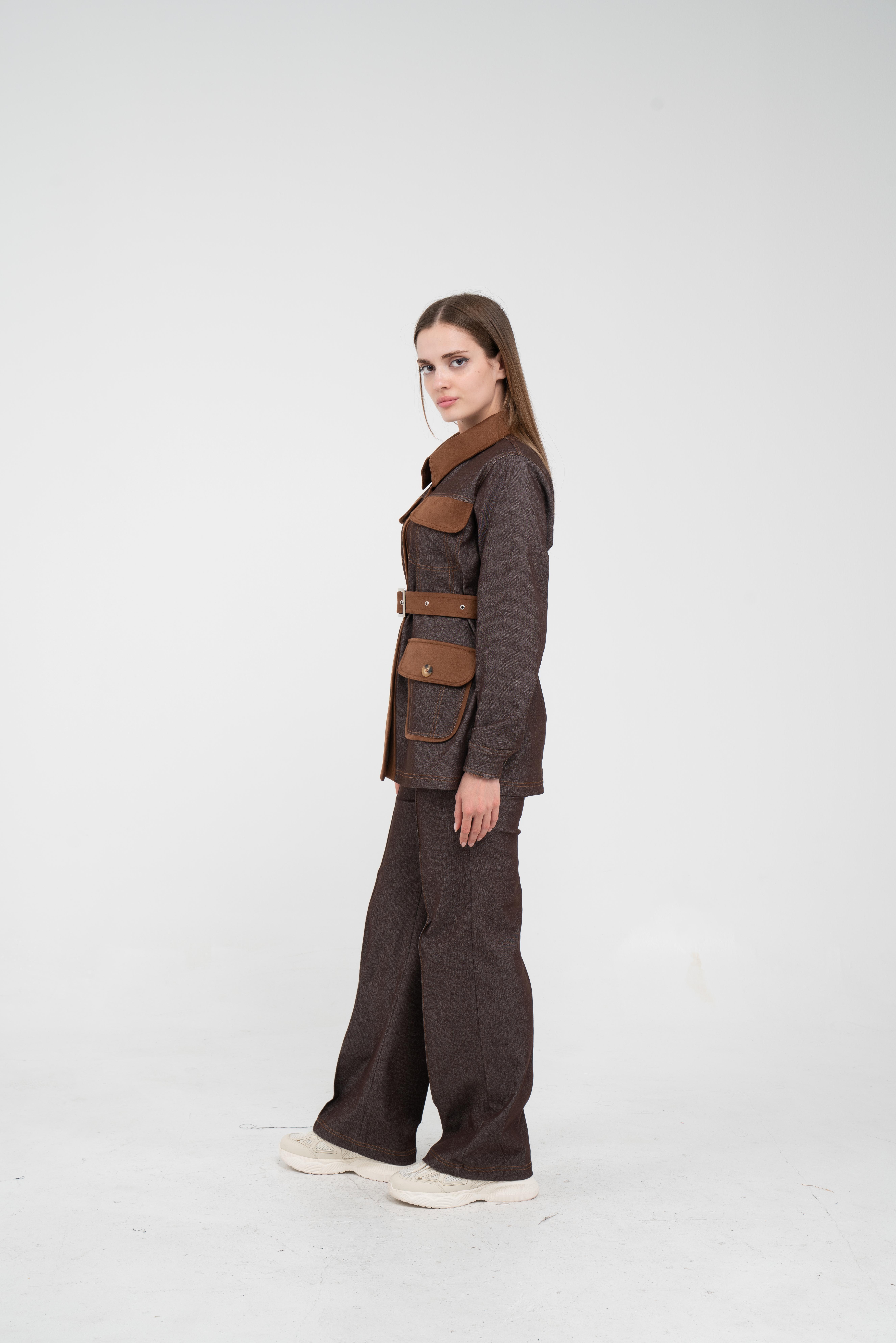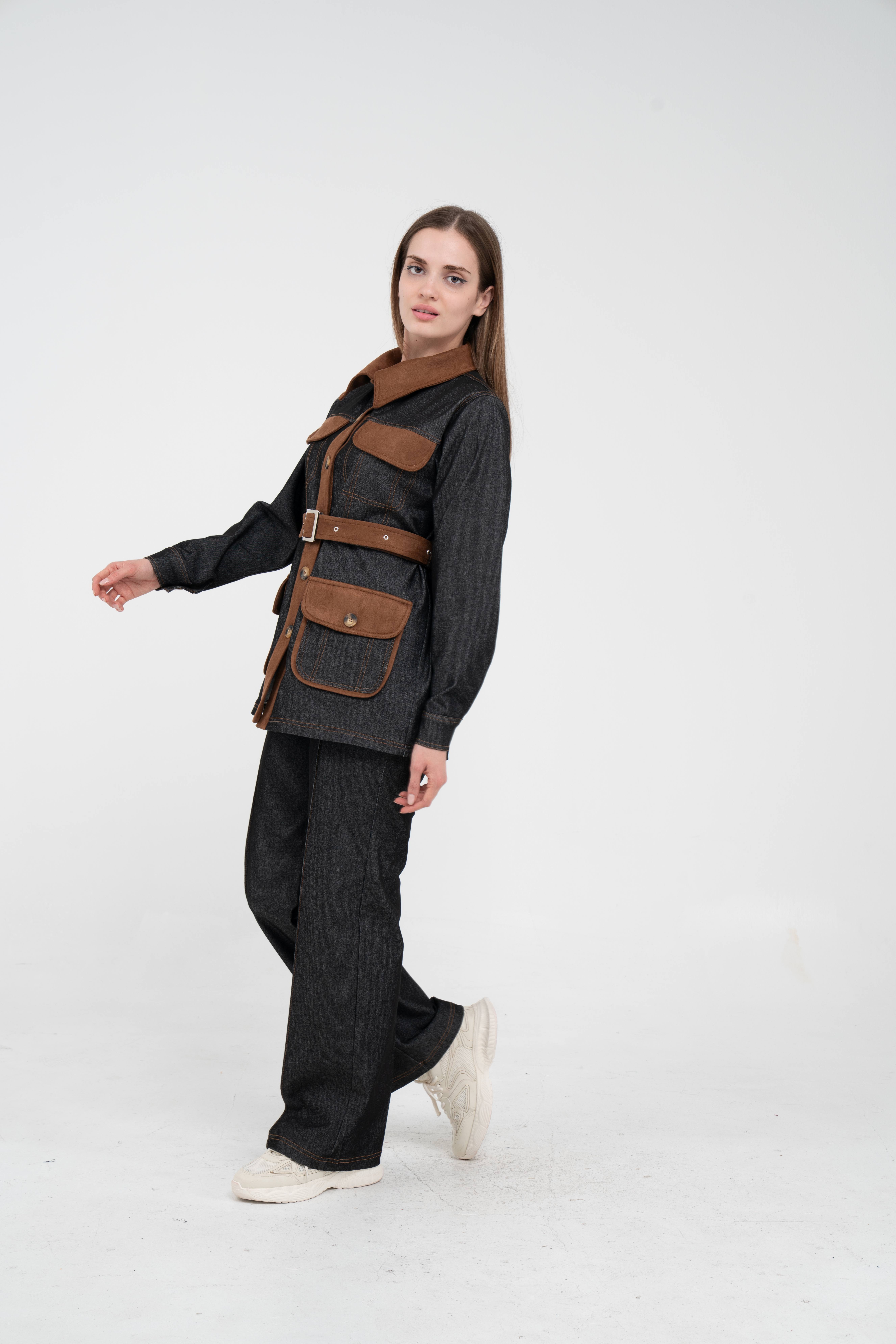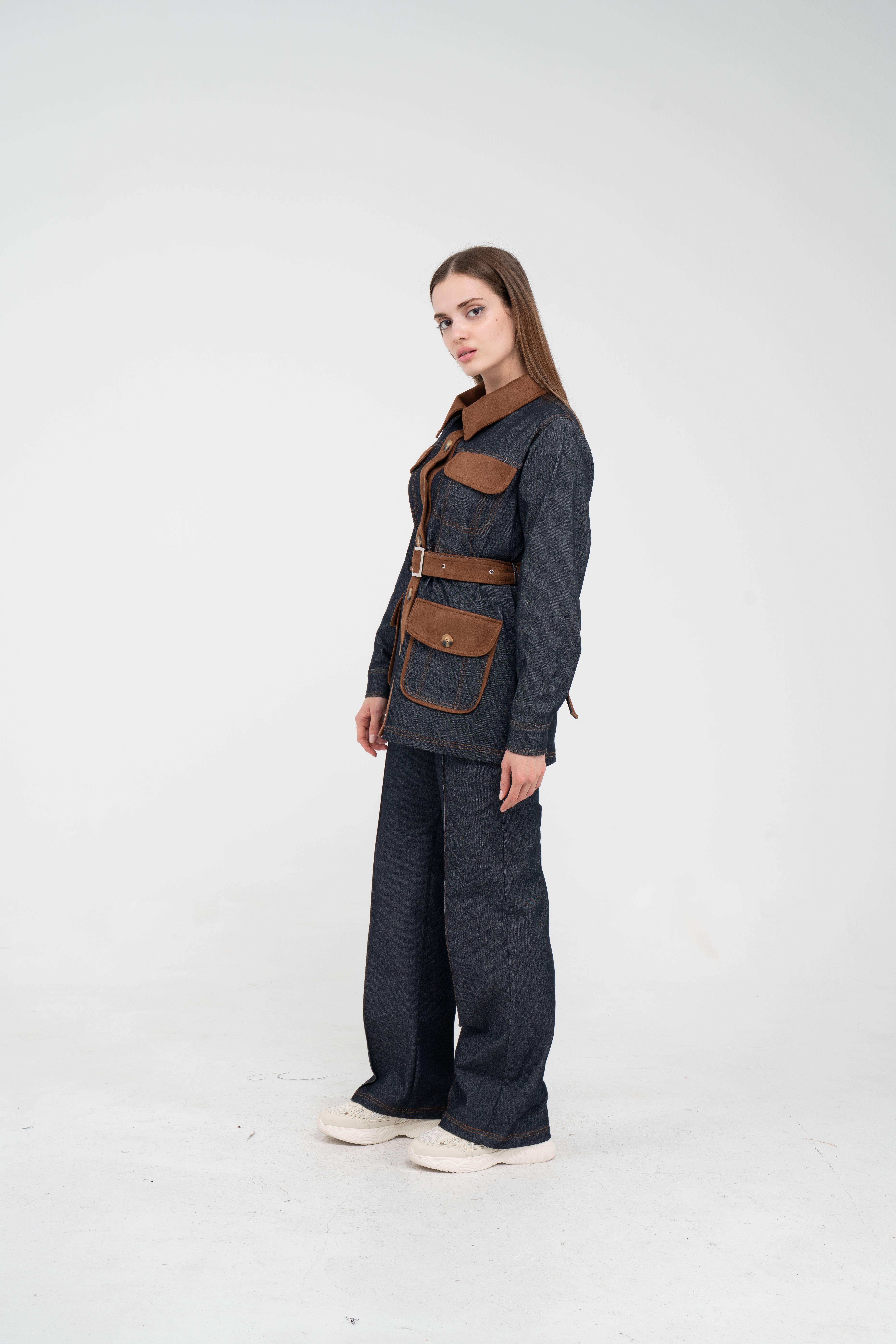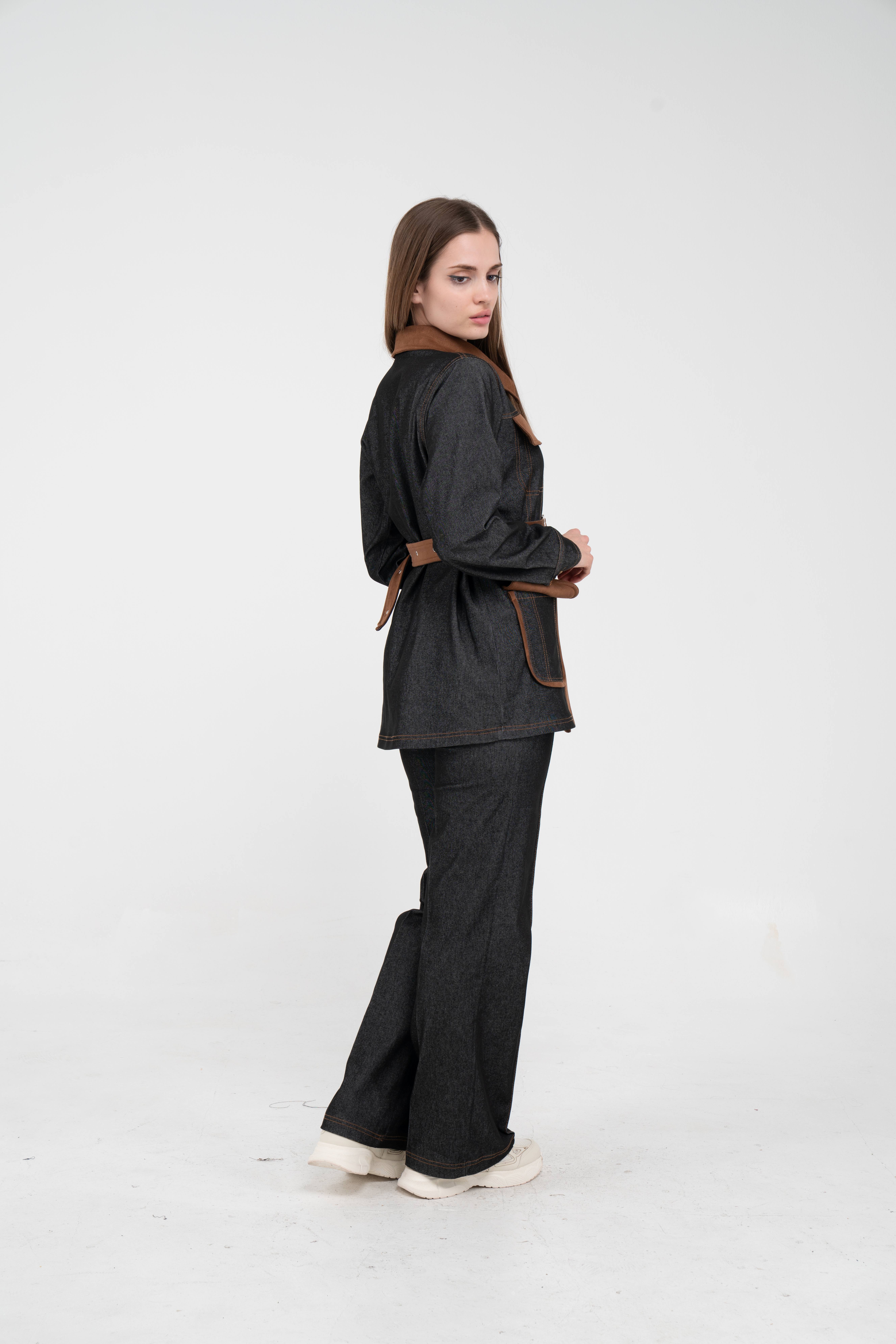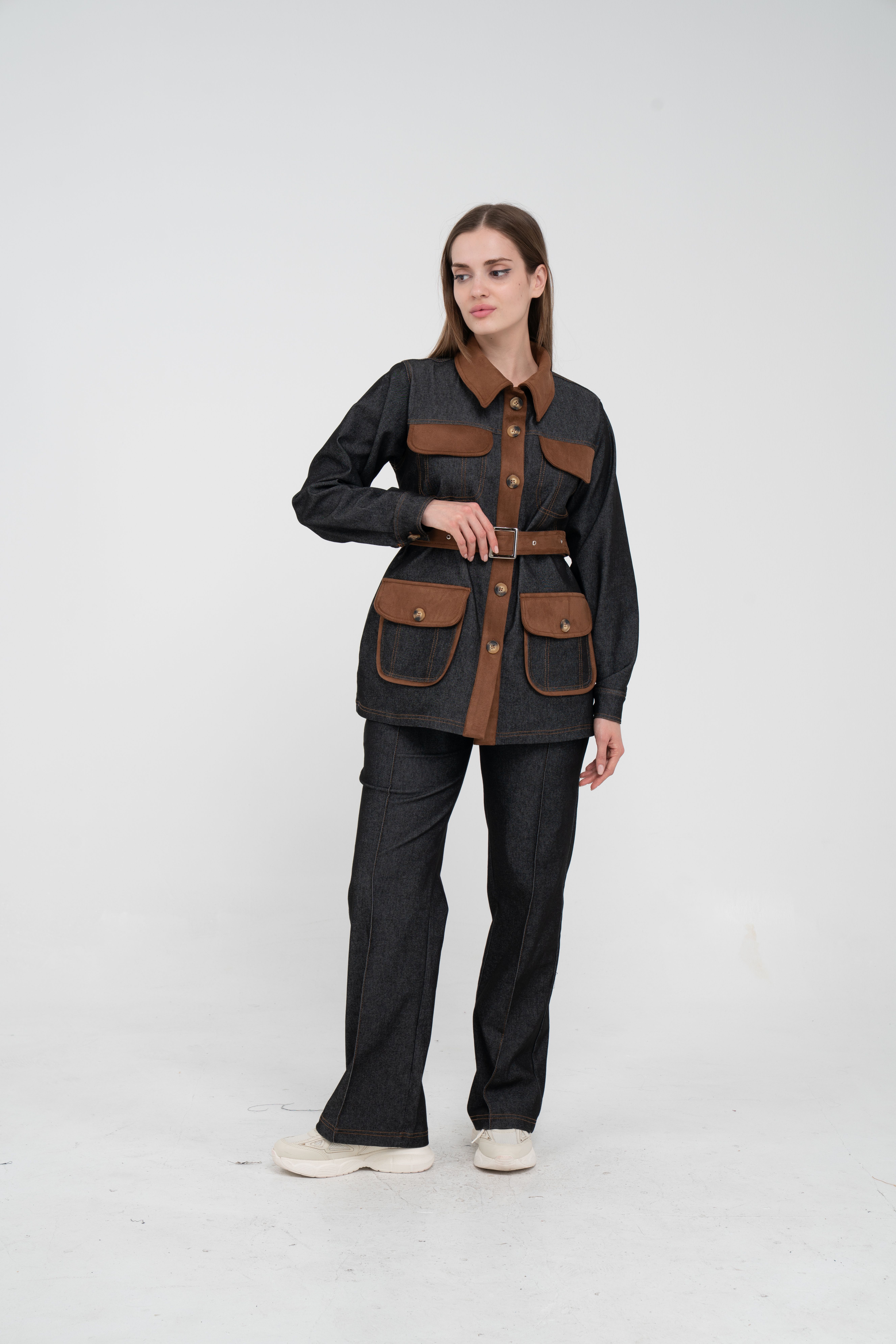Gelince Haber VerÜst parça, kontrast cepler, düğme detayları ve tokalı kuşak tasarımıyla dikkat çekerken düzenli formu sayesinde vücudu daha derli toplu gösterir.