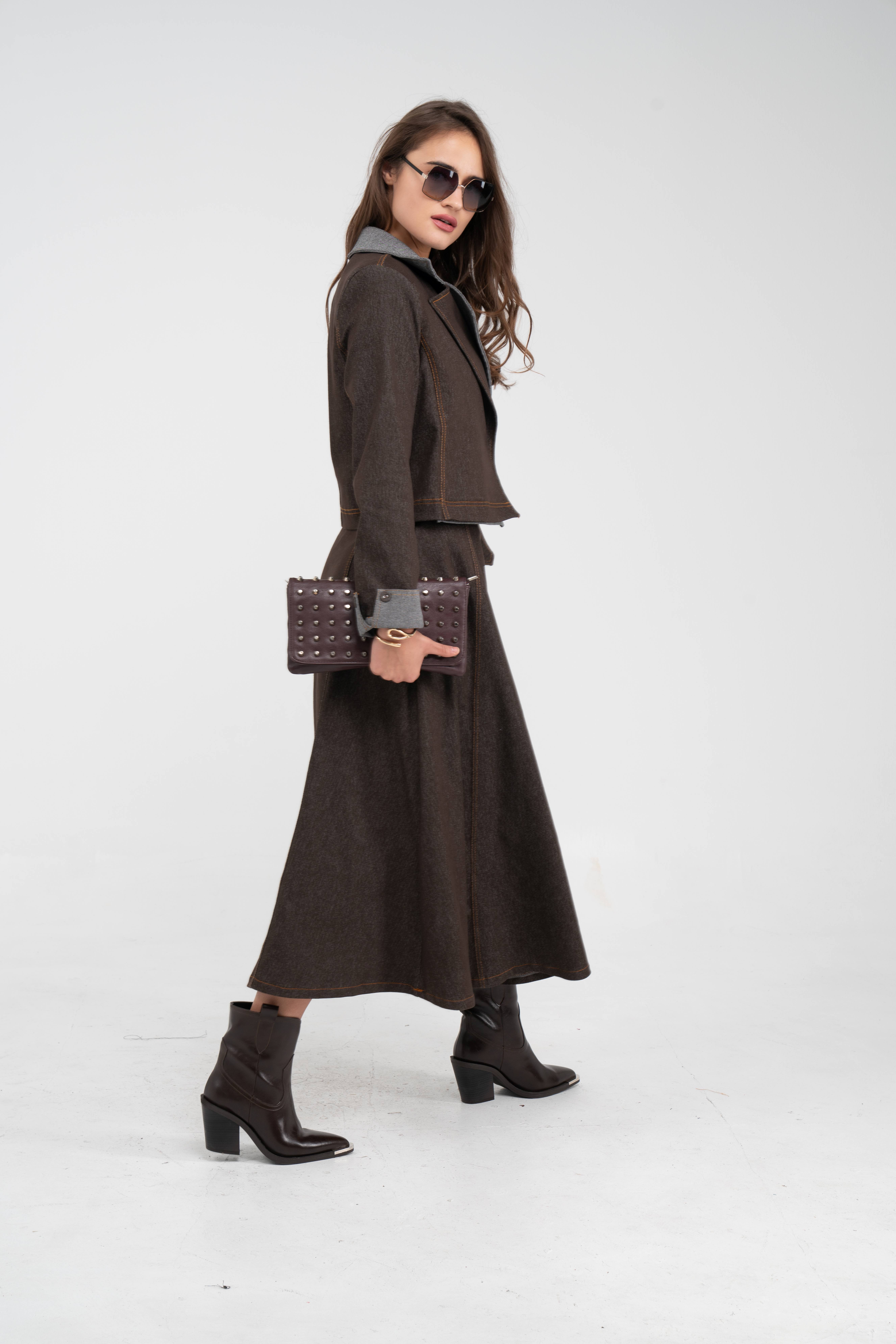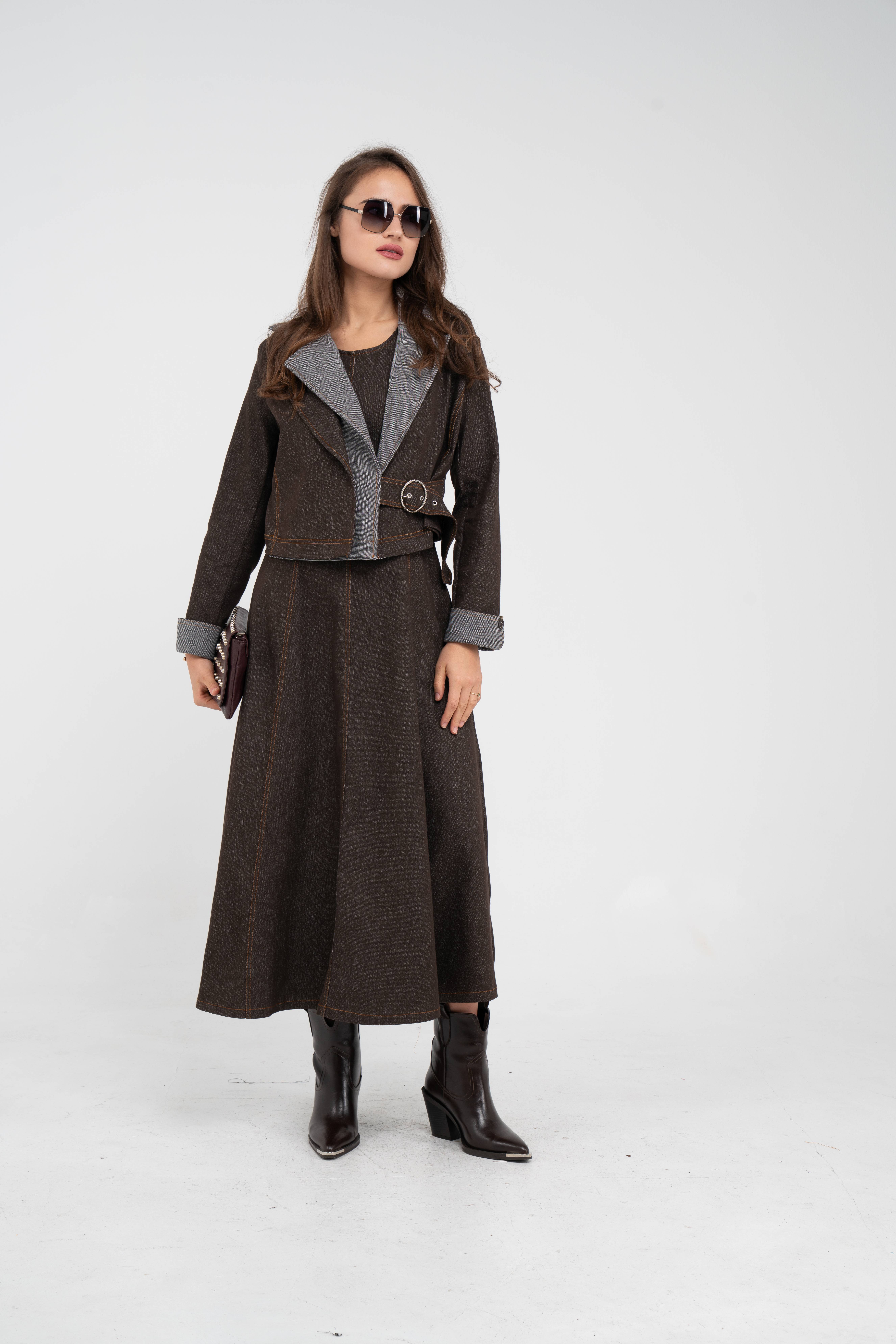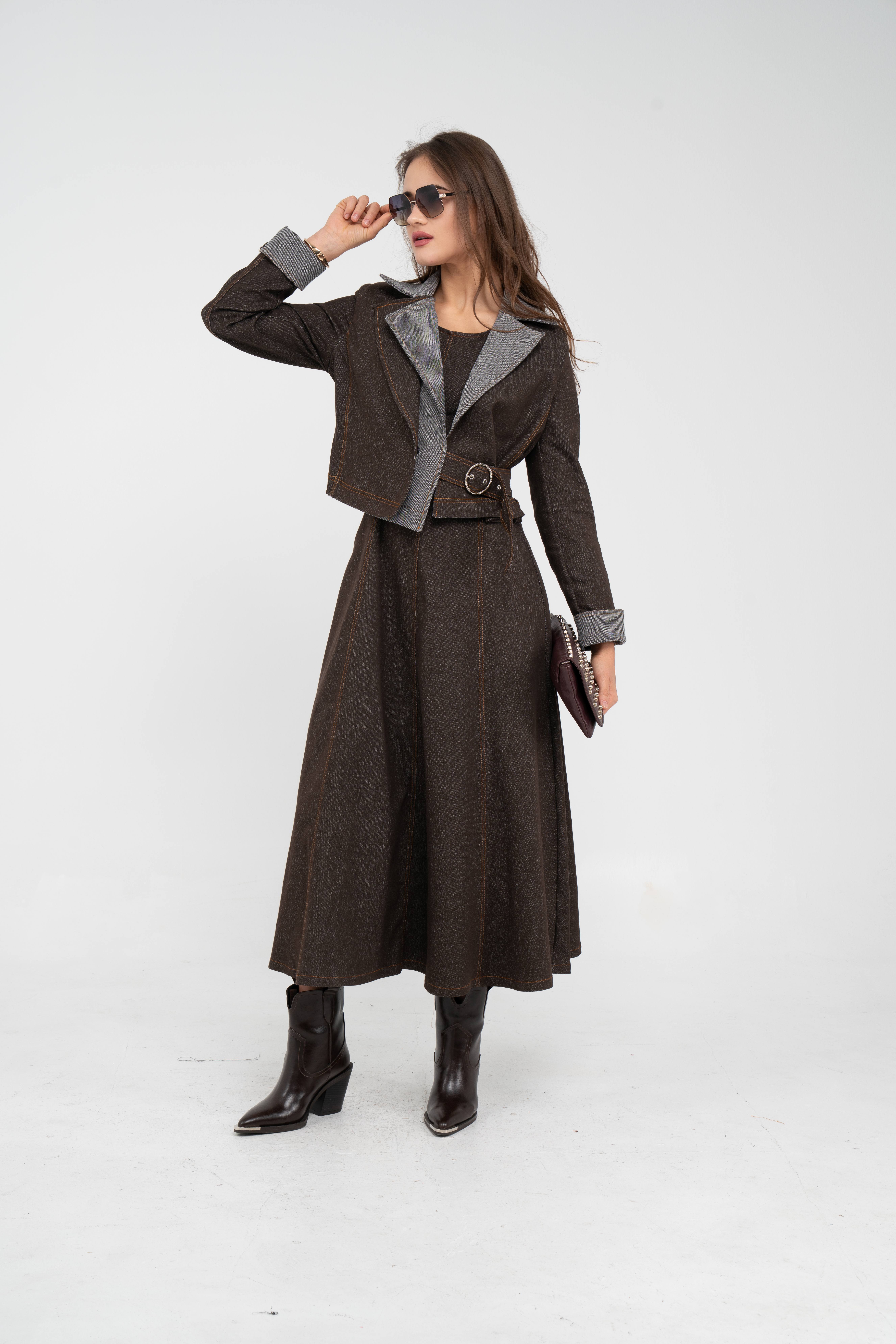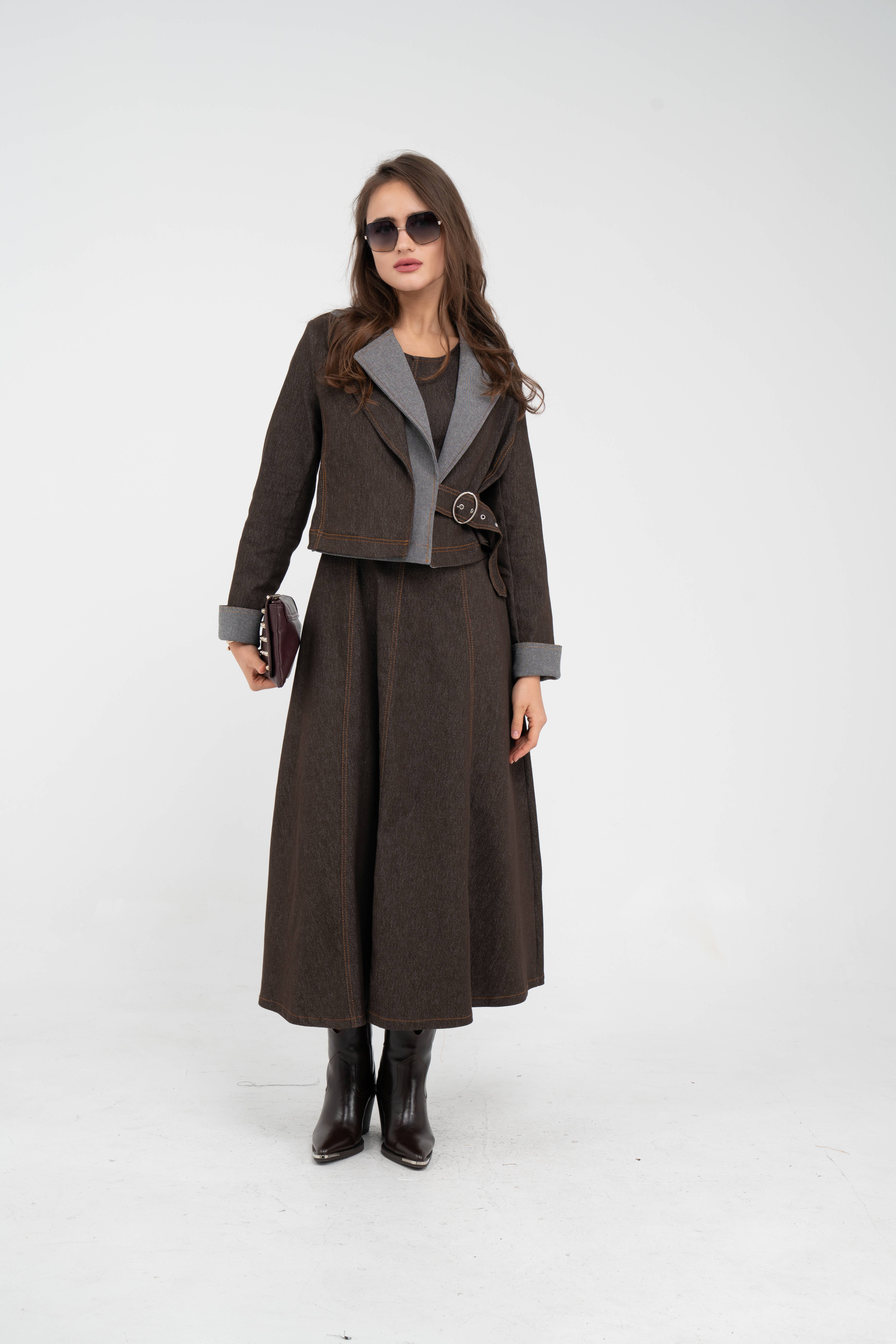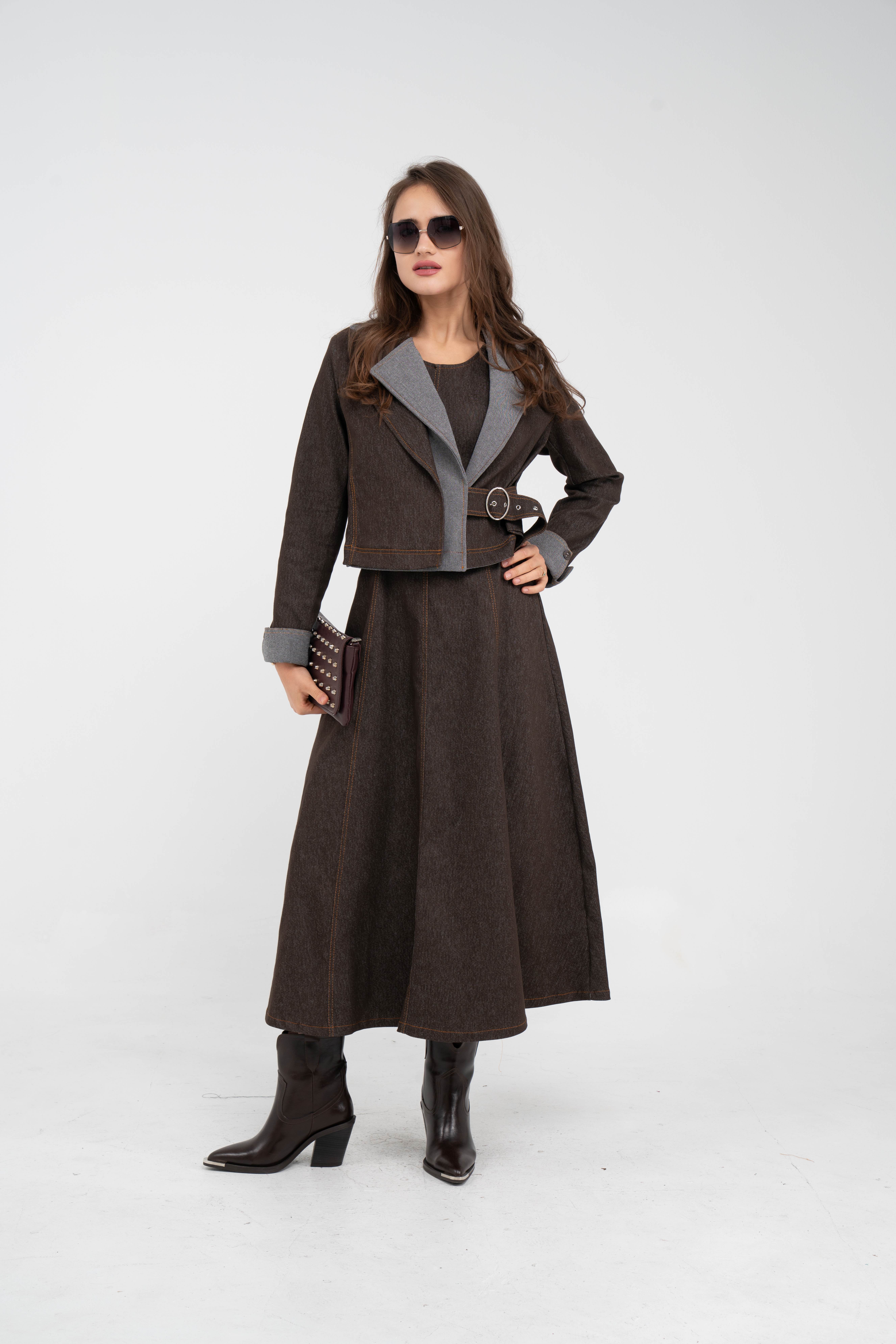 Alt parça ise akıcı kesime sahip uzun elbisesiyle rahat ve şık bir görünüm oluşturur. Kumaşın dokusu, formu düzgün bir şekilde koruyarak hem günlük kullanıma hem de özel gün stiline uyum sağlar. Topuklu botlar ve minimal aksesuarlarla tamamlandığında sofistike bir tarz ortaya çıkar.