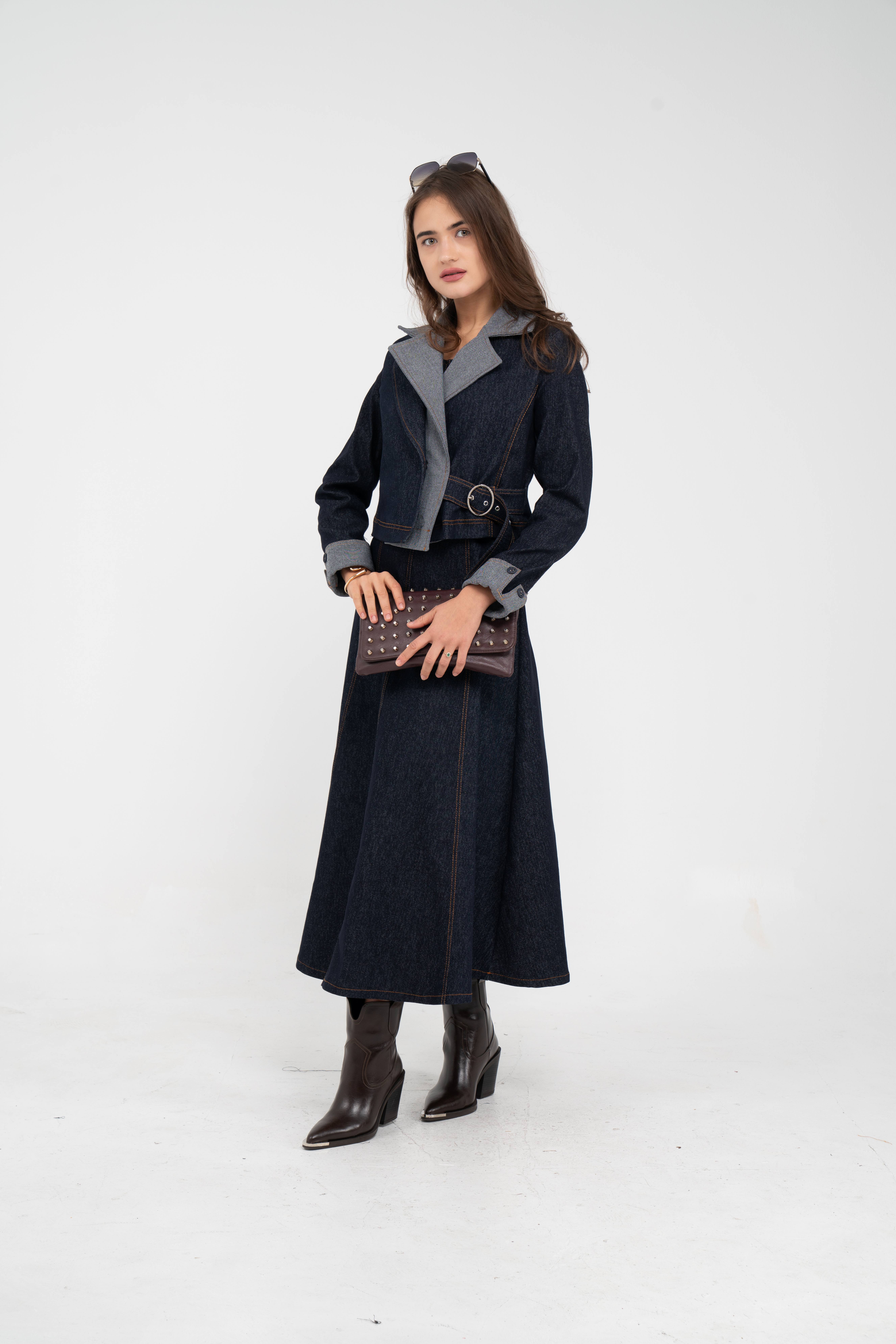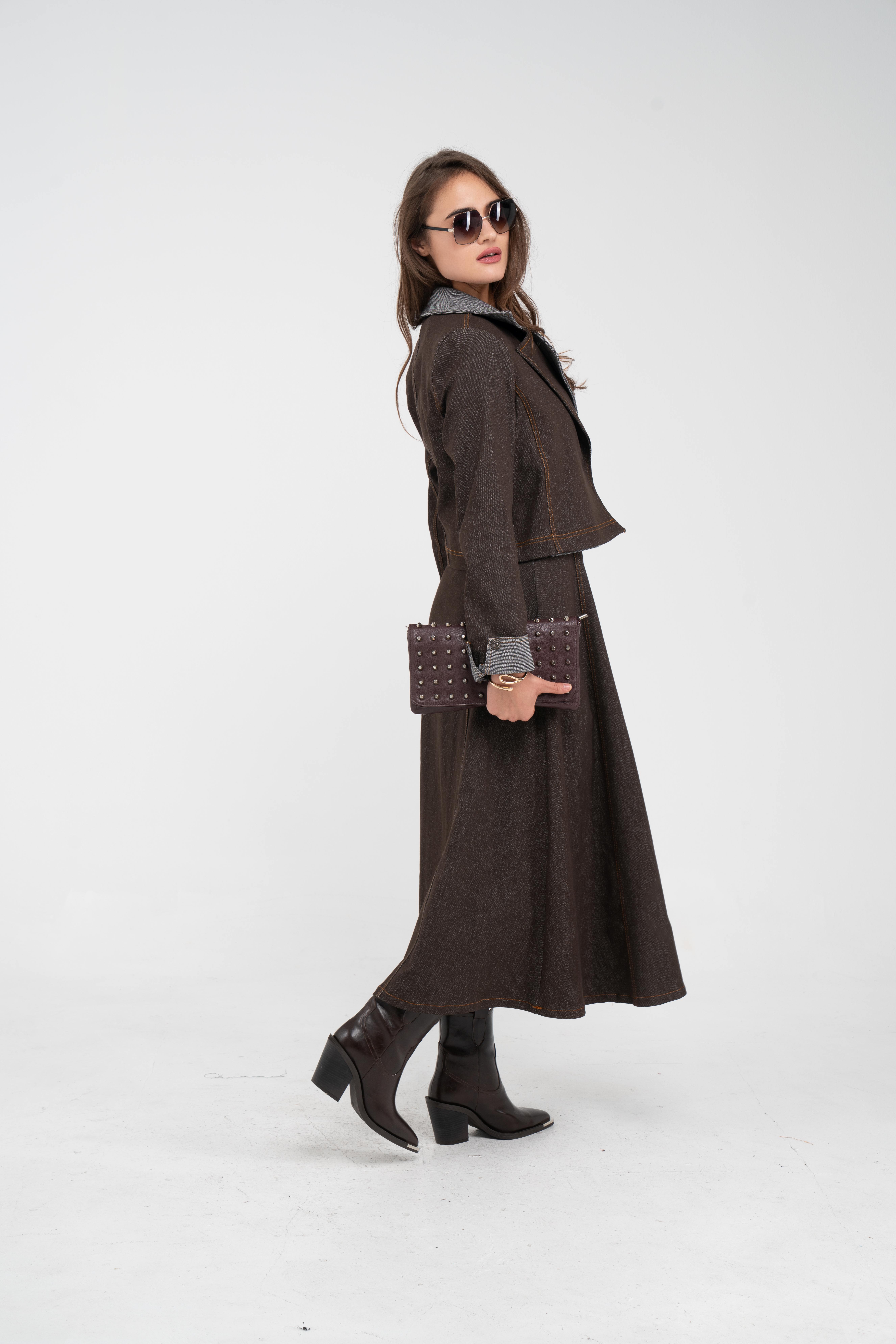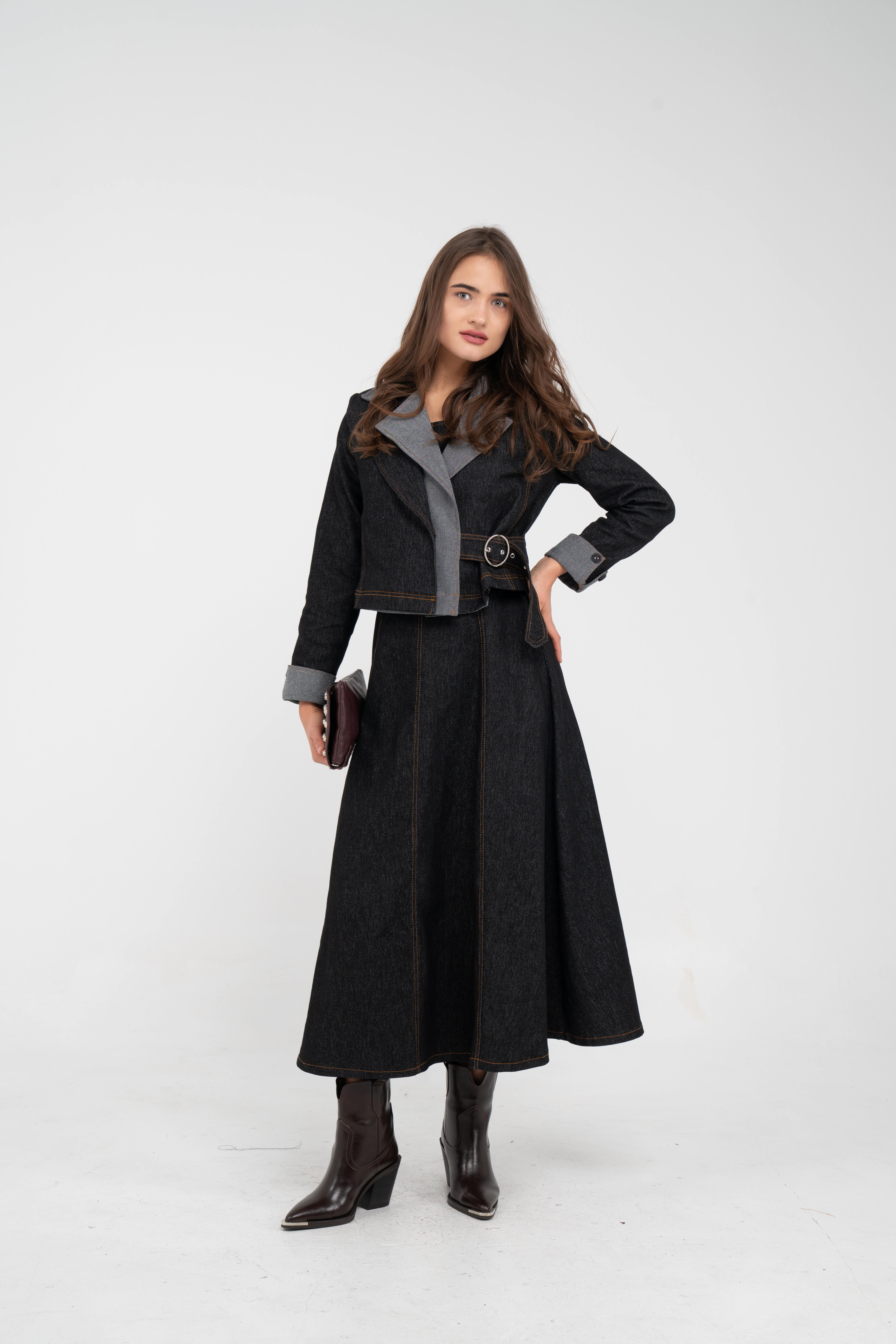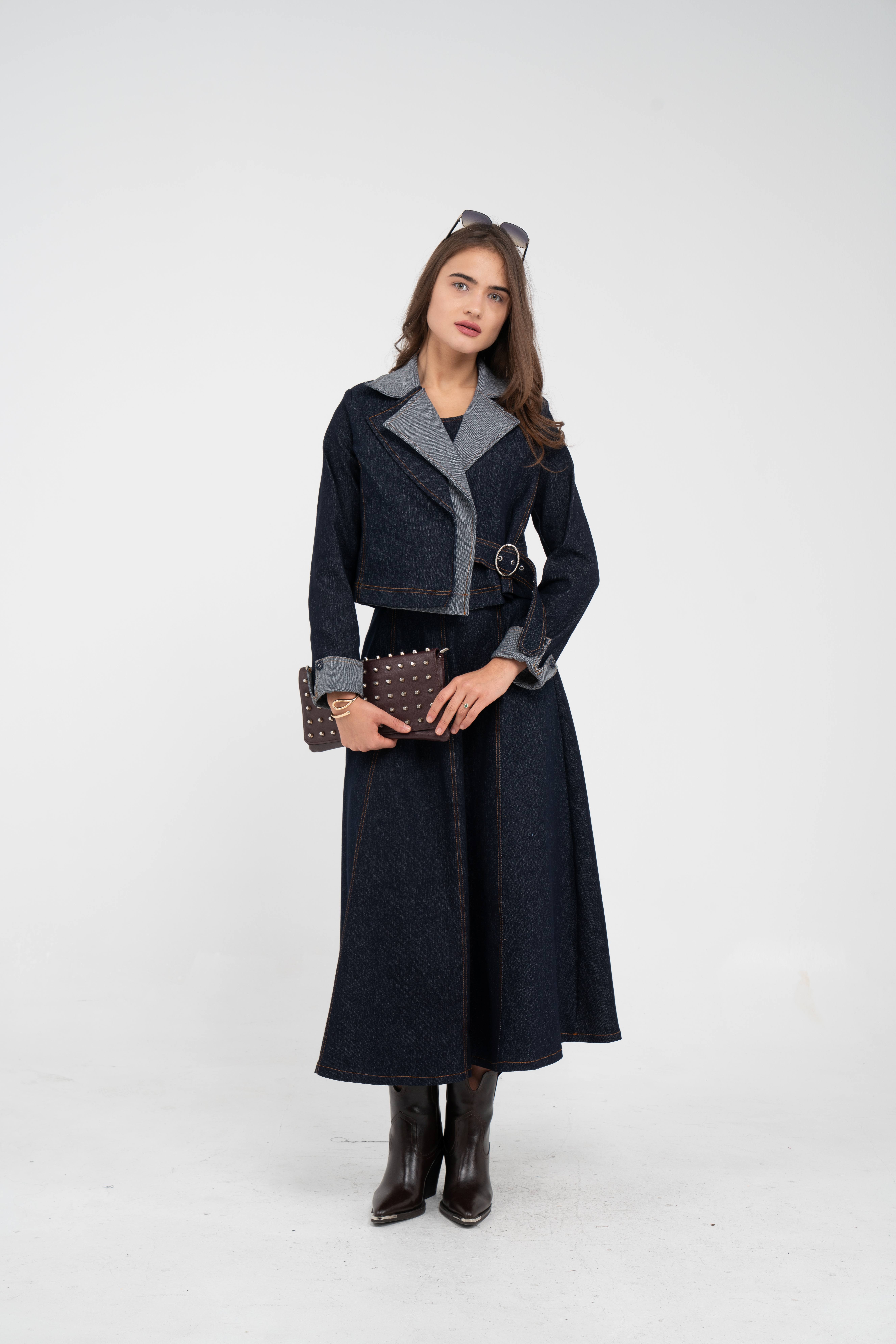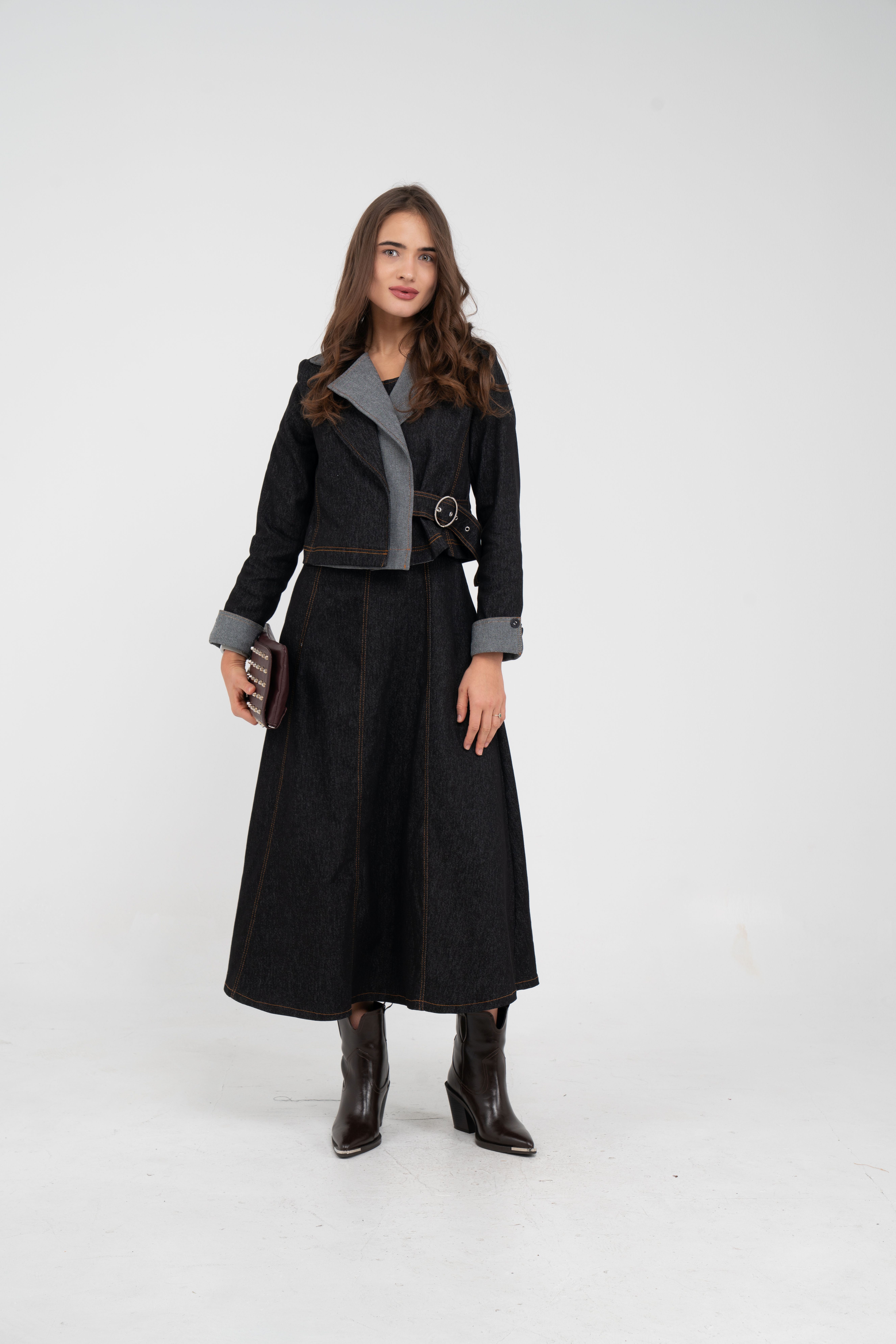 Alt parça ise akıcı kesime sahip uzun elbisesiyle rahat ve şık bir görünüm oluşturur. Kumaşın dokusu, formu düzgün bir şekilde koruyarak hem günlük kullanıma hem de özel gün stiline uyum sağlar. Topuklu botlar ve minimal aksesuarlarla tamamlandığında sofistike bir tarz ortaya çıkar.