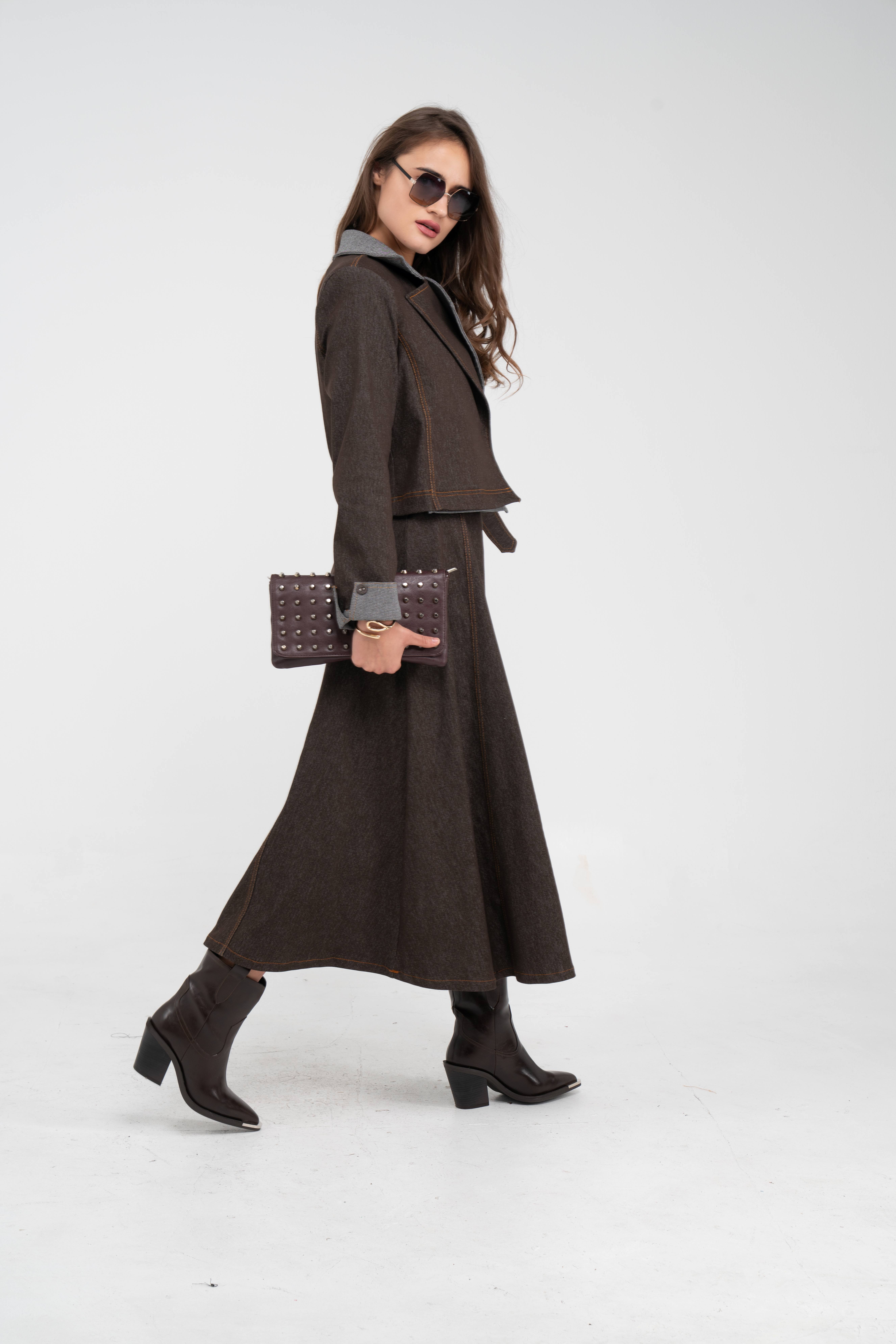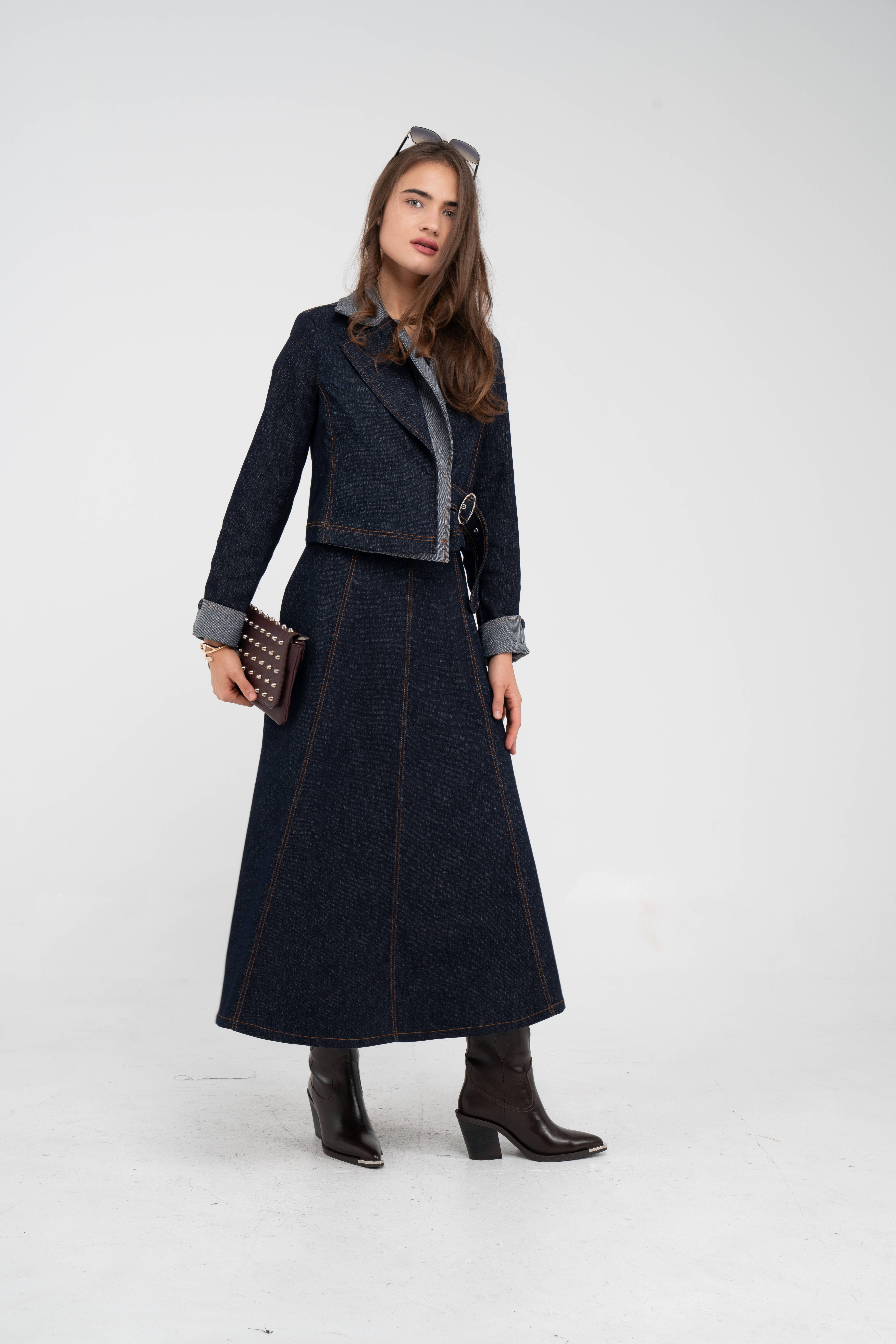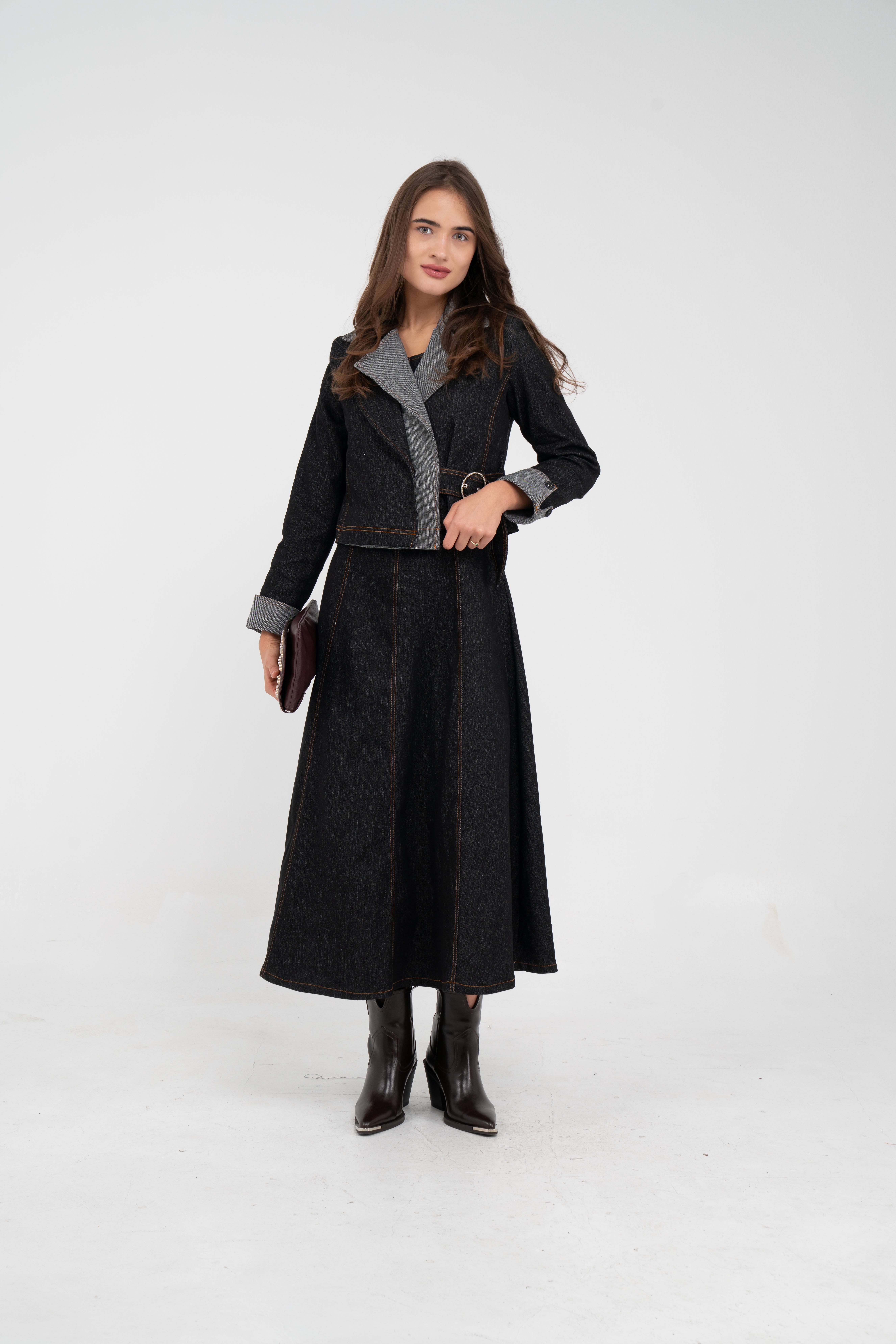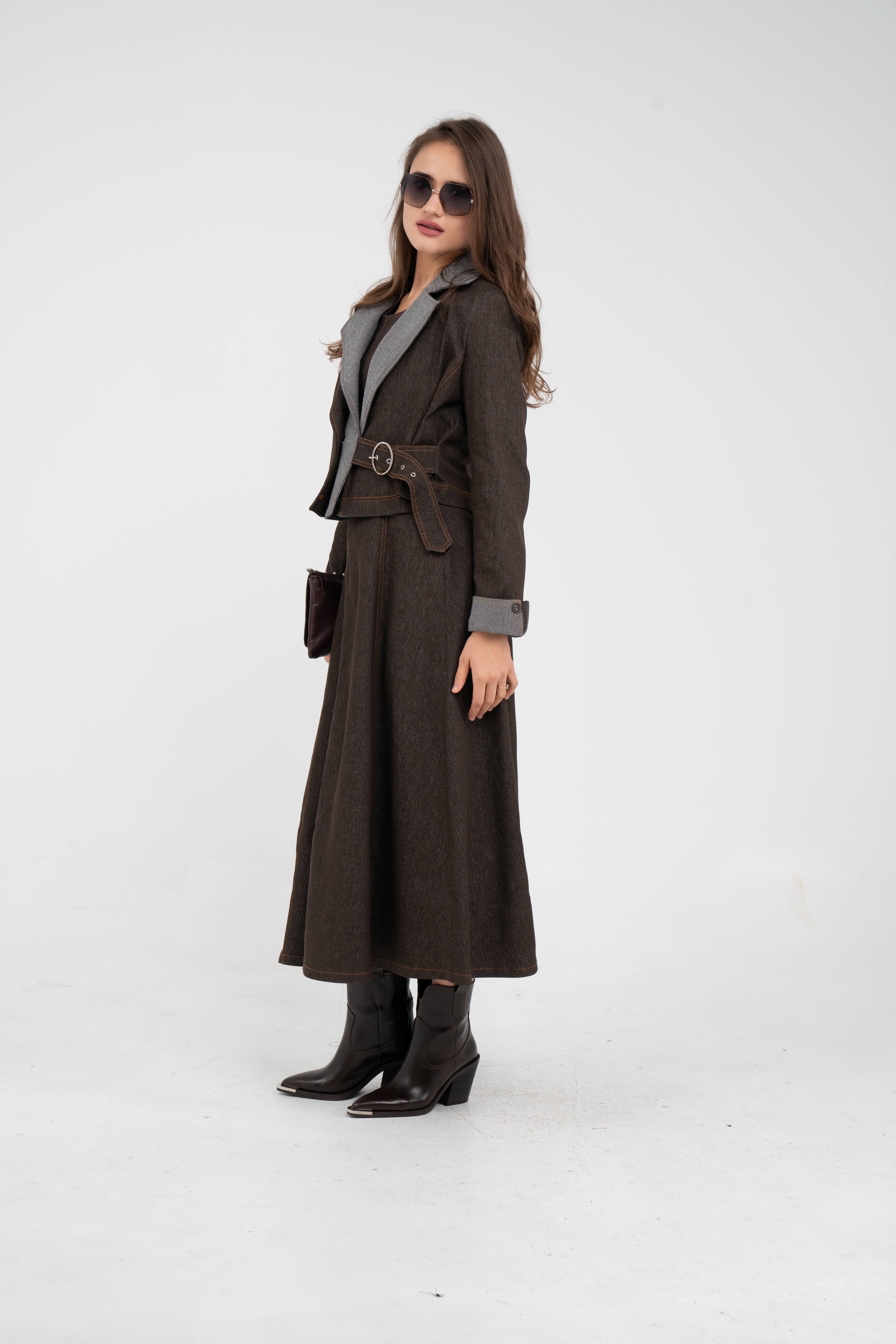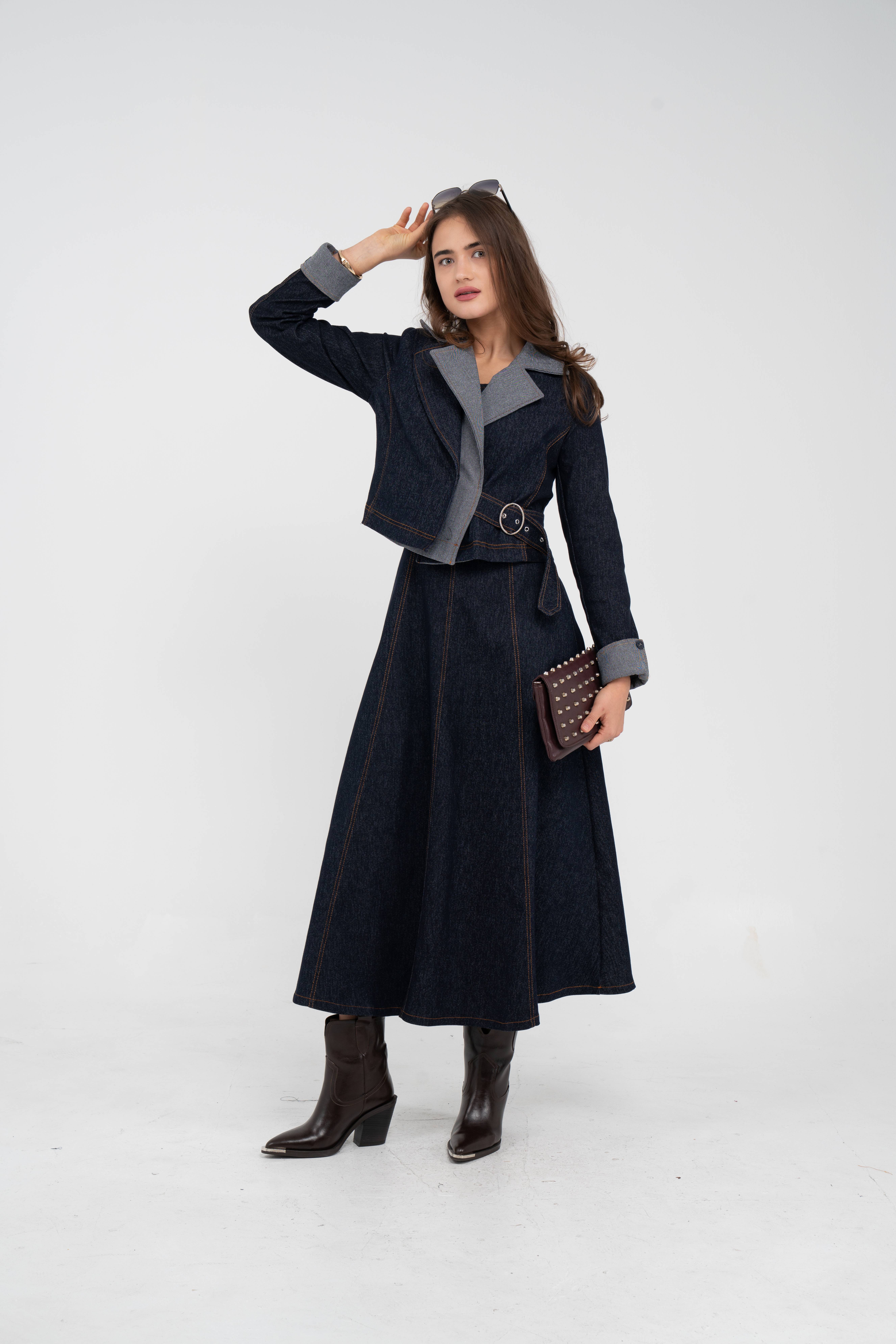 Alt parça ise akıcı kesime sahip uzun elbisesiyle rahat ve şık bir görünüm oluşturur. Kumaşın dokusu, formu düzgün bir şekilde koruyarak hem günlük kullanıma hem de özel gün stiline uyum sağlar. Topuklu botlar ve minimal aksesuarlarla tamamlandığında sofistike bir tarz ortaya çıkar.