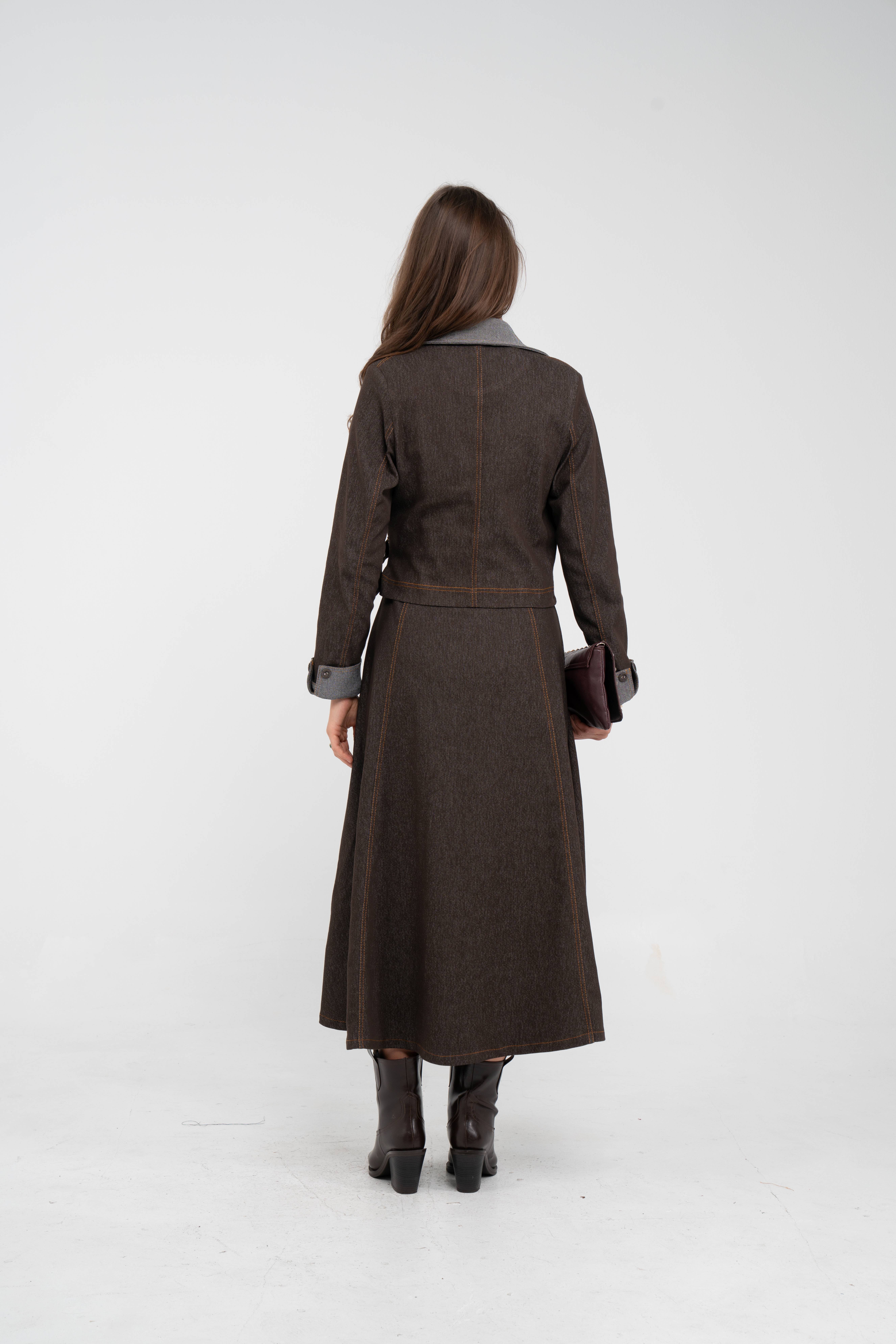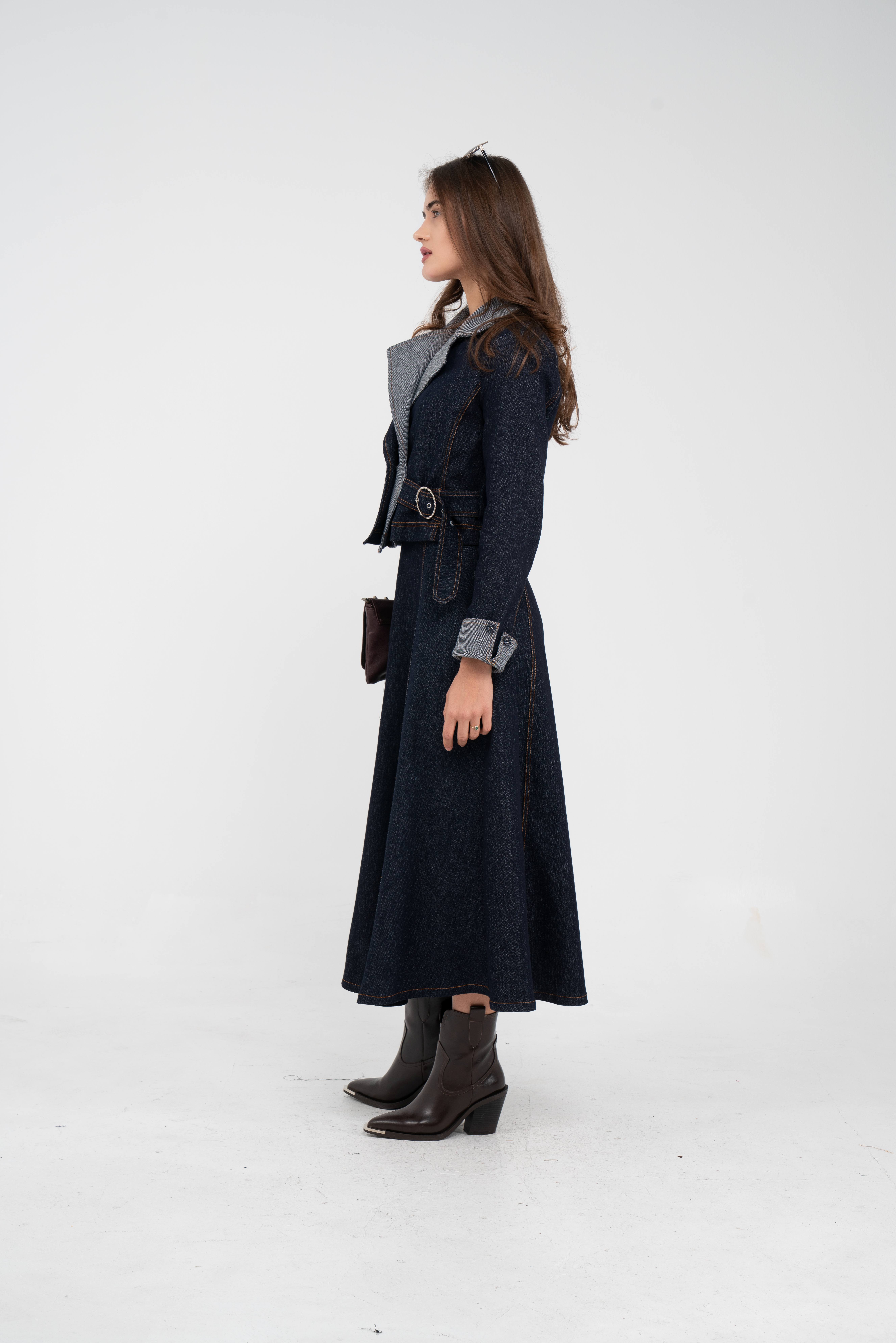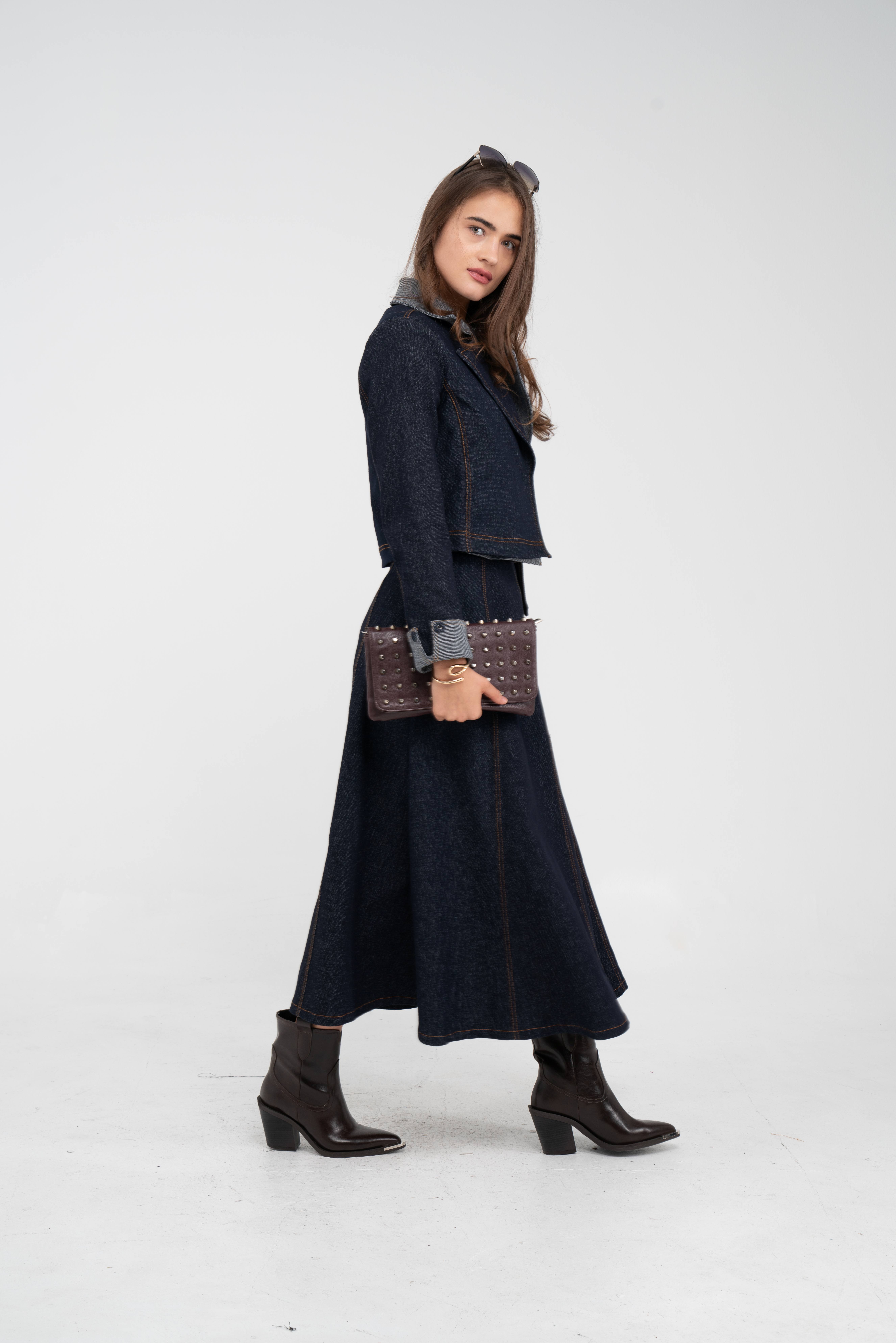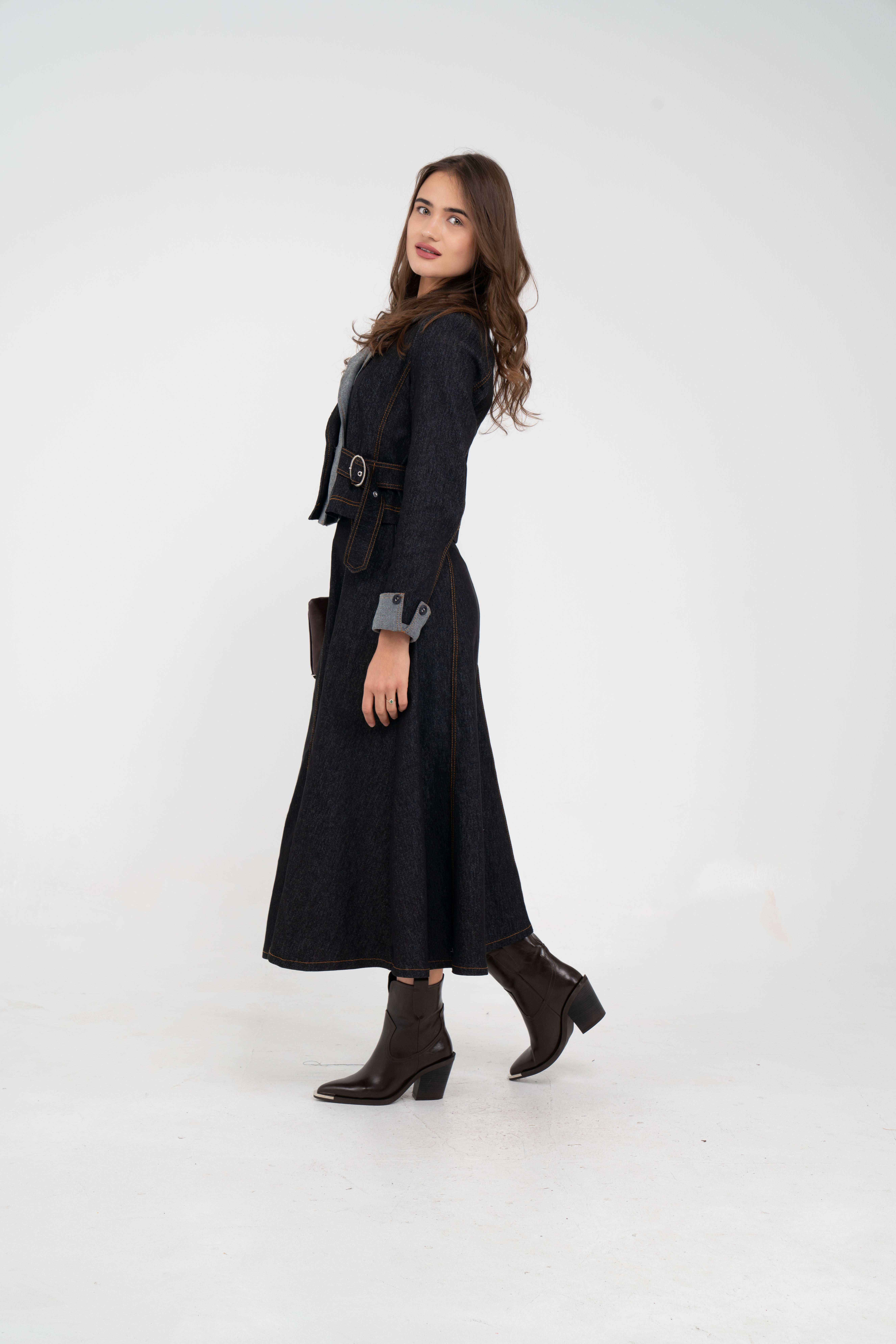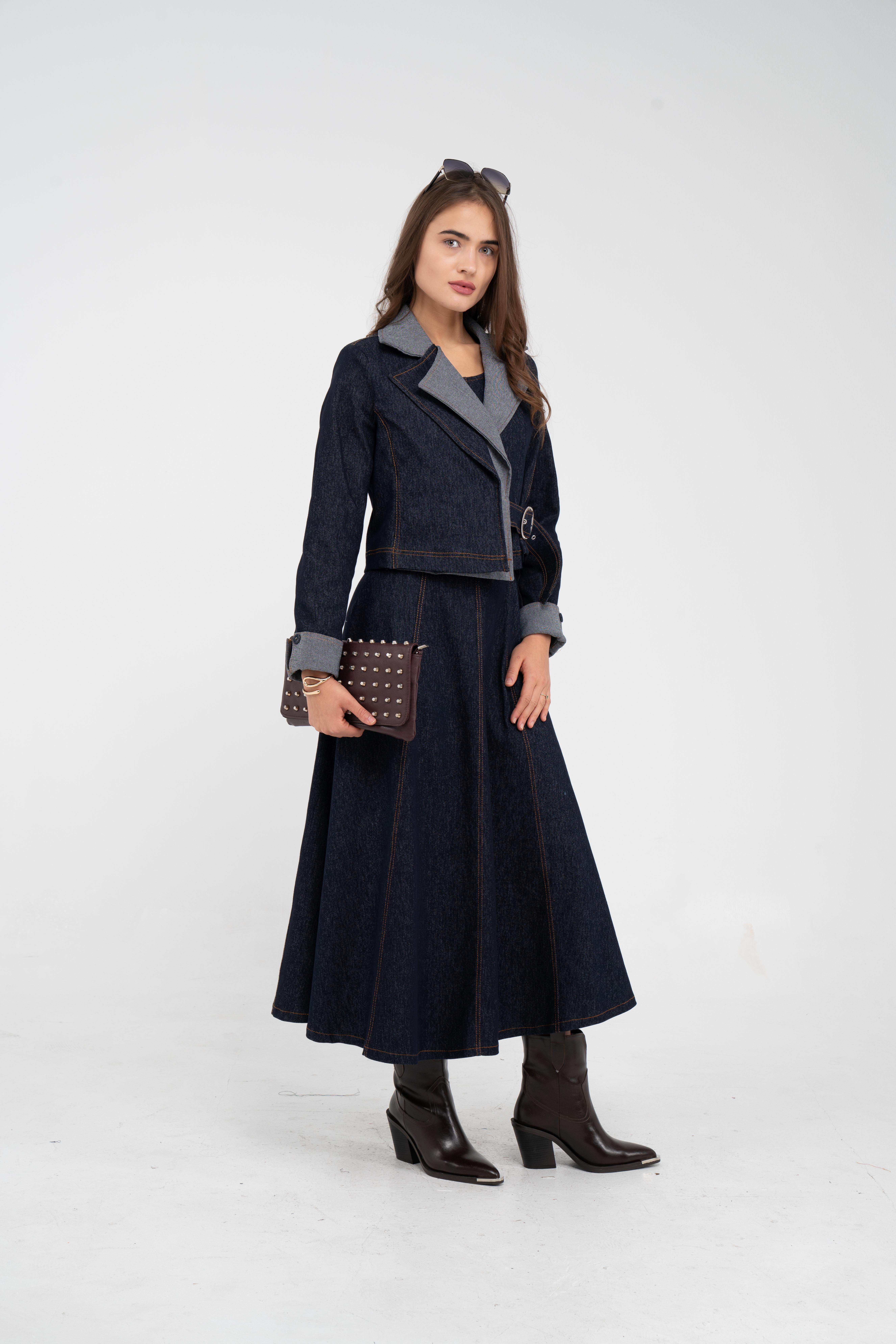 Alt parça ise akıcı kesime sahip uzun elbisesiyle rahat ve şık bir görünüm oluşturur. Kumaşın dokusu, formu düzgün bir şekilde koruyarak hem günlük kullanıma hem de özel gün stiline uyum sağlar. Topuklu botlar ve minimal aksesuarlarla tamamlandığında sofistike bir tarz ortaya çıkar.
