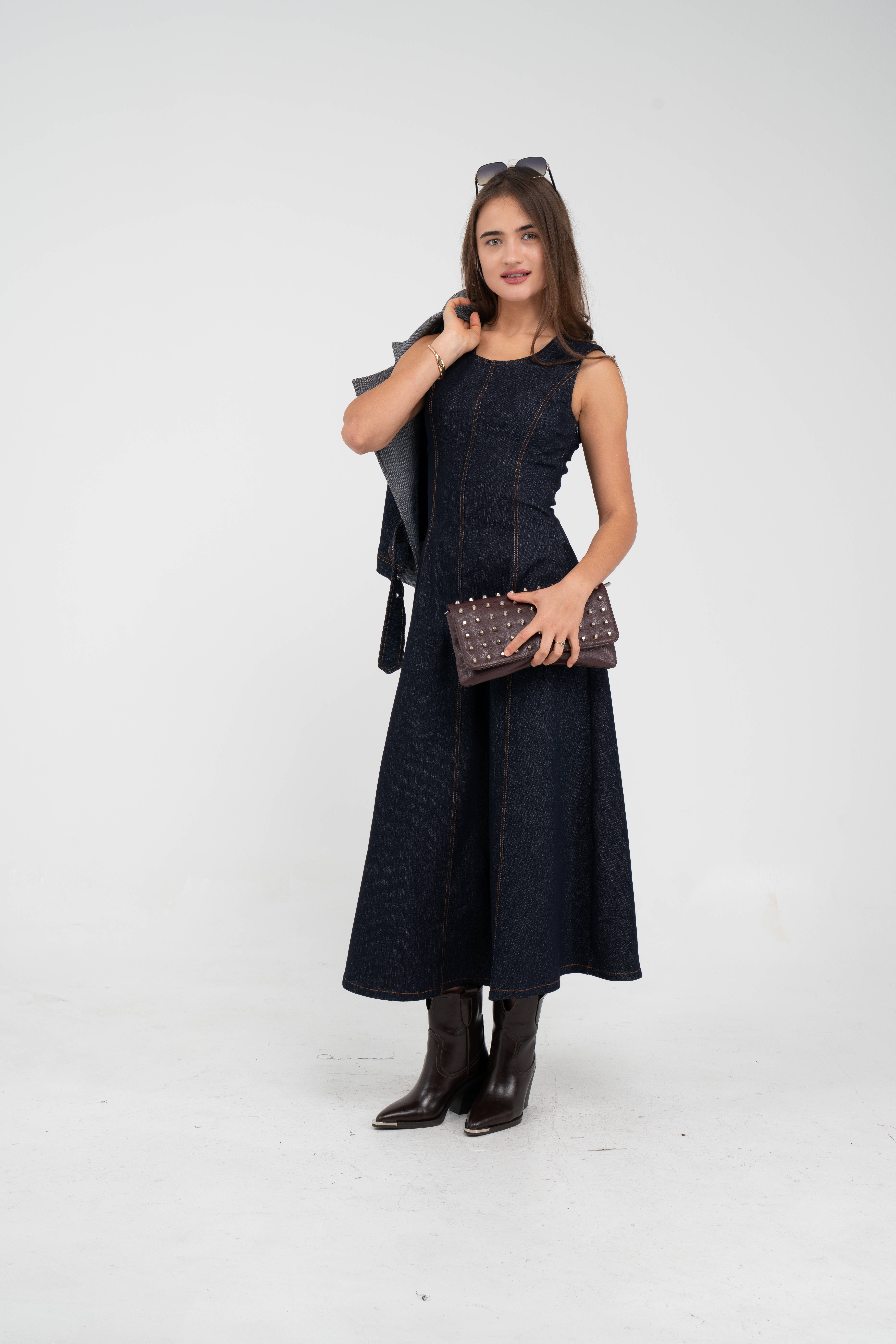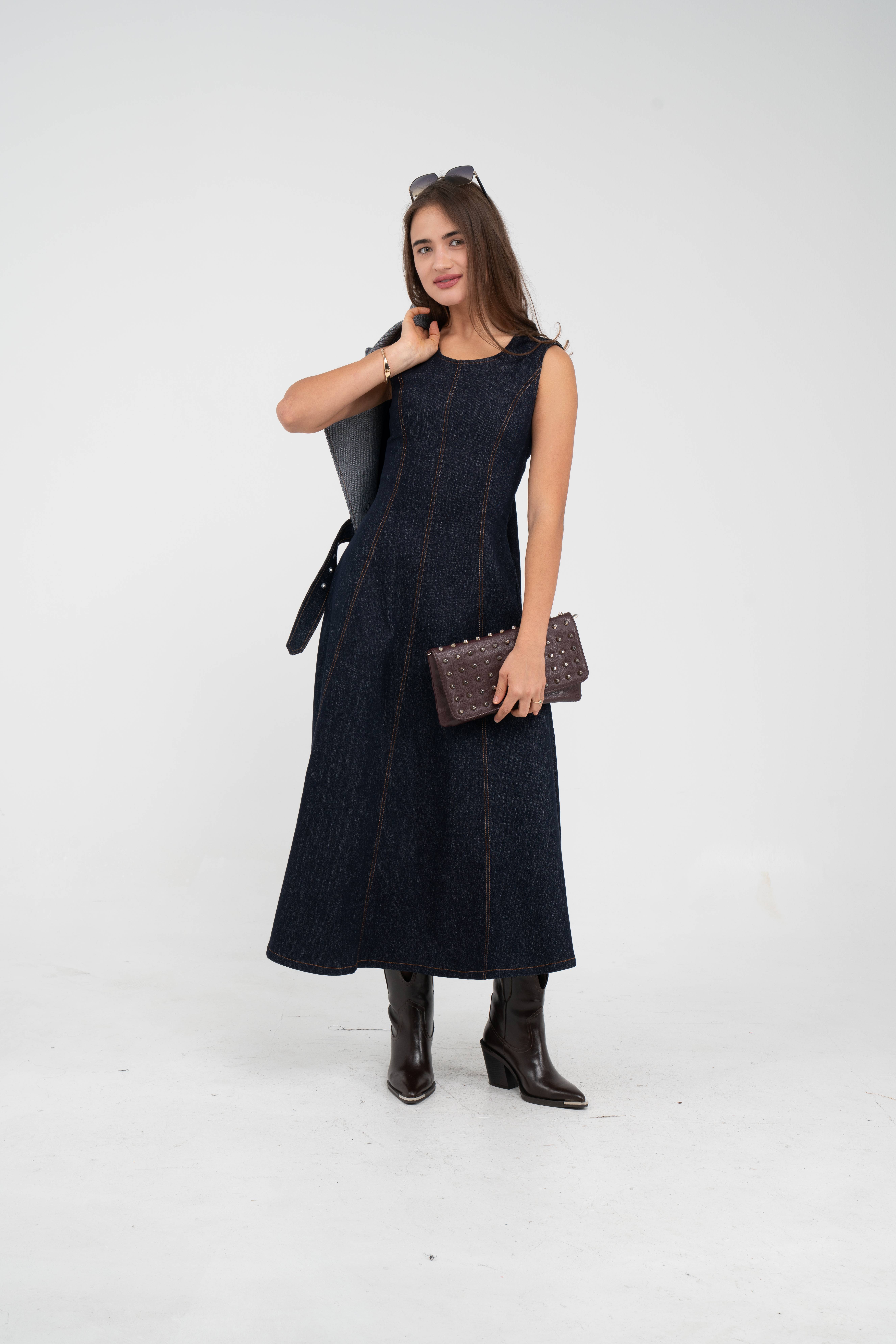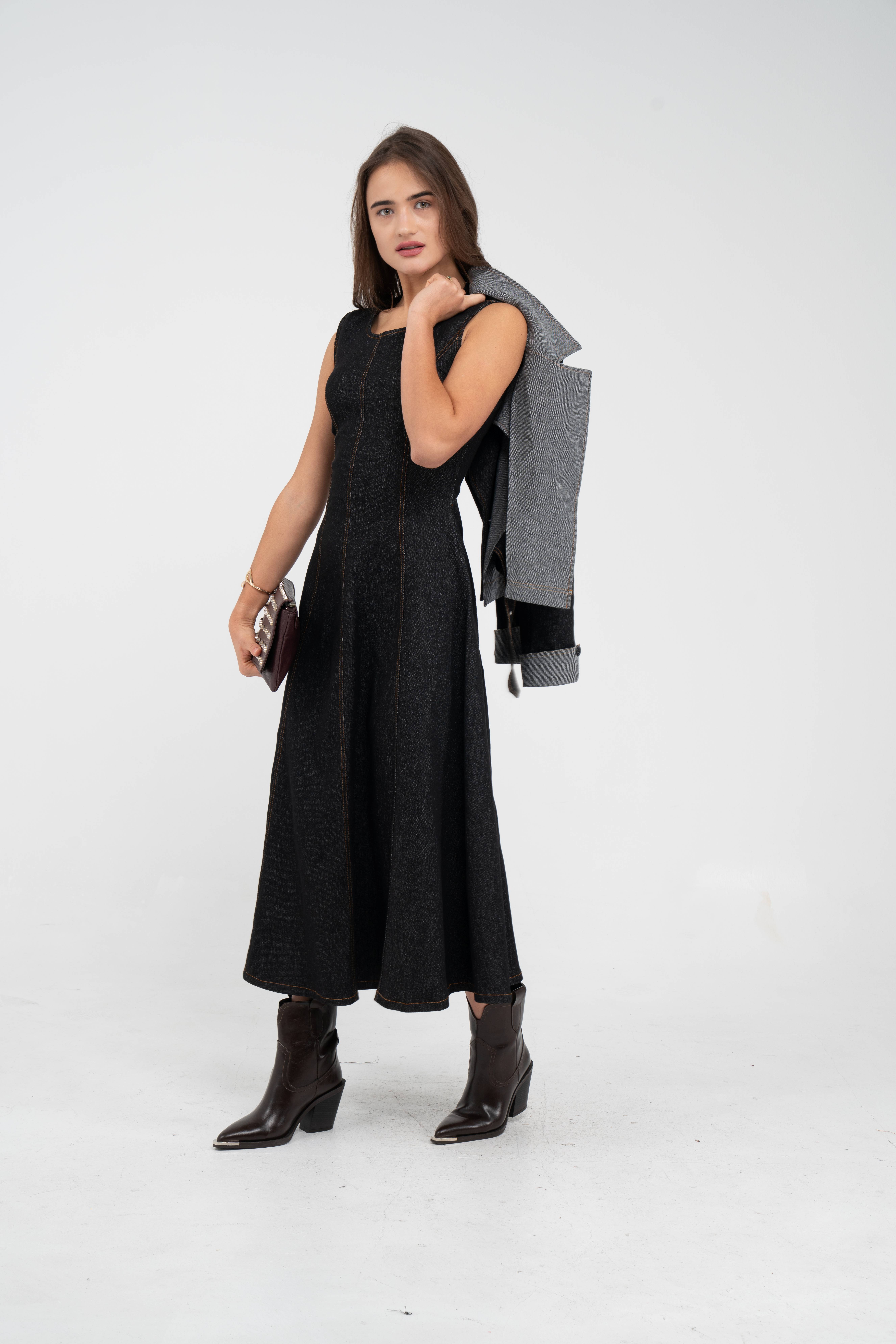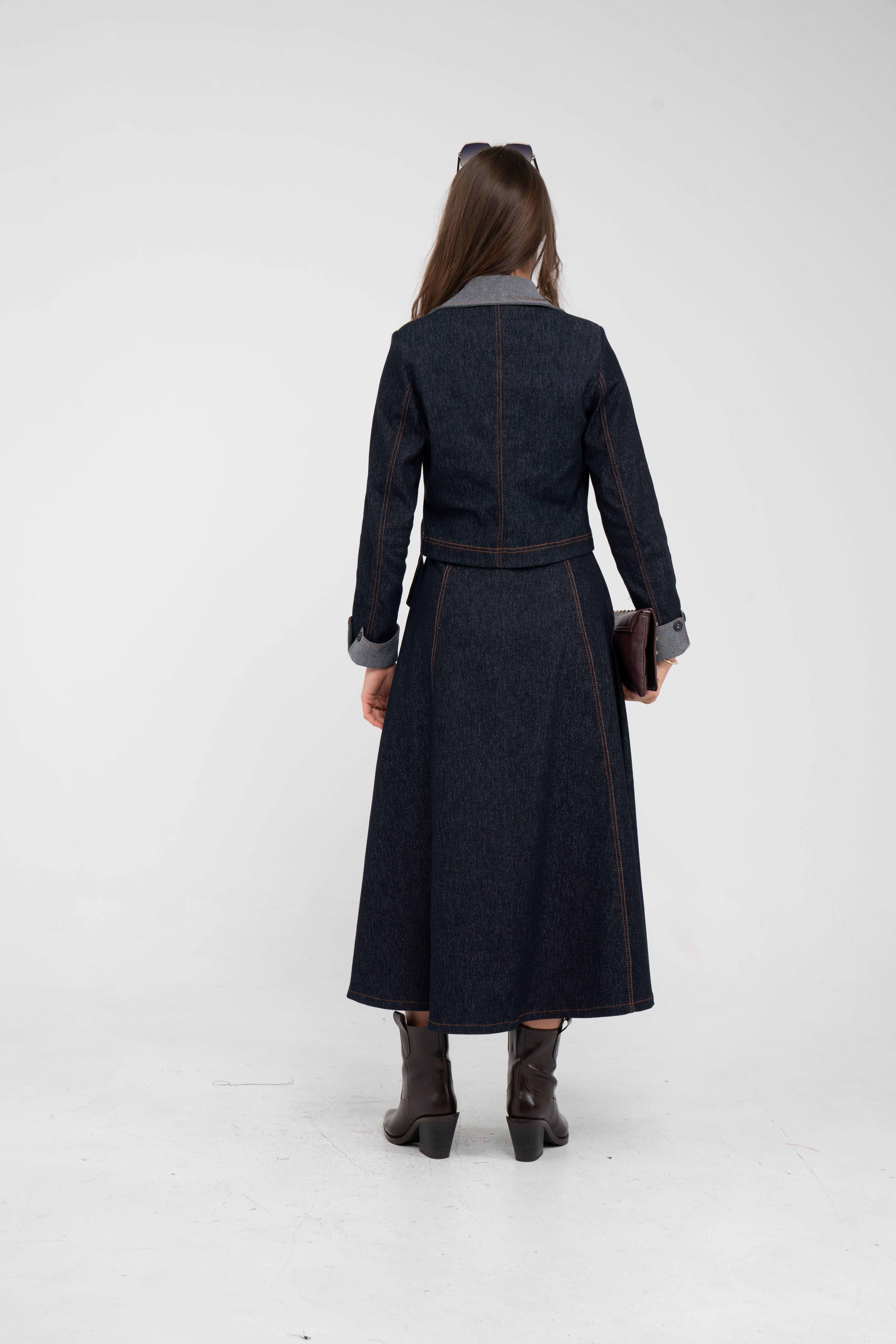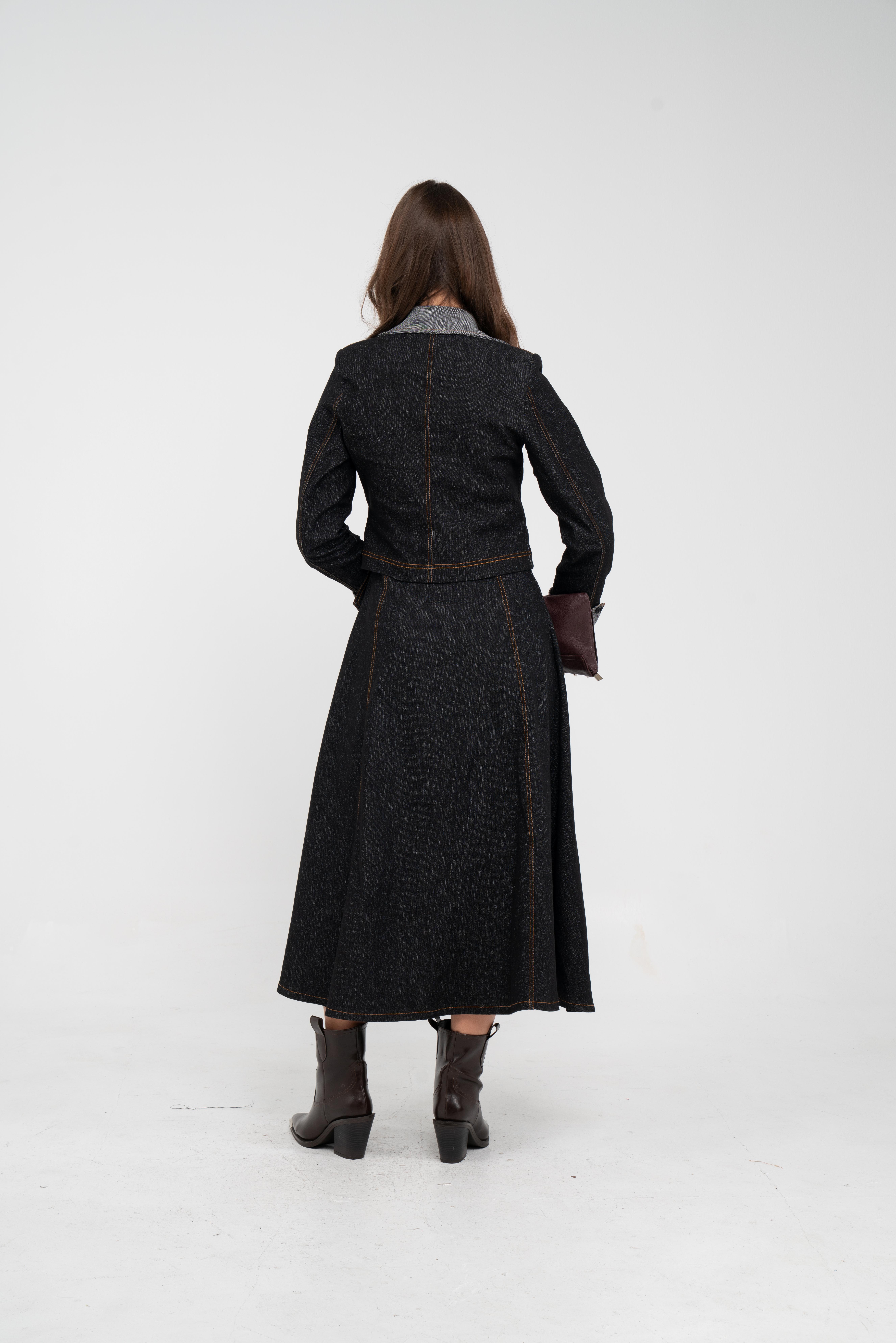 Alt parça ise akıcı kesime sahip uzun elbisesiyle rahat ve şık bir görünüm oluşturur. Kumaşın dokusu, formu düzgün bir şekilde koruyarak hem günlük kullanıma hem de özel gün stiline uyum sağlar. Topuklu botlar ve minimal aksesuarlarla tamamlandığında sofistike bir tarz ortaya çıkar.