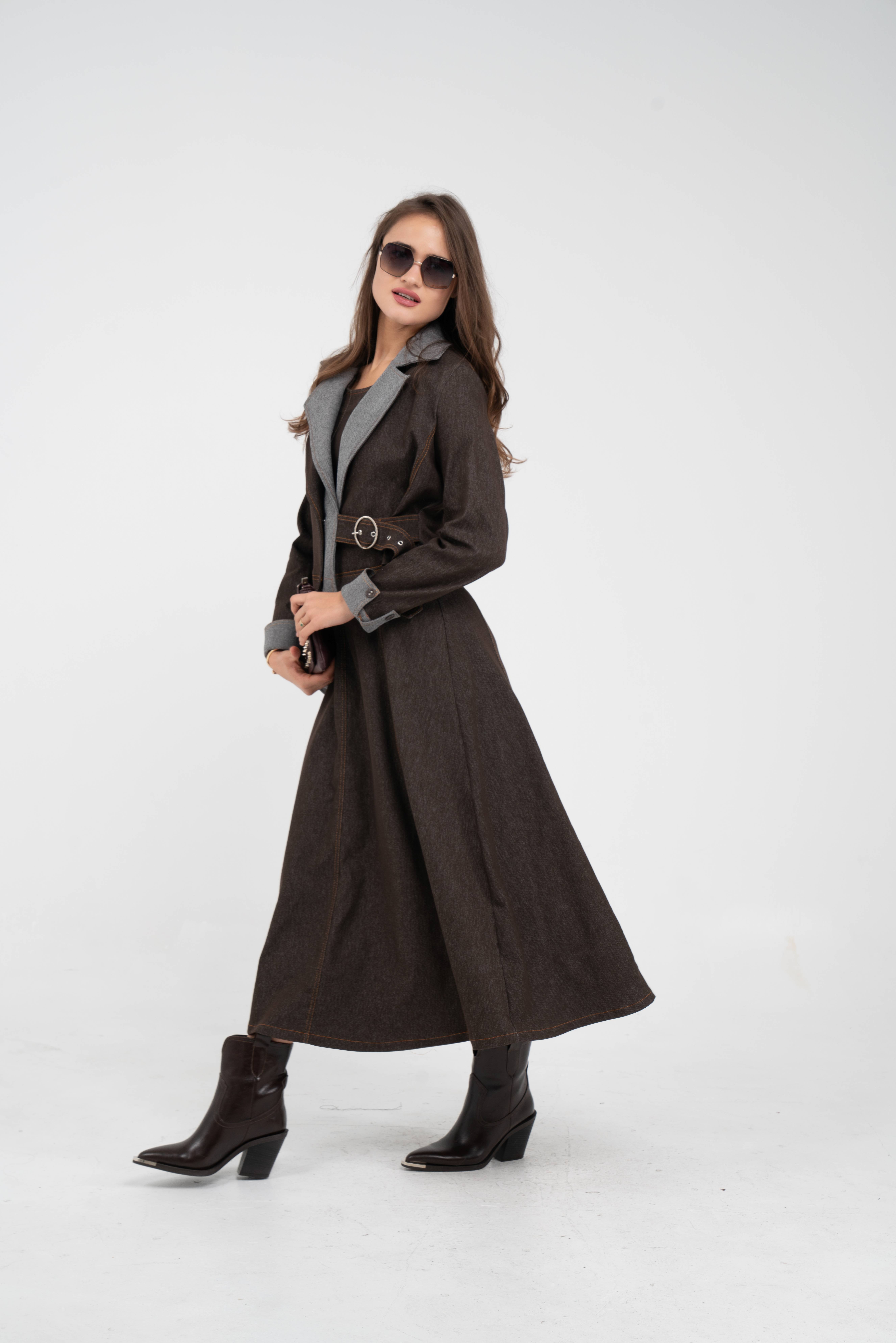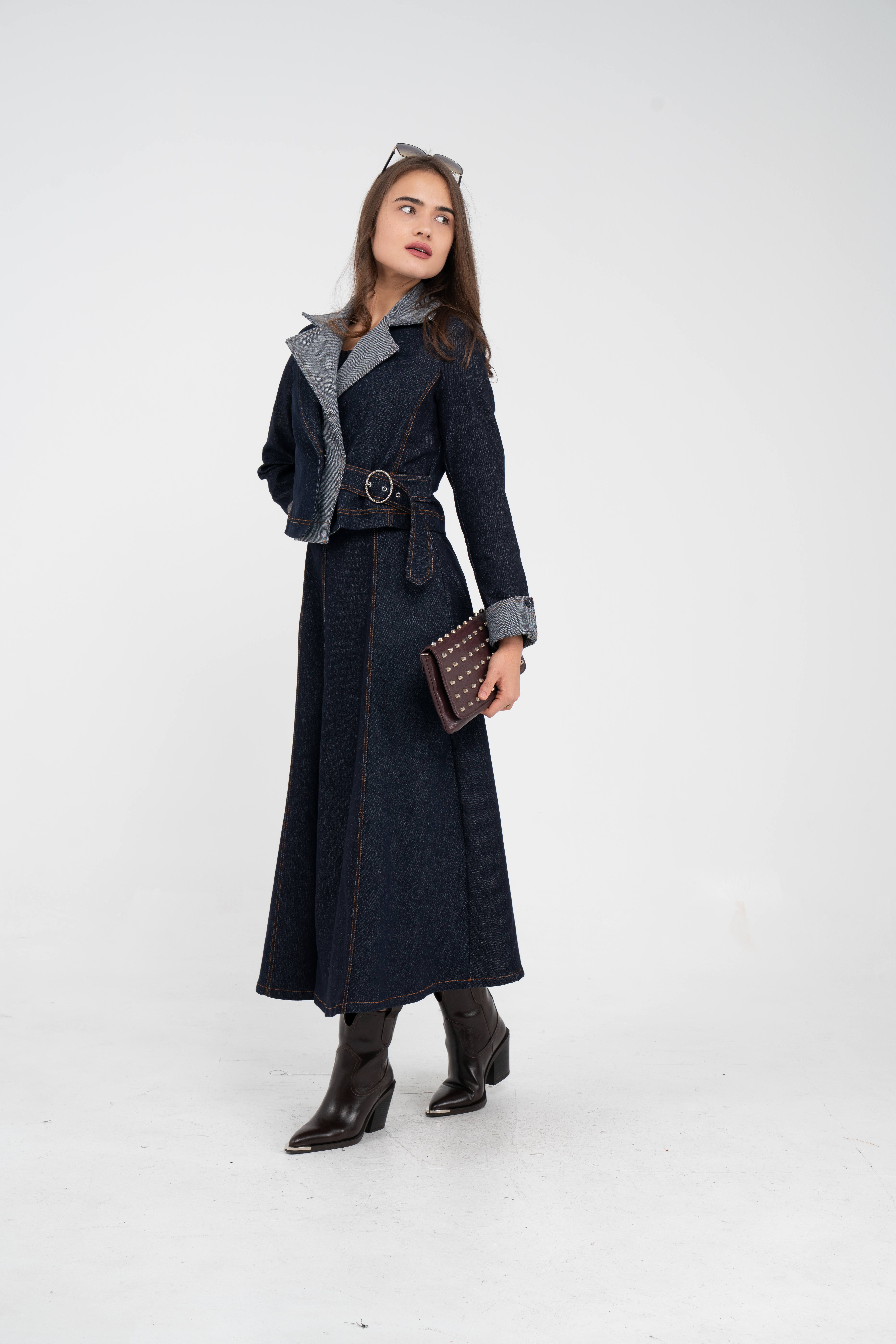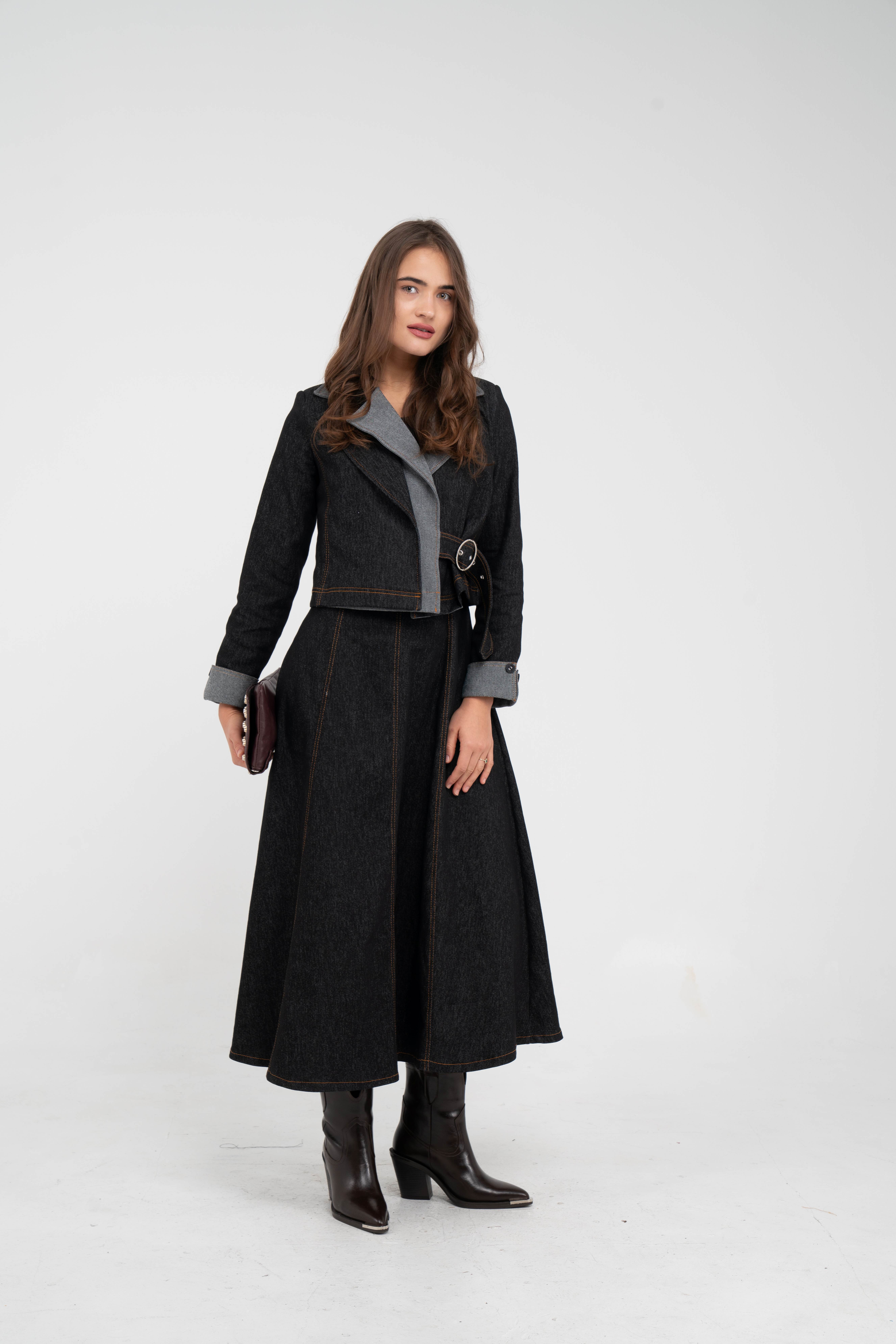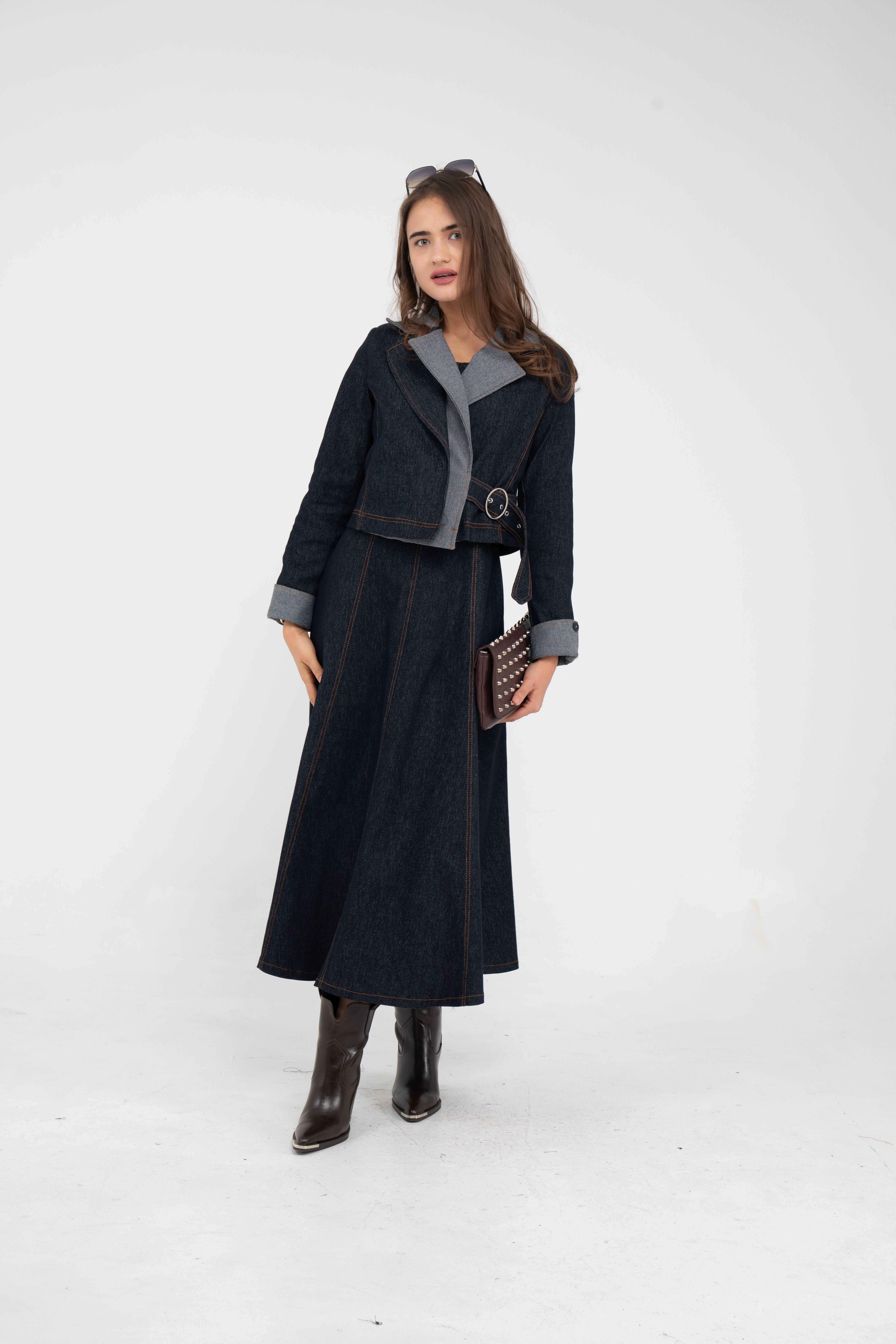 Gelince Haber VerÜst parça kısa ceket formunda tasarlanmış olup kuşaklı tokası, geniş yaka detayı ve kontrast biye geçişleri sayesinde güçlü bir duruş sunar.