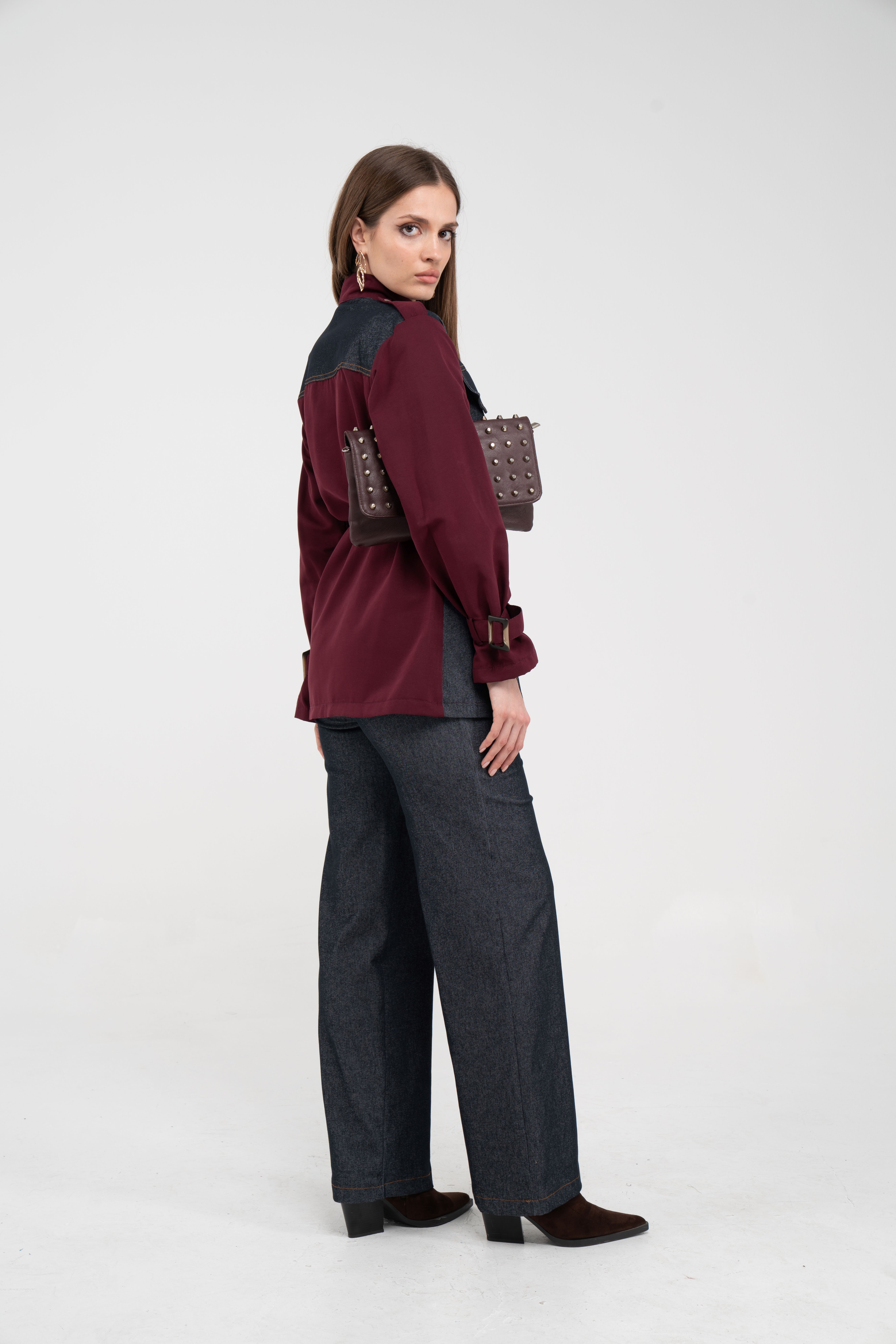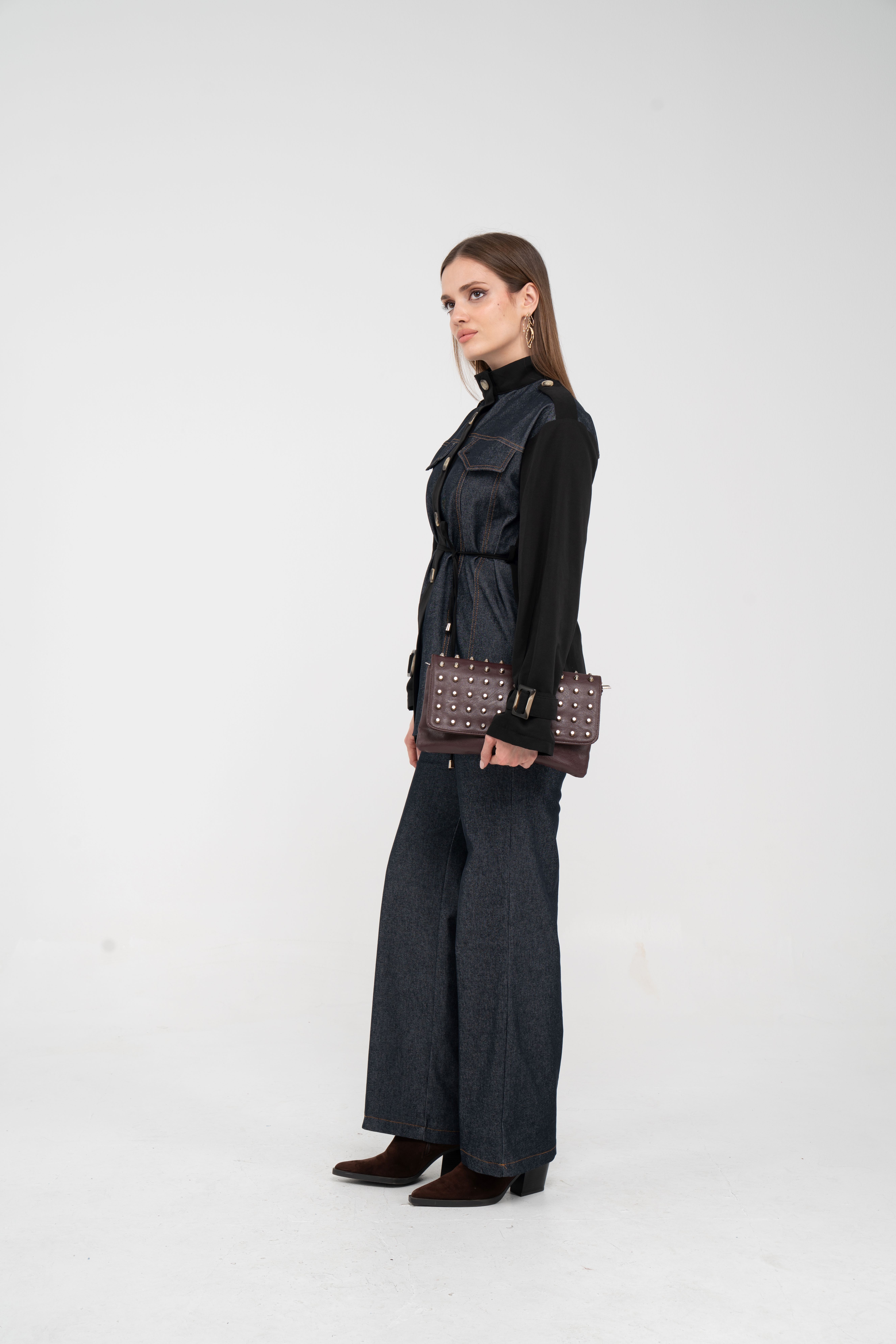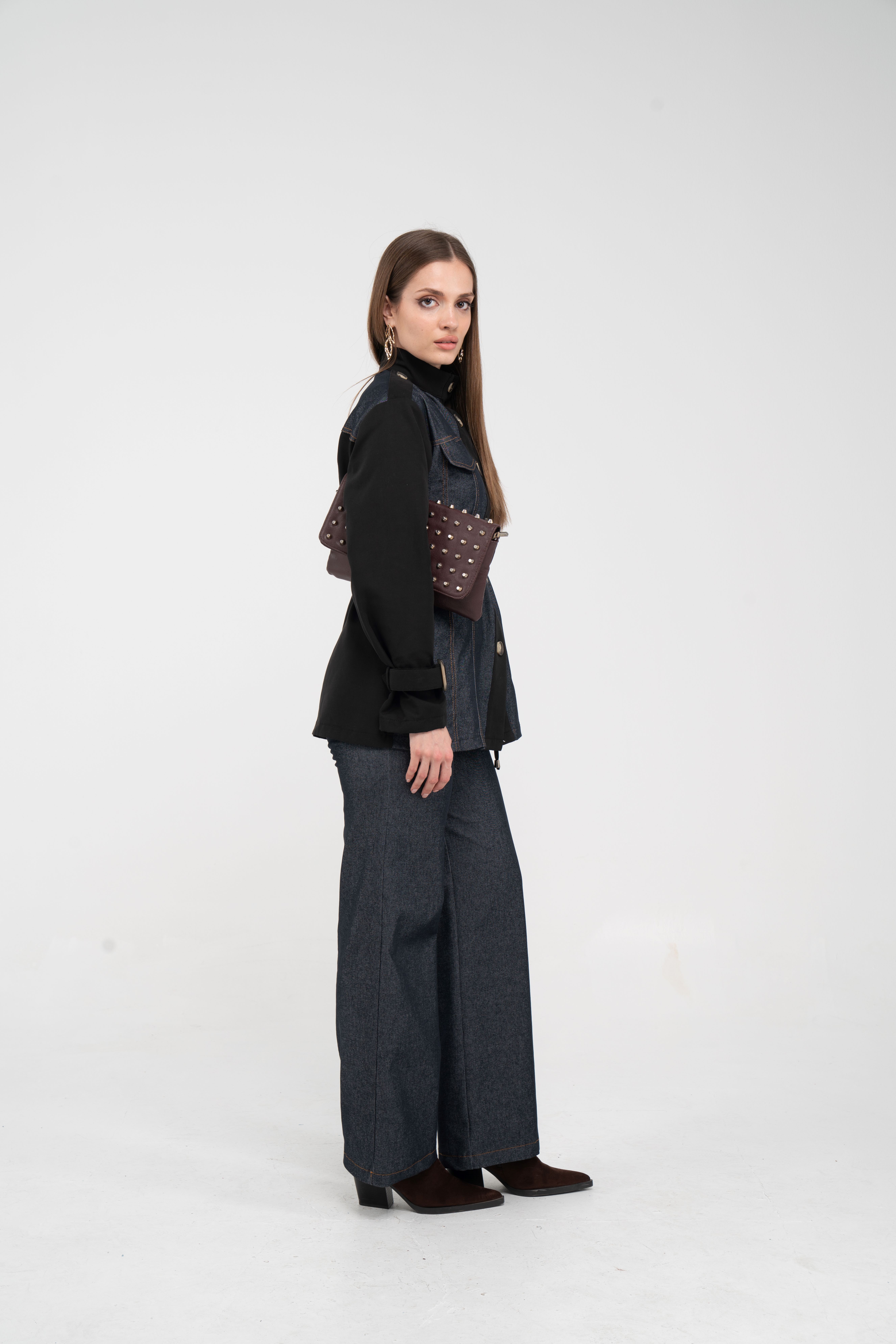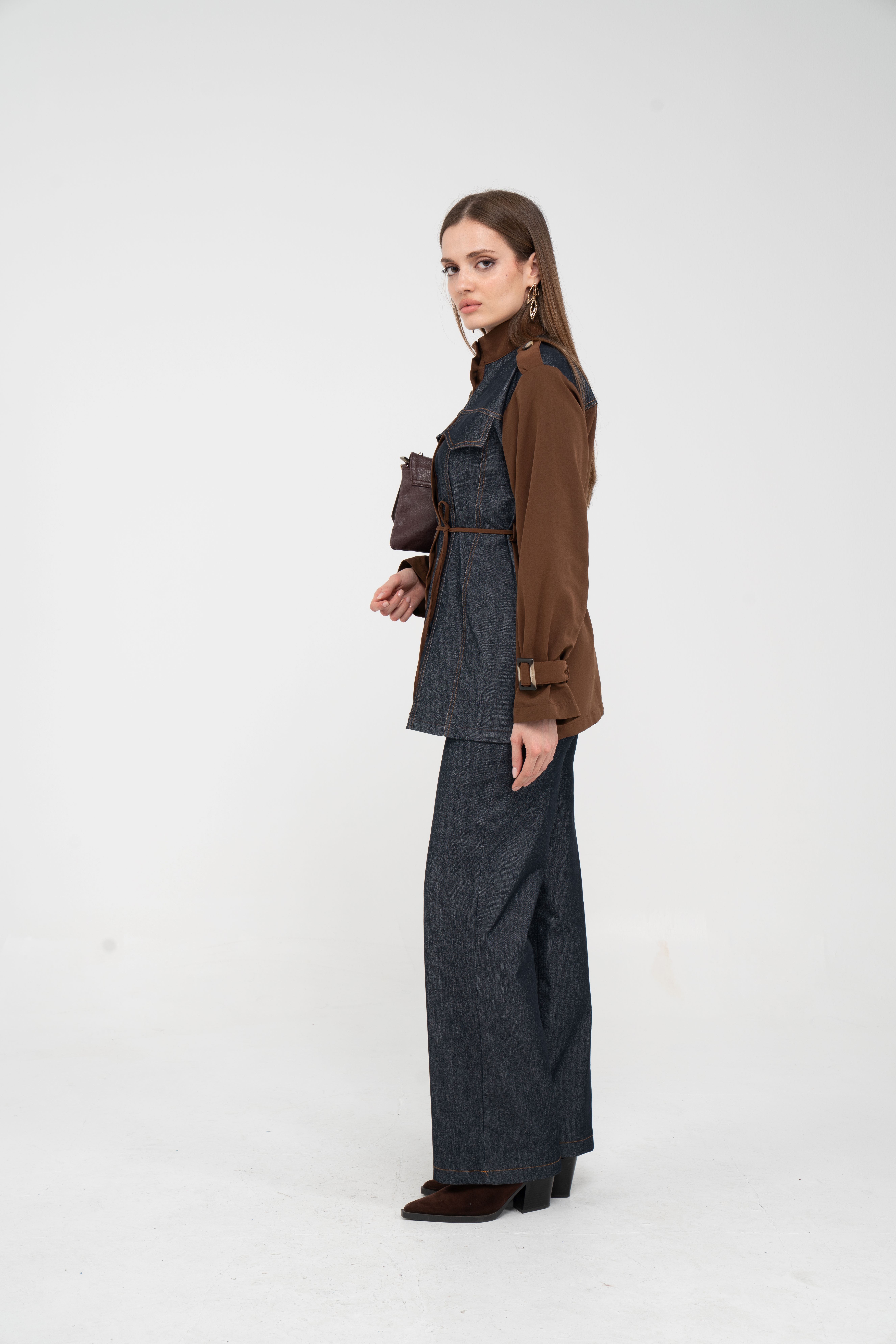 Alt kısmında yer alan geniş paça pantolon, özgür hareket alanı sağlarken şıklığından ödün vermiyor.