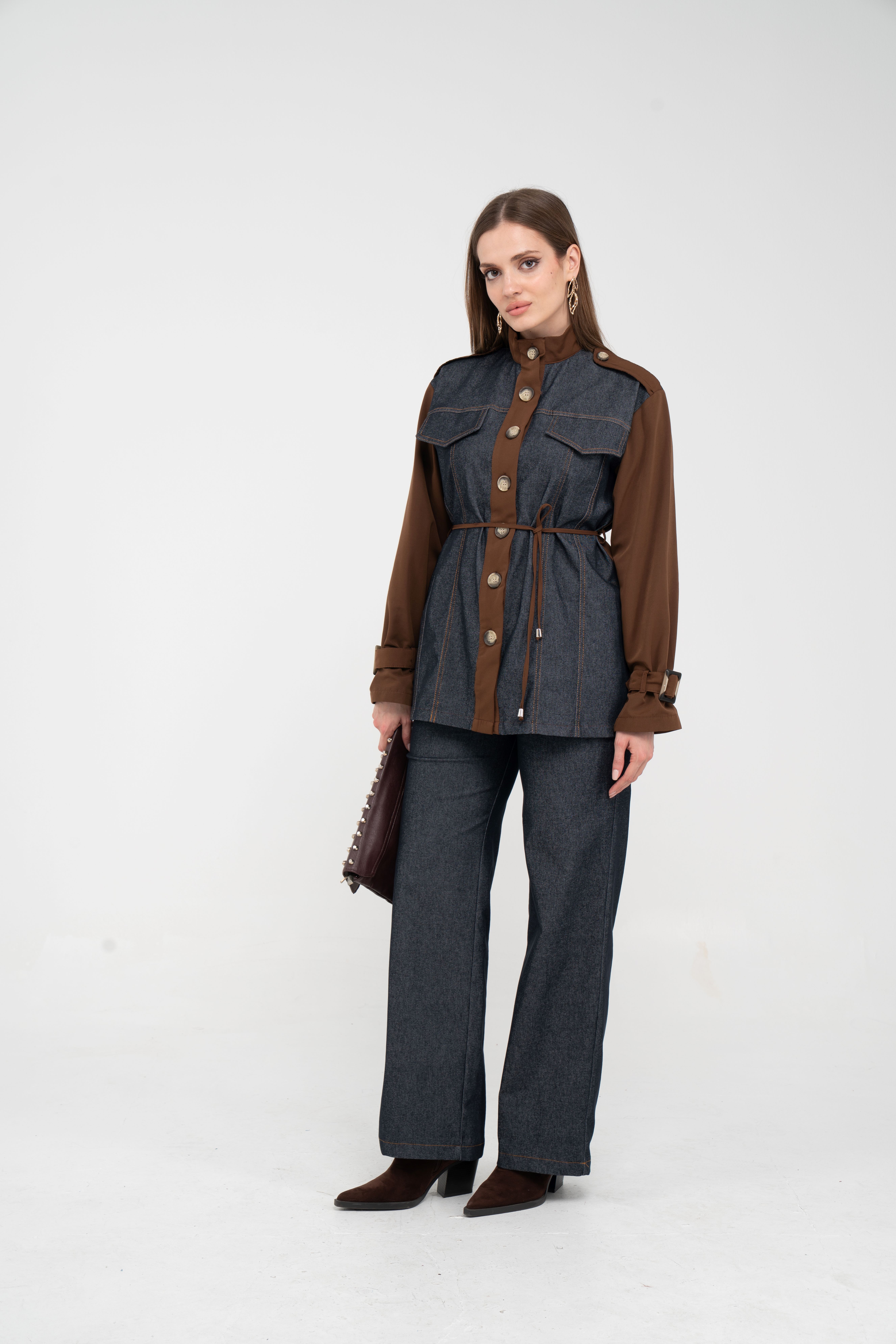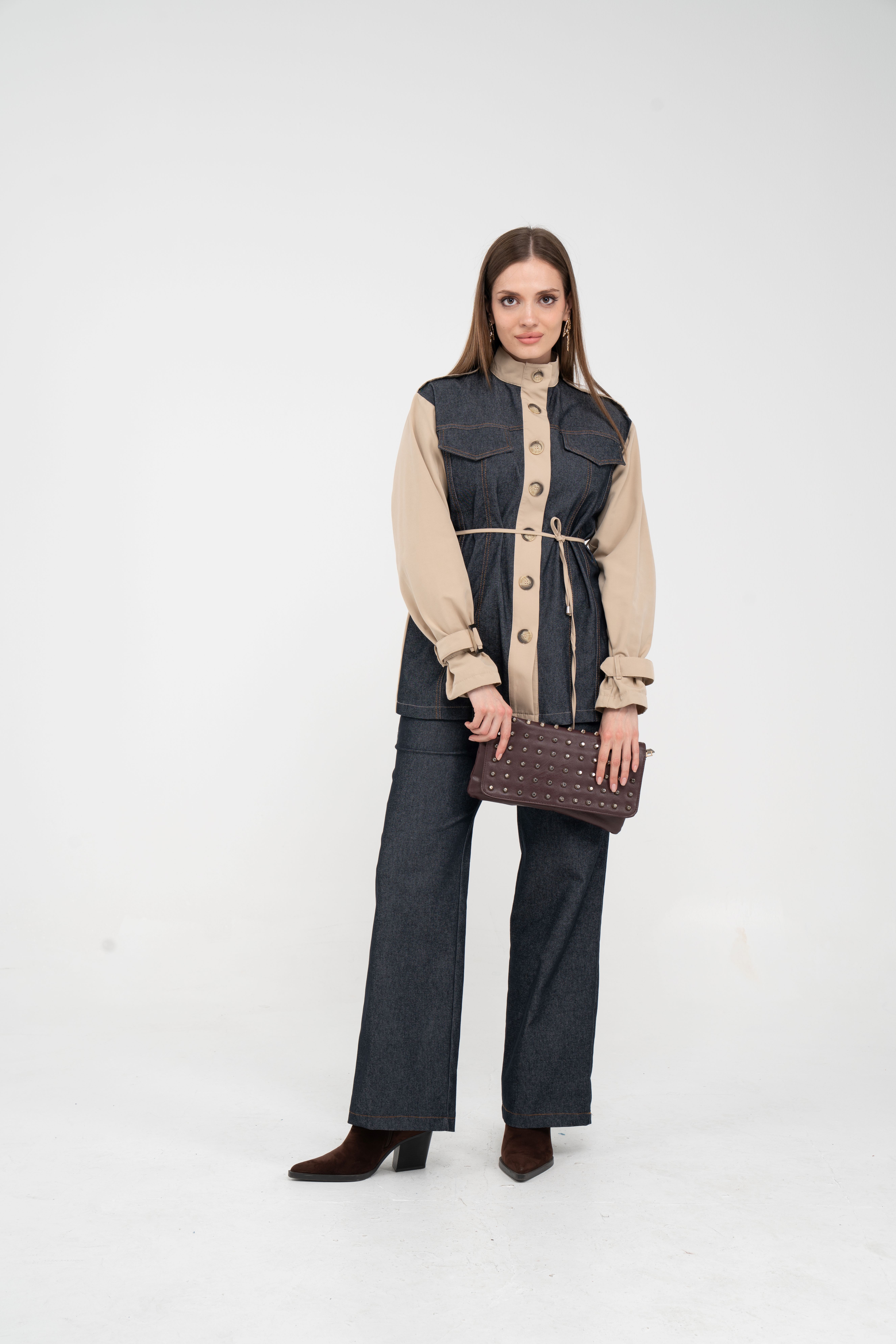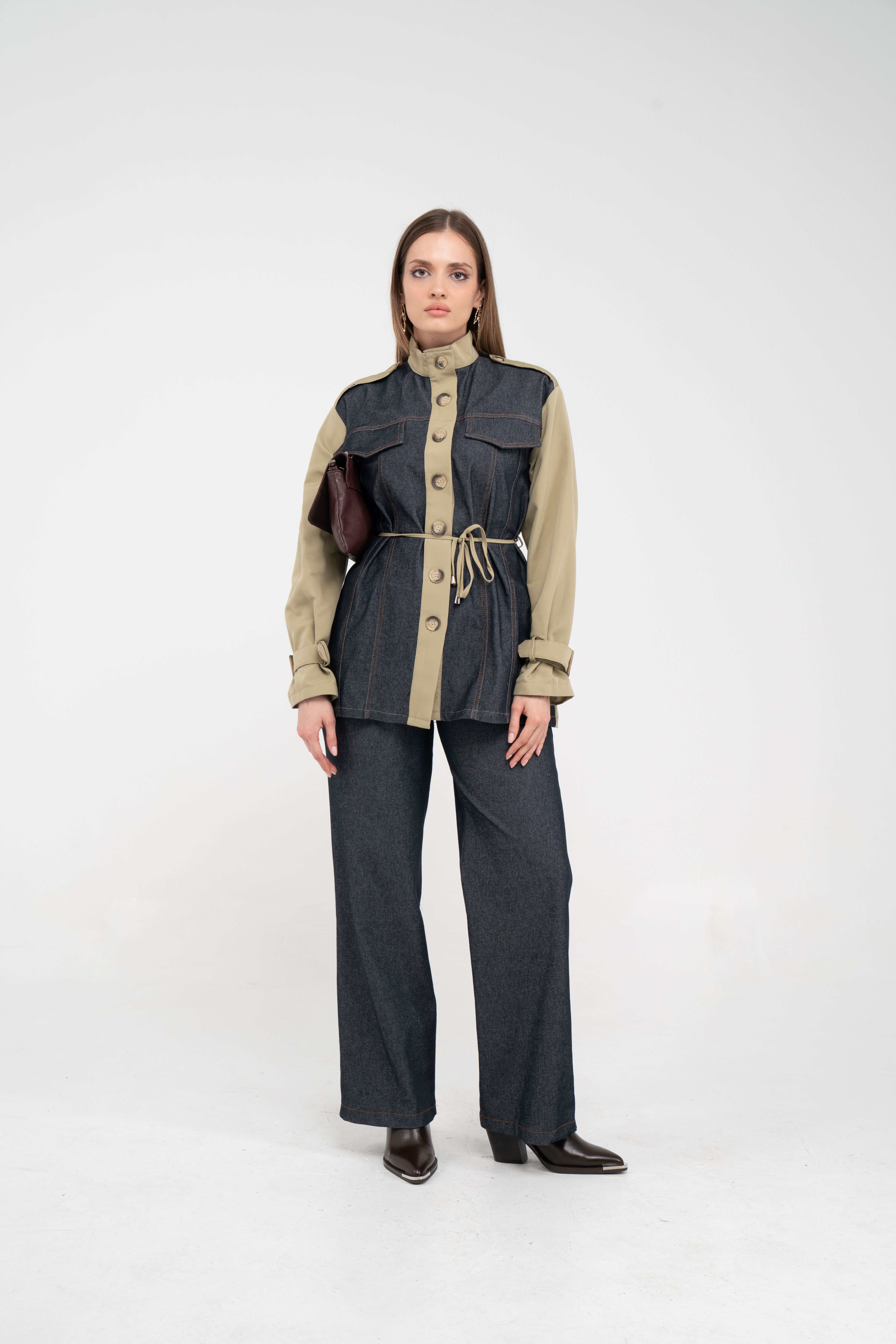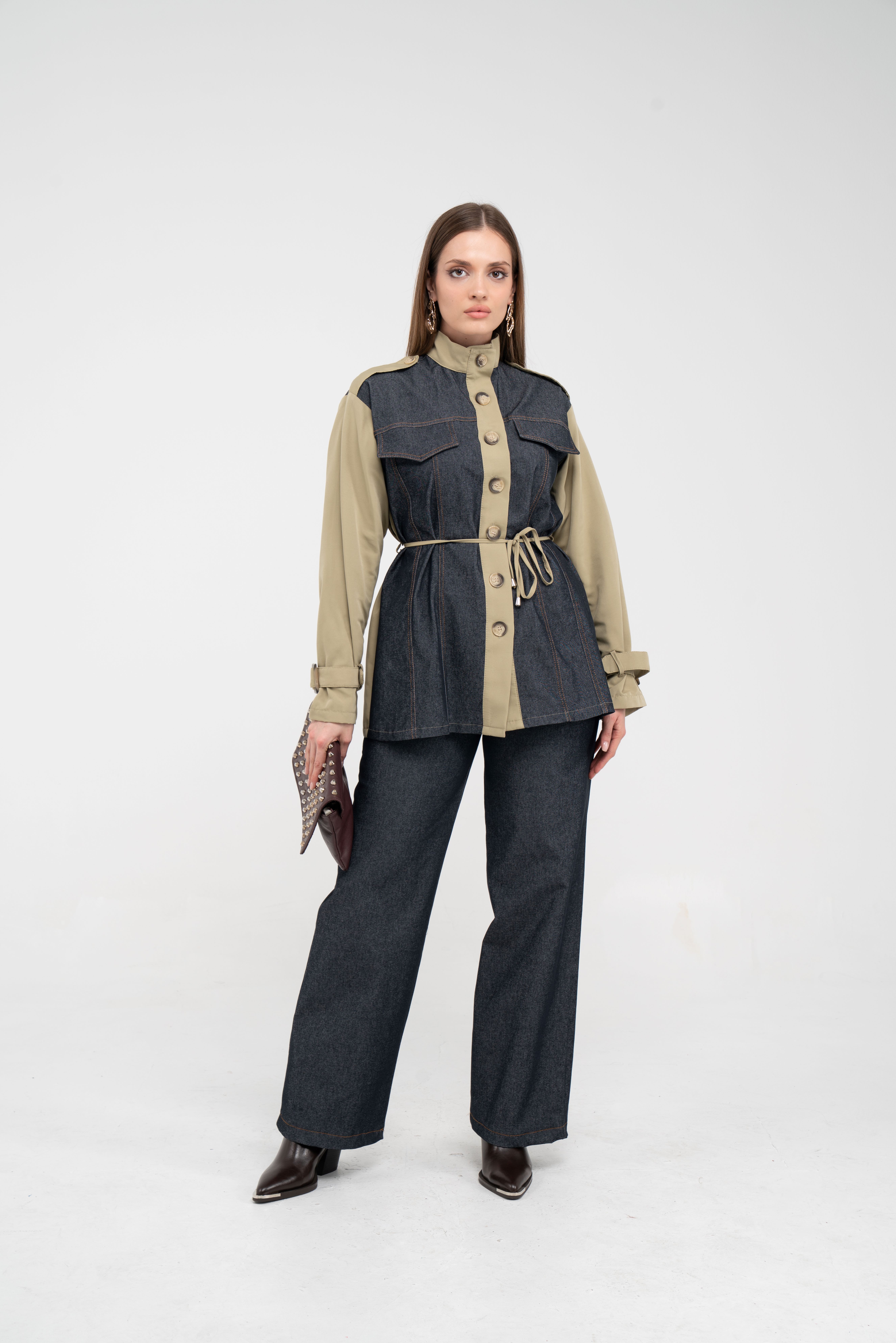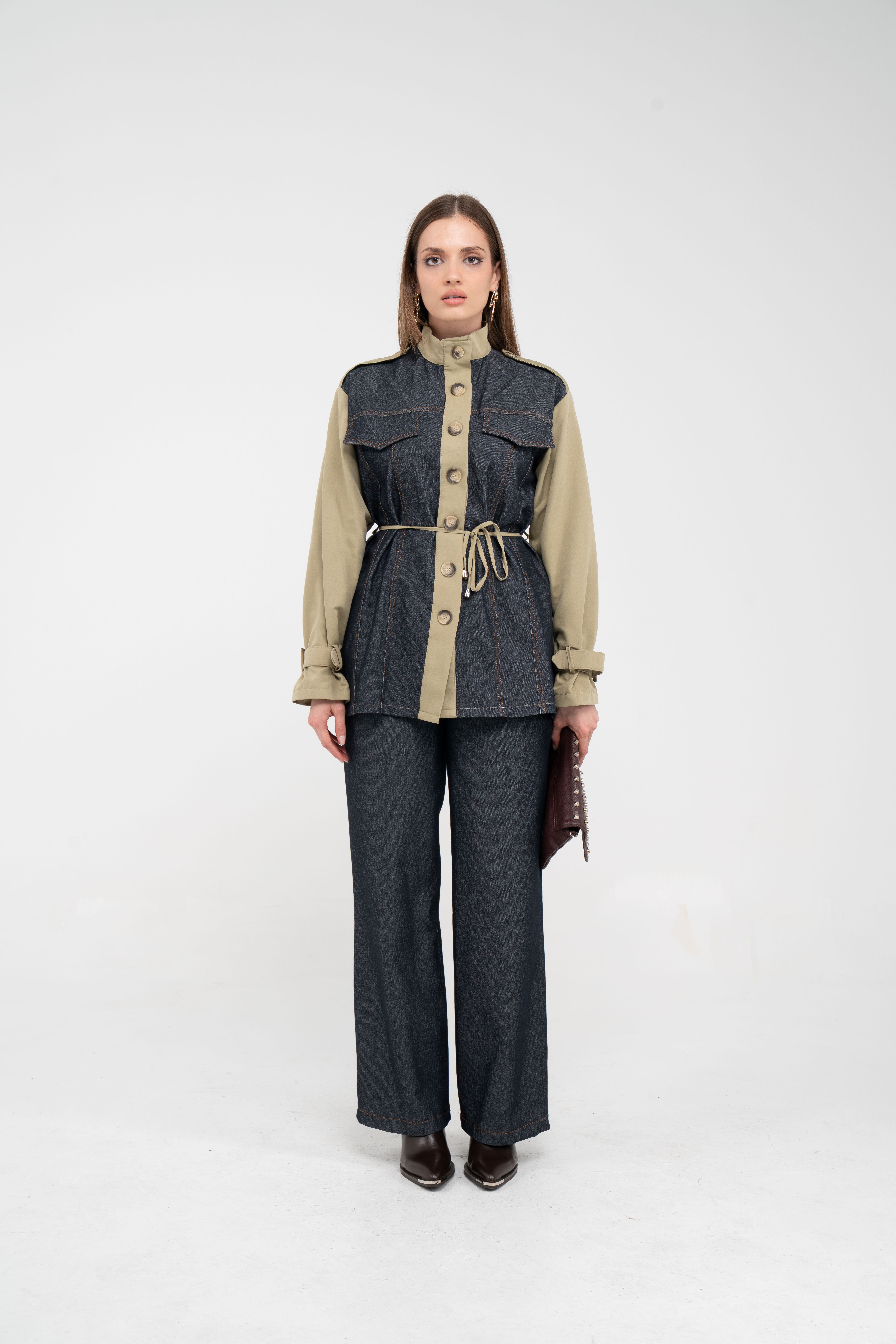 kollarındaki haki kumaş detayı ile modern bir kontrast yaratıyor.