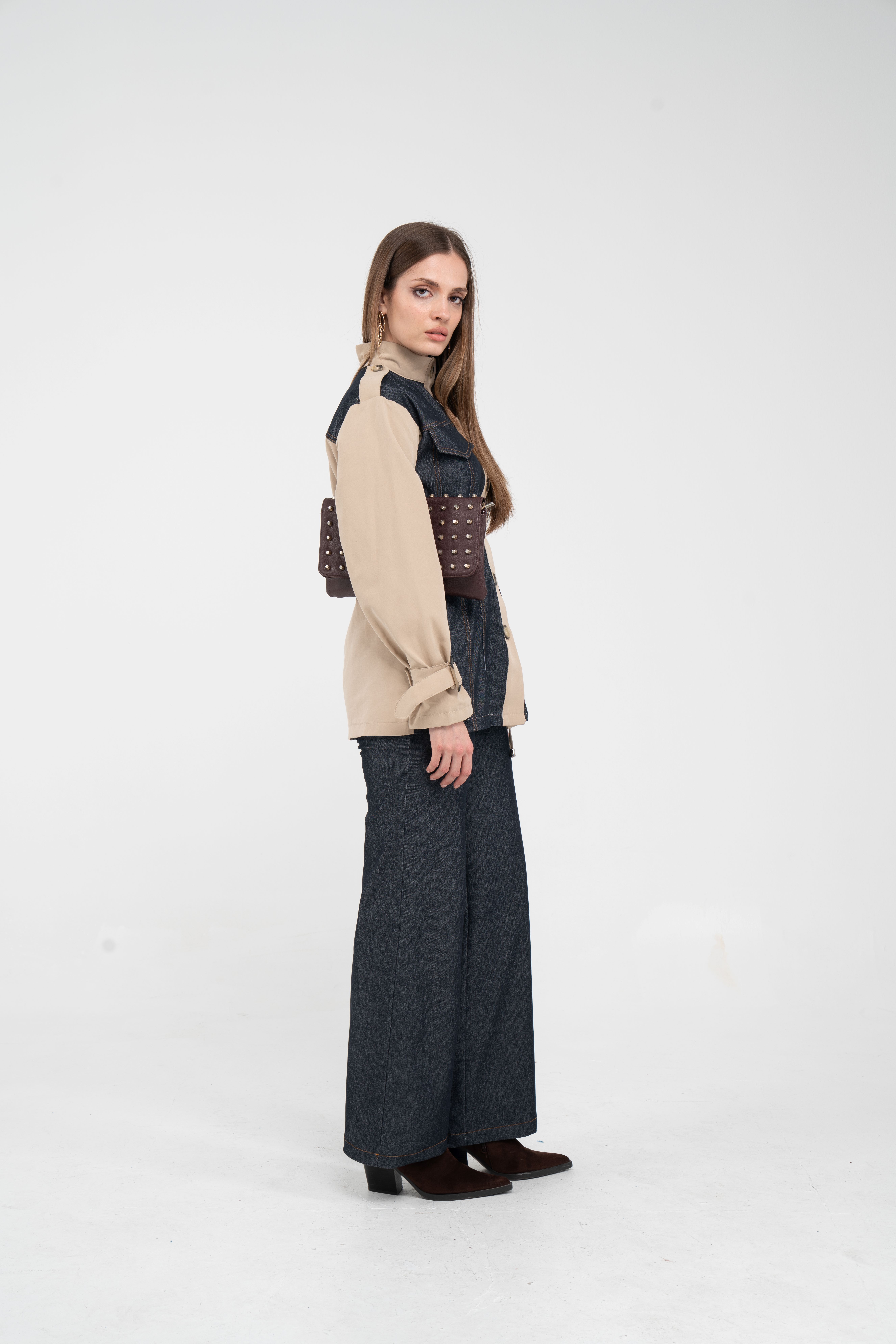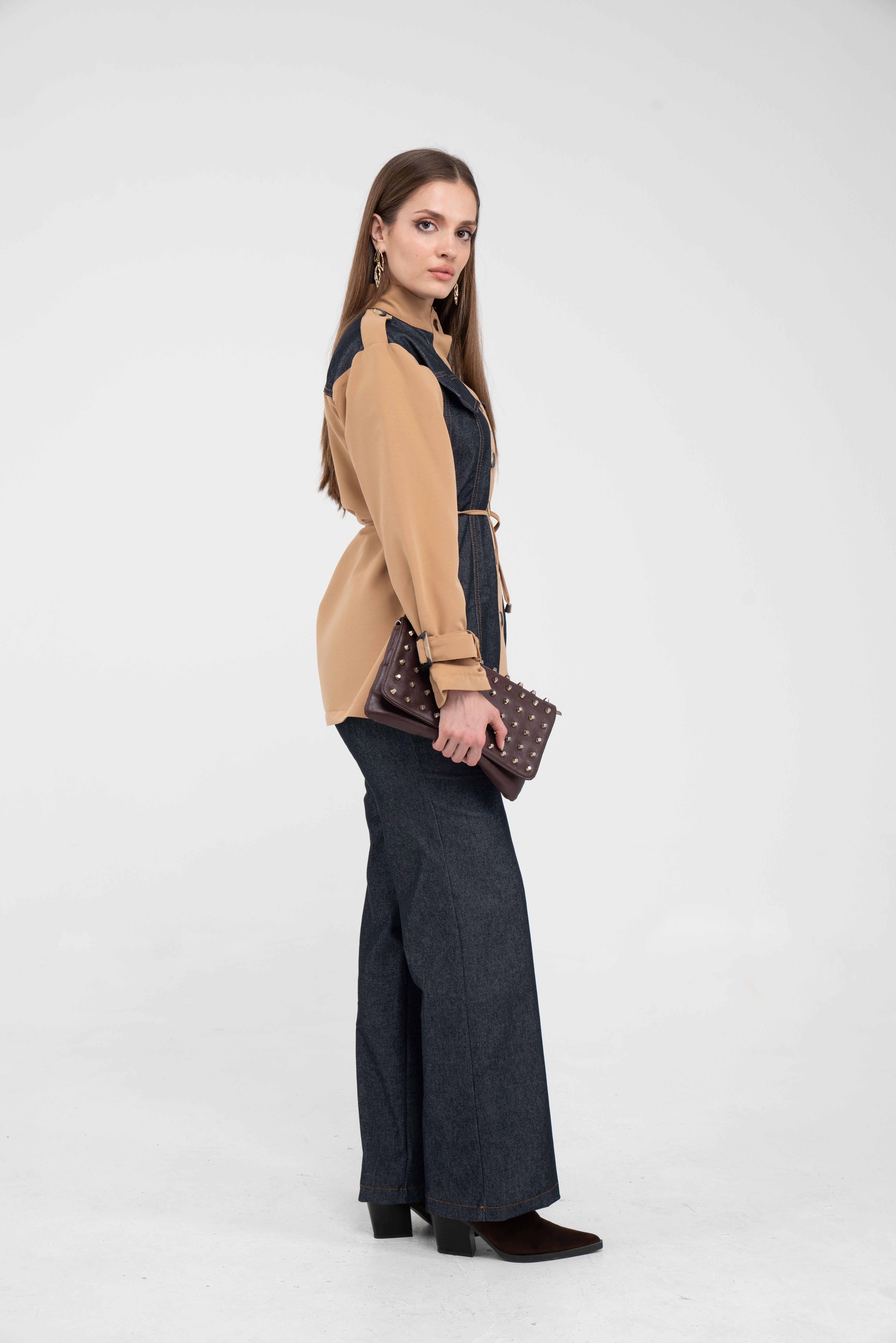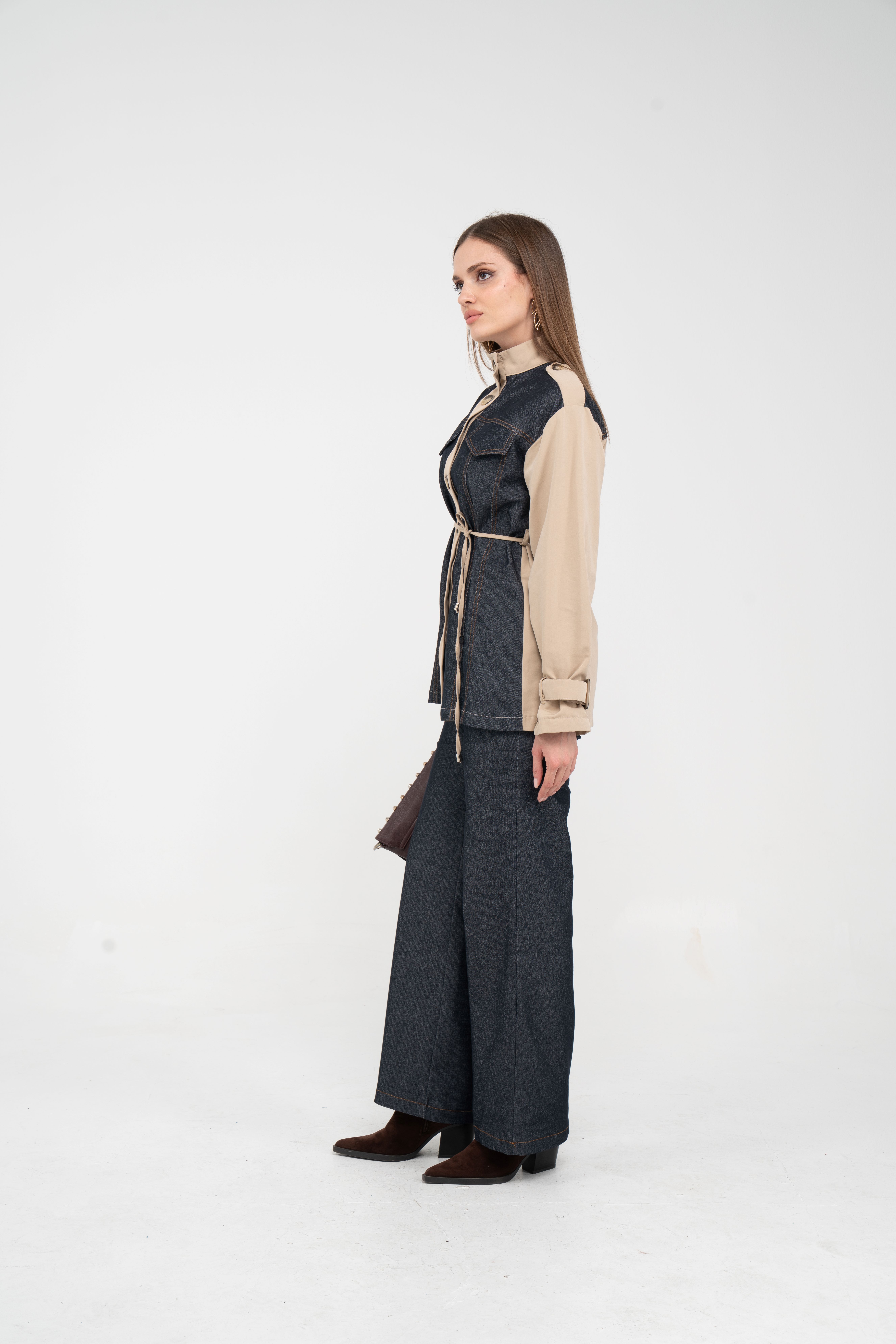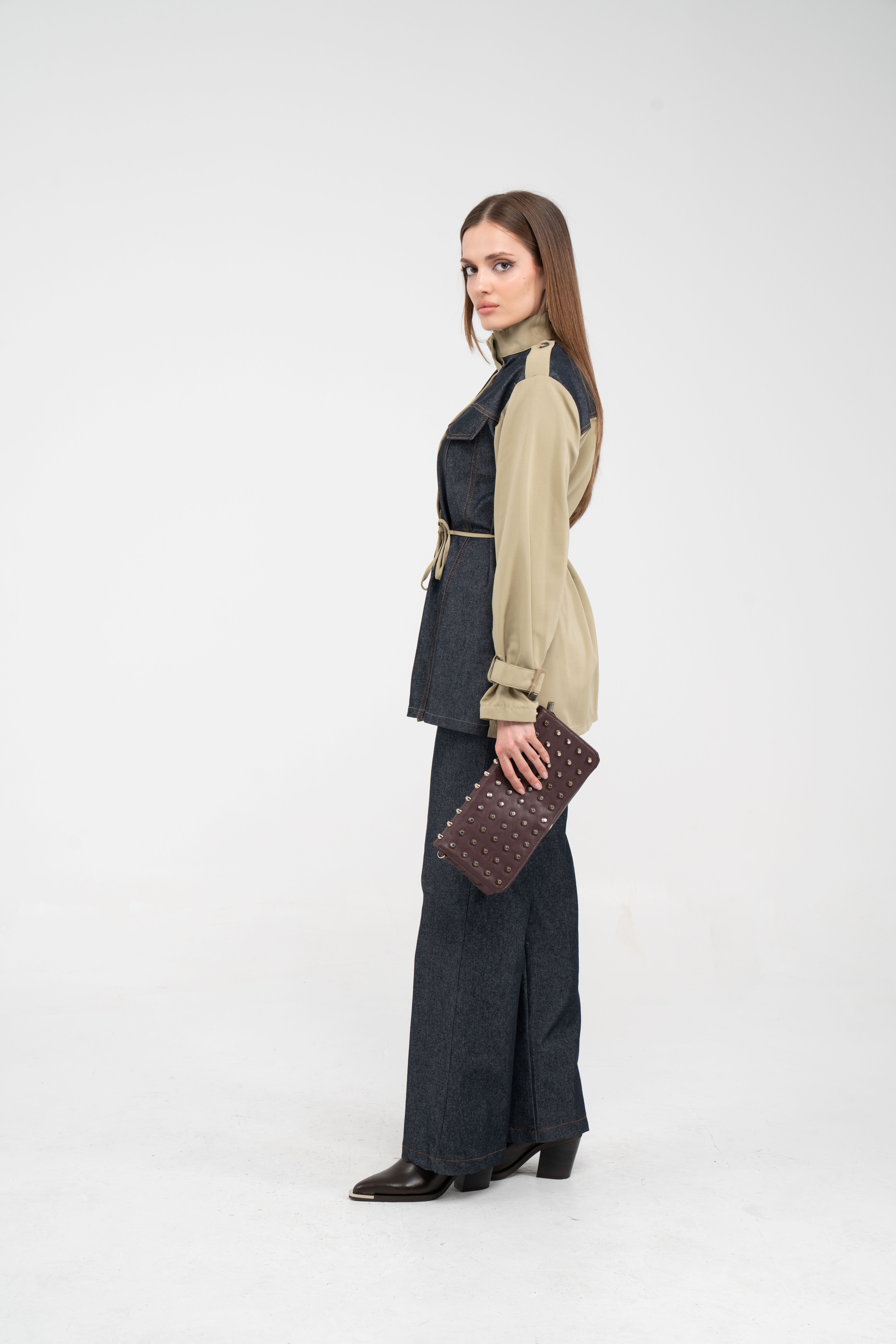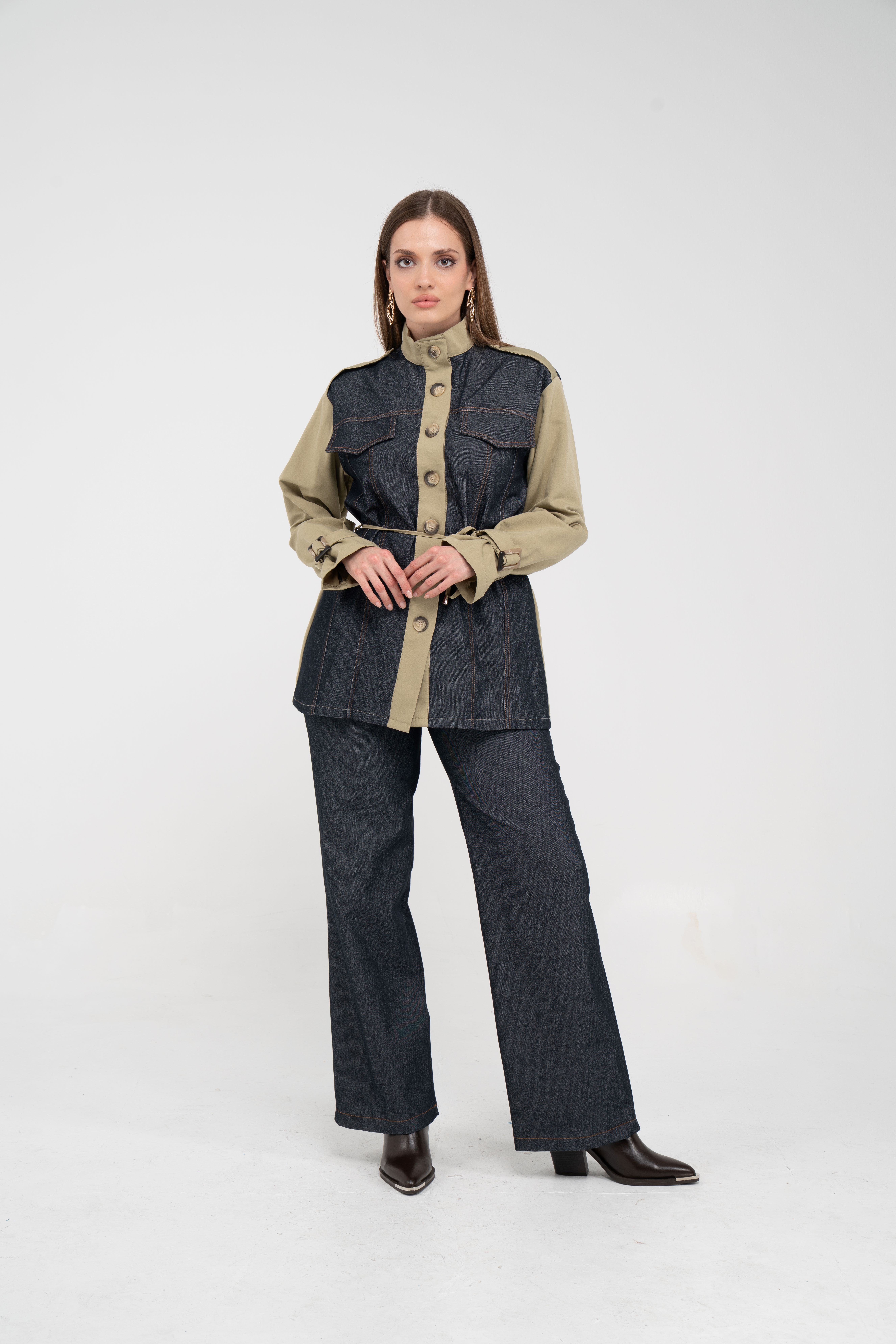 kollarındaki haki kumaş detayı ile modern bir kontrast yaratıyor.