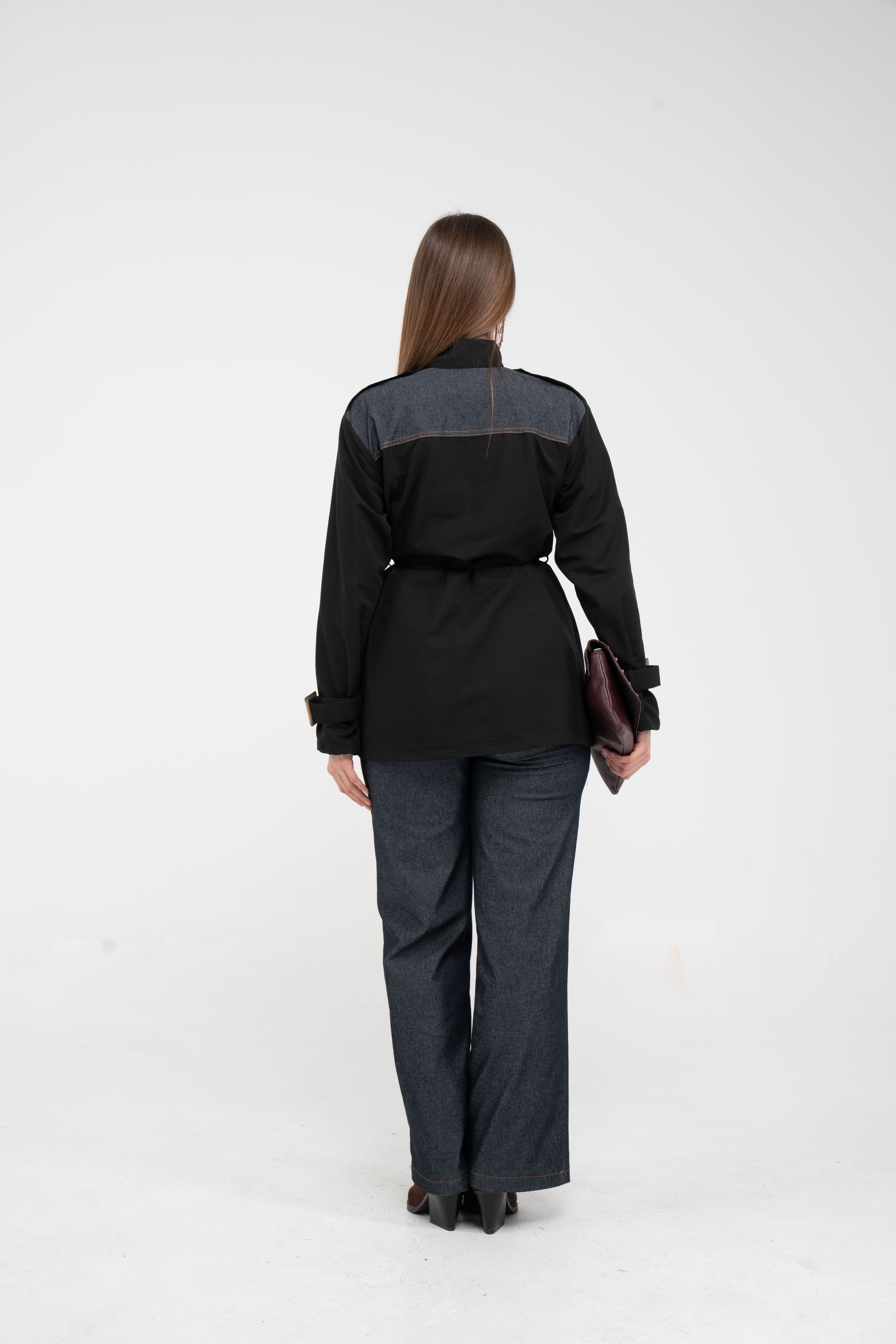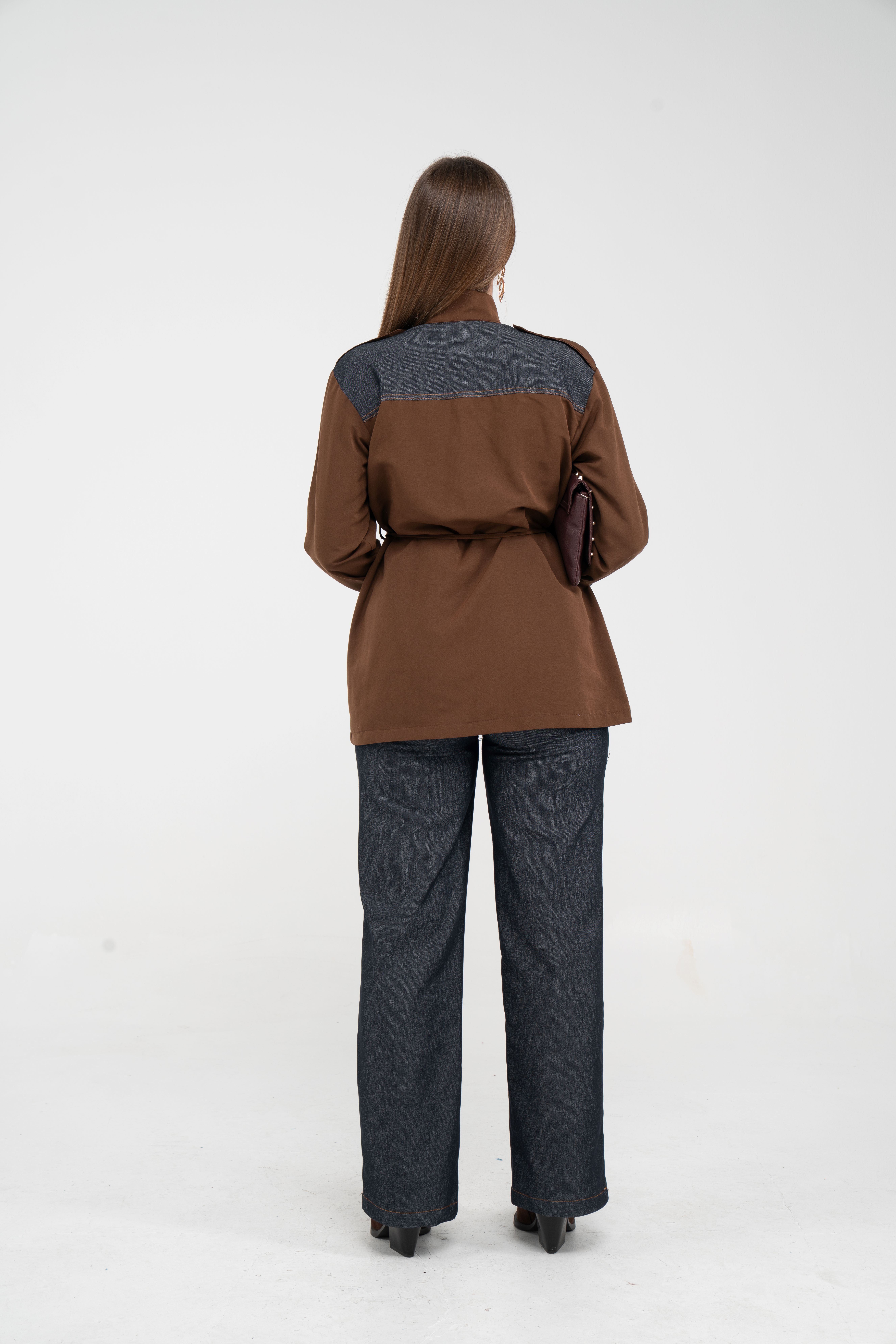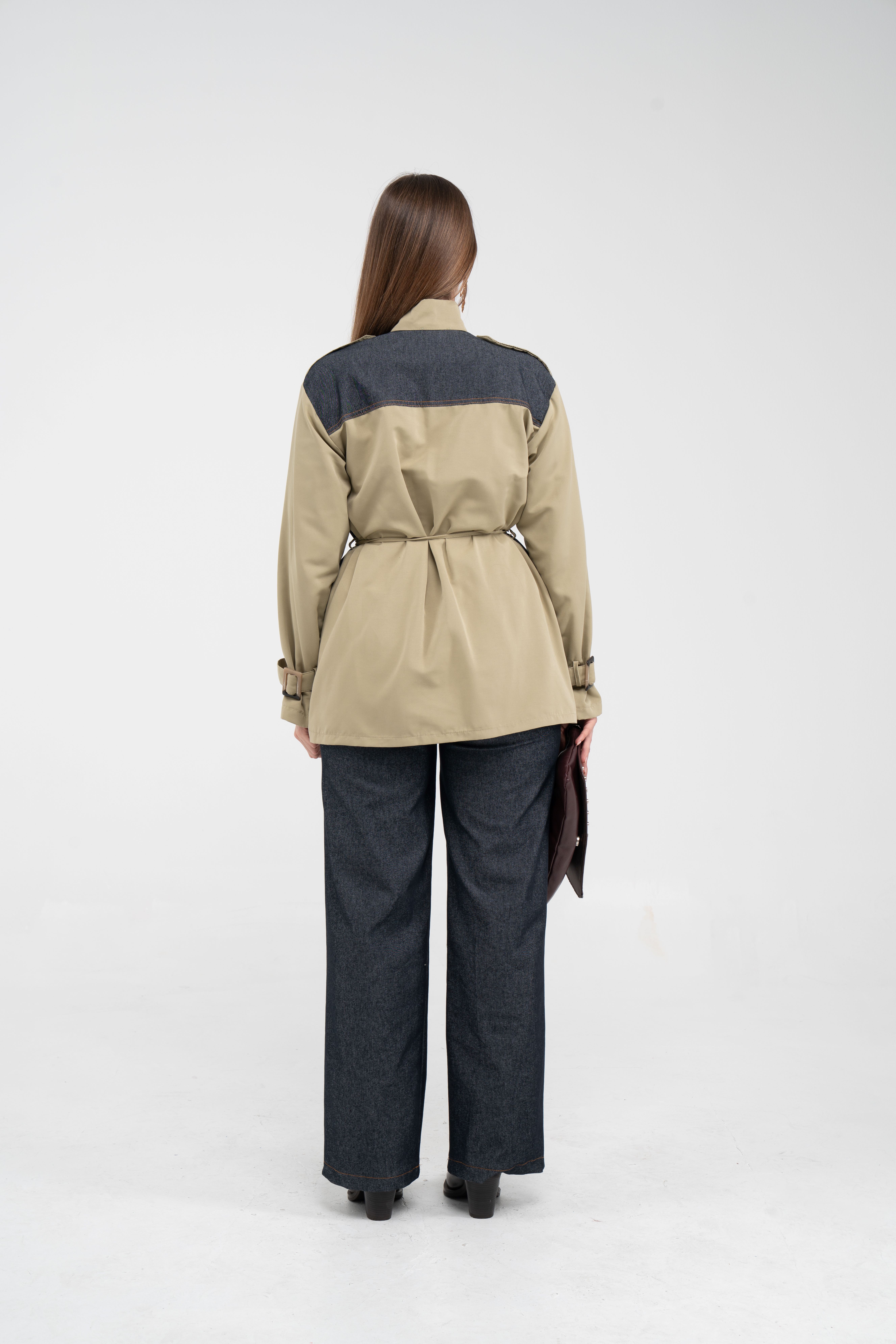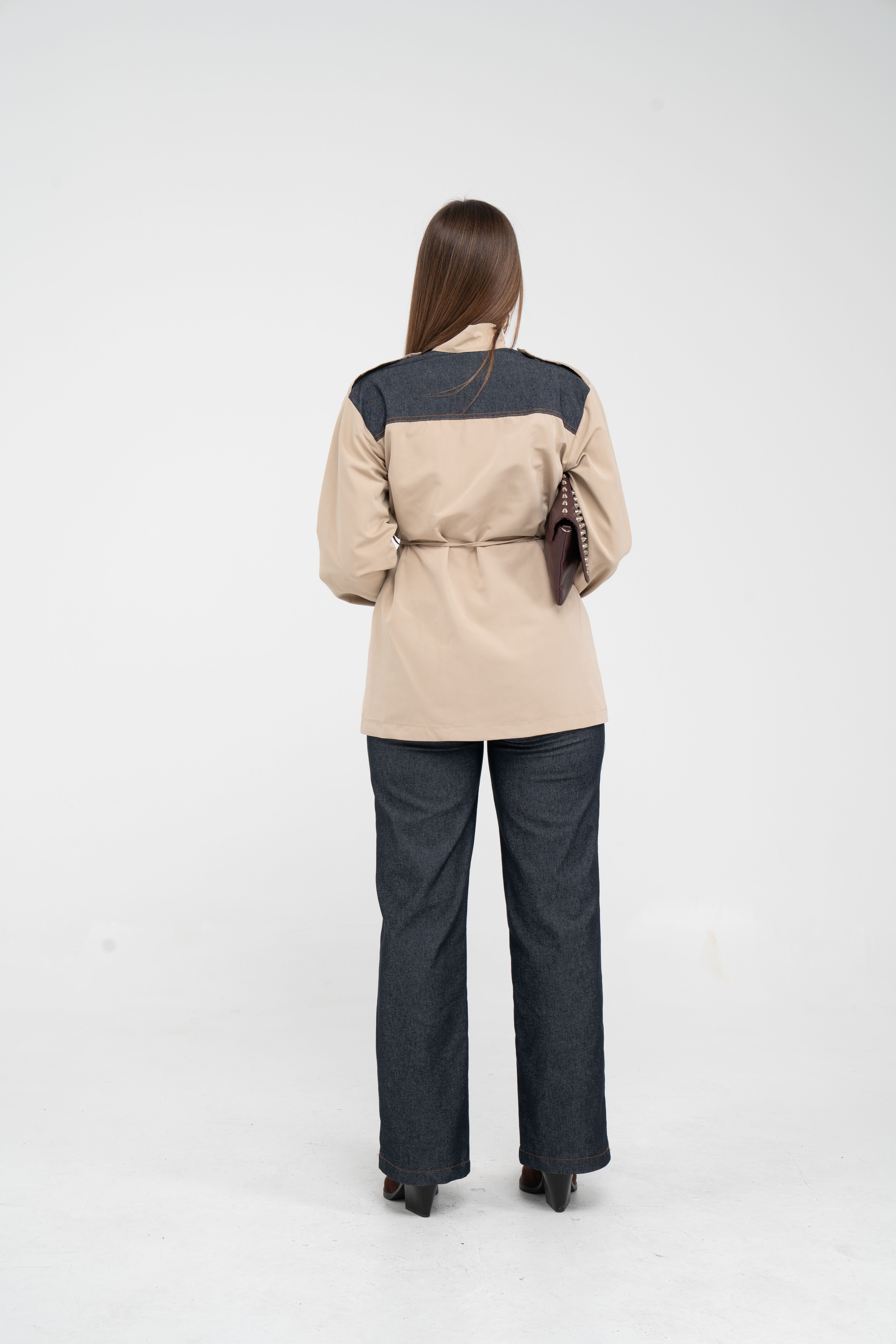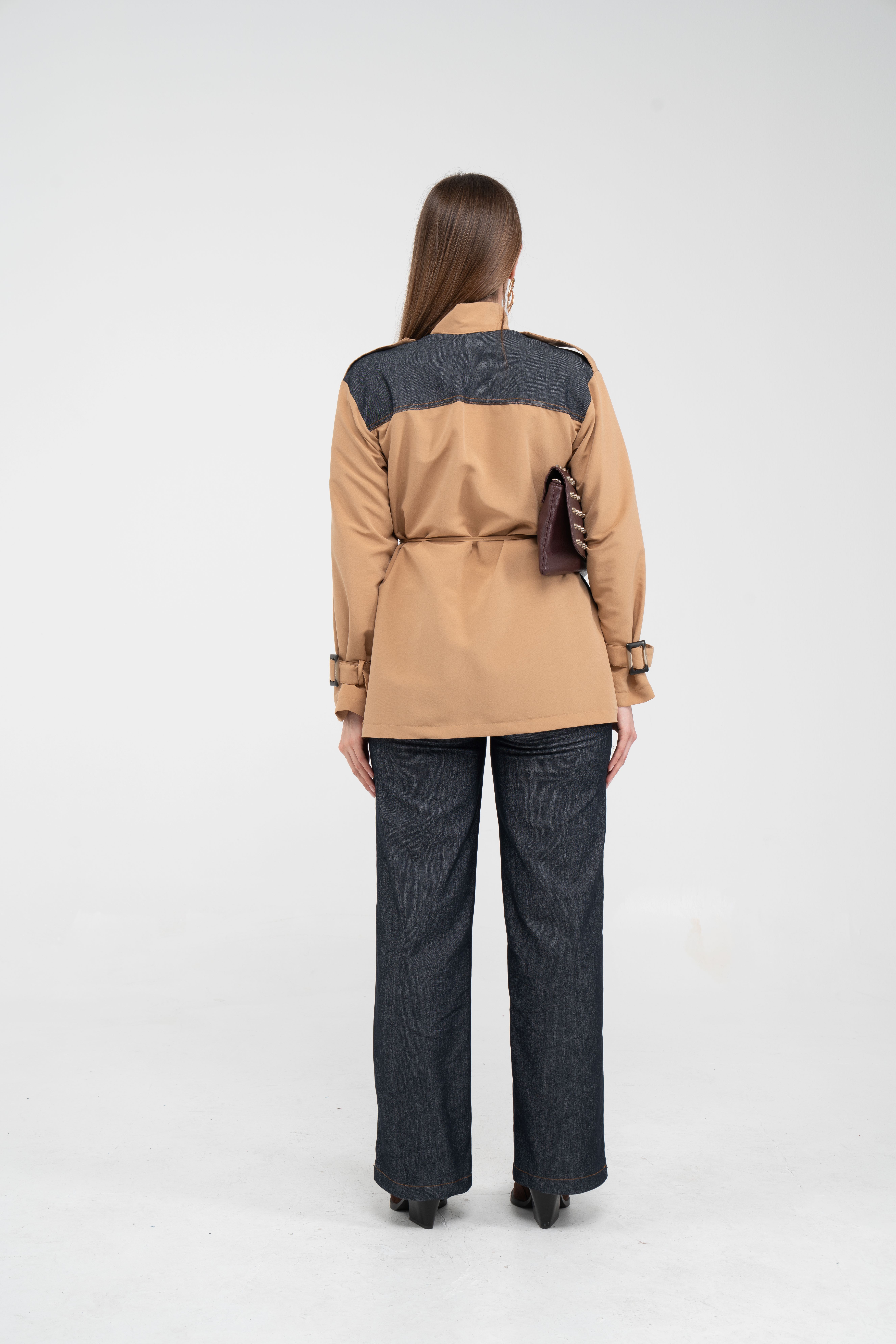 kollarındaki haki kumaş detayı ile modern bir kontrast yaratıyor.