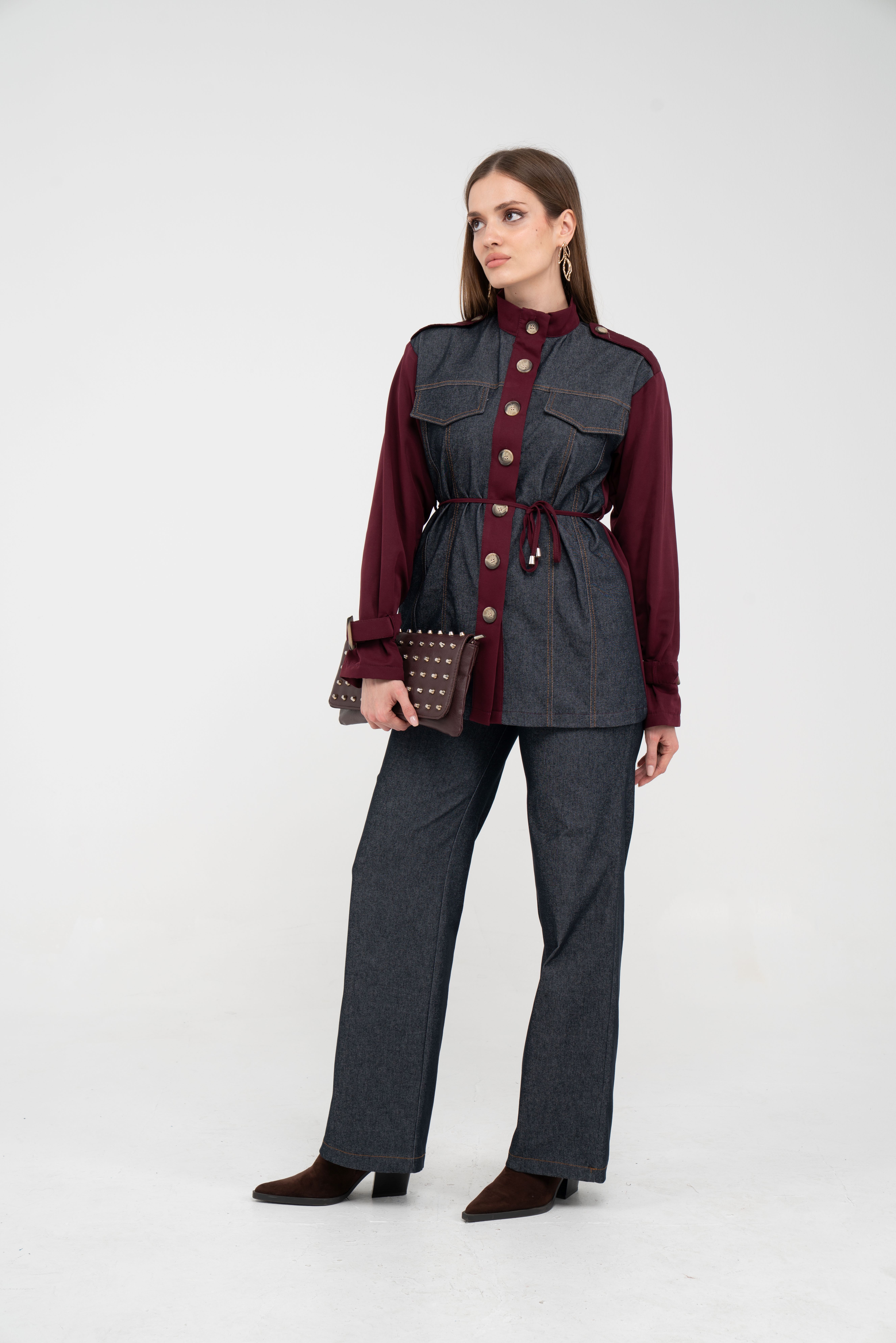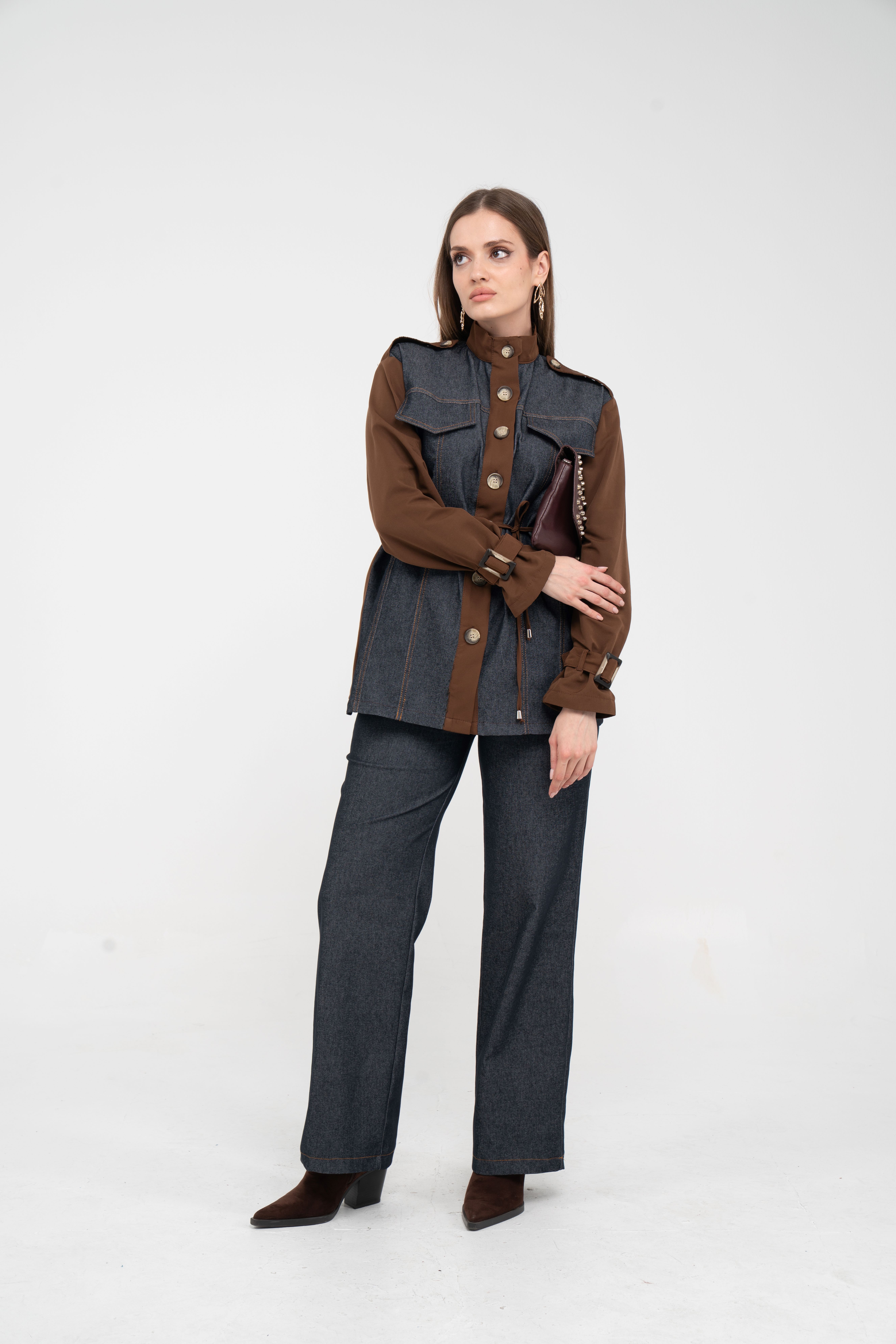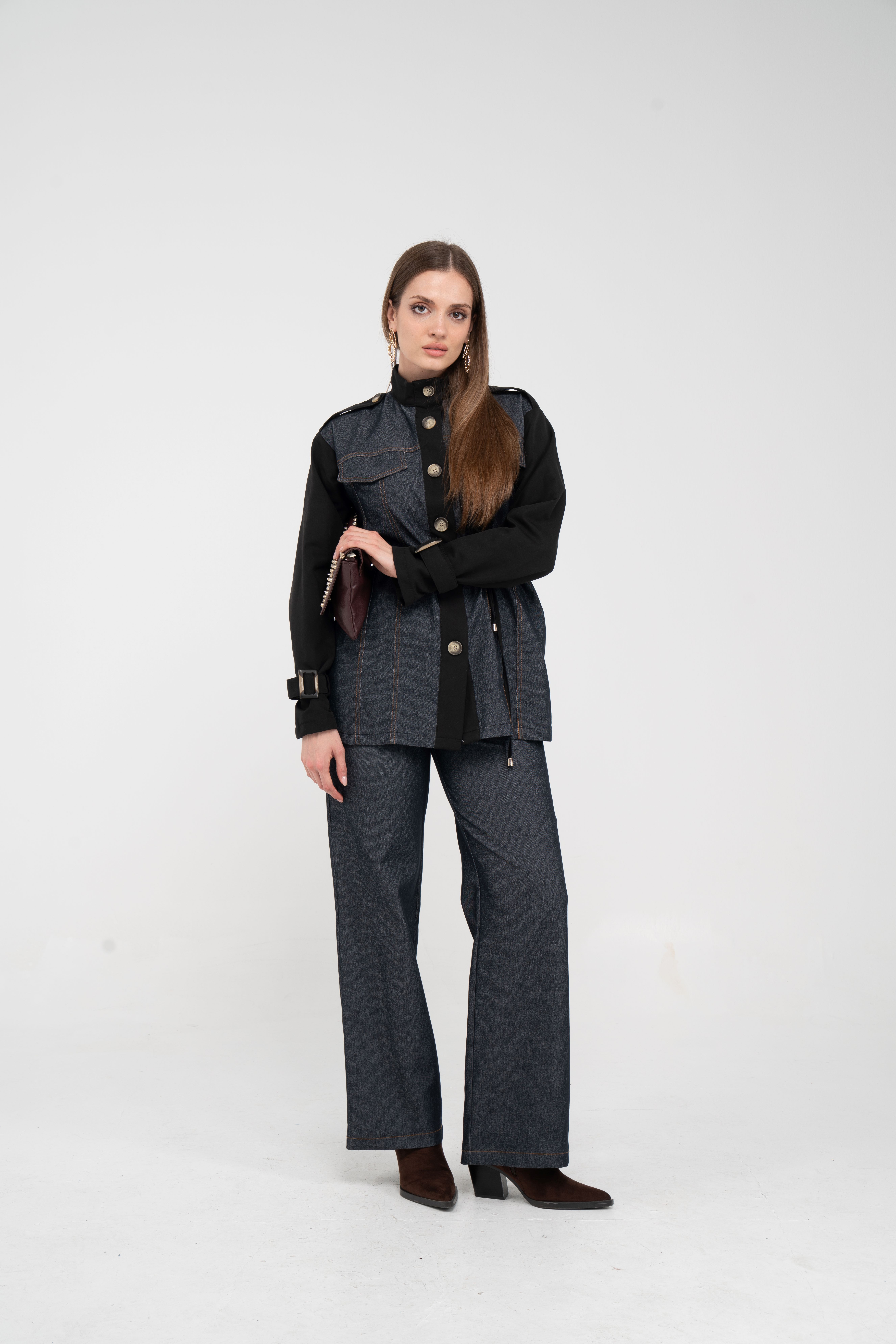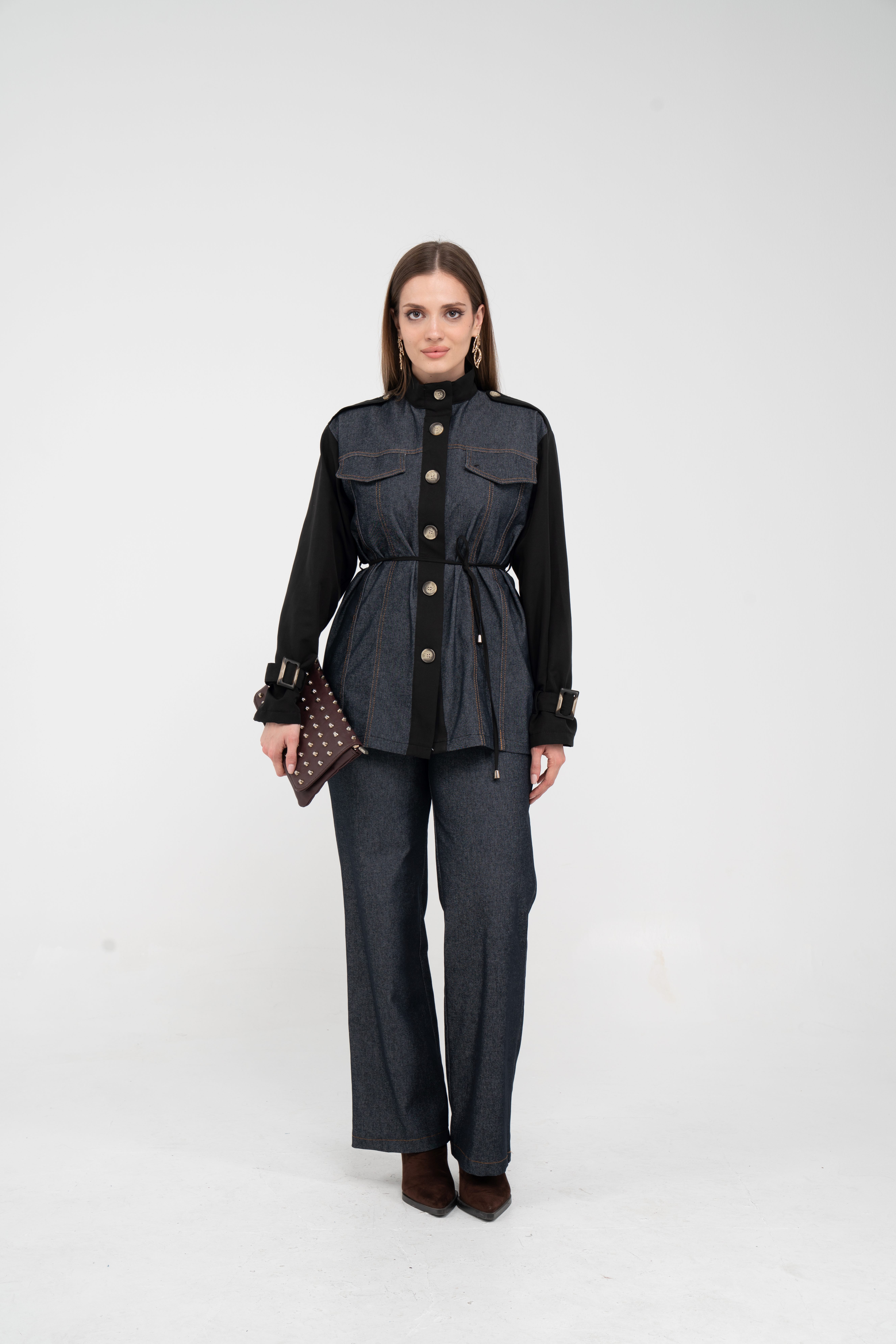 Üst kısmı, ceket formunda düğmeli tasarımı ile smart-casual bir duruş kazandırırken,