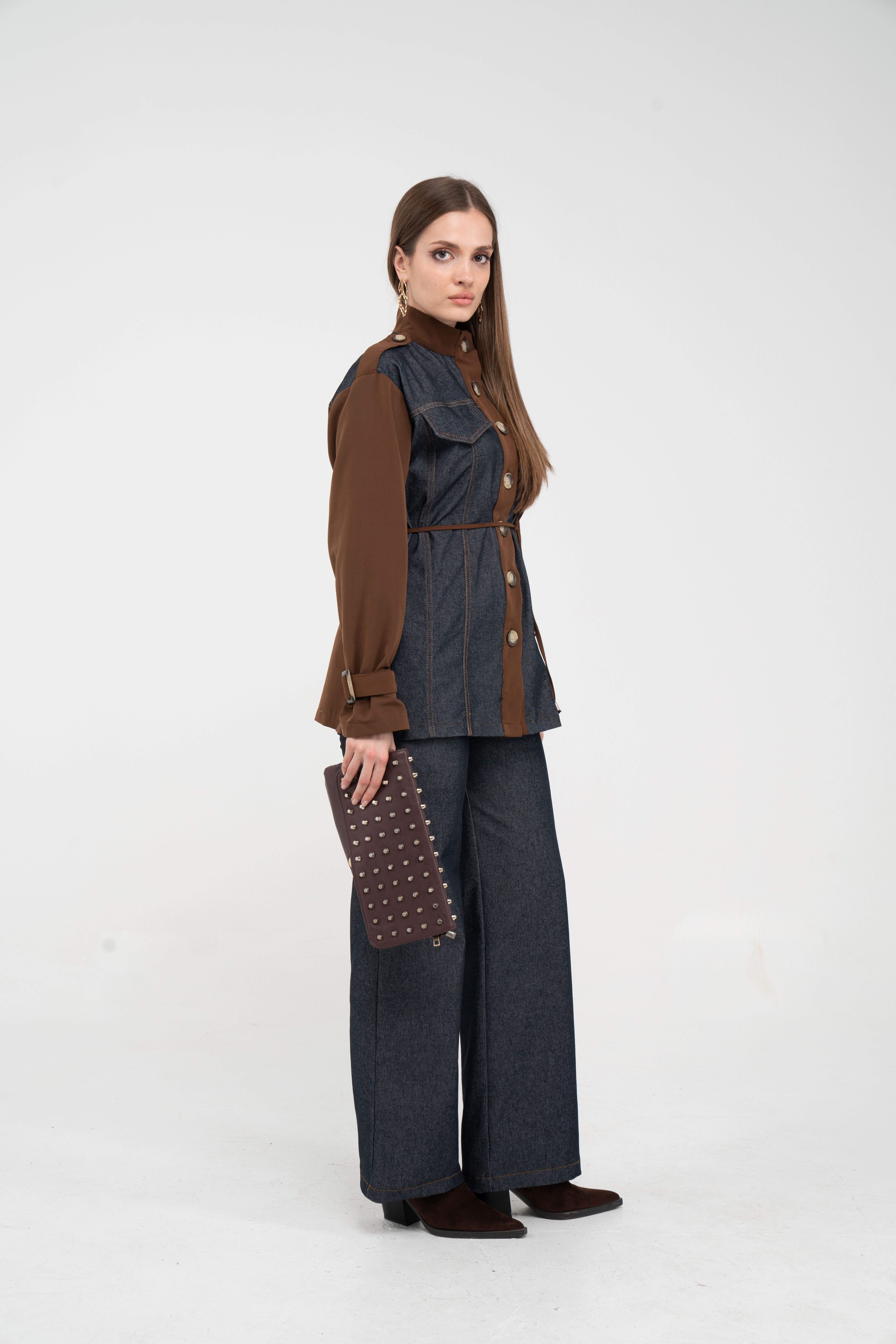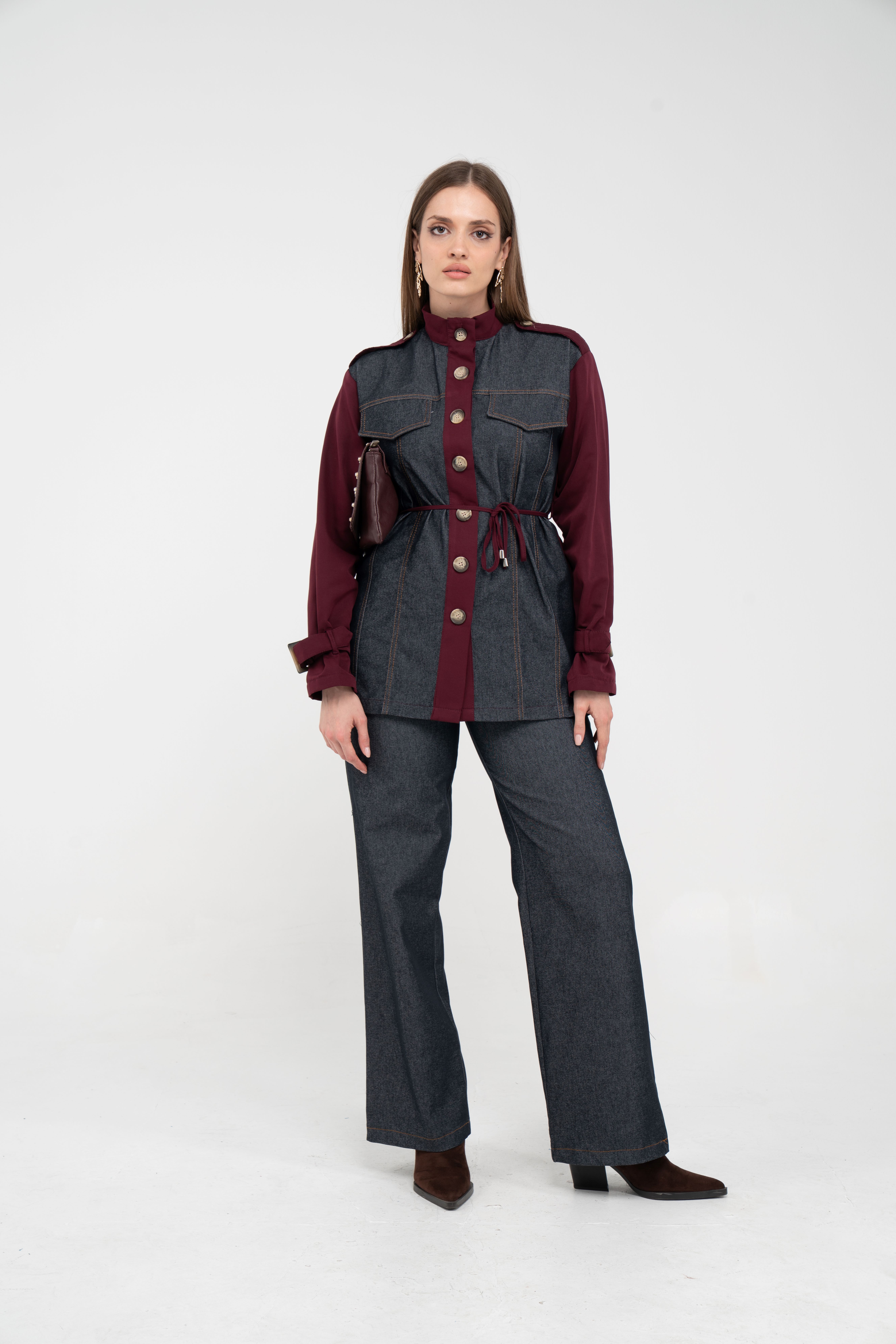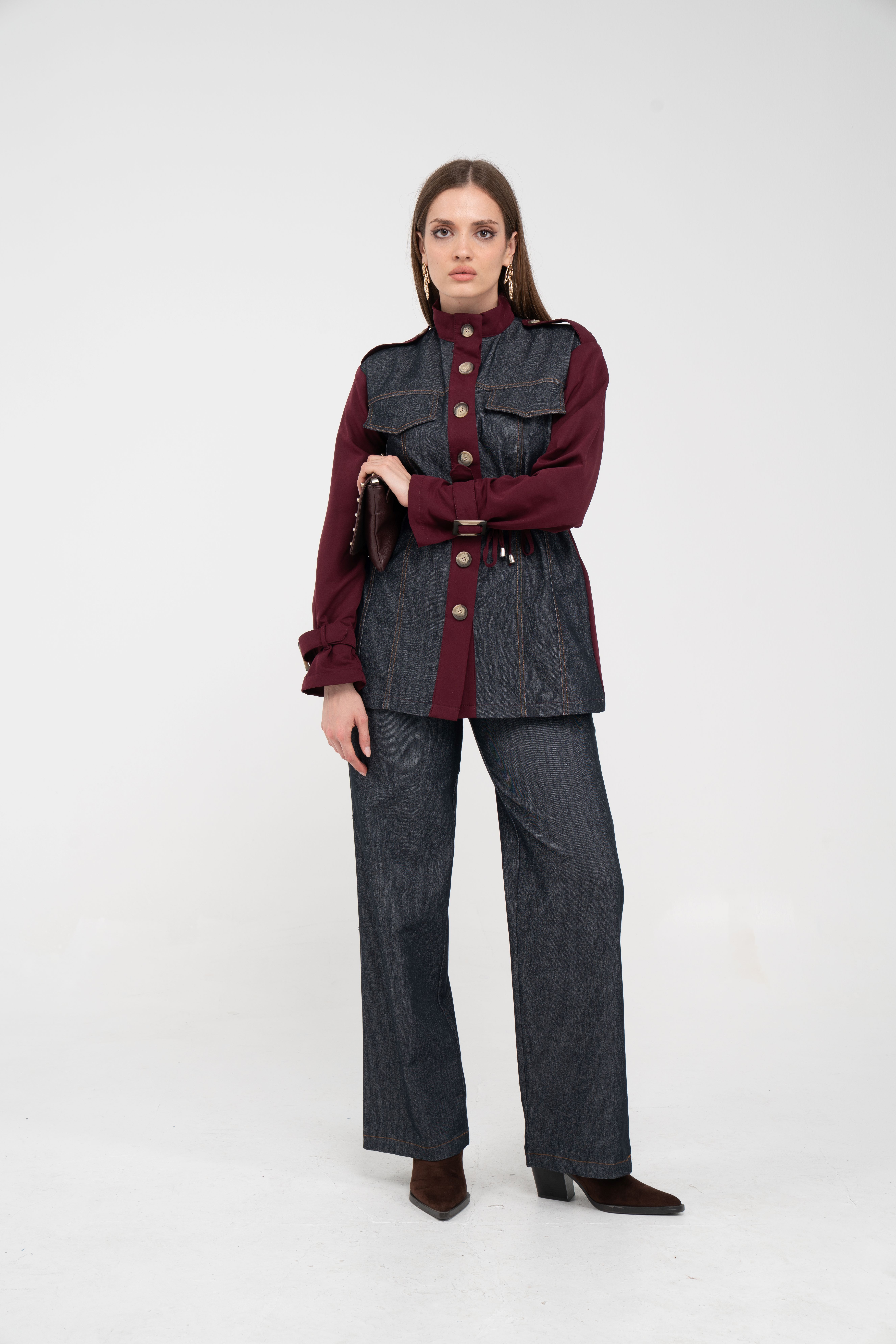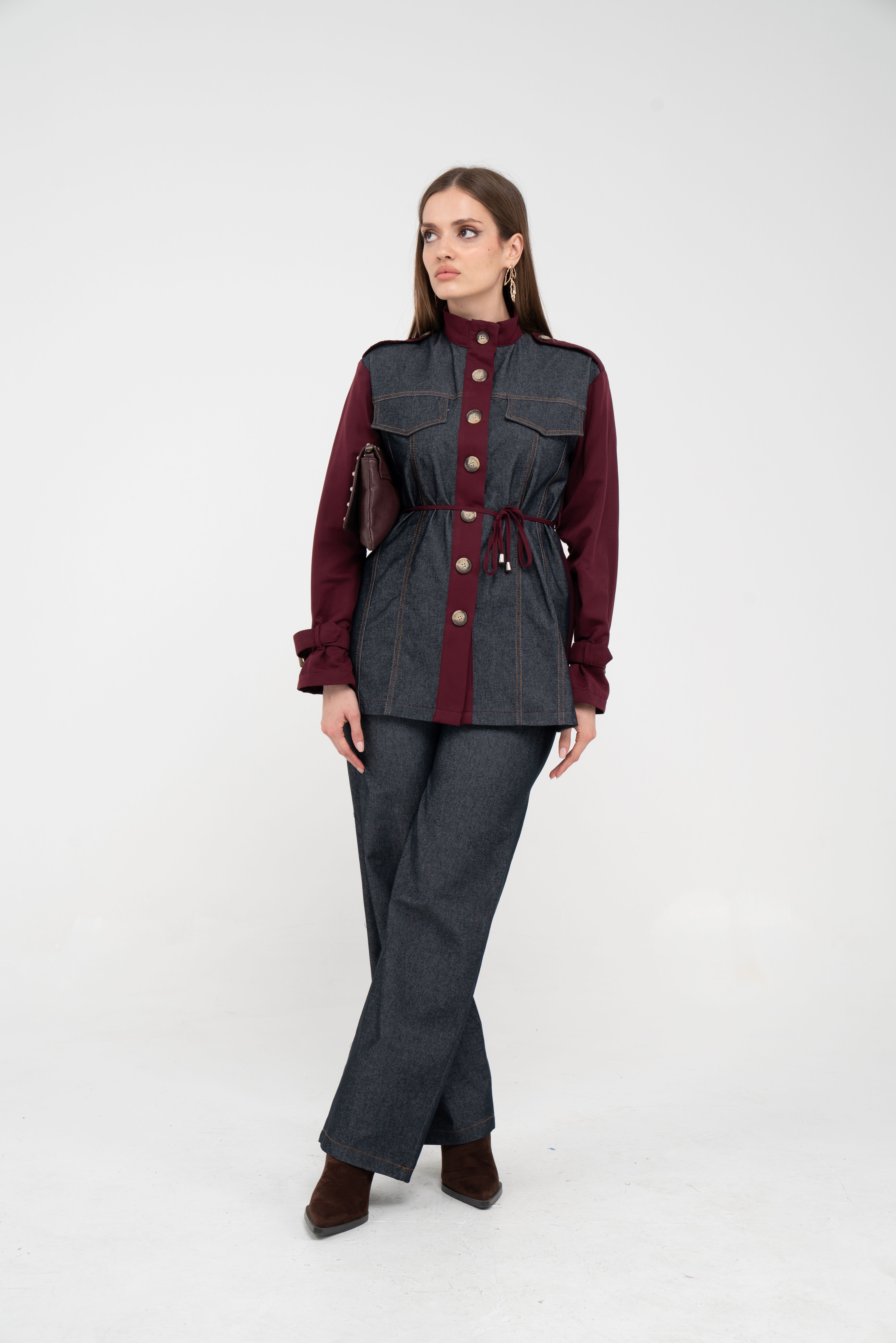 Üst kısmı, ceket formunda düğmeli tasarımı ile smart-casual bir duruş kazandırırken,
