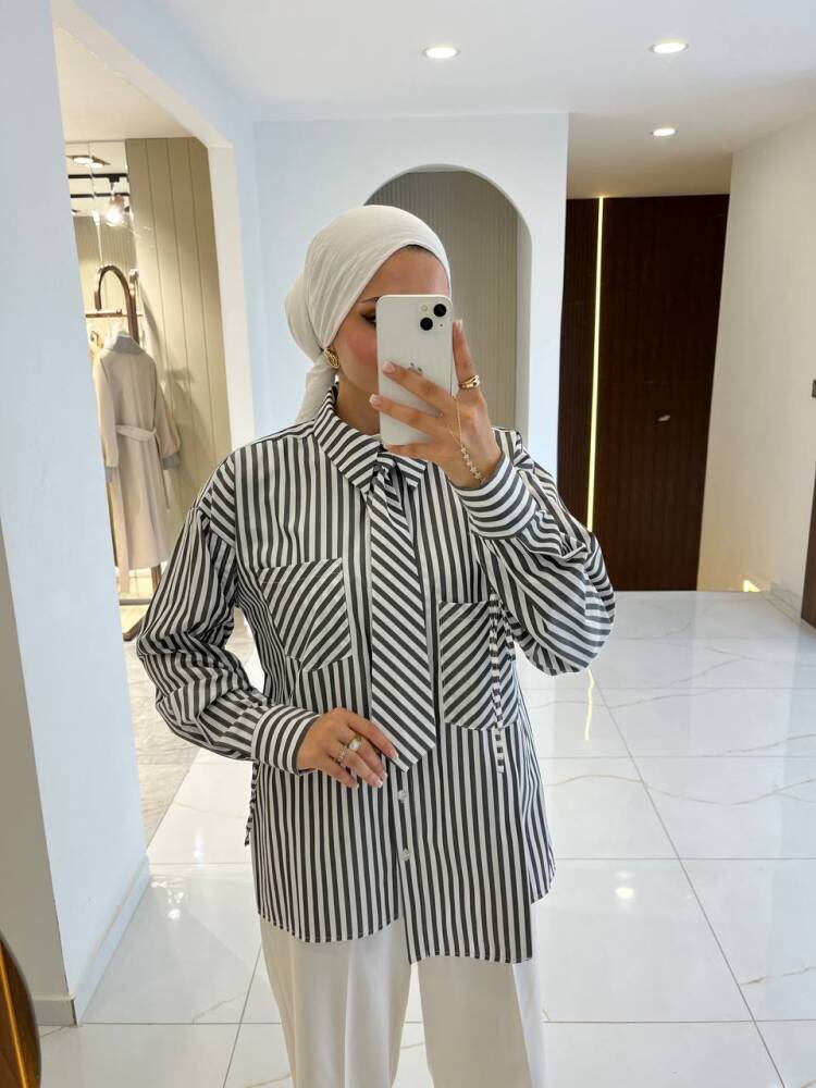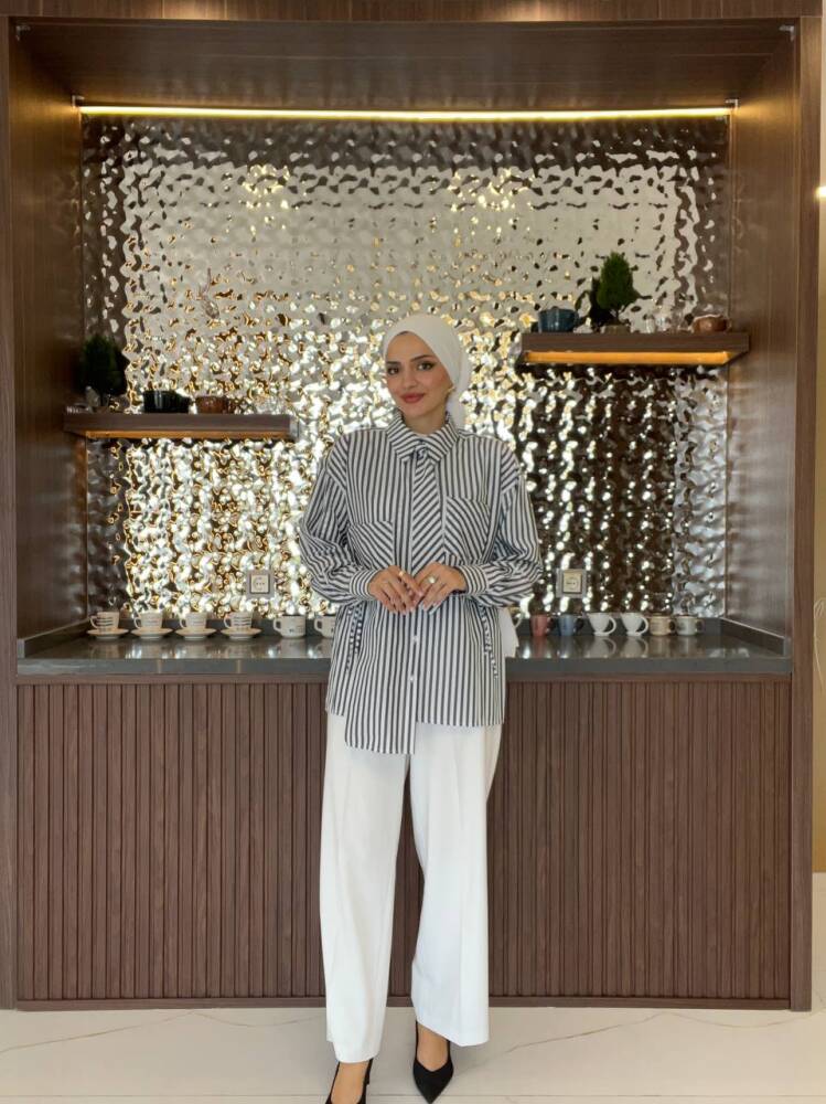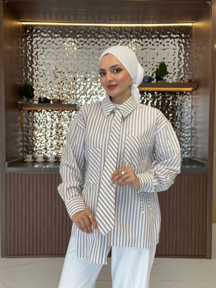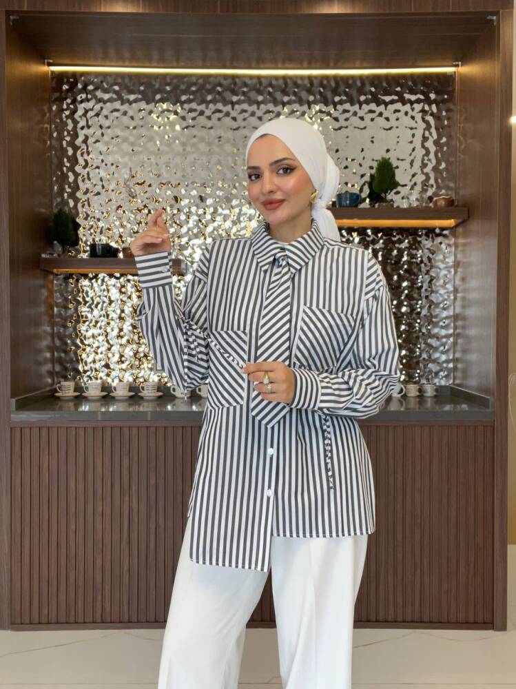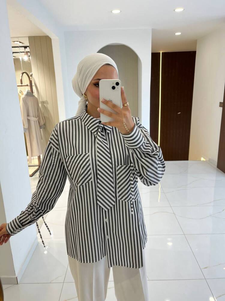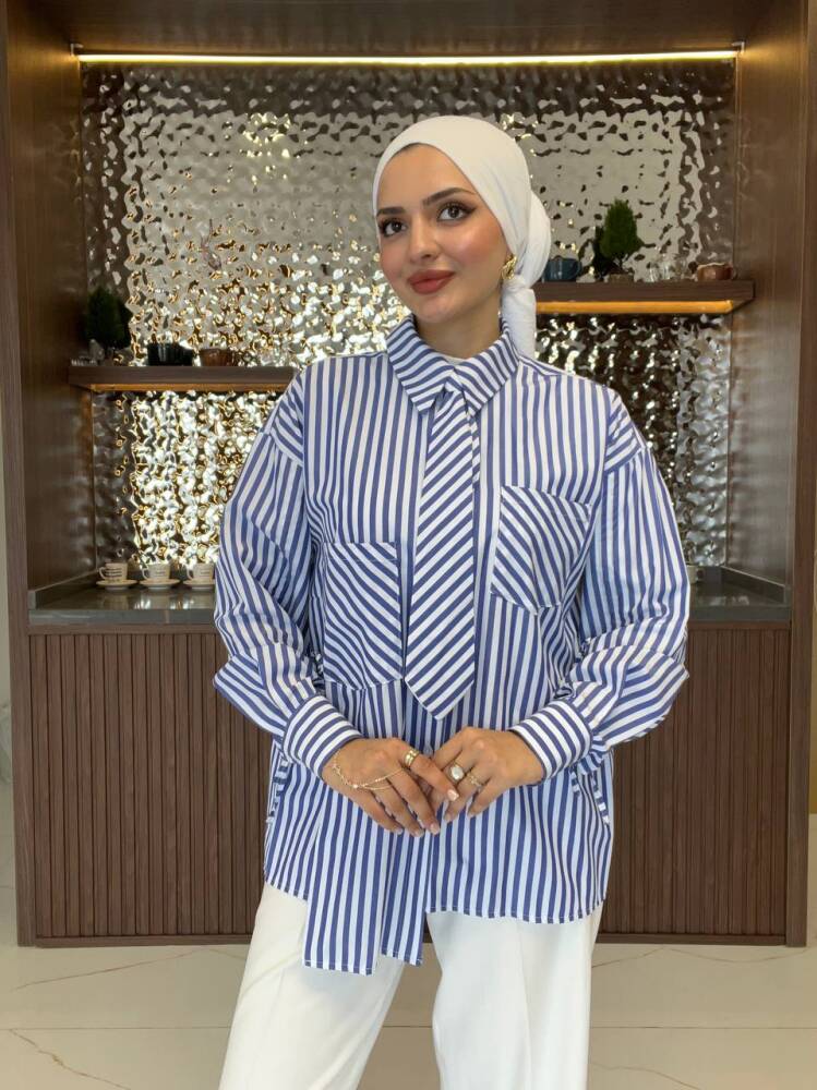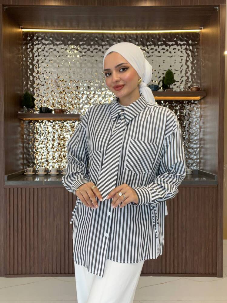 Gelince Haber VerKravat detaylı çizgili kadın gömlek, klasik şıklığı modern bir dokunuşla buluşturuyor. Dikey çizgili deseni vücut formunu zarif gösterirken, göğüs cepleri ve ön kısmındaki kravat detayı dikkat çekici bir duruş kazandırır. Yumuşak kumaş yapısı sayesinde gün boyu konfor sağlar. Ofis kombinlerinden günlük şıklığa kadar geniş bir kullanım alanı sunar. Beyaz veya siyah pantolonlarla kolayca kombinlenebilir.