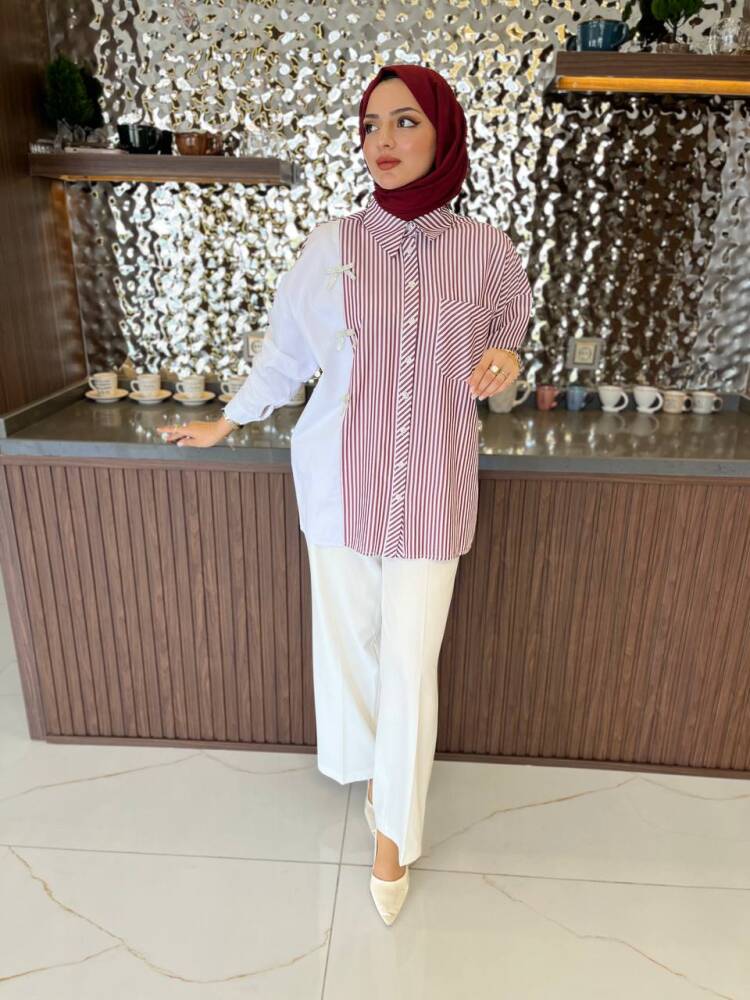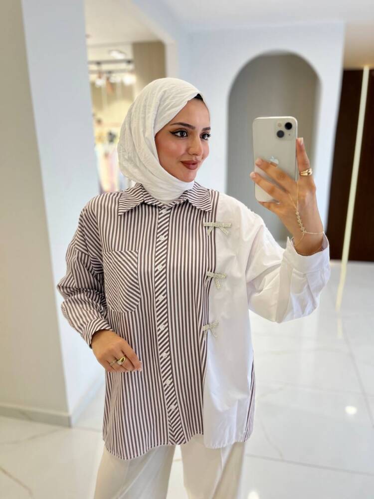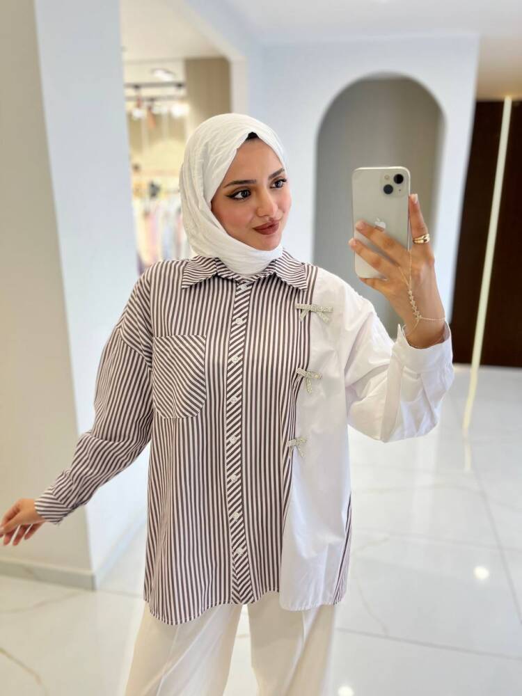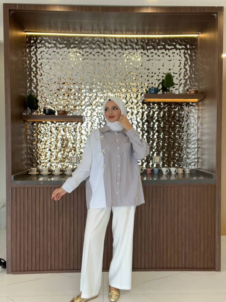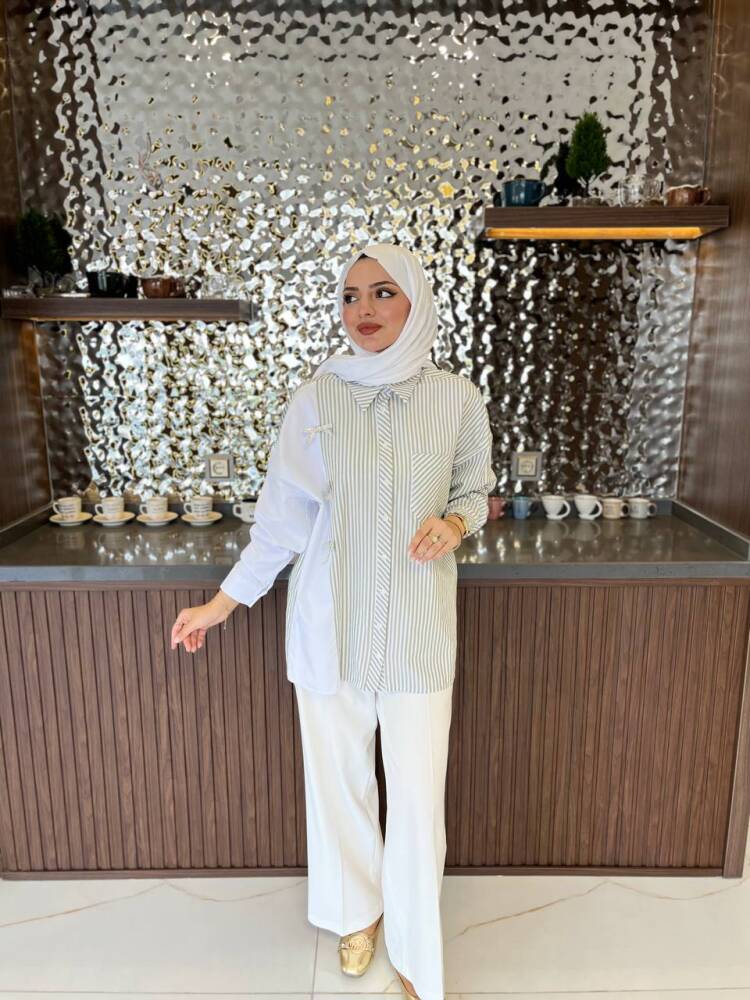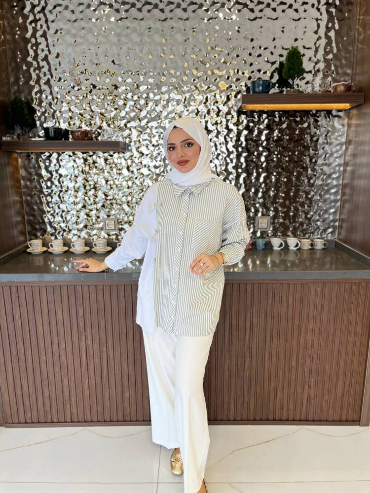 Gelince Haber VerZarif çizgili deseni ve fiyonk detaylarıyla öne çıkan bu iki renkli gömlek, modern şıklığın en zarif hali. Rahat kesimi sayesinde günlük kullanıma uygundur, aynı zamanda özel kombinlerde de sofistike bir görünüm sunar.