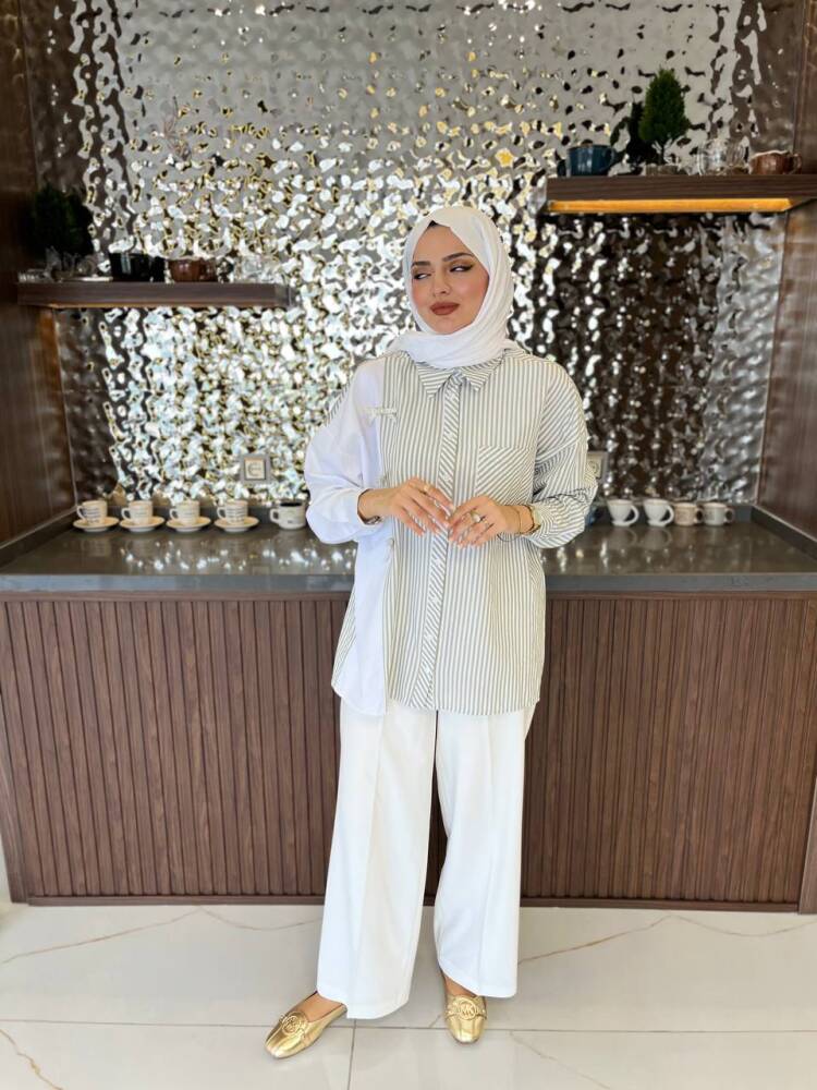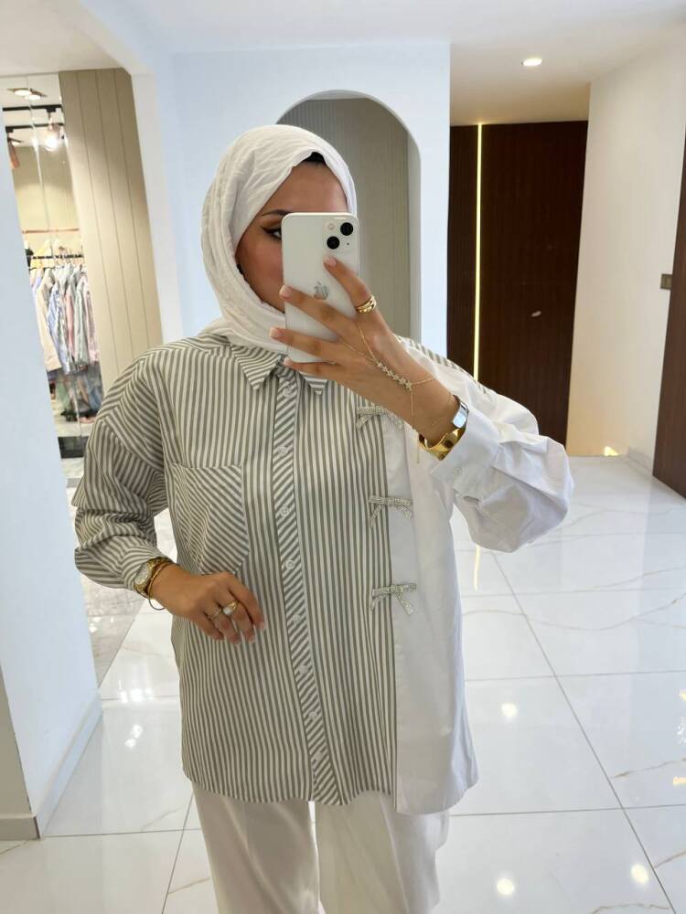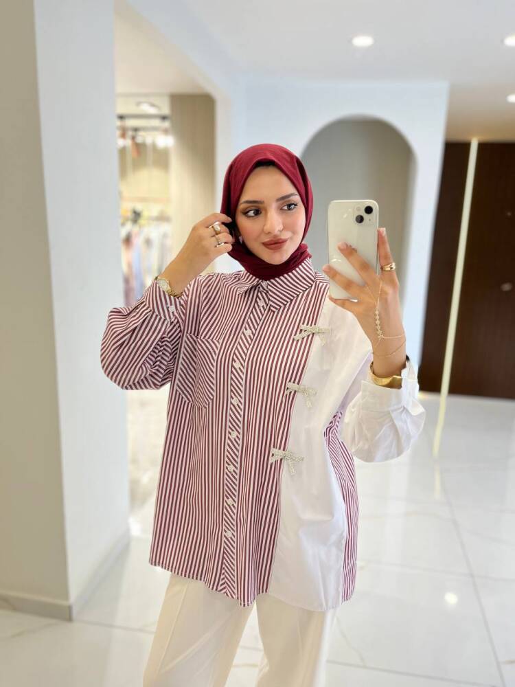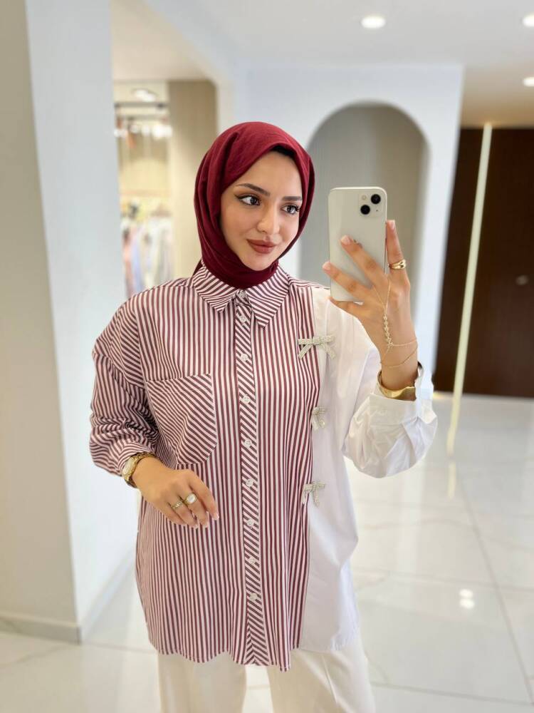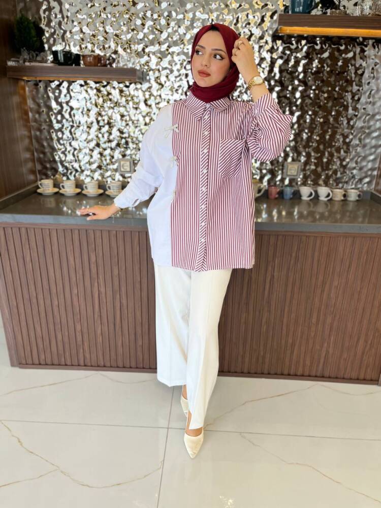Gelince Haber VerZarif çizgili deseni ve fiyonk detaylarıyla öne çıkan bu iki renkli gömlek, modern şıklığın en zarif hali. Rahat kesimi sayesinde günlük kullanıma uygundur, aynı zamanda özel kombinlerde de sofistike bir görünüm sunar.