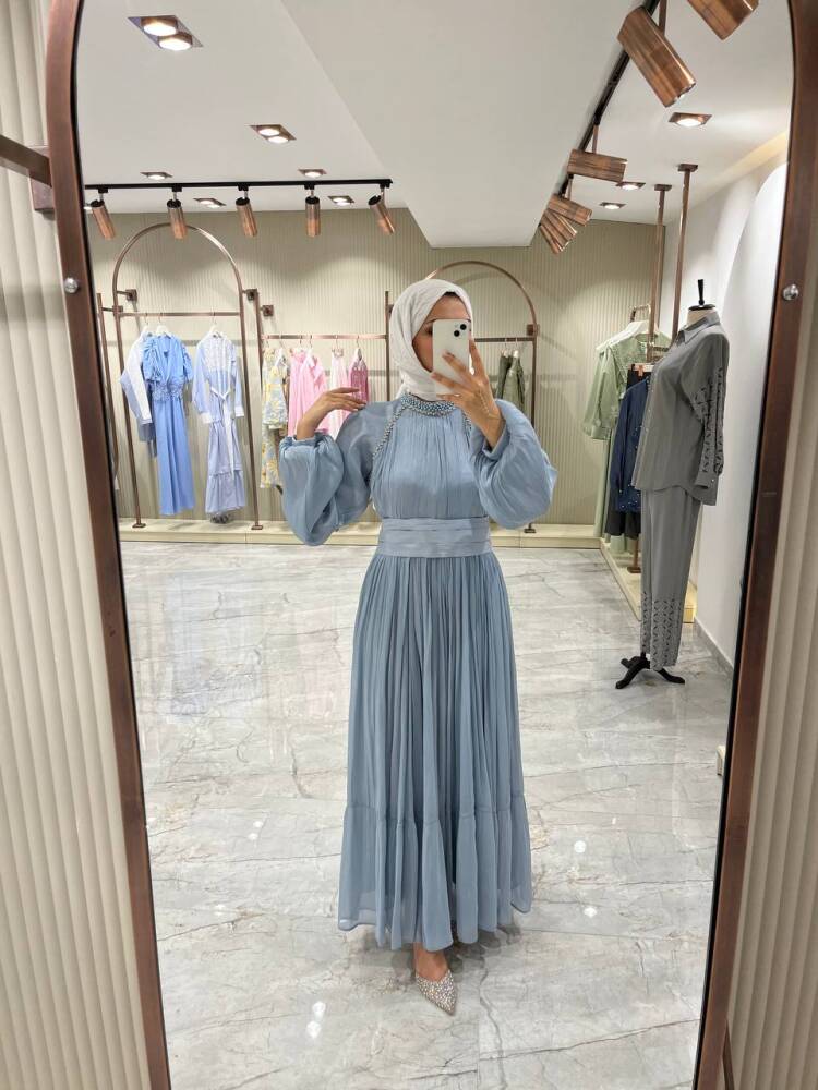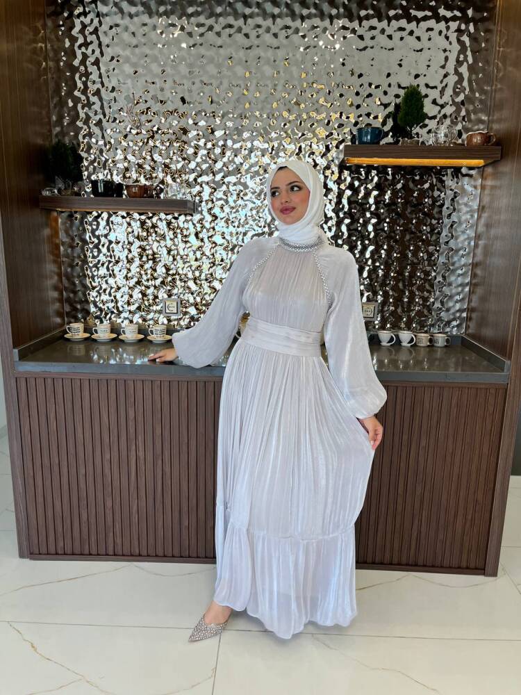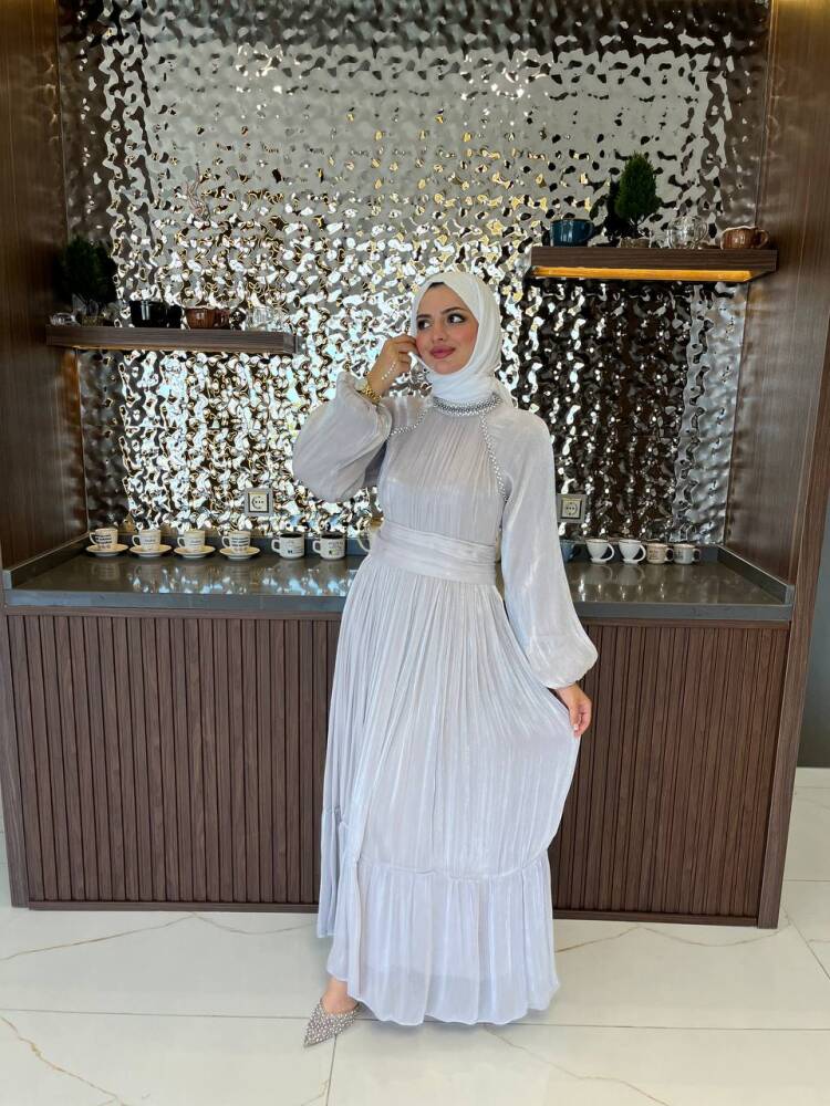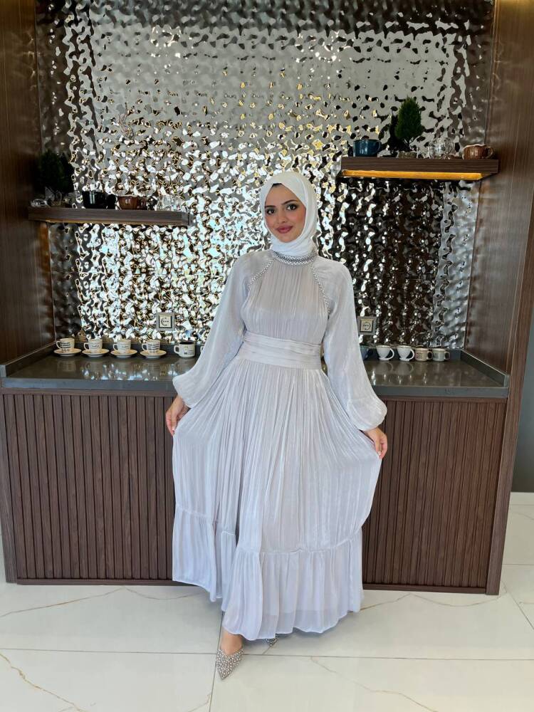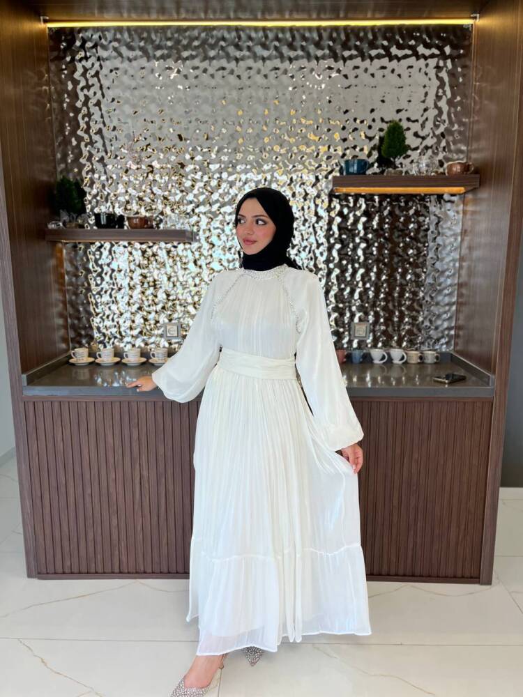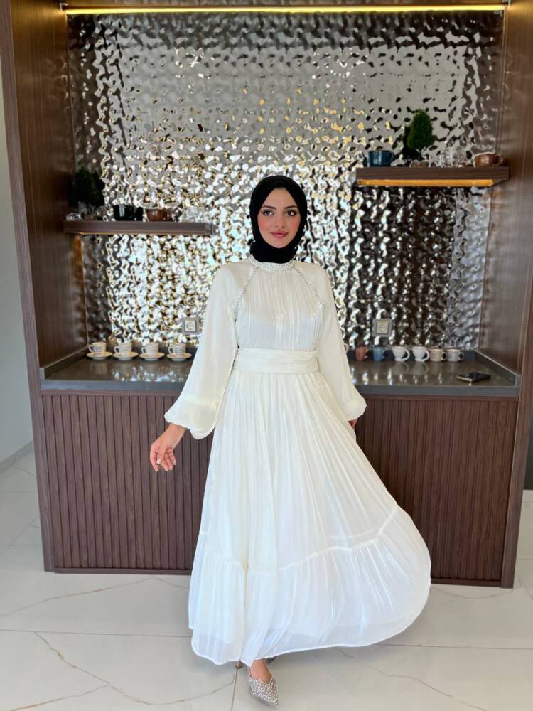 Gelince Haber VerKemer detaylı şifon beyaz uzun elbise, zarafeti sade bir duruşla buluşturuyor. Hafif dökümlü kumaşı ve volanlı eteğiyle romantik bir görünüm sunar. Uzun kollu ve yüksek yaka tasarımıyla hem davetlerde hem özel günlerde rahatlıkla tercih edilebilir. Bel kısmındaki kuşak detayı vücut hatlarını zarifçe vurgularken, elbiseye modern bir siluet kazandırır.