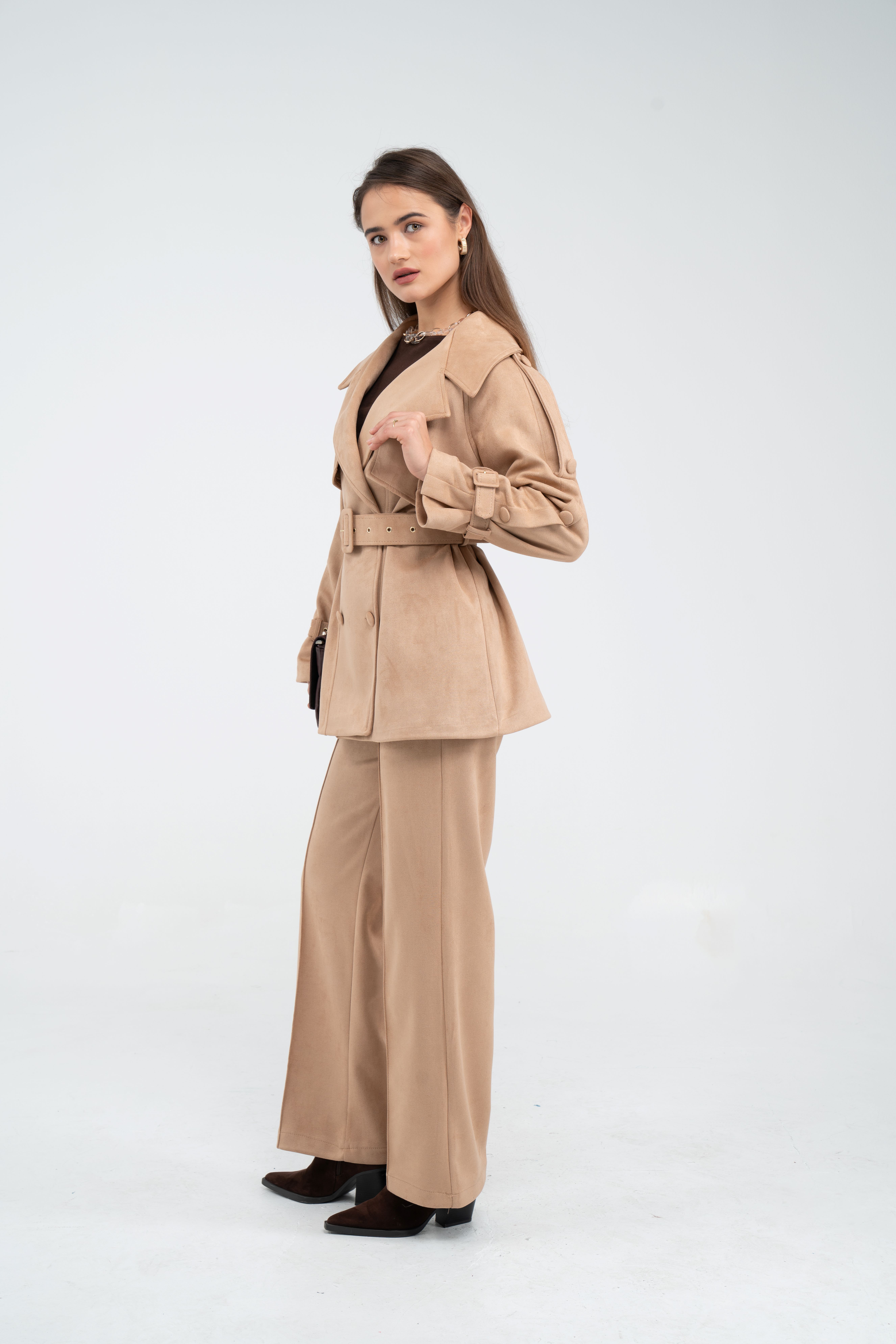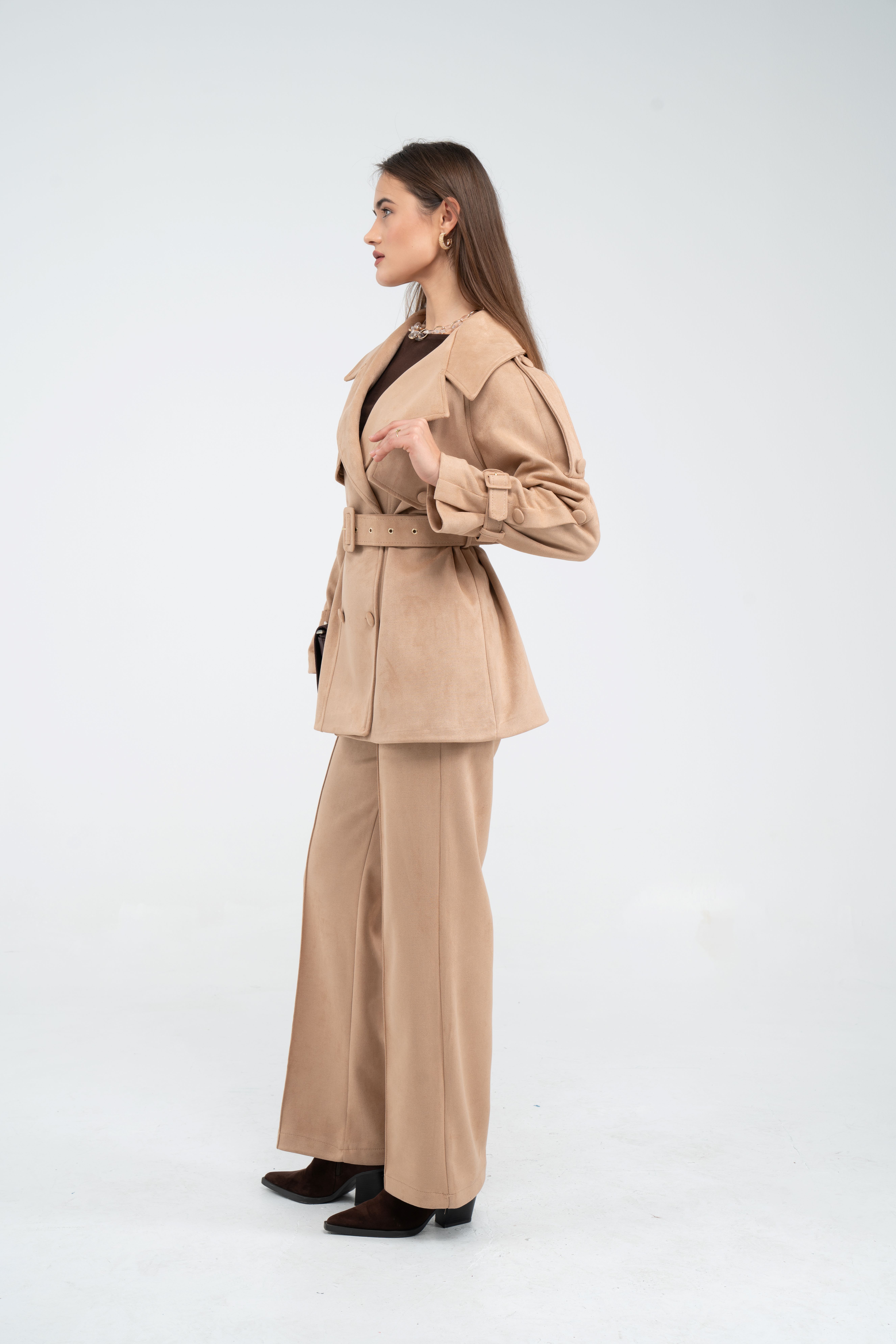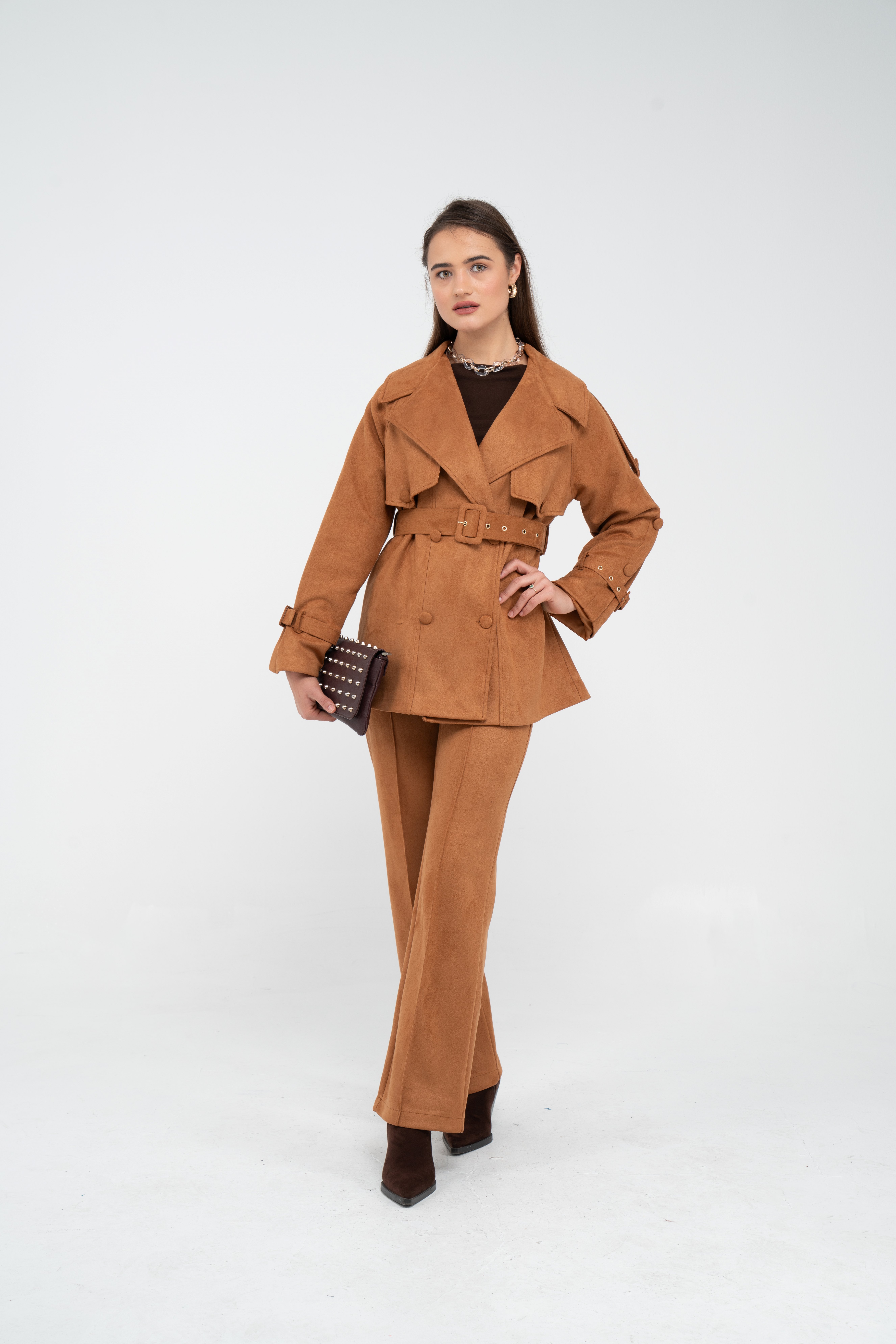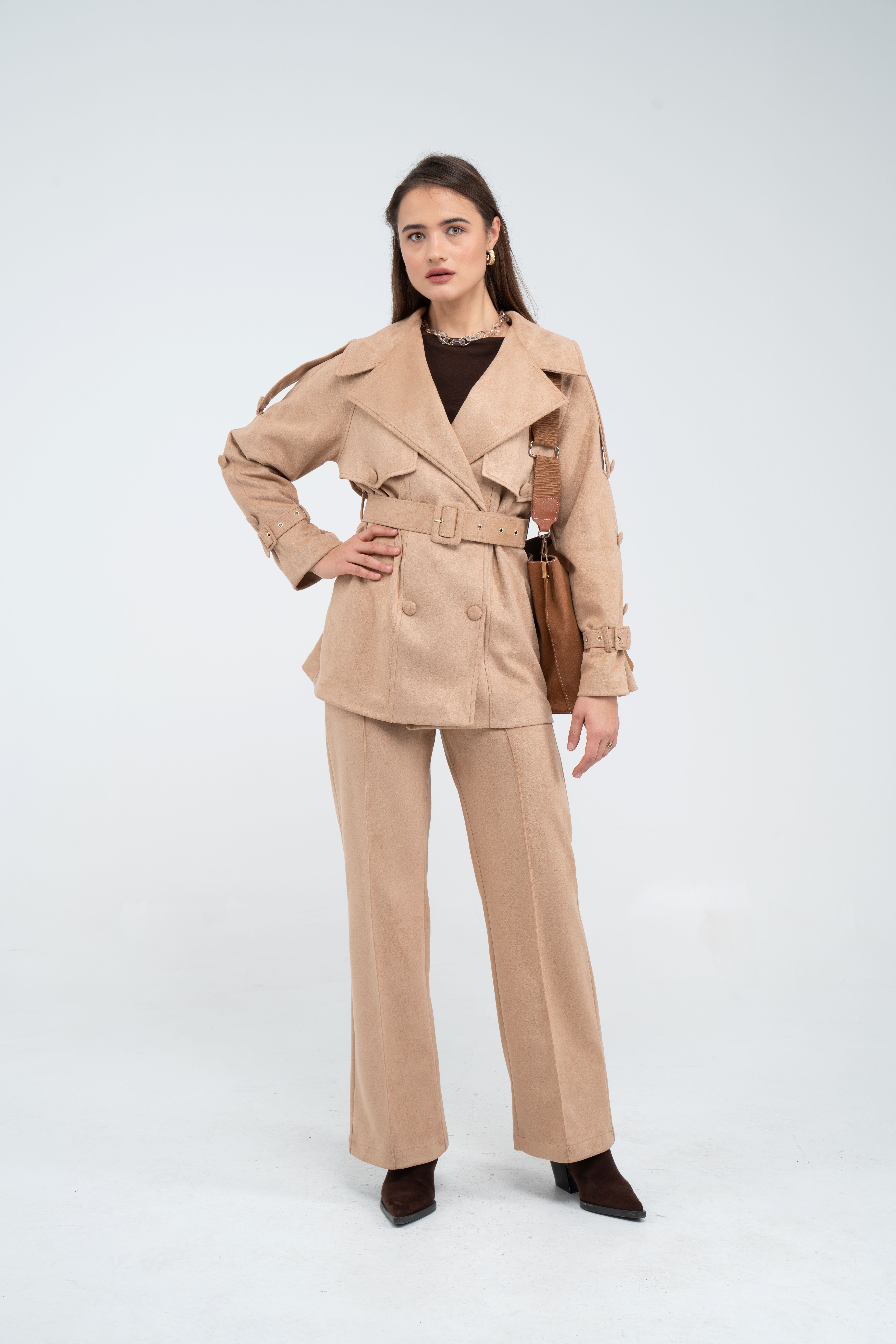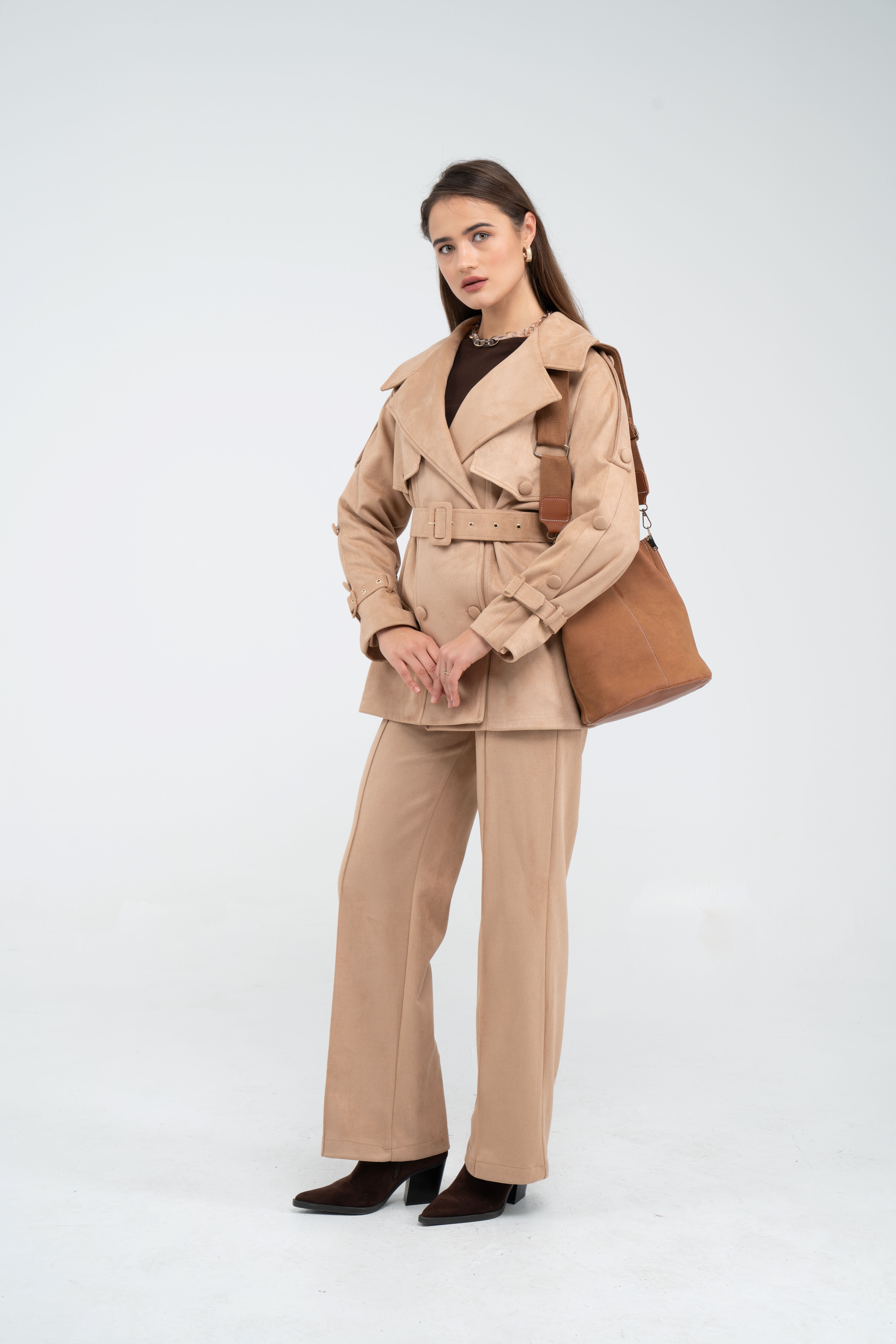 Gelince Haber VerŞık ve güçlü bir duruş sunan bu süet dokulu takım, modern şehir stilini yansıtan detaylara sahip. Üst parça çift düğme tasarımı, geniş yaka kesimi ve ayarlanabilir kuşak detayıyla feminen ve sofistike bir görünüm oluşturur.