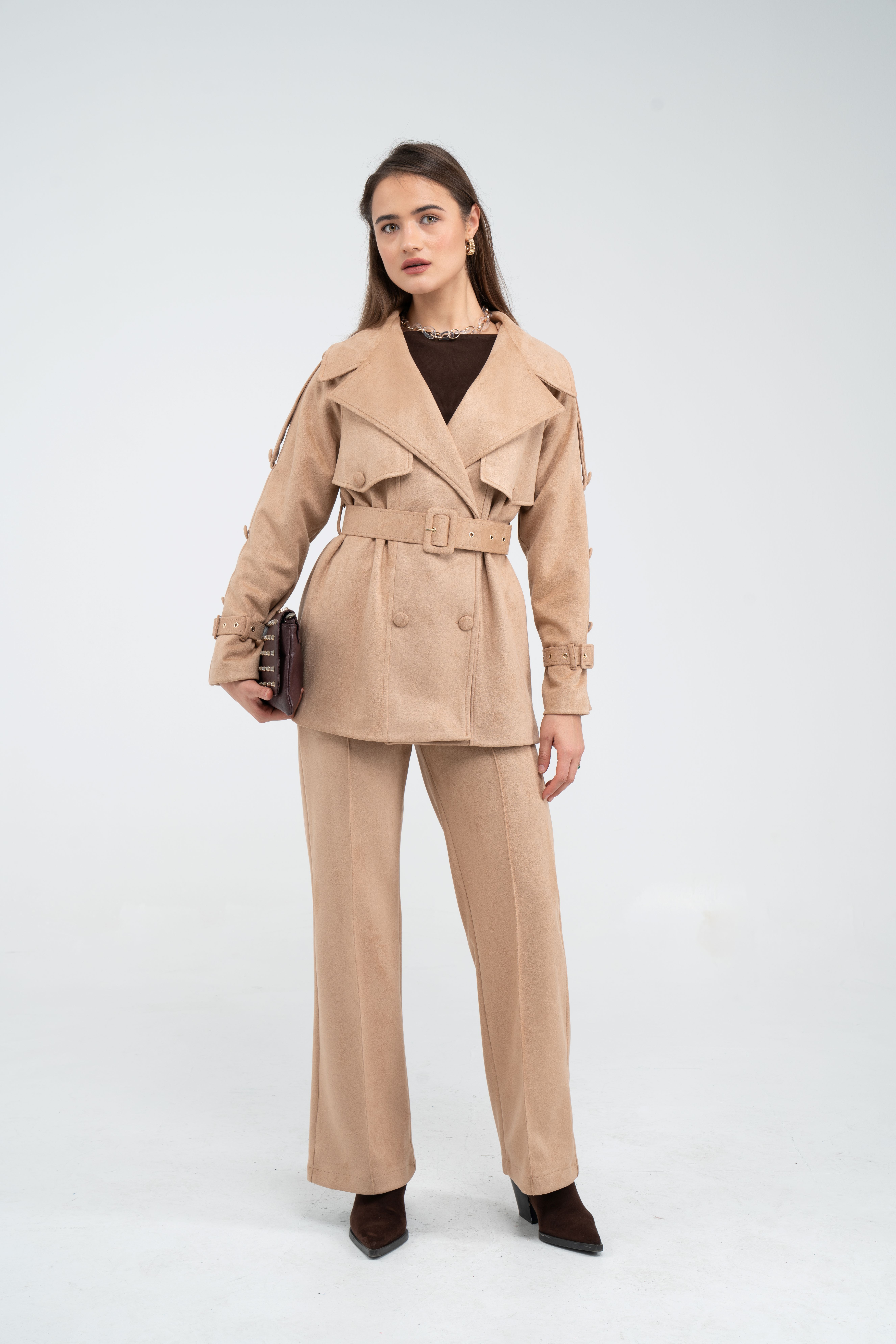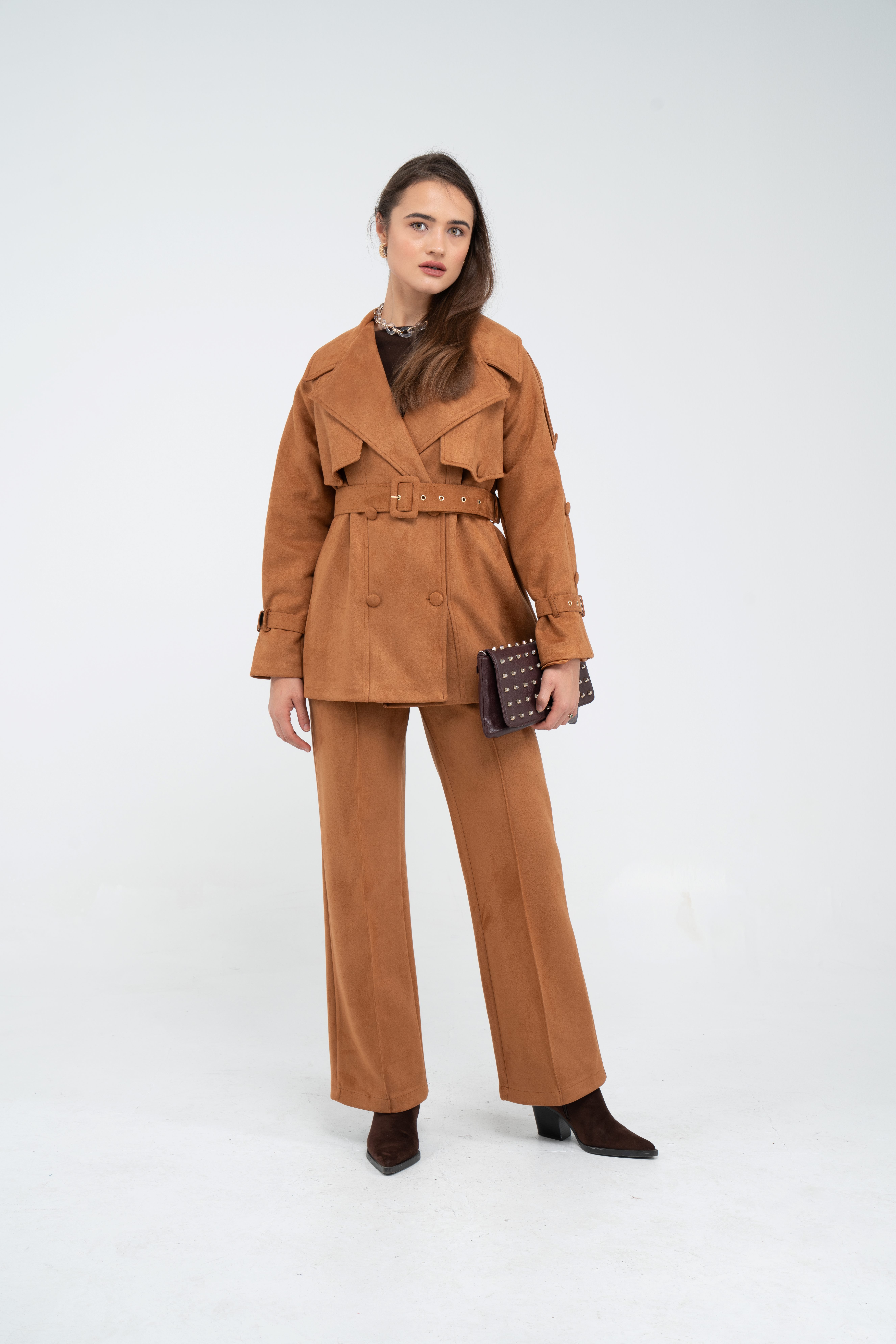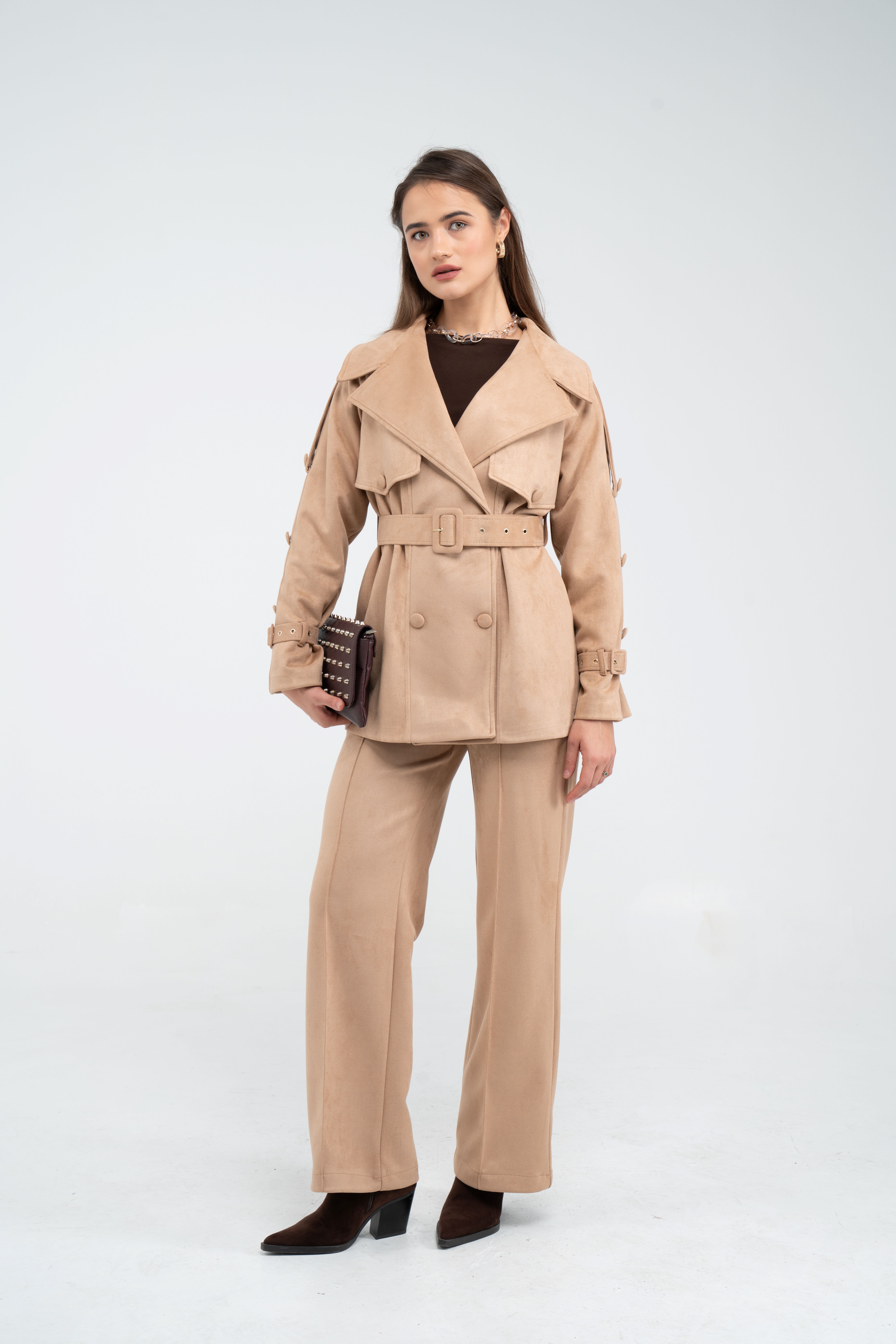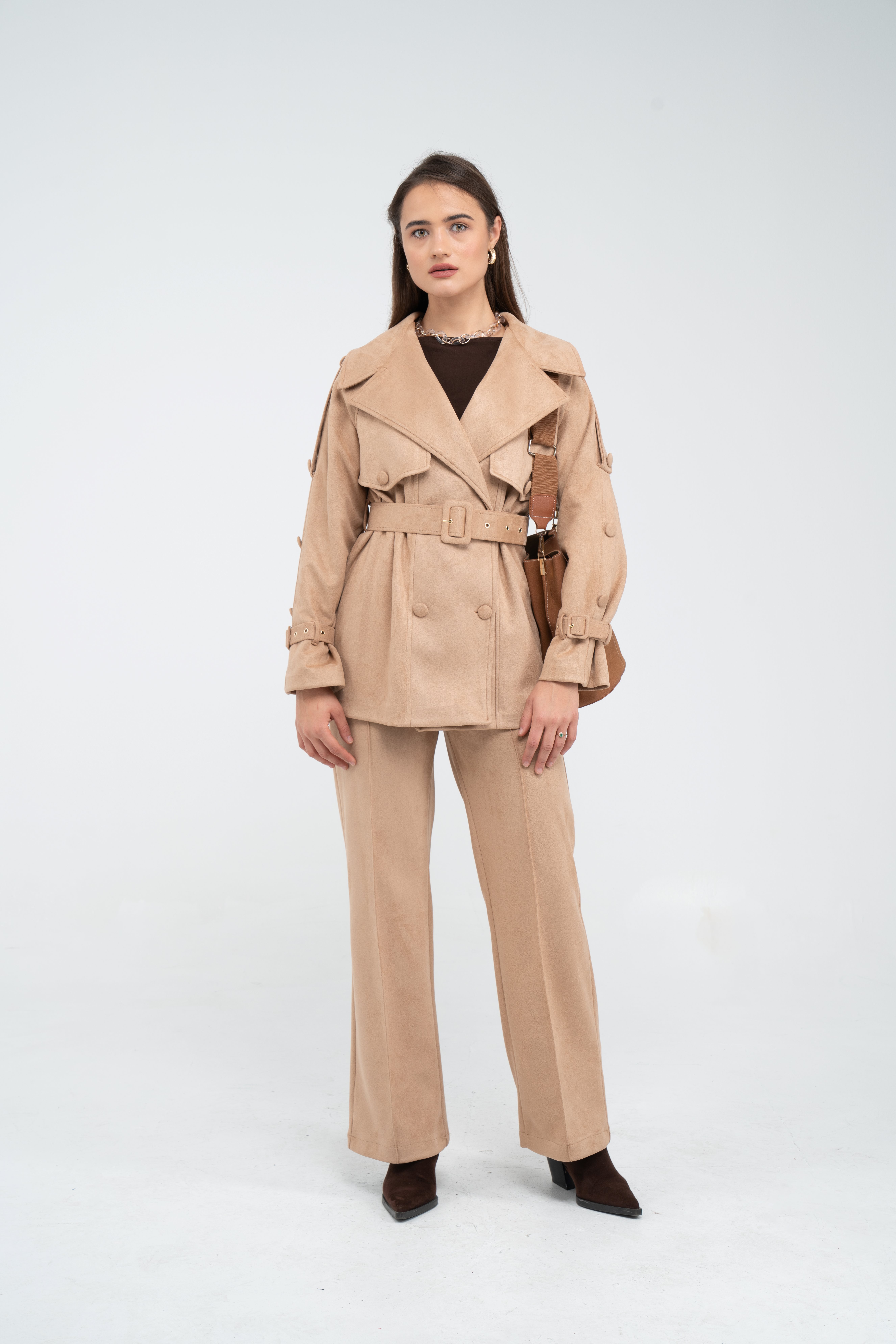 Gelince Haber VerŞık ve güçlü bir duruş sunan bu süet dokulu takım, modern şehir stilini yansıtan detaylara sahip. Üst parça çift düğme tasarımı, geniş yaka kesimi ve ayarlanabilir kuşak detayıyla feminen ve sofistike bir görünüm oluşturur.