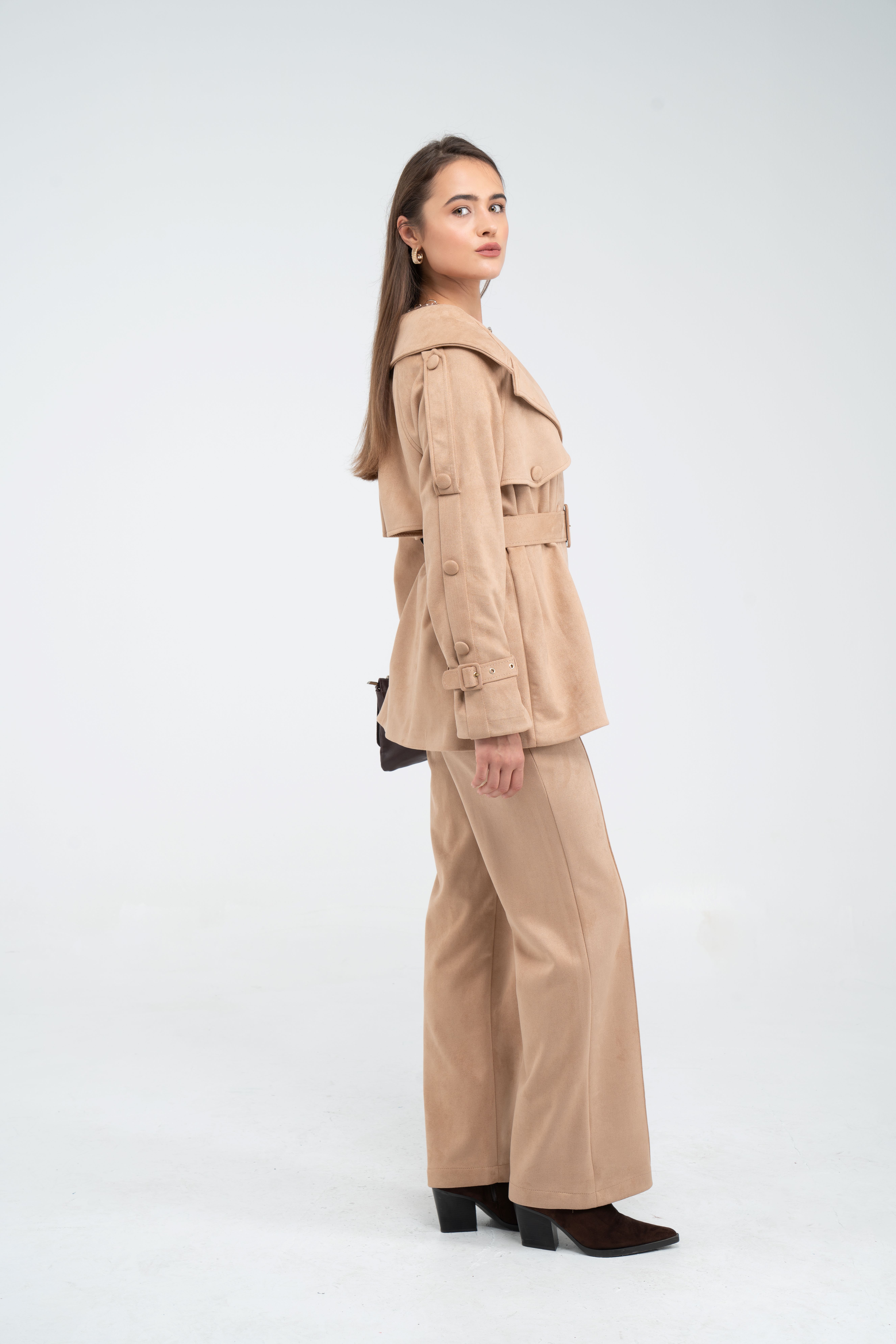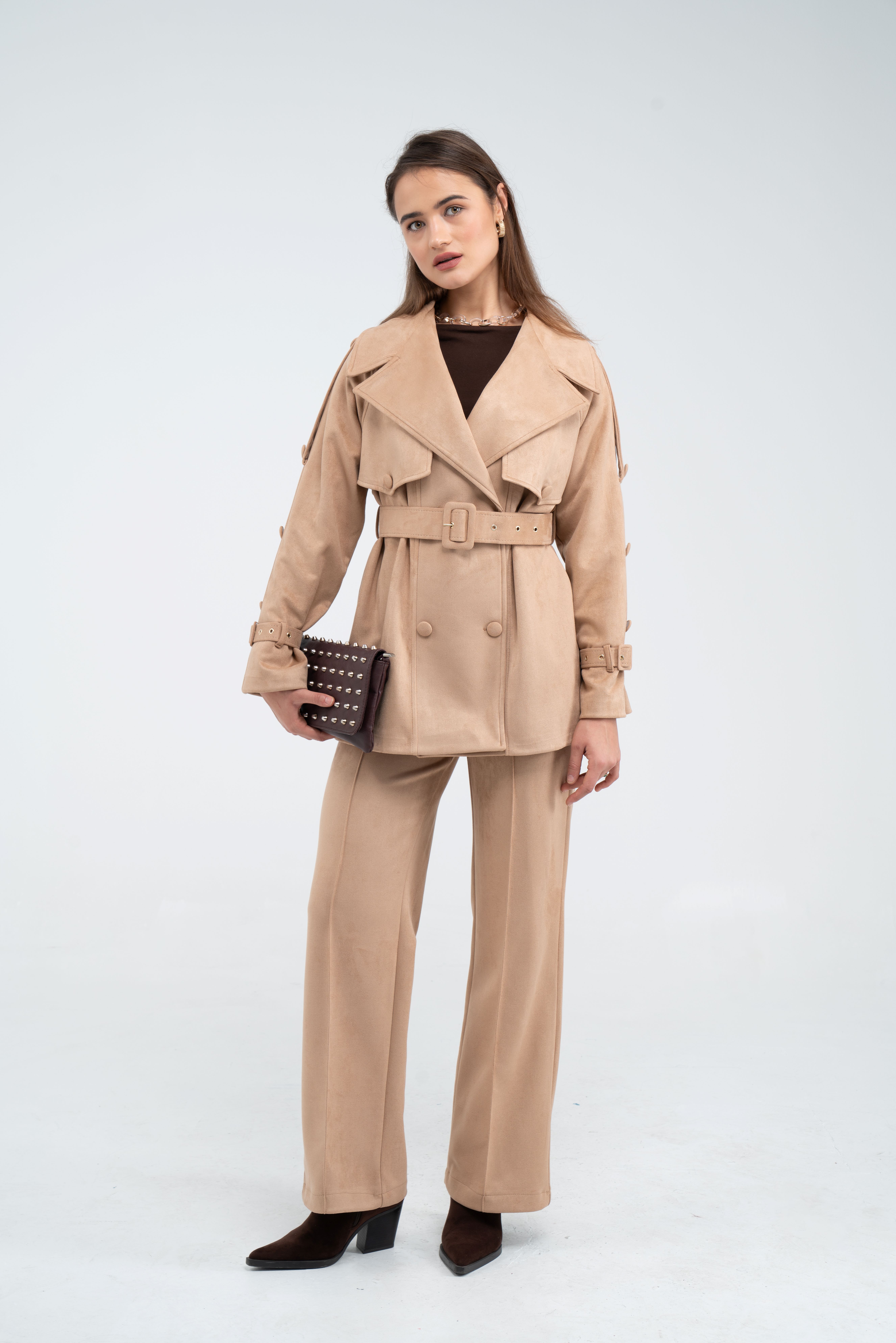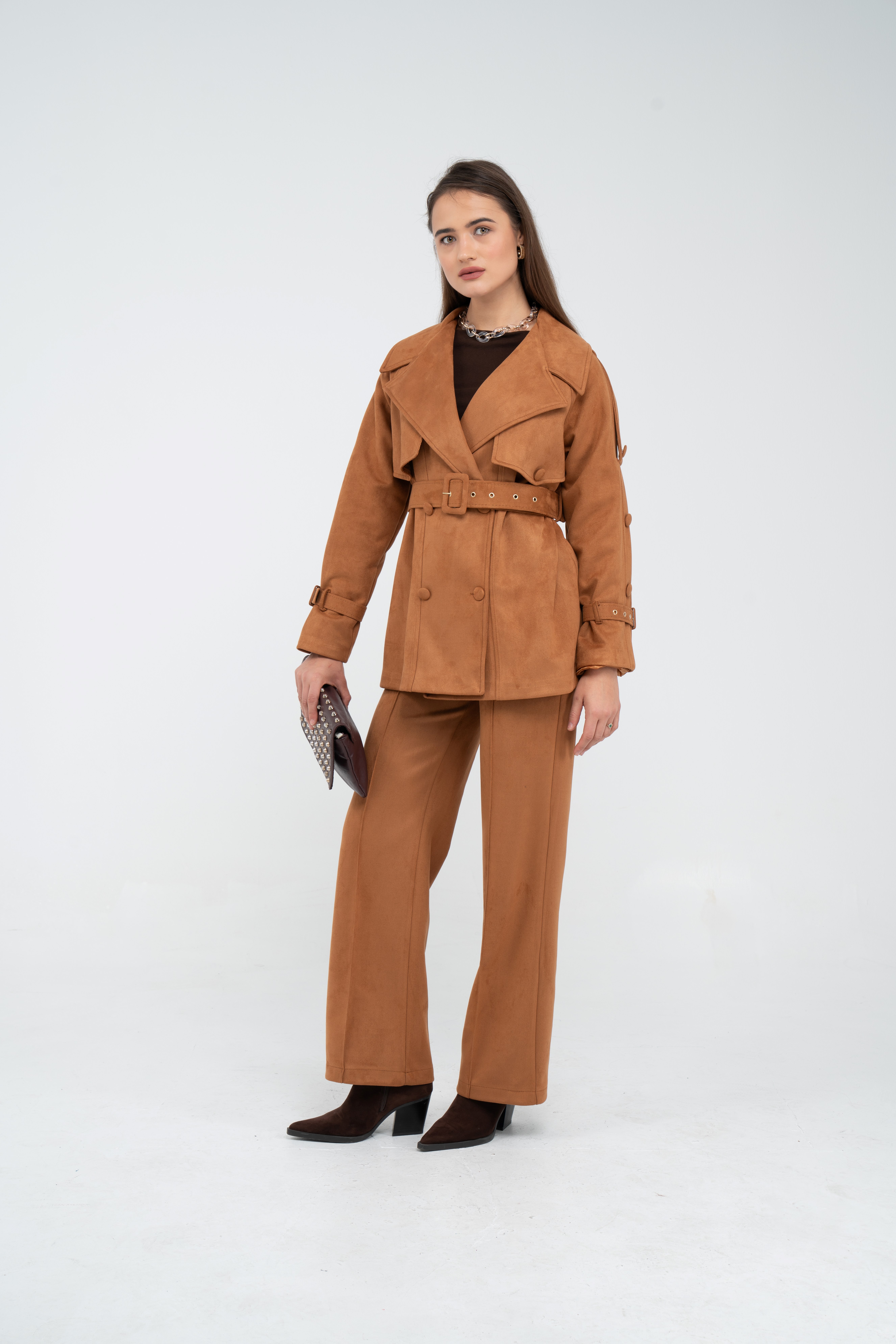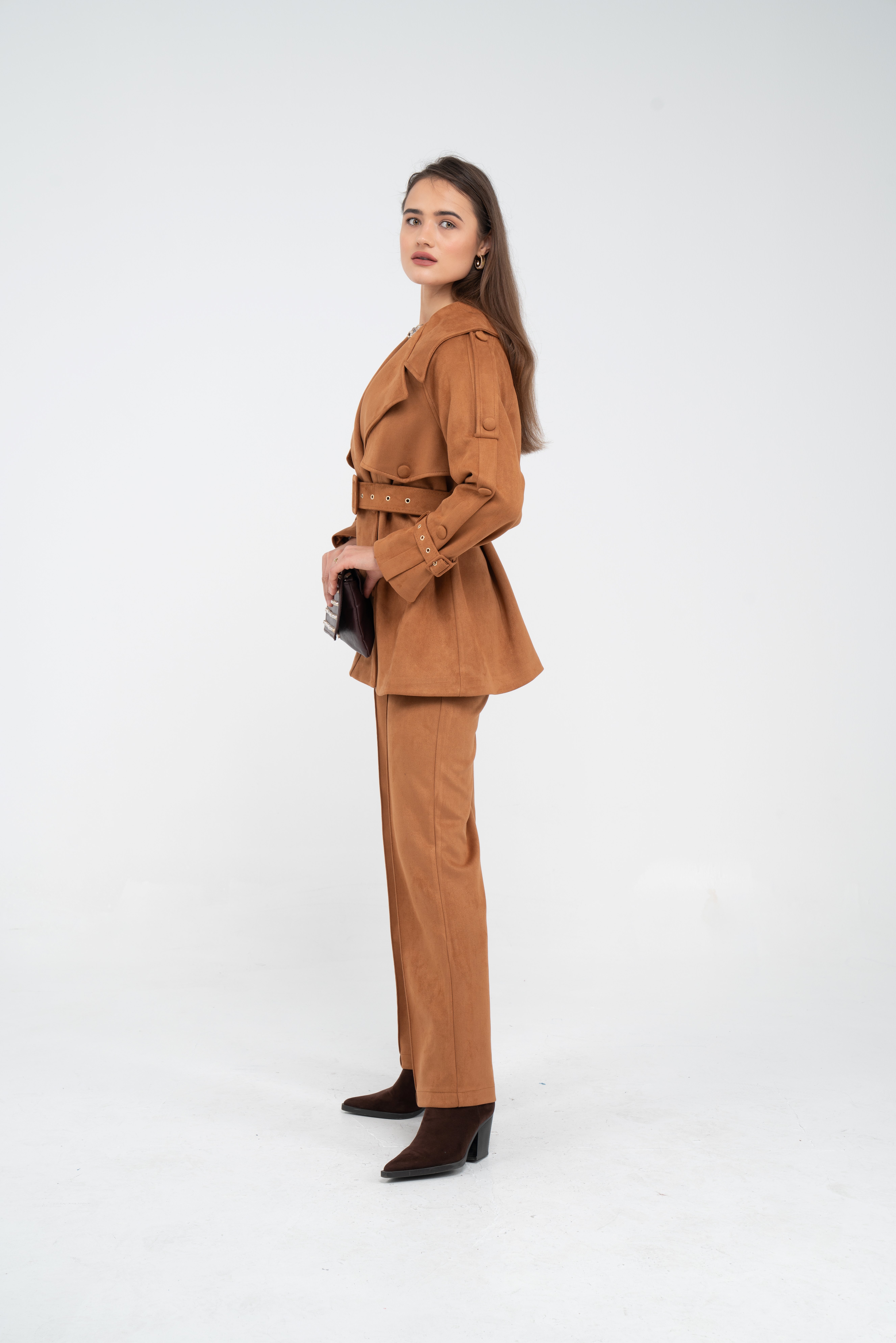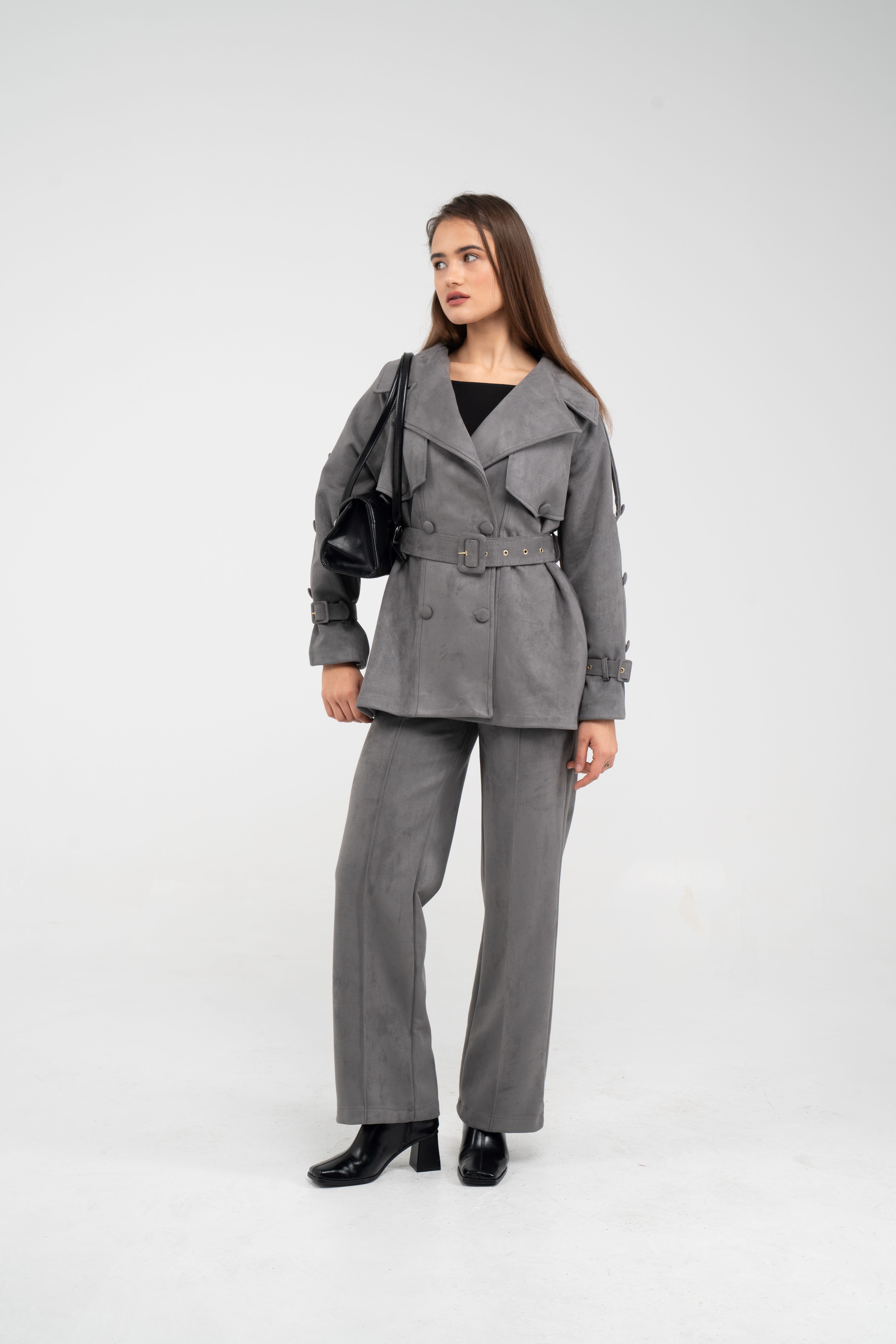 Gelince Haber VerŞık ve güçlü bir duruş sunan bu süet dokulu takım, modern şehir stilini yansıtan detaylara sahip. Üst parça çift düğme tasarımı, geniş yaka kesimi ve ayarlanabilir kuşak detayıyla feminen ve sofistike bir görünüm oluşturur.