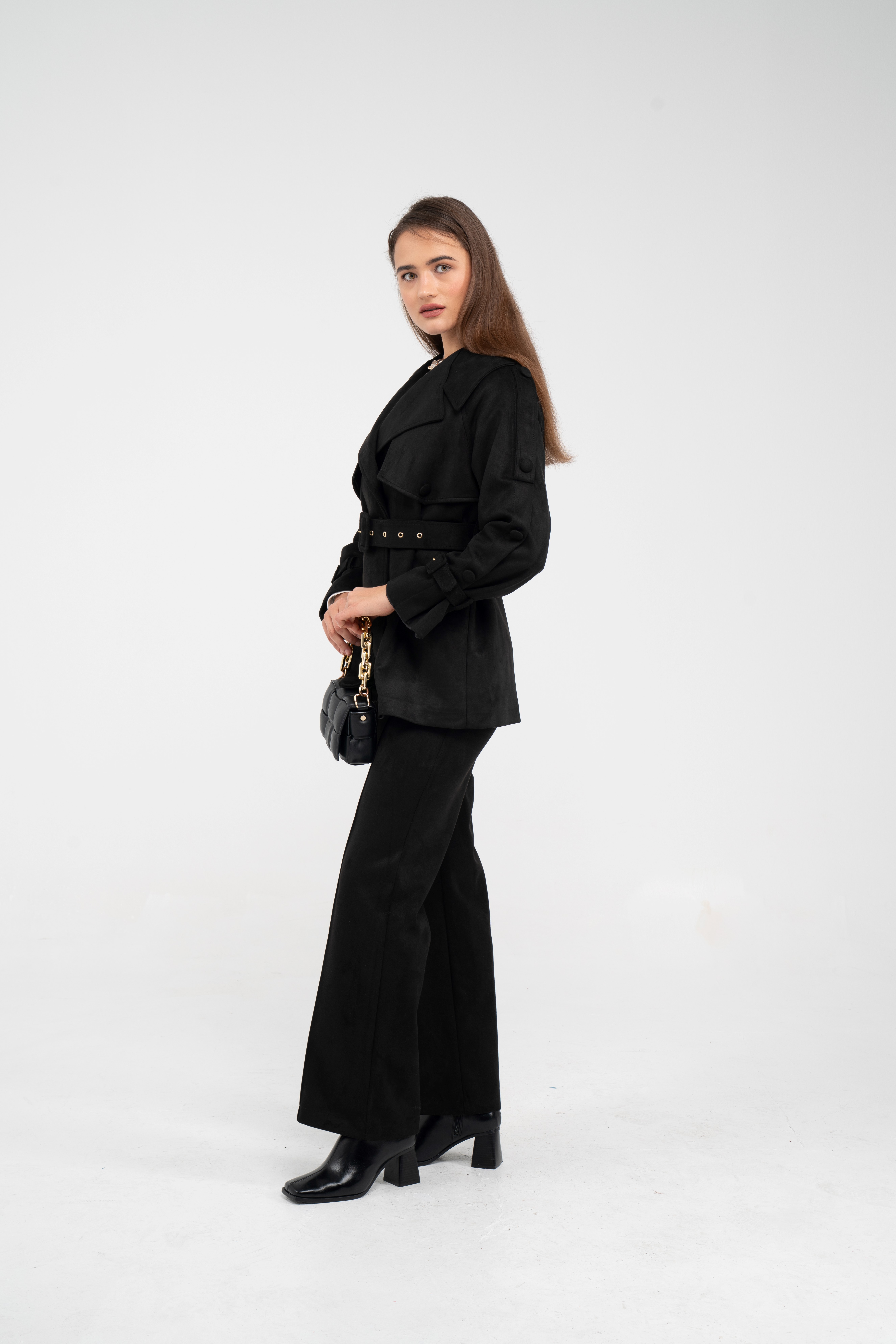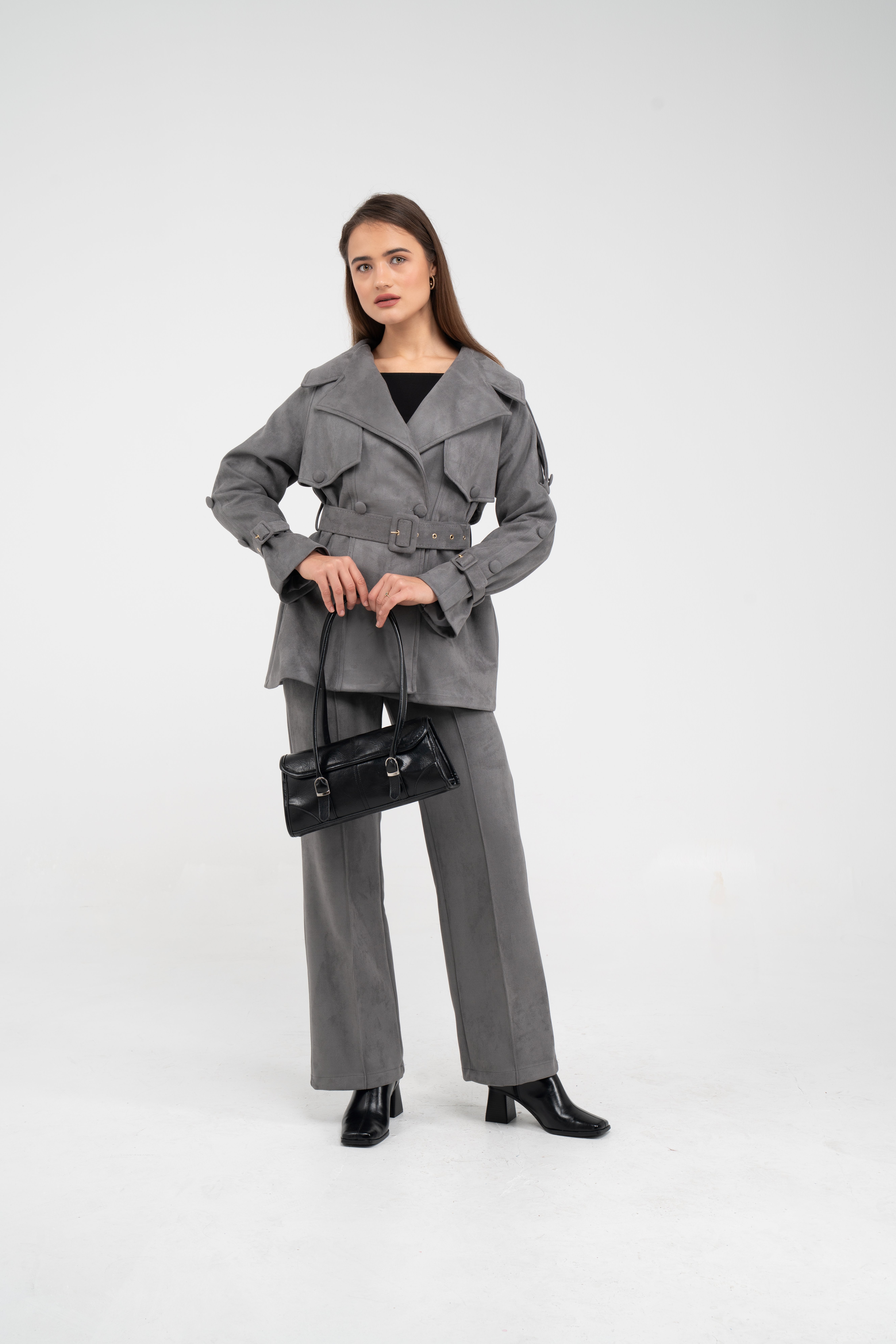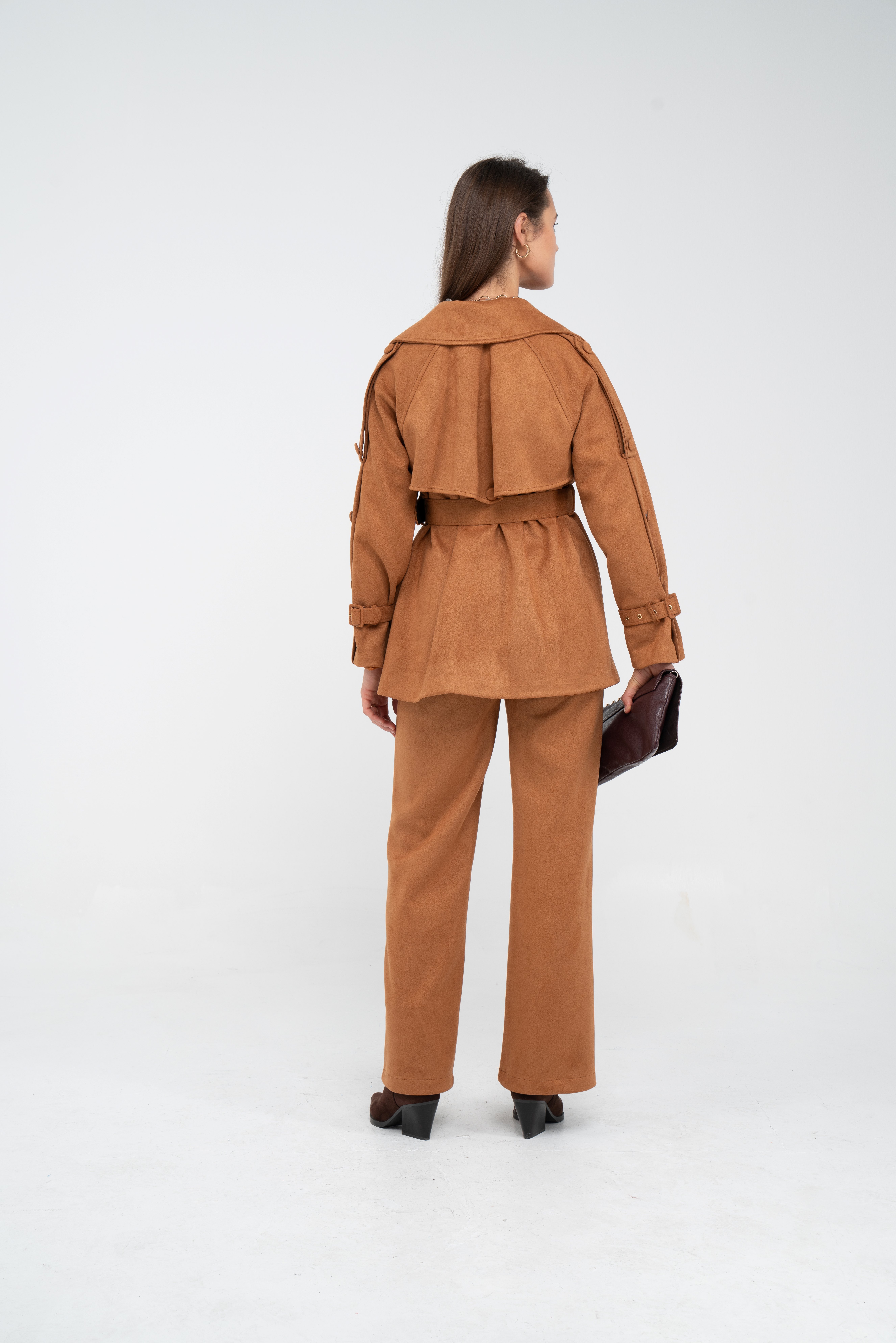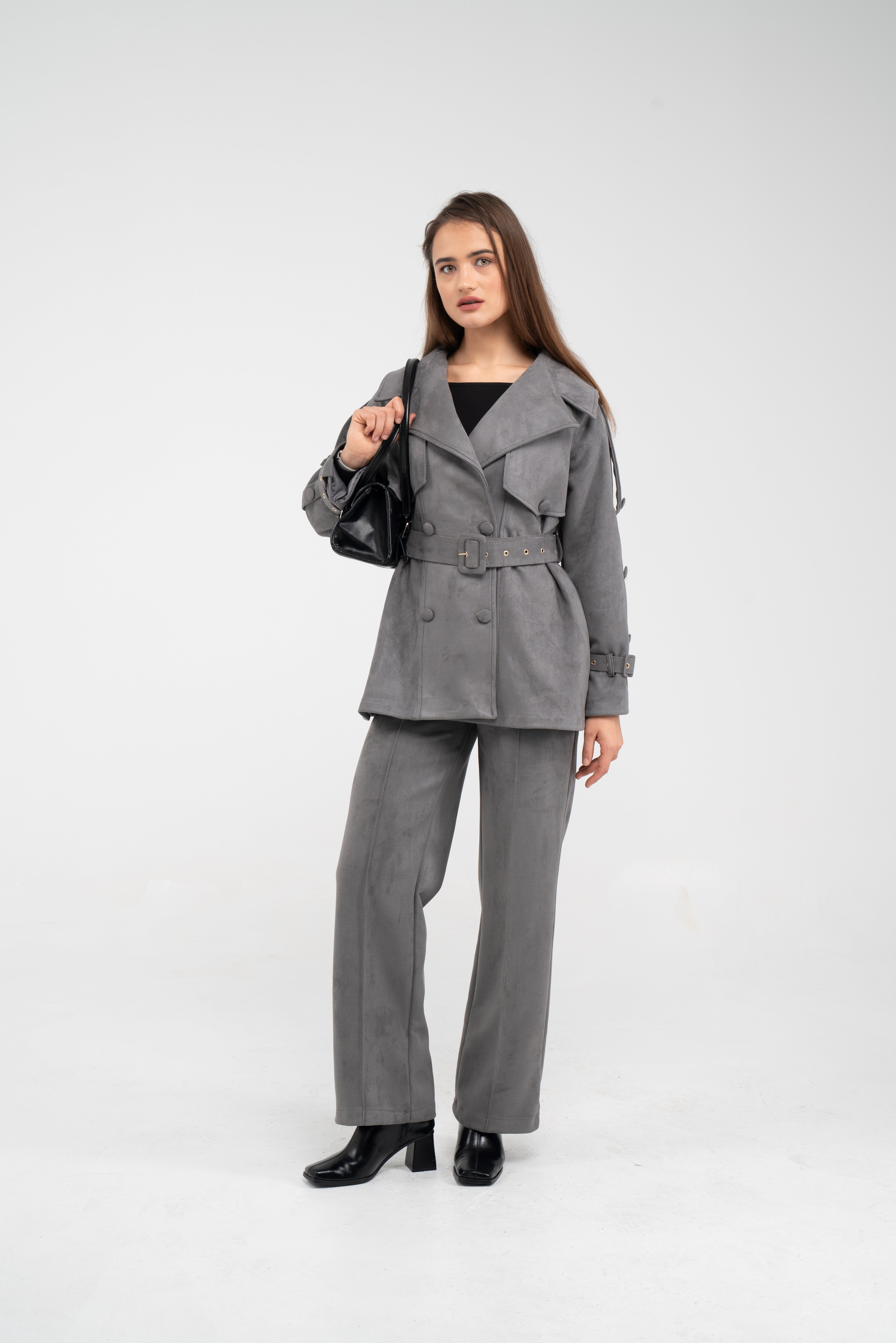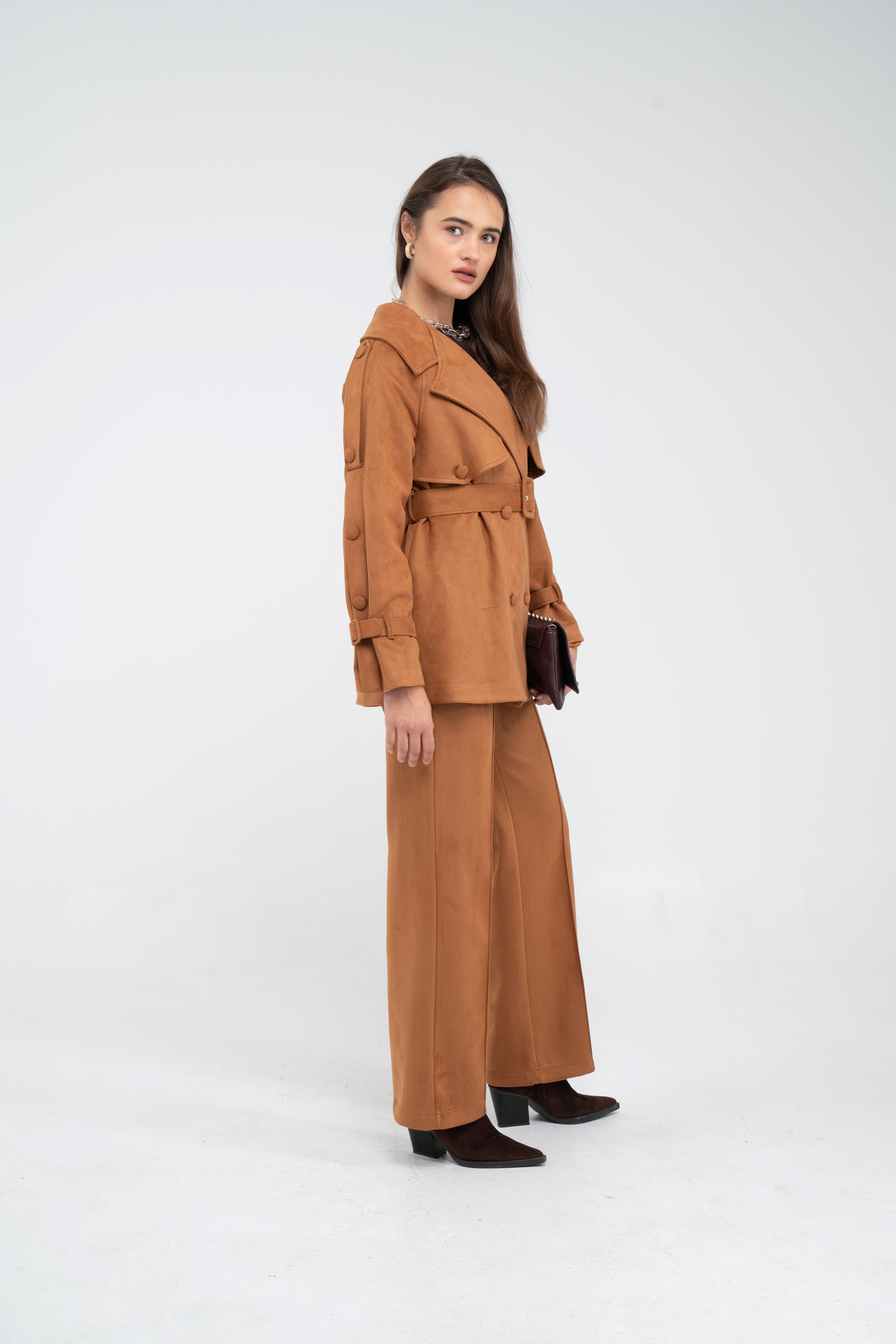 Gelince Haber VerŞık ve güçlü bir duruş sunan bu süet dokulu takım, modern şehir stilini yansıtan detaylara sahip. Üst parça çift düğme tasarımı, geniş yaka kesimi ve ayarlanabilir kuşak detayıyla feminen ve sofistike bir görünüm oluşturur.
