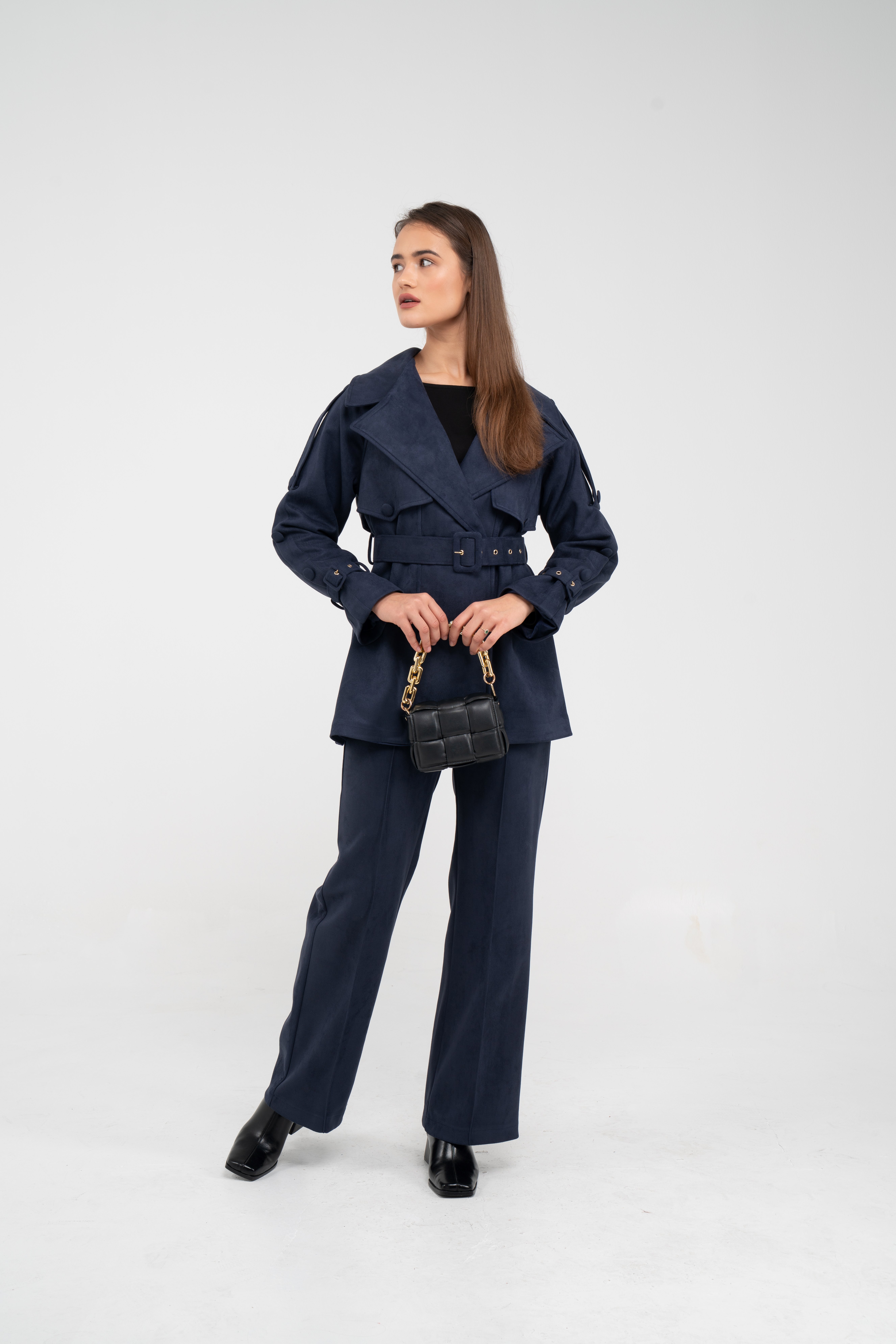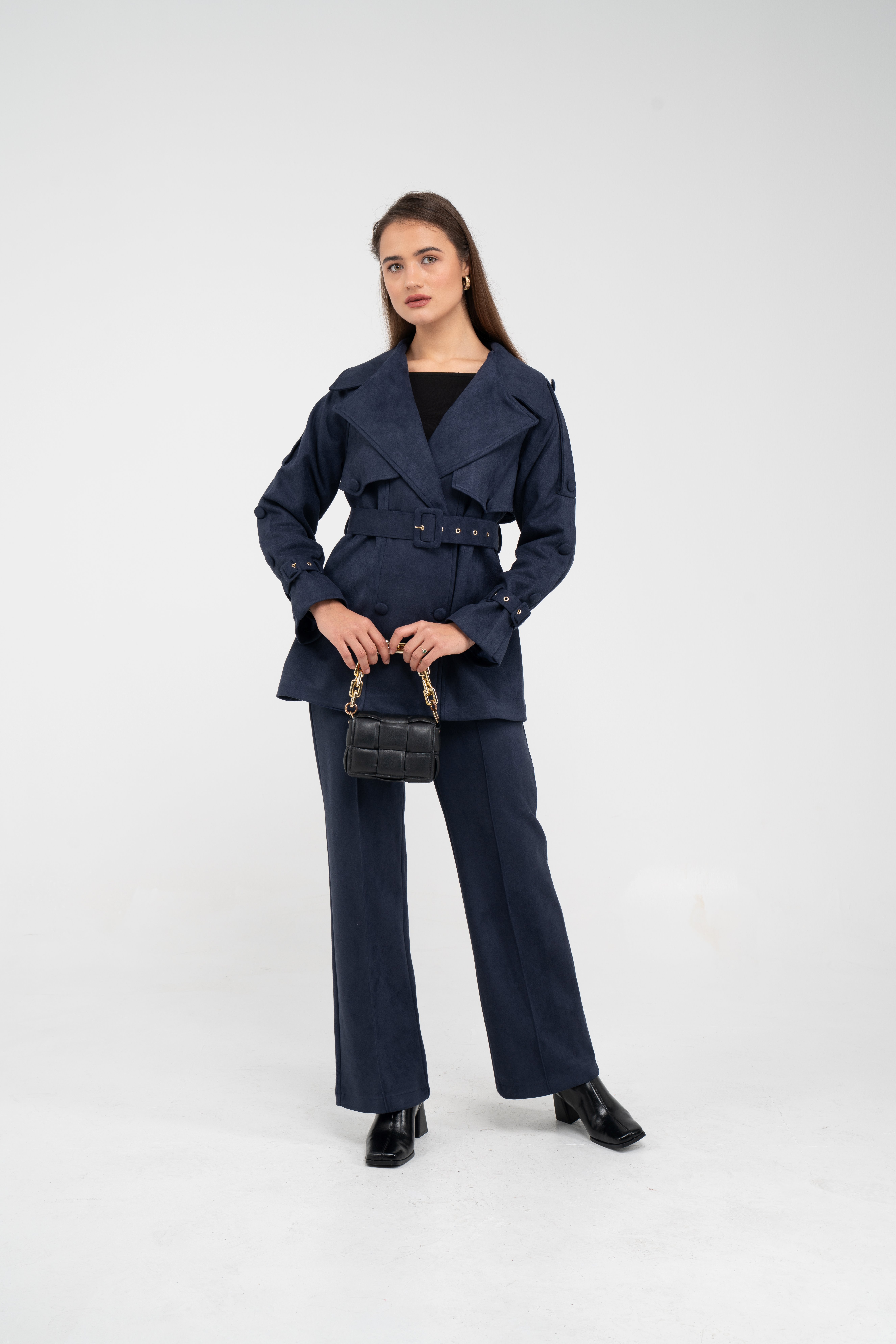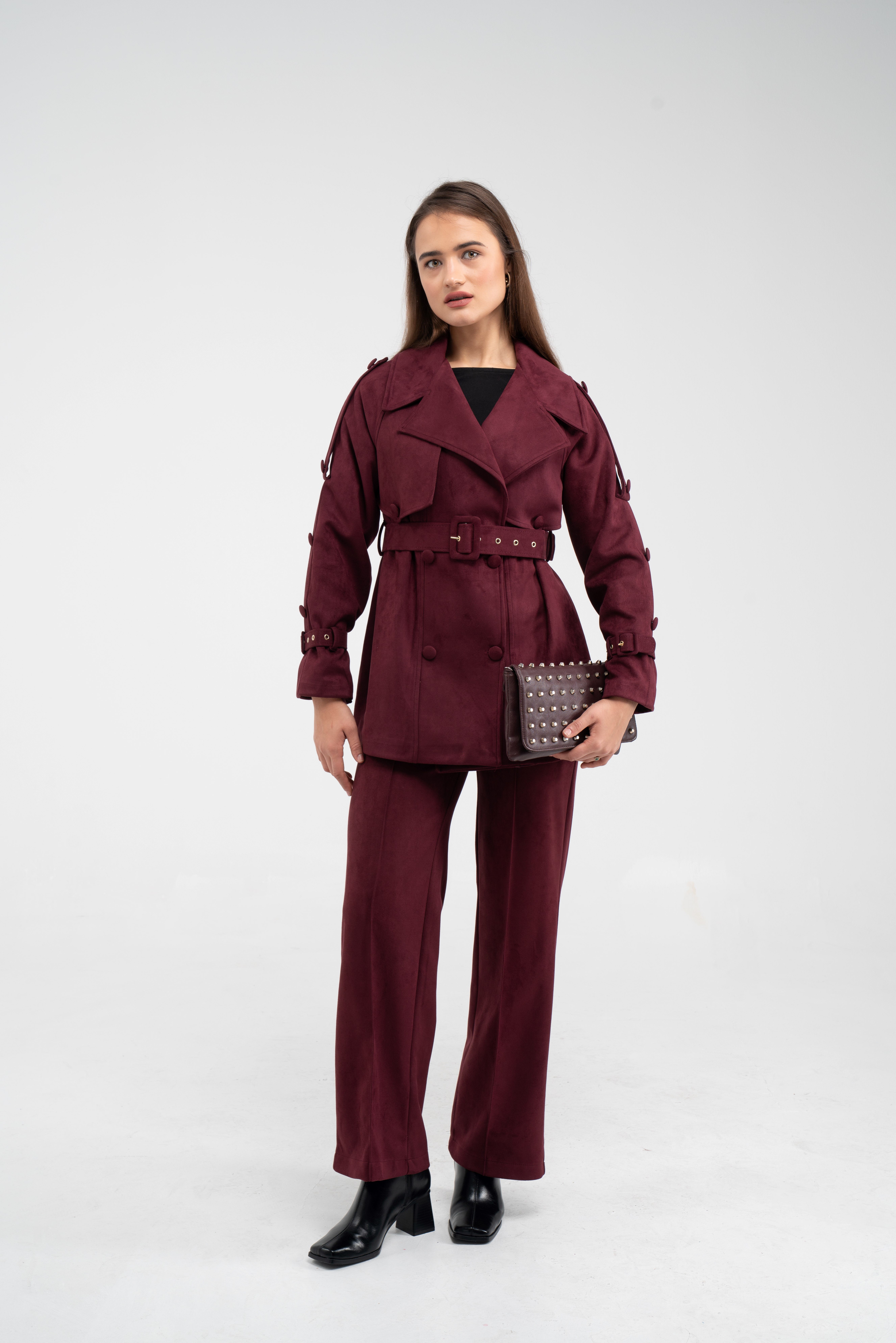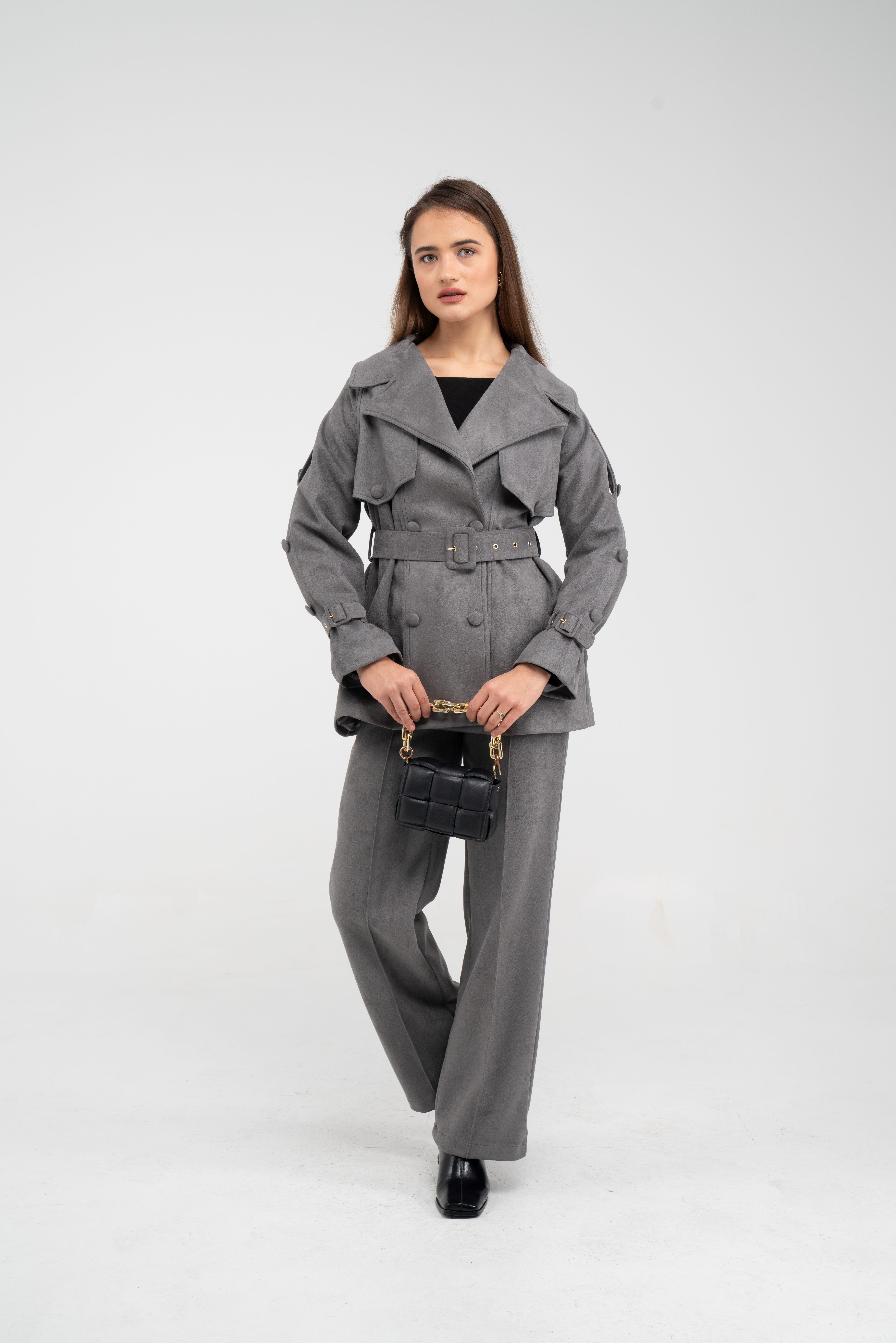 Gelince Haber VerŞık ve güçlü bir duruş sunan bu süet dokulu takım, modern şehir stilini yansıtan detaylara sahip. Üst parça çift düğme tasarımı, geniş yaka kesimi ve ayarlanabilir kuşak detayıyla feminen ve sofistike bir görünüm oluşturur.