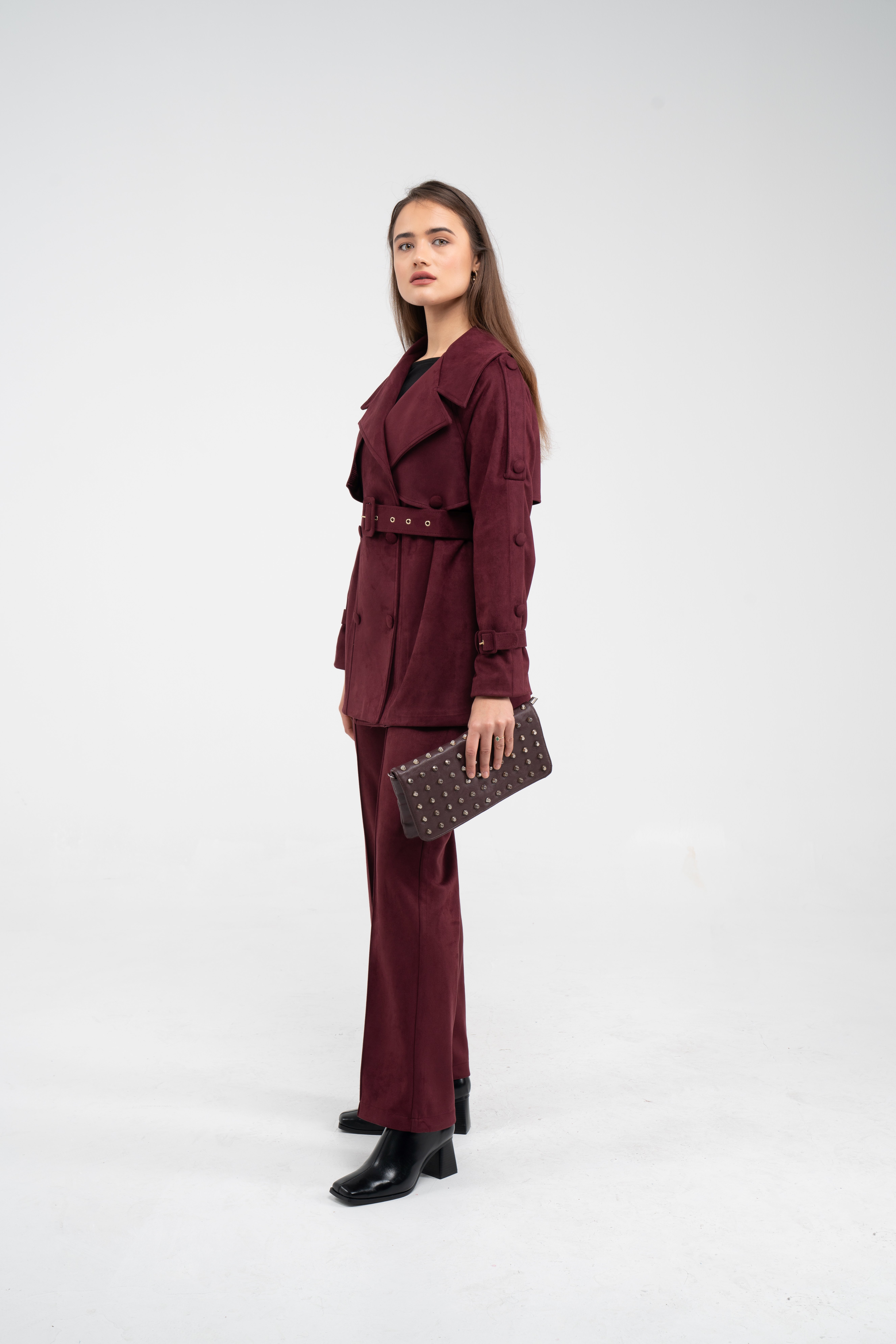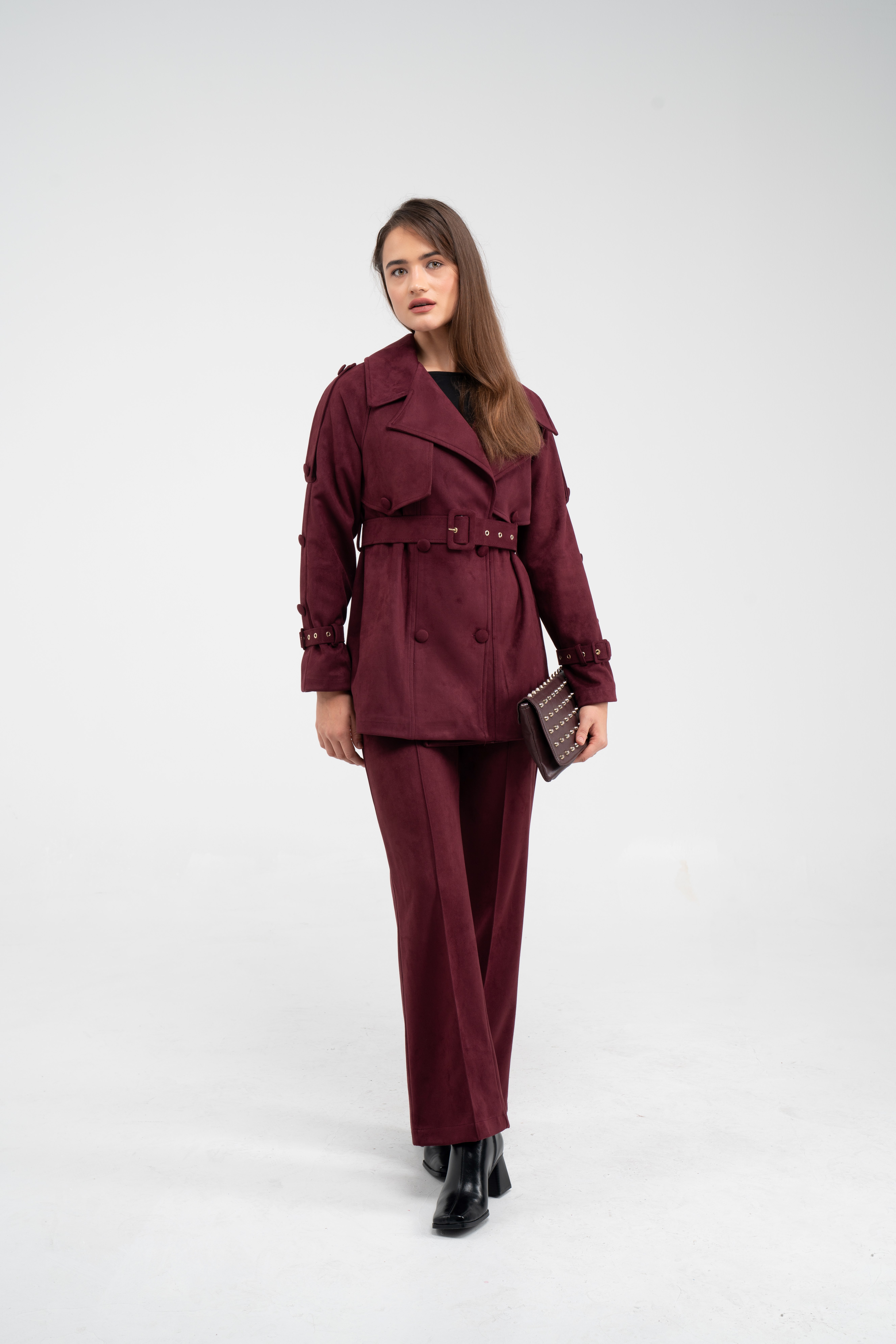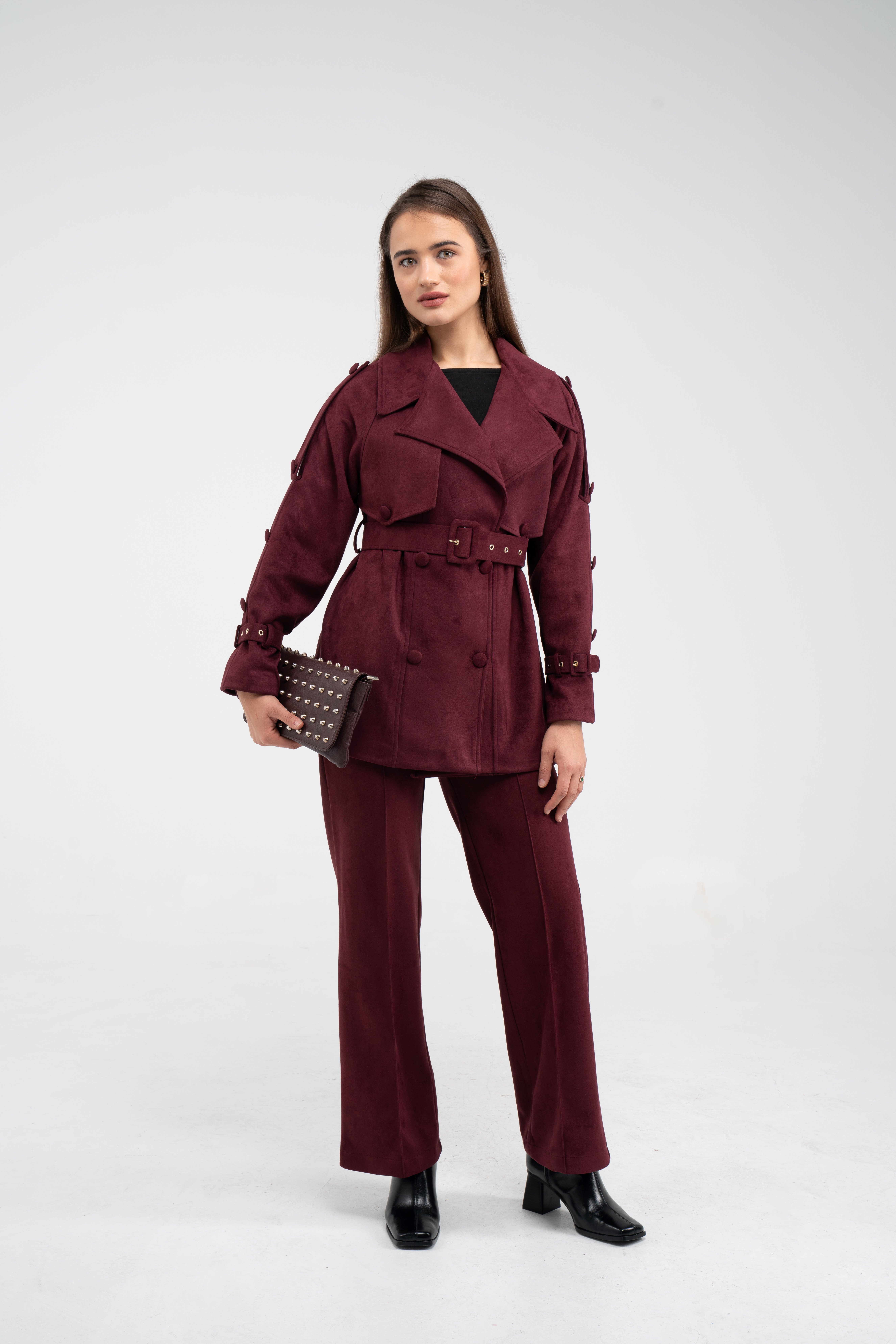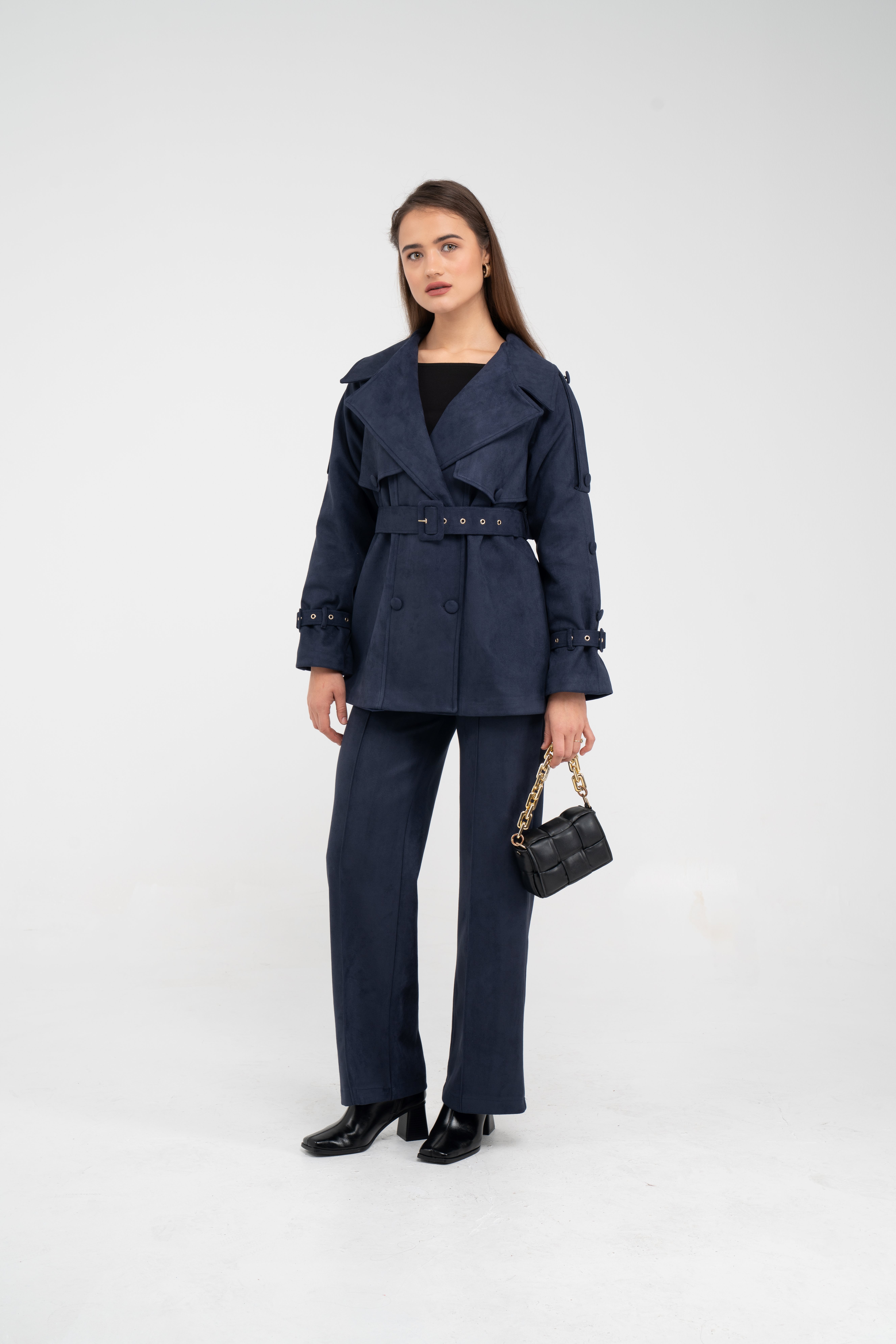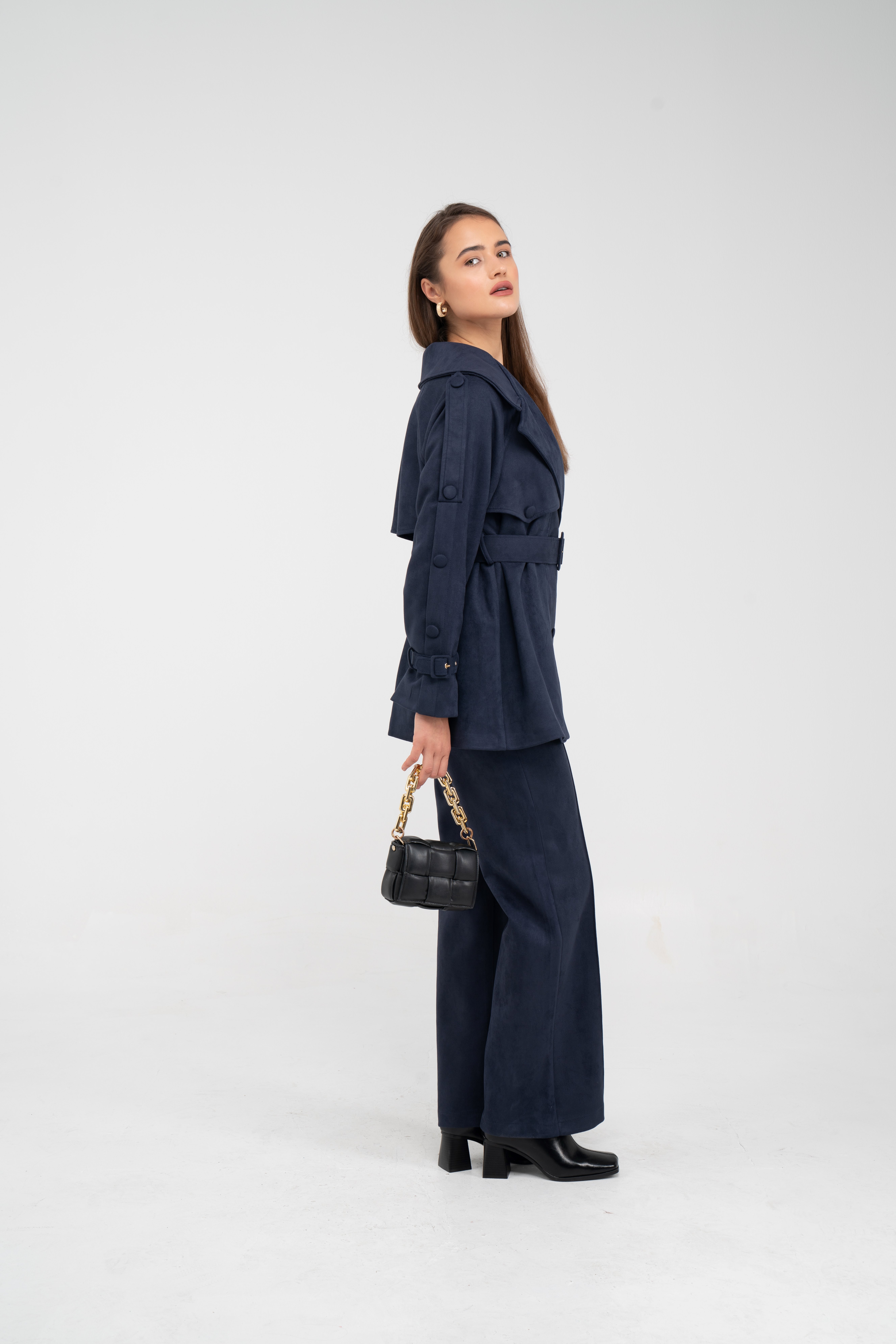 Gelince Haber VerŞık ve güçlü bir duruş sunan bu süet dokulu takım, modern şehir stilini yansıtan detaylara sahip. Üst parça çift düğme tasarımı, geniş yaka kesimi ve ayarlanabilir kuşak detayıyla feminen ve sofistike bir görünüm oluşturur.
