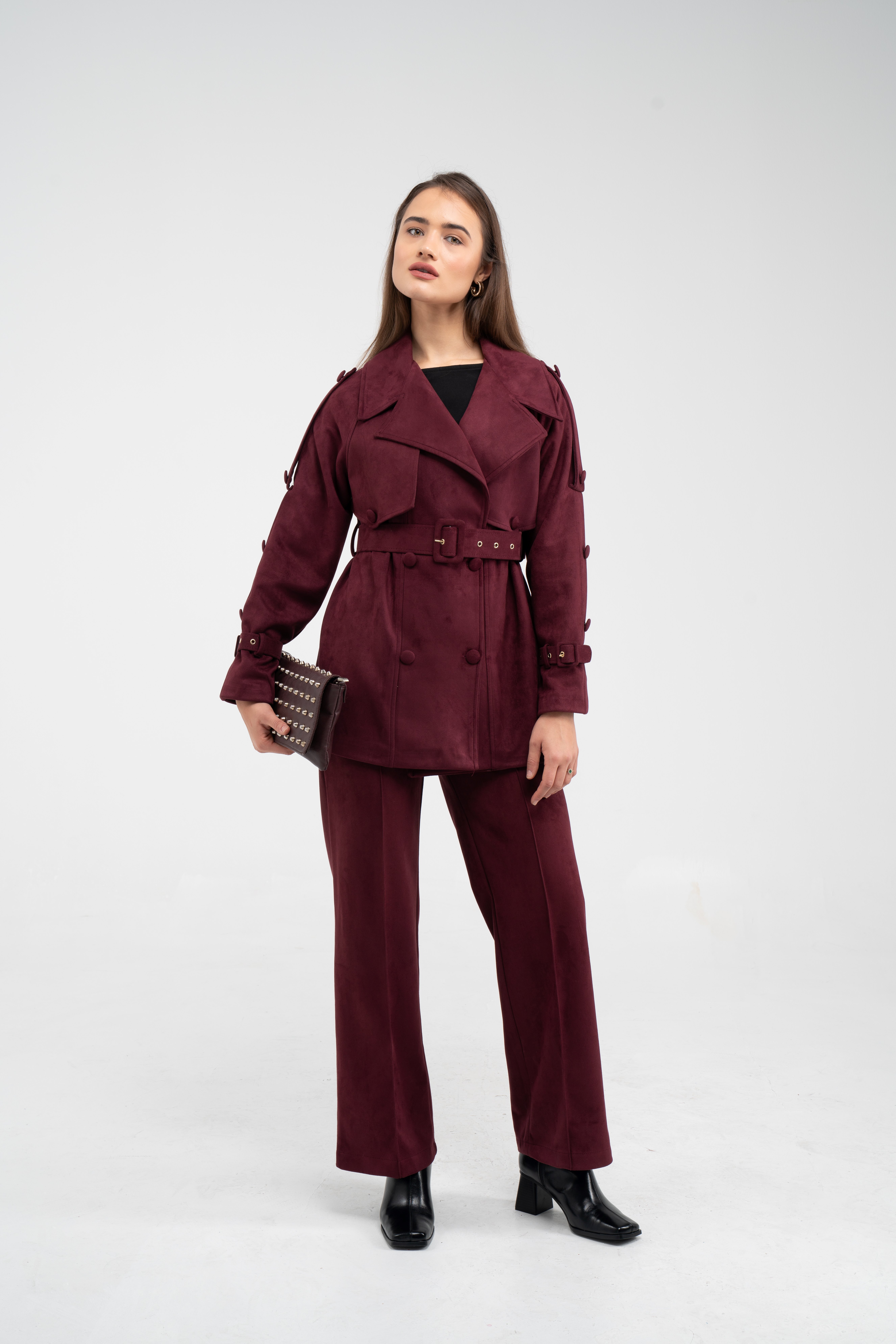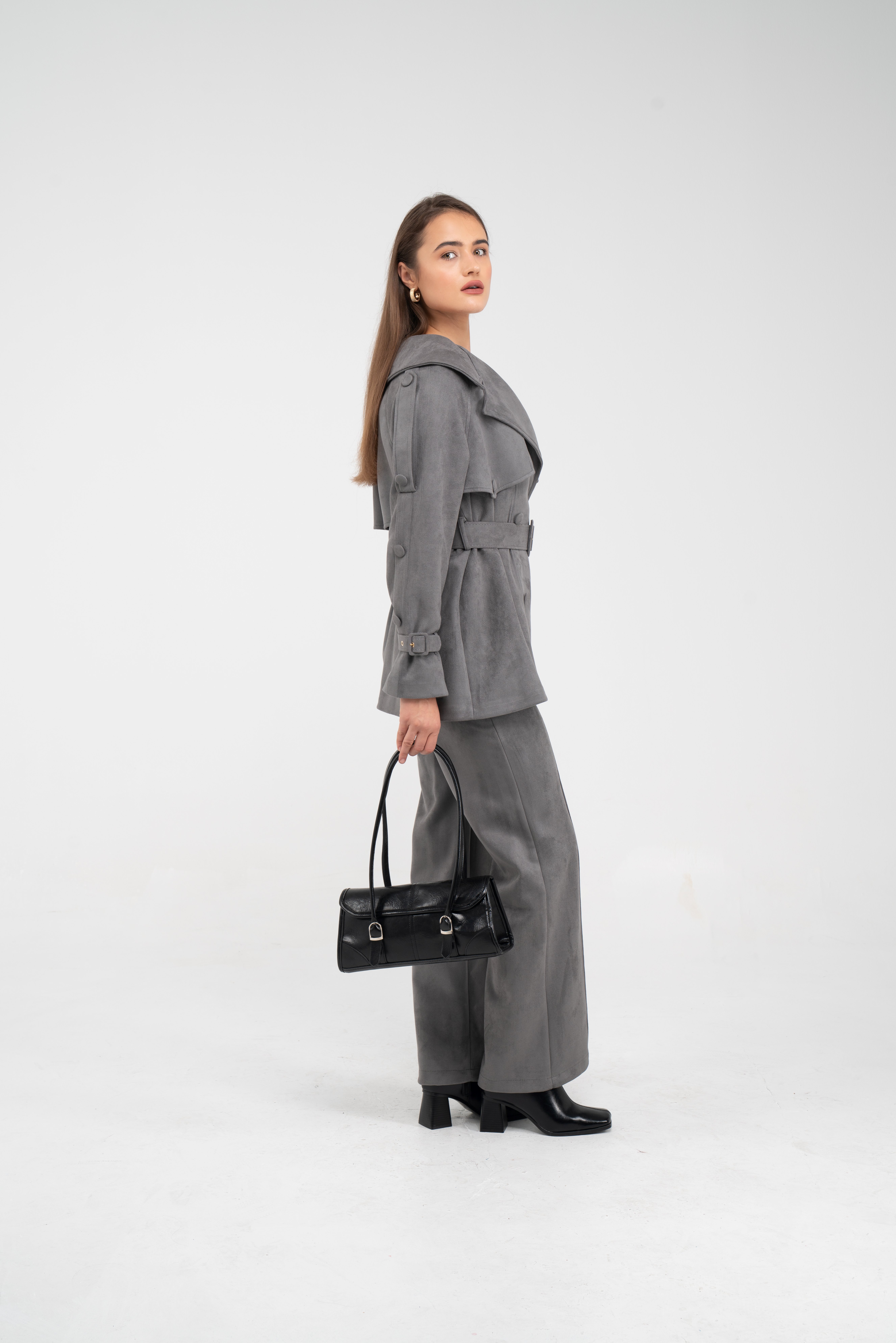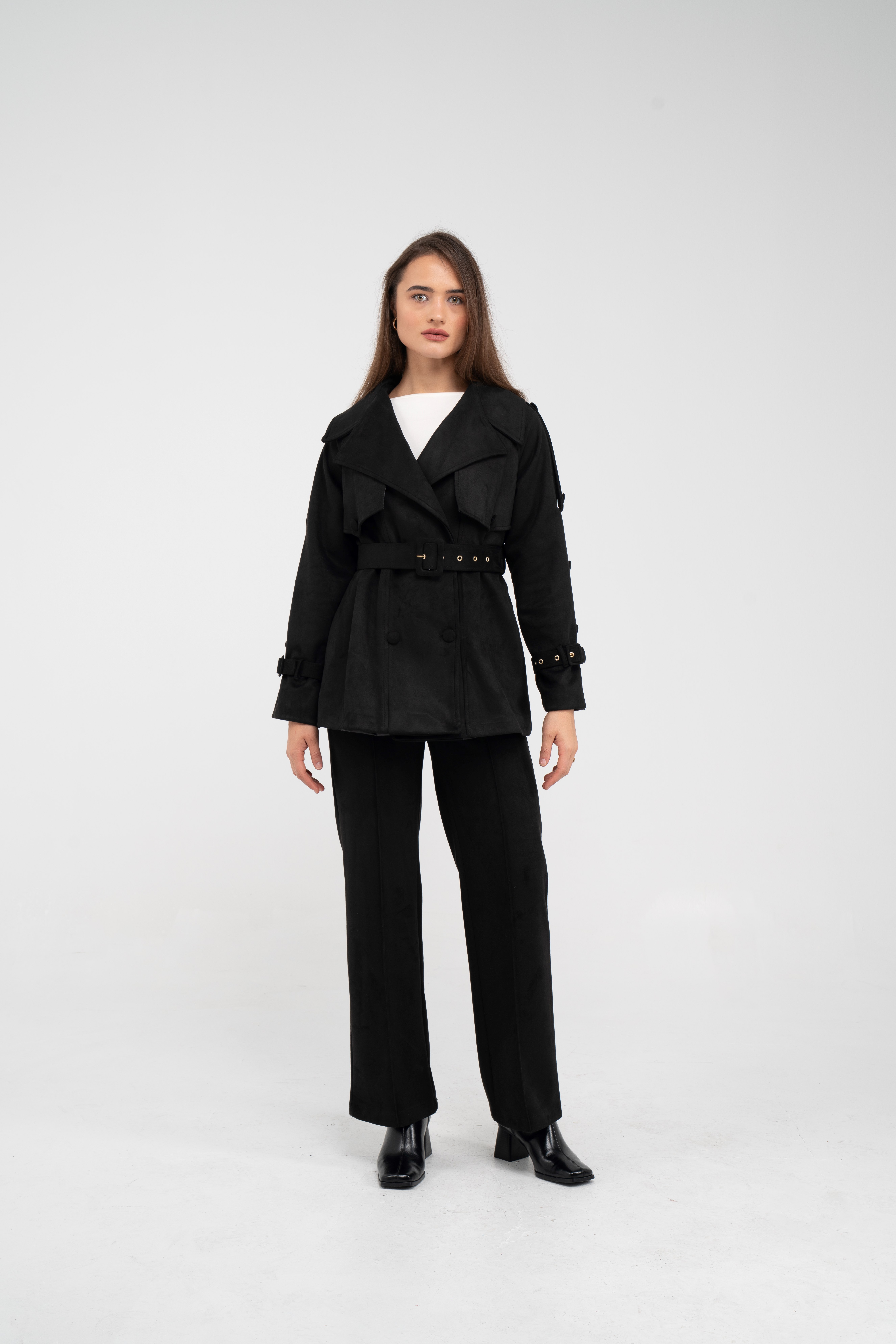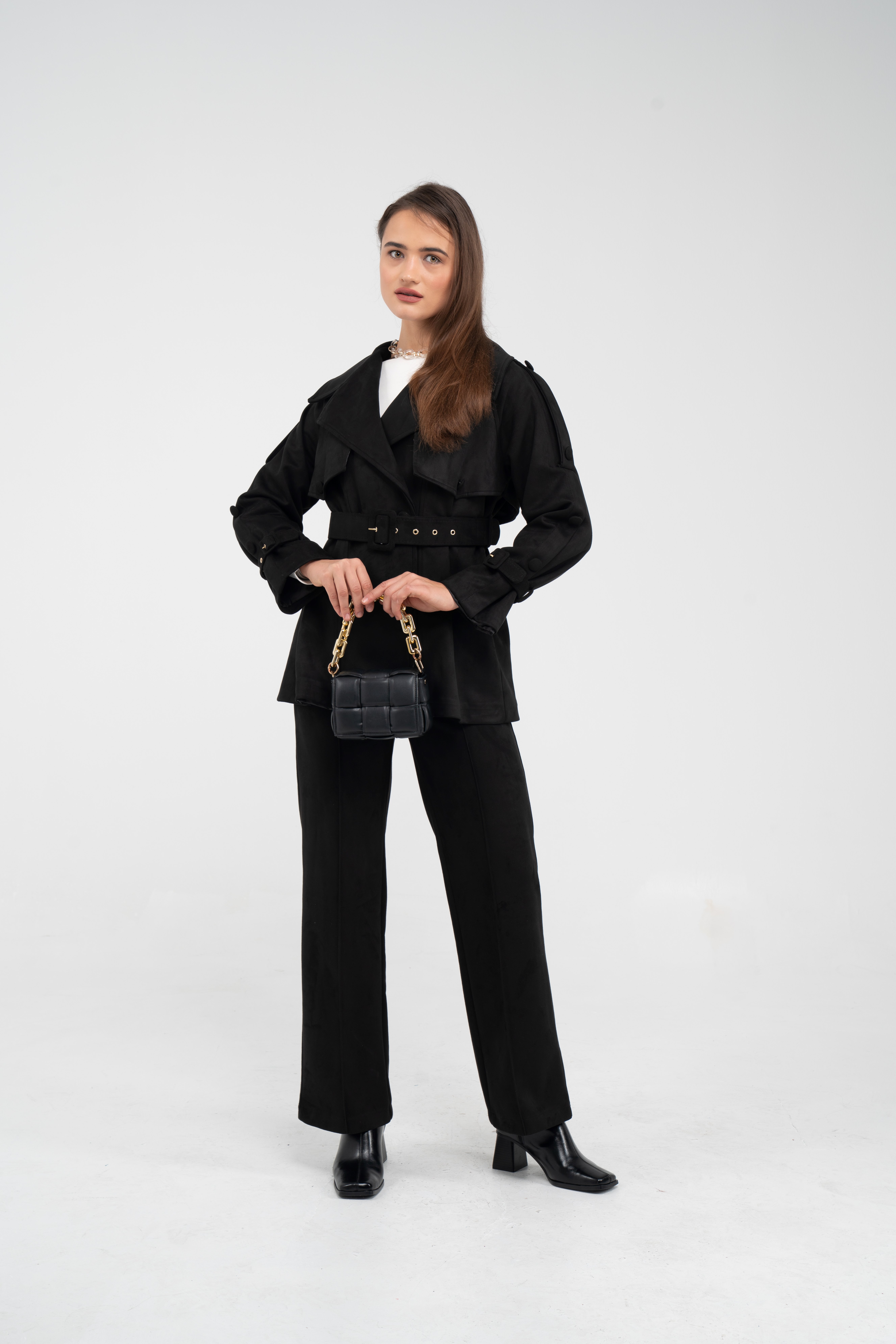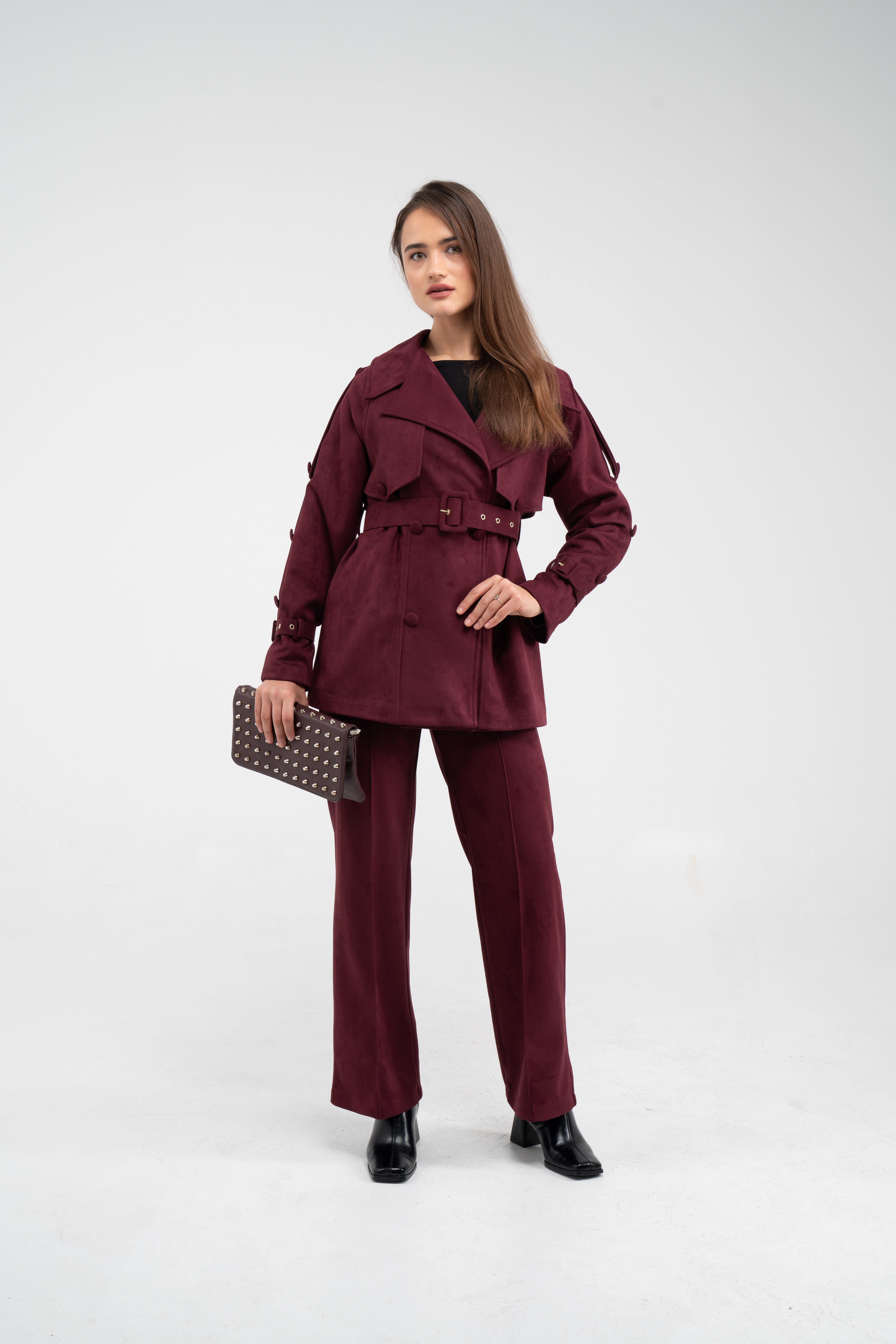 Gelince Haber VerŞık ve güçlü bir duruş sunan bu süet dokulu takım, modern şehir stilini yansıtan detaylara sahip. Üst parça çift düğme tasarımı, geniş yaka kesimi ve ayarlanabilir kuşak detayıyla feminen ve sofistike bir görünüm oluşturur.