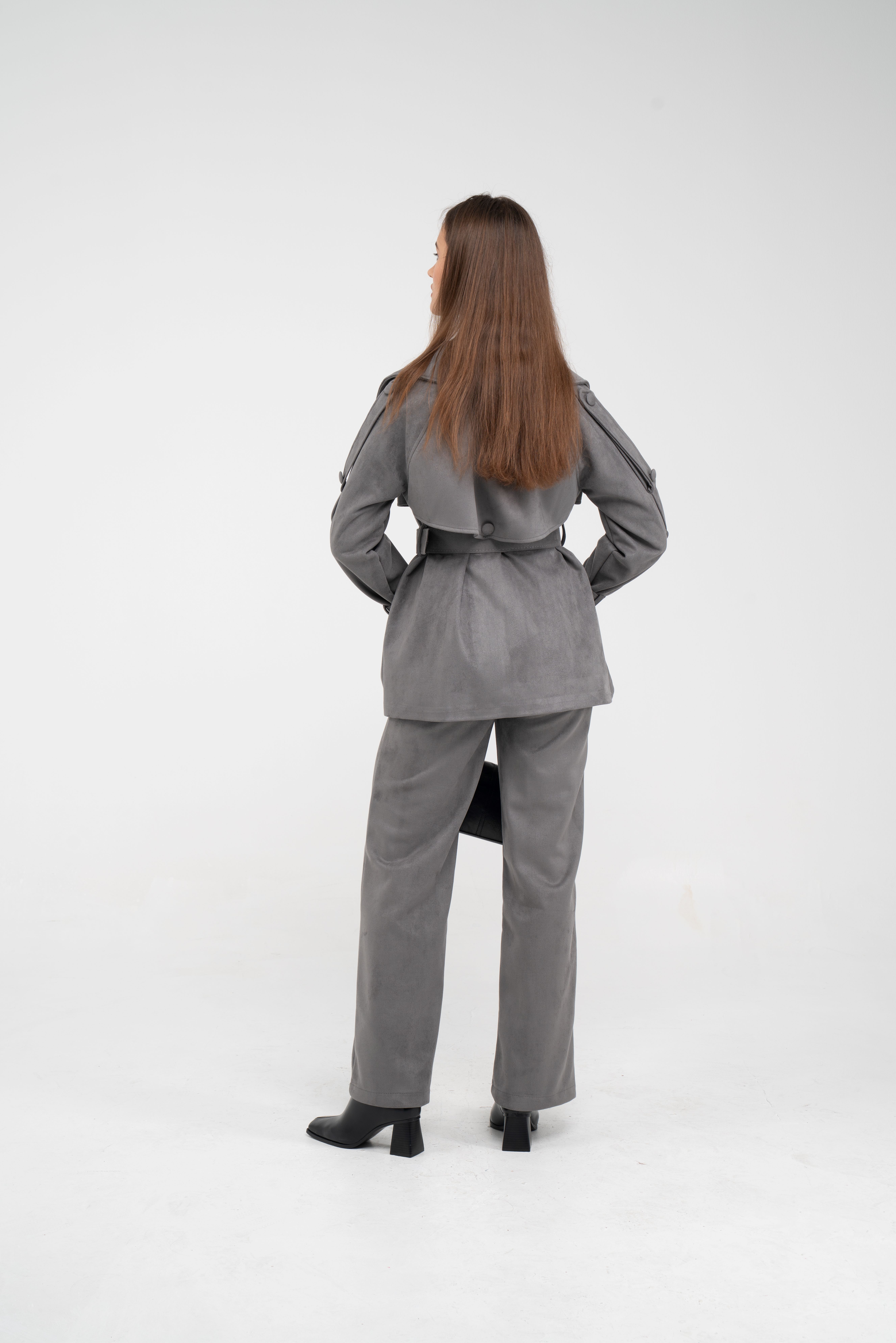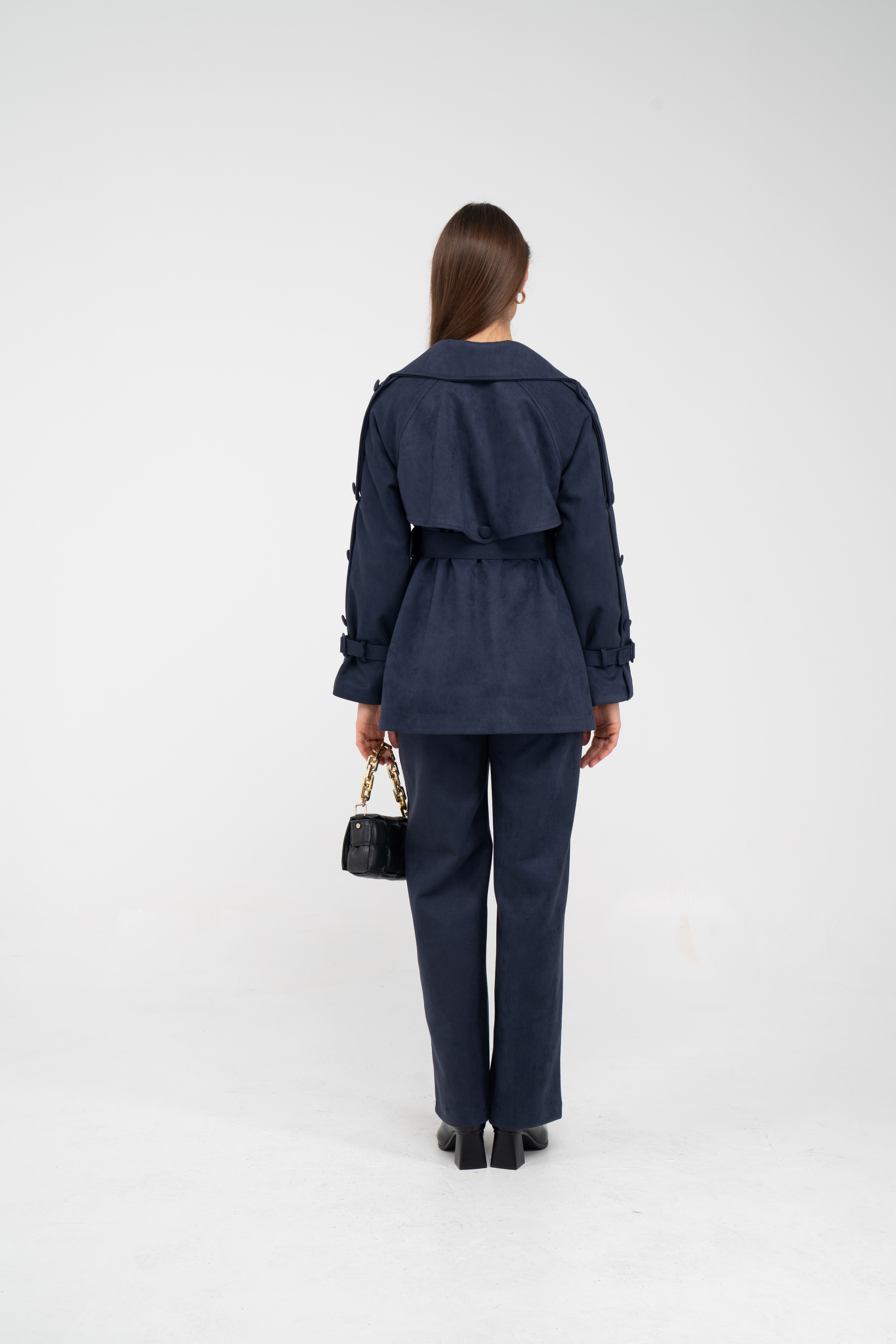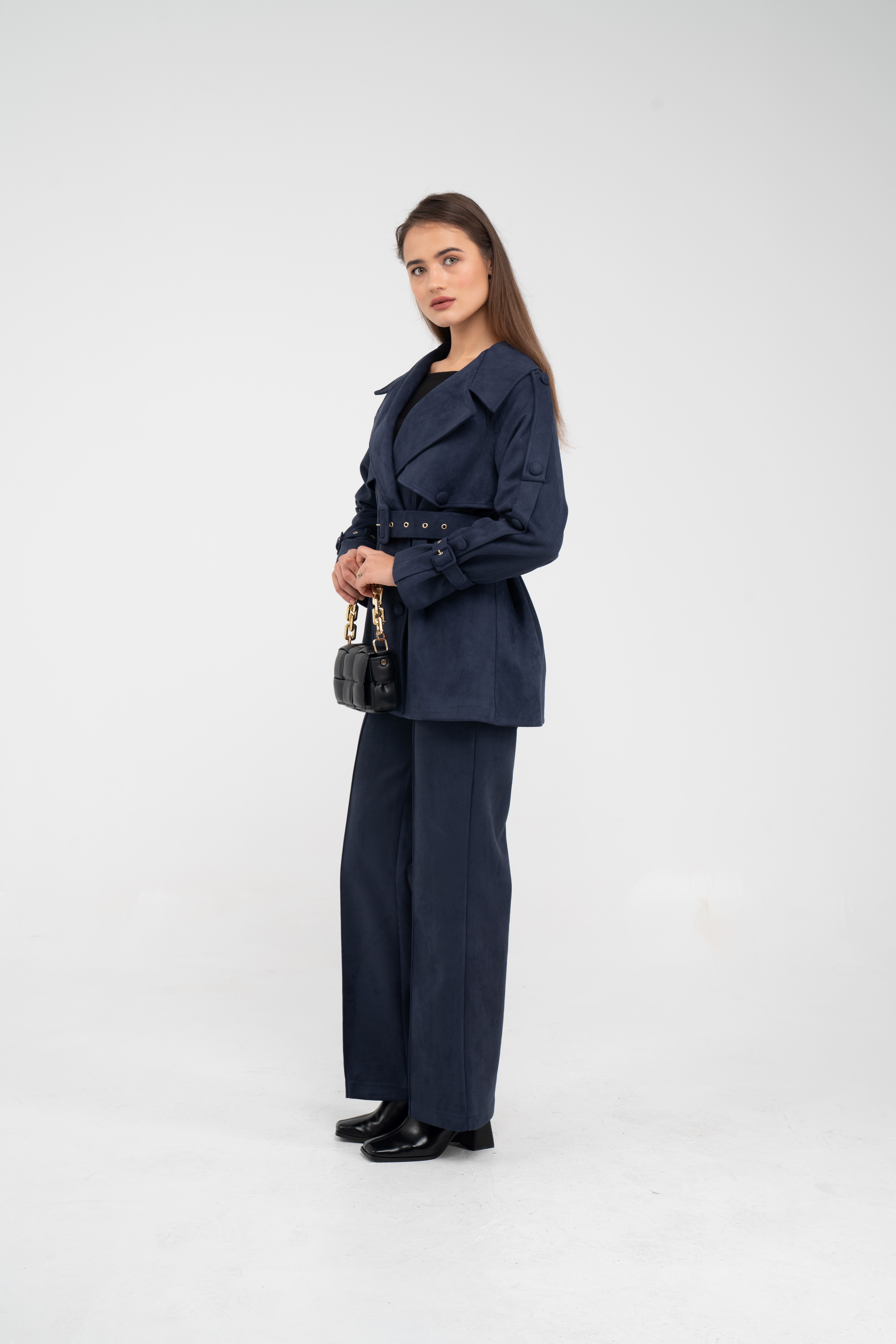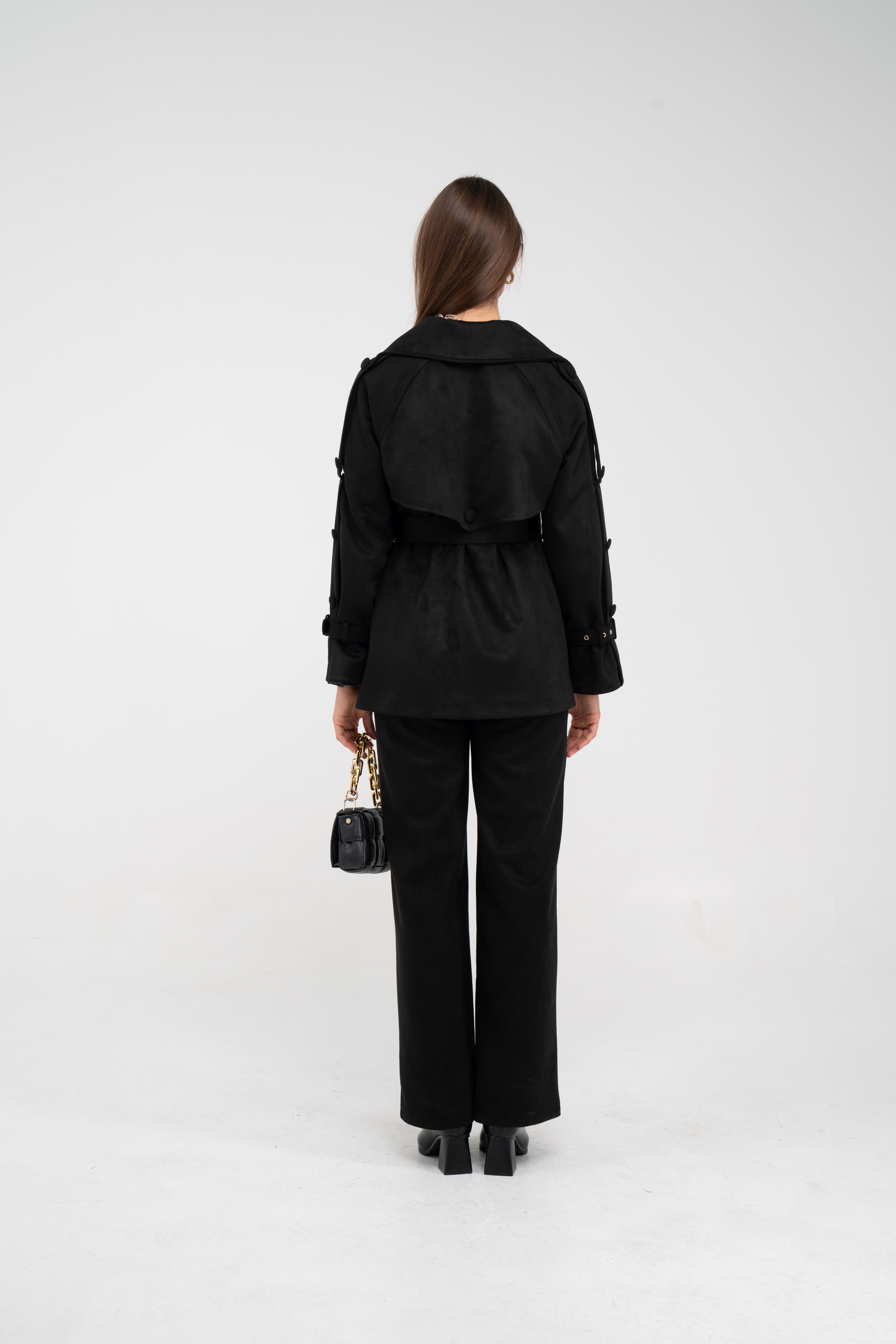 Gelince Haber VerŞık ve güçlü bir duruş sunan bu süet dokulu takım, modern şehir stilini yansıtan detaylara sahip. Üst parça çift düğme tasarımı, geniş yaka kesimi ve ayarlanabilir kuşak detayıyla feminen ve sofistike bir görünüm oluşturur.