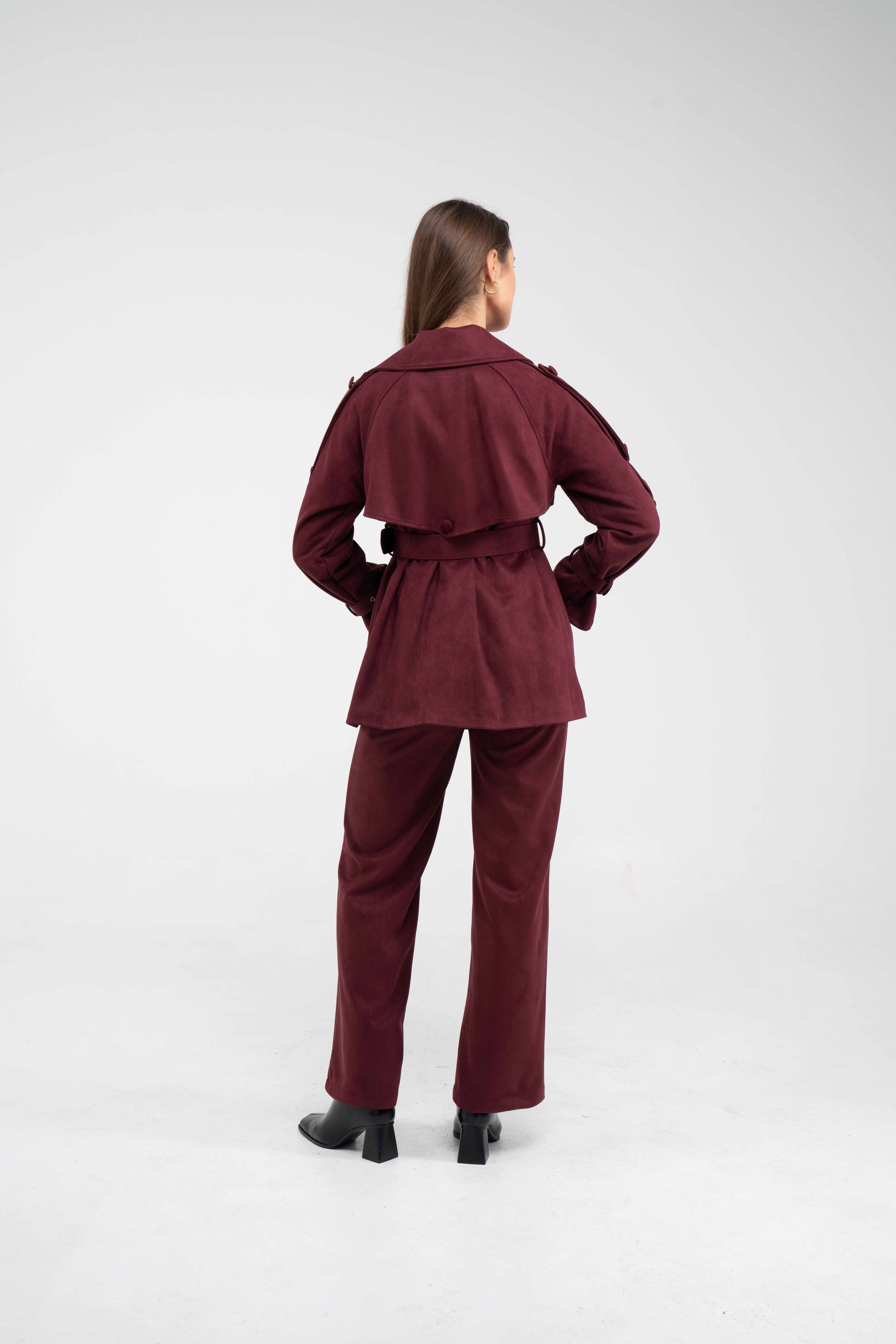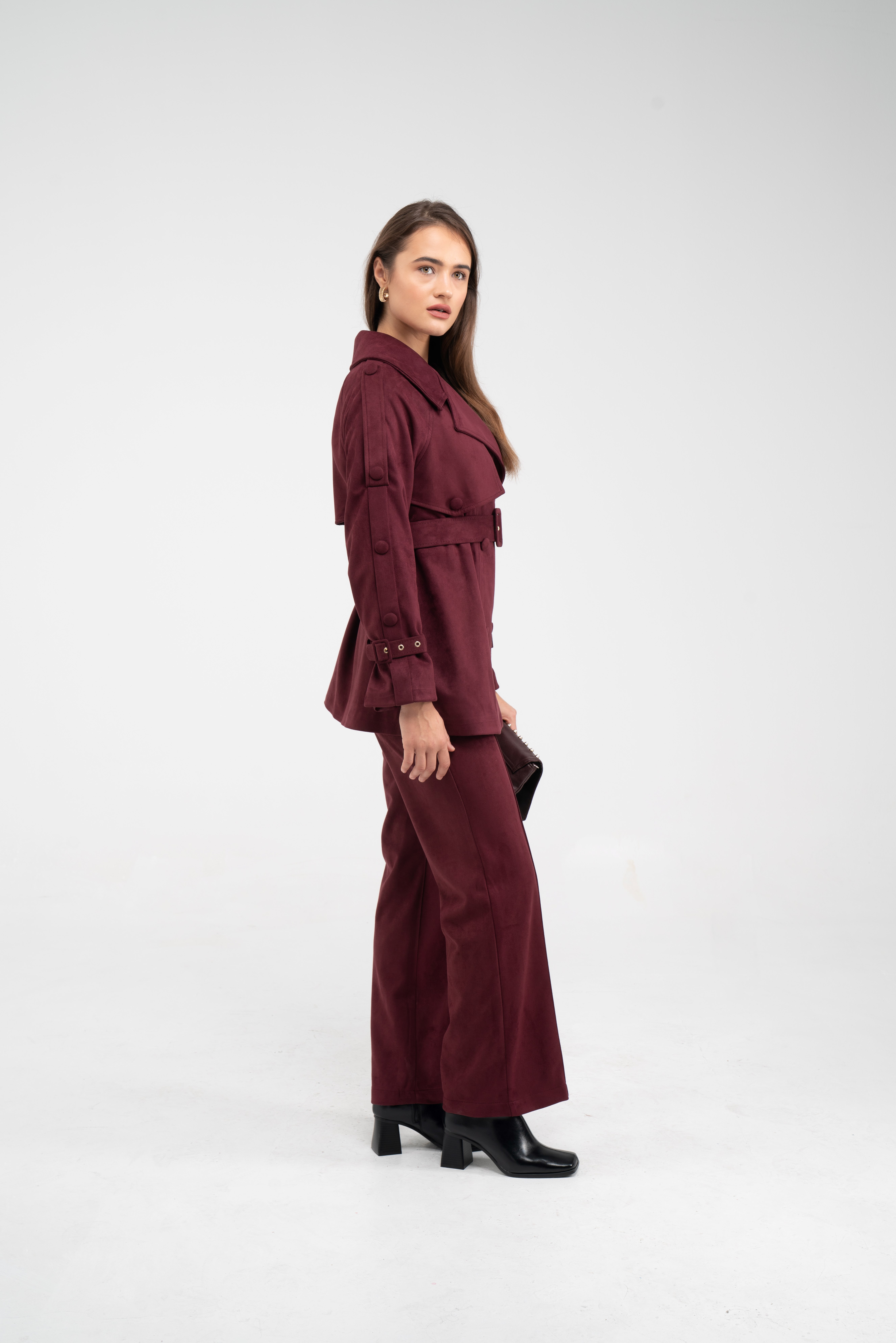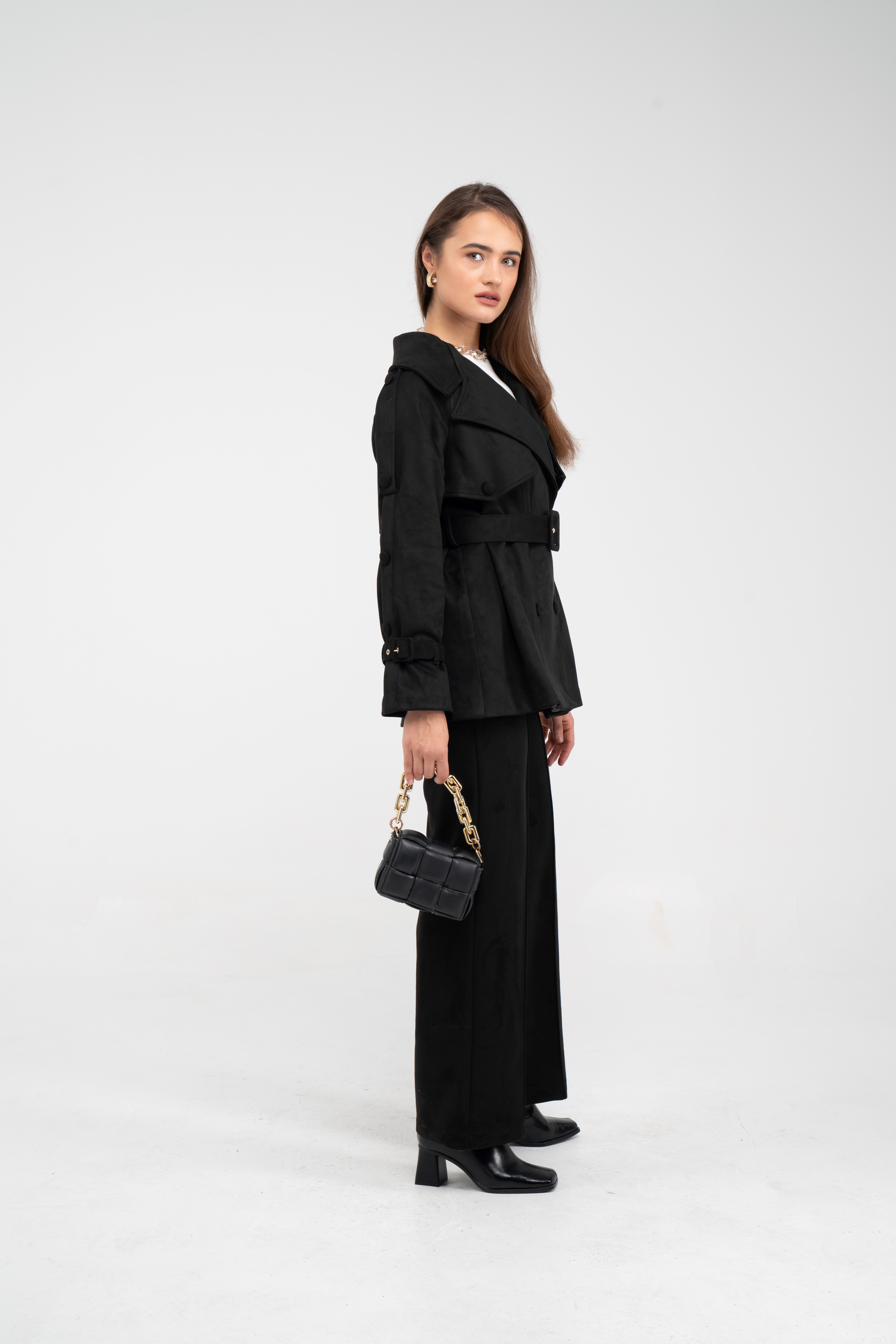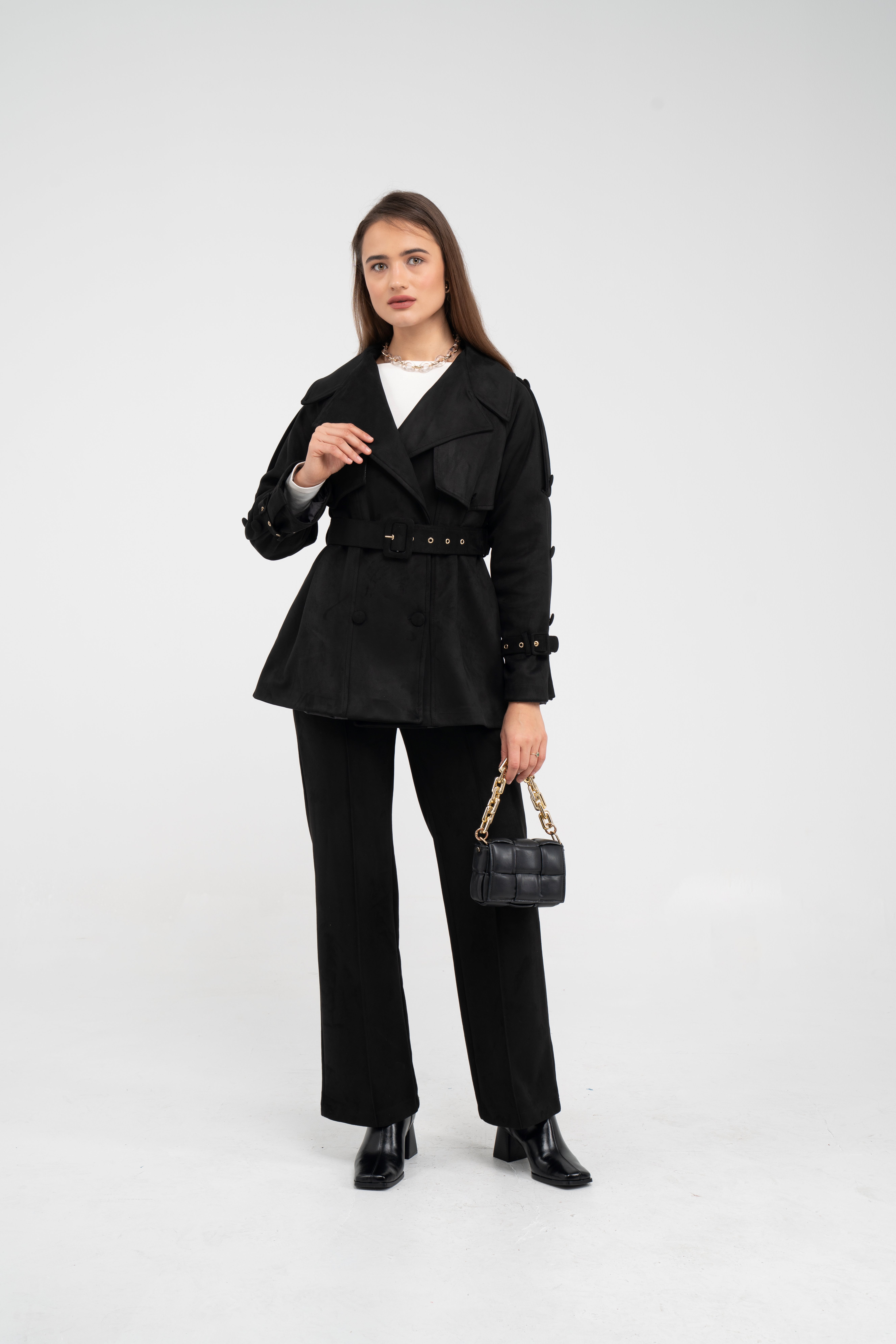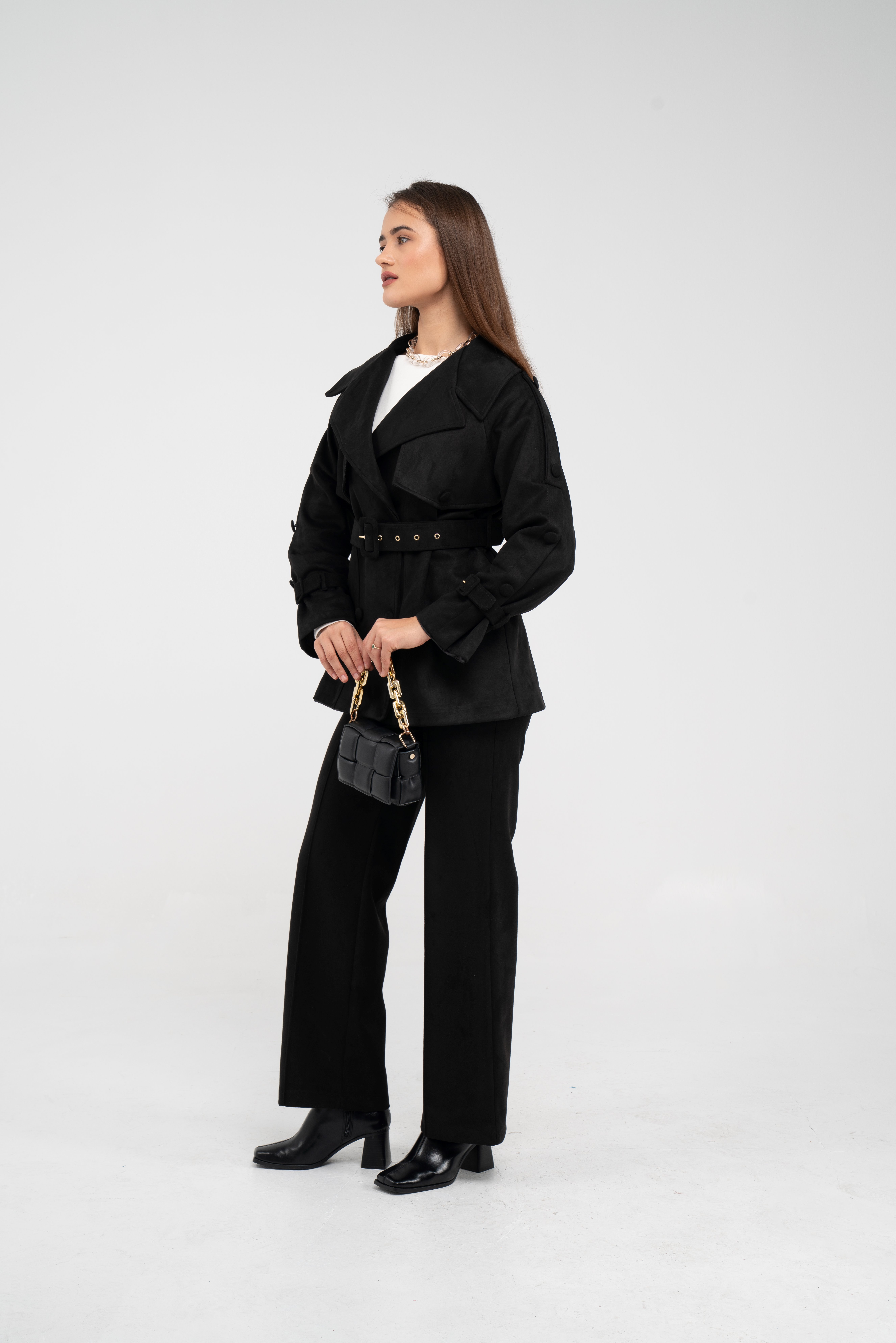 Gelince Haber VerŞık ve güçlü bir duruş sunan bu süet dokulu takım, modern şehir stilini yansıtan detaylara sahip. Üst parça çift düğme tasarımı, geniş yaka kesimi ve ayarlanabilir kuşak detayıyla feminen ve sofistike bir görünüm oluşturur.